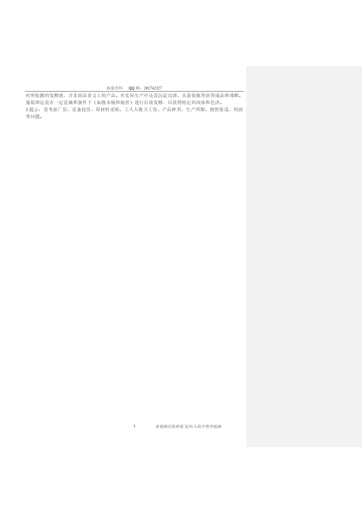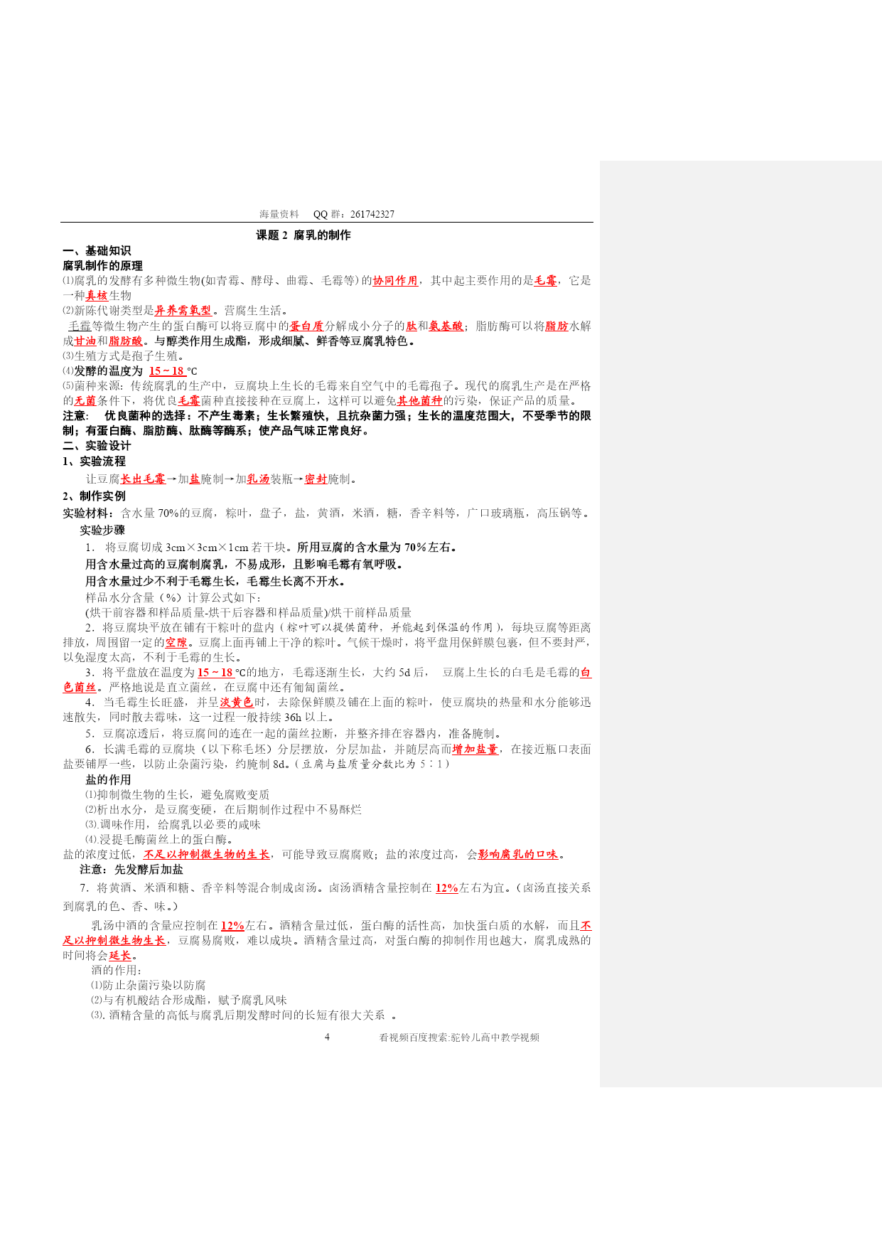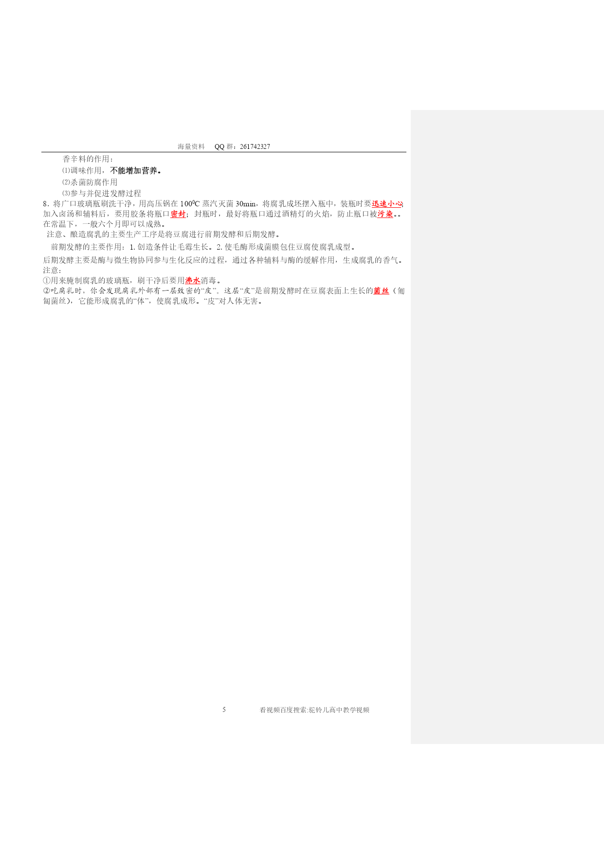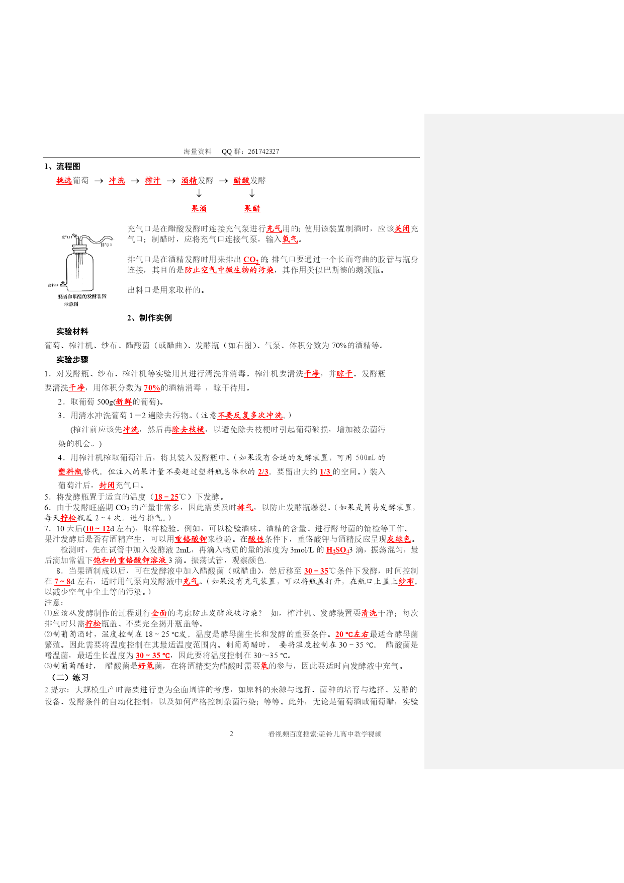 海量资料QQ群:261742327 看视频百度搜索:驼铃儿高中教学视频 2013选修1《生物技术实践》一轮复习知识梳理 专题1传统发酵技术的应用 课题1果酒和果醋和制作 【补充知识】发酵 1、概念:利用微生物或其他生物的细胞在有氧或无氧条件下繁殖或积累其代谢产物的过程。 2.传统发酵技术(都是采用自然发酵的工艺),如:传统的葡萄酒酿造,就是葡萄破碎入罐以后,不人为地添加任何菌种,靠葡萄本身携带的自然界的酵母菌,在葡萄浆或分离后的葡萄汁里自发地繁殖,最终发酵成葡萄酒。 3、类型: ⑴根据是否需要氧气分为:需氧发酵和厌氧发酵。 ⑵根据产生的产物可分为:酒精发酵、乳酸发酵、醋酸发酵等。 一、基础知识 (一)果酒制作的原理 酶 ⑴果酒发酵的菌种:酵母菌,属于真核生物 ⑵酵母菌的代谢类型是:异养兼性厌氧型 有氧时,进行有氧呼吸,反应式为:C6H12O6+6H2O+6O2→6CO2+12H2O+能量;大量繁殖, 酶 无氧时,能进行酒精发酵,反应式为:C6H12O6→2C2H5OH+2CO2+能量。 ⑶酵母菌的生殖方式:出芽生殖(主要)分裂生殖孢子生殖. ⑷酵母菌繁殖的最适温度20℃左右,酒精发酵一般控制在18~25℃。 ⑸传统发酵技术所使用的酵母菌的来源:主要是附着于葡萄皮上的野生型酵母菌。 也可以在果汁中加入人工培养的酵母菌。 注意: ①在发酵过程中,随着酒精浓度的提高,红葡萄皮的色素也进入发酵液,使葡萄酒呈现深红色. ②酒精发酵过程中,要保持缺氧、酸性环境。在缺氧呈酸性的发酵液中,酵母菌可以生长繁殖,而绝大多数其他微生物都因无法适应这一环境而受到制约。 ③.酒精发酵过程中,要“先通气后密封”?“通气”的目的是使酵母菌进行有氧呼吸大量繁殖。“密封”的目的是使酵母菌进行无氧呼吸产生酒精。 (二)果醋制作的原理 ⑴菌种是醋酸菌,属于原核生物 ⑵醋酸菌的代谢类型为异养需氧型。 有两条途径生成醋酸:直接氧化和以酒精为底物的氧化。 酶 当氧气、糖源都充足时,醋酸菌将葡萄汁中的糖分解成醋酸,当缺少糖源时,醋酸菌将乙醇变为乙醛,再将乙醛变为醋酸,反应简式为C2H5OH+O2→CH3COOH+H2O。 ⑶醋酸菌的生殖方式:生殖方式为二分裂. ⑷醋酸菌最适生长温度为30~35℃。 ⑸菌种来源:到生产食醋的工厂或菌种保藏中心购买,或从食醋中分离醋酸菌。 注意: ①醋酸菌对氧气的含量特别敏感,当进行深层发酵时,即使只是短时间中断通入氧气,也会引起醋酸菌死亡。只有在氧气充足时,才能进行旺盛的生命活动。变酸的酒表面观察到的菌膜就是醋酸菌在液面大量繁殖形成的。 ②醋酸菌最适生长温度为30~35℃。,控制好发酵温度,使发酵时间缩短,又减少杂菌污染的机会。 二、实验设计 1、流程图 挑选葡萄冲洗榨汁酒精发酵醋酸发酵 果酒果醋 充气口是在醋酸发酵时连接充气泵进行充气用的;使用该装置制酒时,应该关闭充气口;制醋时,应将充气口连接气泵,输入氧气。 排气口是在酒精发酵时用来排出CO2的;排气口要通过一个长而弯曲的胶管与瓶身连接,其目的是防止空气中微生物的污染,其作用类似巴斯德的鹅颈瓶。 出料口是用来取样的。 2、制作实例 实验材料 葡萄、榨汁机、纱布、醋酸菌(或醋曲)、发酵瓶(如右图)、气泵、体积分数为70%的酒精等。 实验步骤 1.对发酵瓶、纱布、榨汁机等实验用具进行清洗并消毒。榨汁机要清洗干净,并晾干。发酵瓶要清洗干净,用体积分数为70%的酒精消毒,晾干待用。 2.取葡萄500g(新鲜的葡萄)。 3.用清水冲洗葡萄1-2遍除去污物。(注意不要反复多次冲洗。) (榨汁前应该先冲洗,然后再除去枝梗,以避免除去枝梗时引起葡萄破损,增加被杂菌污染的机会。) 4.用榨汁机榨取葡萄汁后,将其装入发酵瓶中。(如果没有合适的发酵装置,可用500mL的塑料瓶替代。但注入的果汁量不要超过塑料瓶总体积的2/3。要留出大约1/3的空间。)装入葡萄汁后,封闭充气口。 5.将发酵瓶置于适宜的温度(18-25℃)下发酵。 6.由于发酵旺盛期CO2的产量非常多,因此需要及时排气,以防止发酵瓶爆裂。(如果是简易发酵装置,每天拧松瓶盖2~4次。进行排气。) 7.10天后(10~12d左右),取样检验。例如,可以检验酒味、酒精的含量、进行酵母菌的镜检等工作。 果汁发酵后是否有酒精产生,可以用重铬酸钾来检验。在酸性条件下,重铬酸钾与酒精反应呈现灰绿色。 检测时,先在试管中加入发酵液2mL,再滴入物质的量的浓度为3mol/L的H2SO43滴,振荡混匀,最后滴加常温下饱和的重铬酸钾溶液3滴。振荡试管,观察颜色. 8.当果酒制成以后,可在发酵液中加入醋酸菌(或醋曲),然后移至30-35℃条件下发酵,时间控制在7~8d左右,适时用气泵向发酵液中充气。(如果没有充气装置,可以将瓶盖打开,在瓶