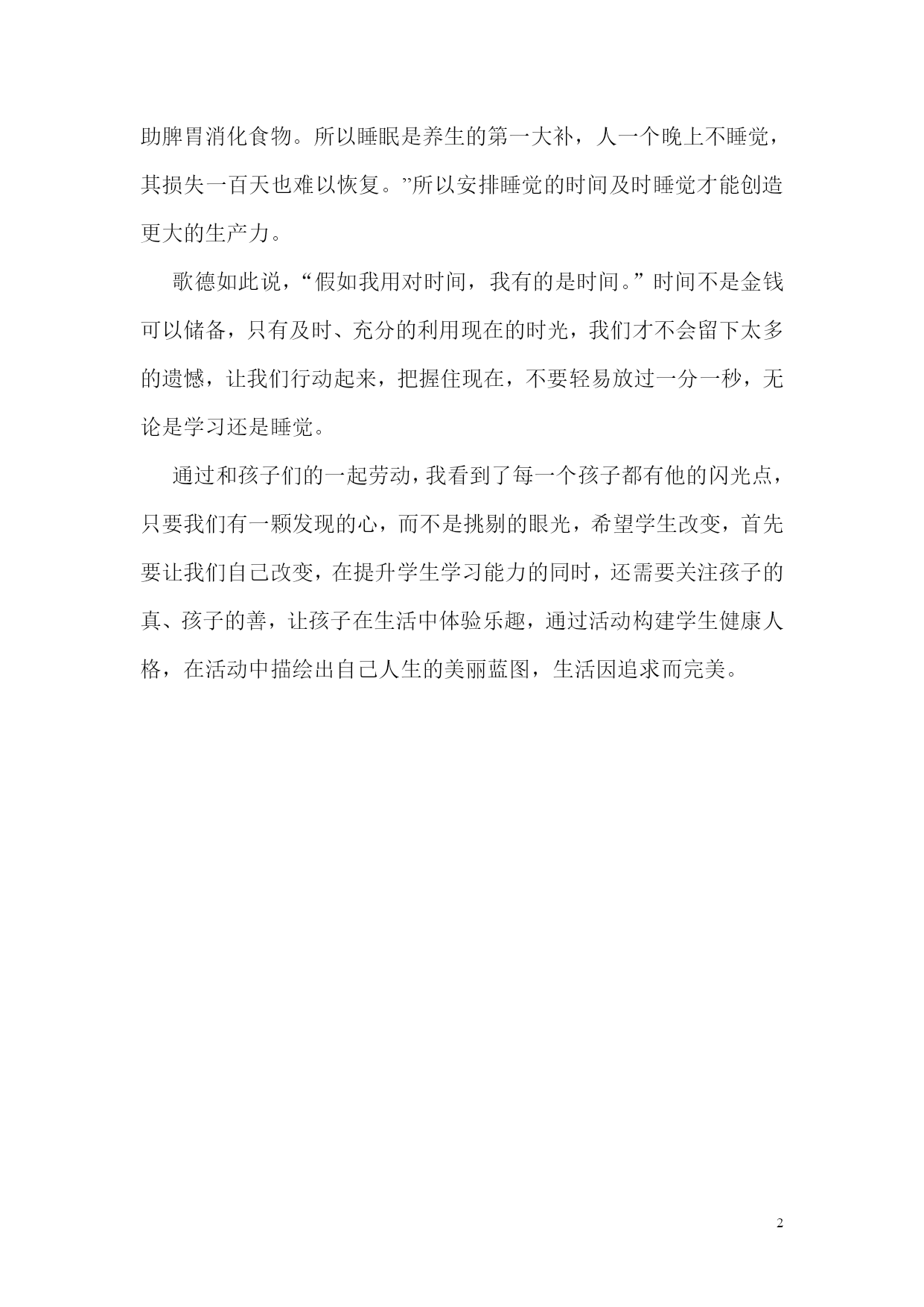 进步在于坚持 我今天感觉特别的累,前两天劳动的痕迹还在我体内留着,已经坚持第三天了,同学们也很累,看来高强度的劳动持续做不行的,休息是为了更好的劳动;学习也是如此,天天熬夜看书学习,能够坚持几天?想想很多学生不仅没有提高成绩,反而身体吃不消了。学习是个持久过程,我们必须要有长远的规划,分步实施,换句话说,如果我的基本功还可以,考试状态不佳,目前的成绩班级30名,我们认为能够考进28-29名就是很大的进步,这样我们的心态就会端正,考试的状态也会提高,成功也更容易获得;如果我的基础相对比较薄弱,通过自己的努力从30名考到了20名,我们的定位不是18名,每一张试卷都有一定的针对性,也就是存在偶然性,但是偶然中也有必然的因素,必然是自己在这阶段的学习态度、学习习惯的改变、课堂效率的提升等等,找到自己成功的部分,然后再坚持,所以我会对学生说下次的目标而是25-26名,要学会保护好我们自己的学习积极性。 劳逸结合大家都知道,但是很多人不重视,对于人而言最好的休息就是睡觉,足够的睡眠时间是保证我们充沛精力的源泉,高中阶段睡觉时间是定的,在繁重的学习压力下,我们的睡觉变的更加的必要,但是我们很多学生、家长不重视,认为多做些作业,挤一些睡觉的时间用于学习,能够提高学习成绩,想法是好的,但是往往效果不理想,甚至适得其反,海绵中的水是有的,但是只有挤的过程,没有给的过程,结果是越来越少,直至没有。战国时名医文挚对齐威王说:“我的养生之道把睡眠放在头等位置,人和动物只有睡眠才能生长,睡眠帮助脾胃消化食物。所以睡眠是养生的第一大补,人一个晚上不睡觉,其损失一百天也难以恢复。”所以安排睡觉的时间及时睡觉才能创造更大的生产力。 歌德如此说,“假如我用对时间,我有的是时间。”时间不是金钱可以储备,只有及时、充分的利用现在的时光,我们才不会留下太多的遗憾,让我们行动起来,把握住现在,不要轻易放过一分一秒,无论是学习还是睡觉。 通过和孩子们的一起劳动,我看到了每一个孩子都有他的闪光点,只要我们有一颗发现的心,而不是挑剔的眼光,希望学生改变,首先要让我们自己改变,在提升学生学习能力的同时,还需要关注孩子的真、孩子的善,让孩子在生活中体验乐趣,通过活动构建学生健康人格,在活动中描绘出自己人生的美丽蓝图,生活因追求而完美。