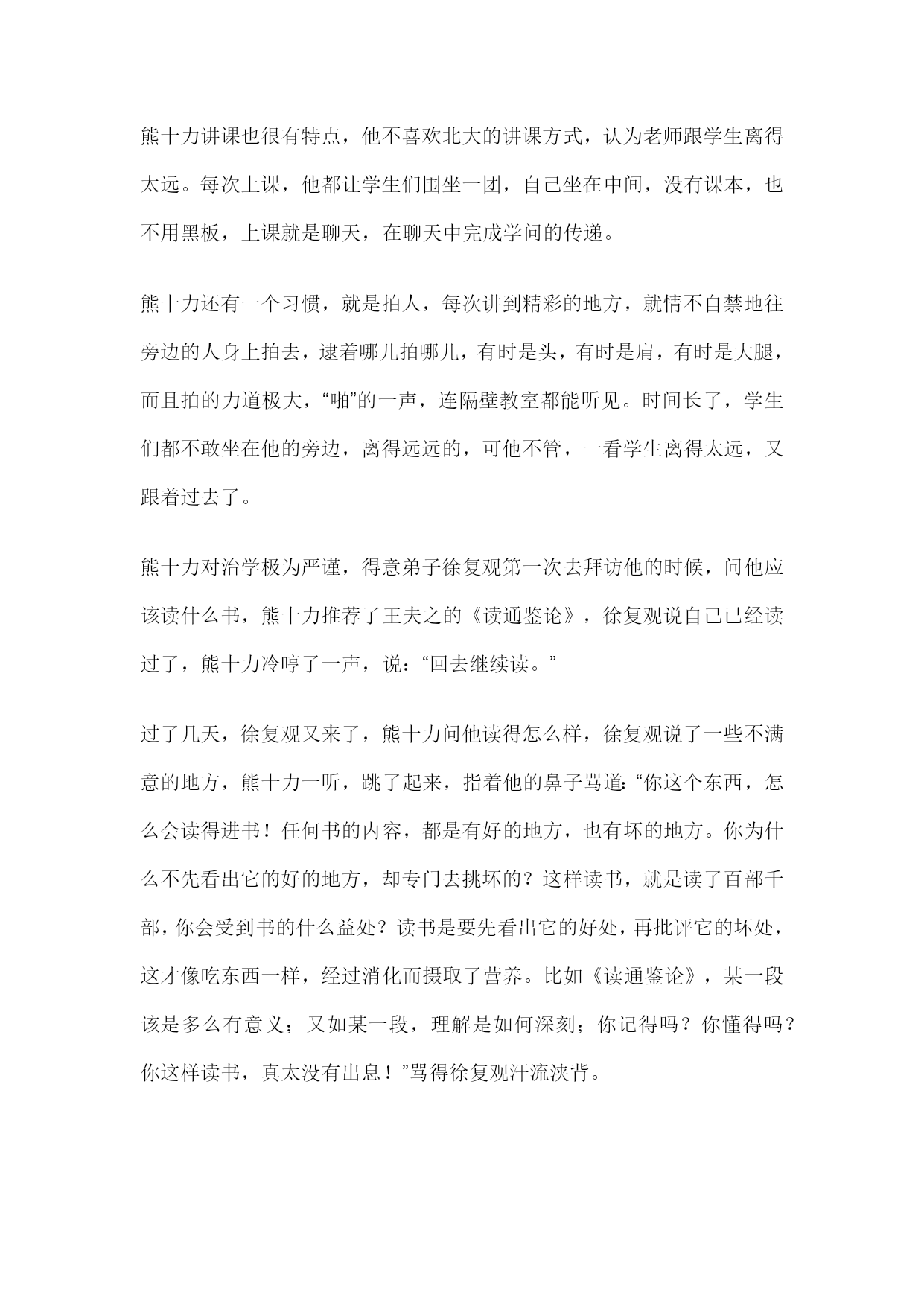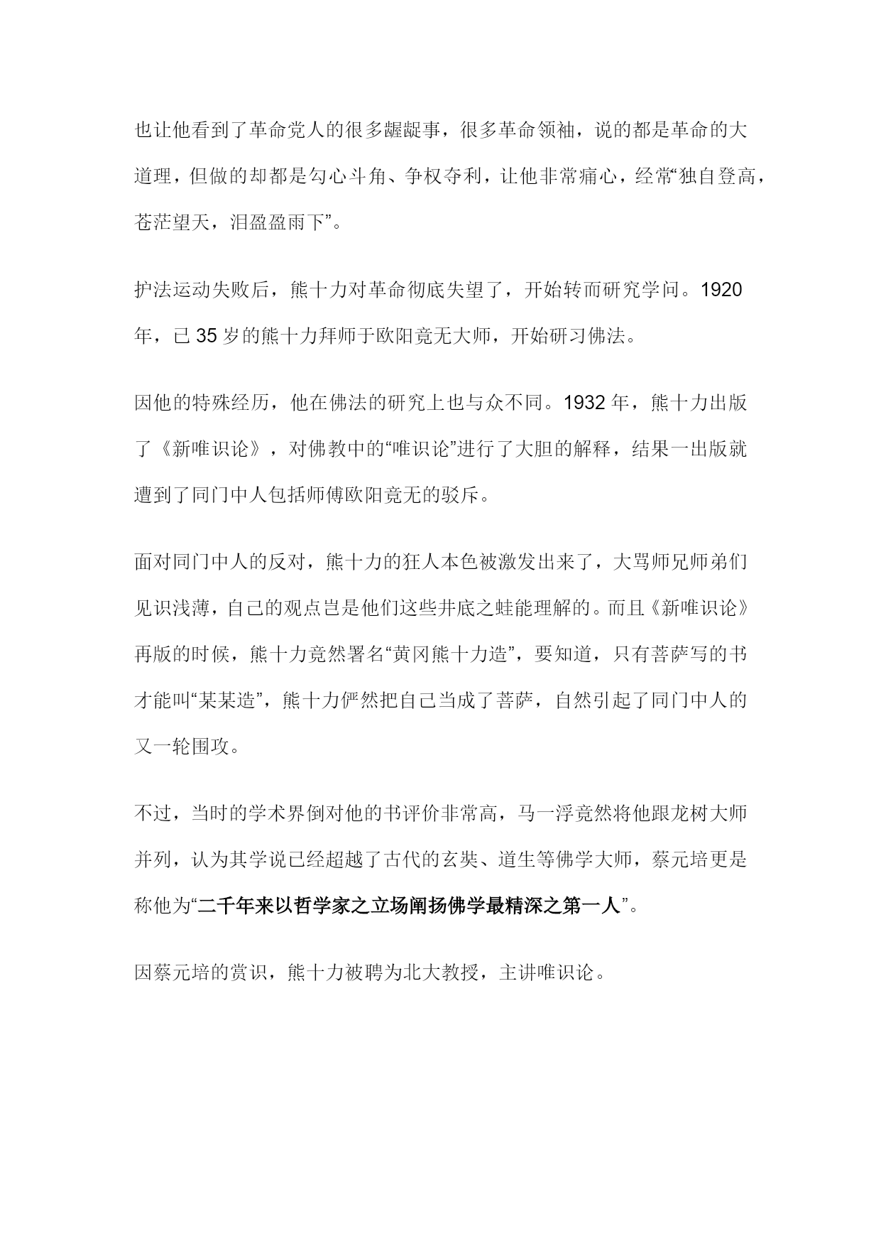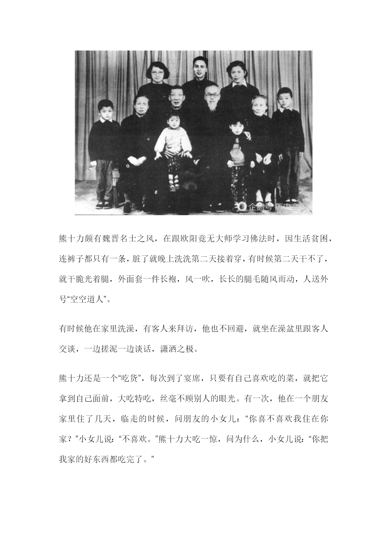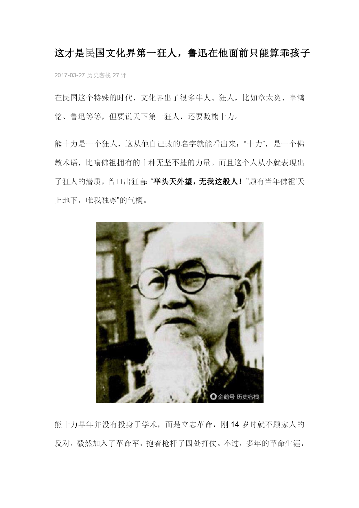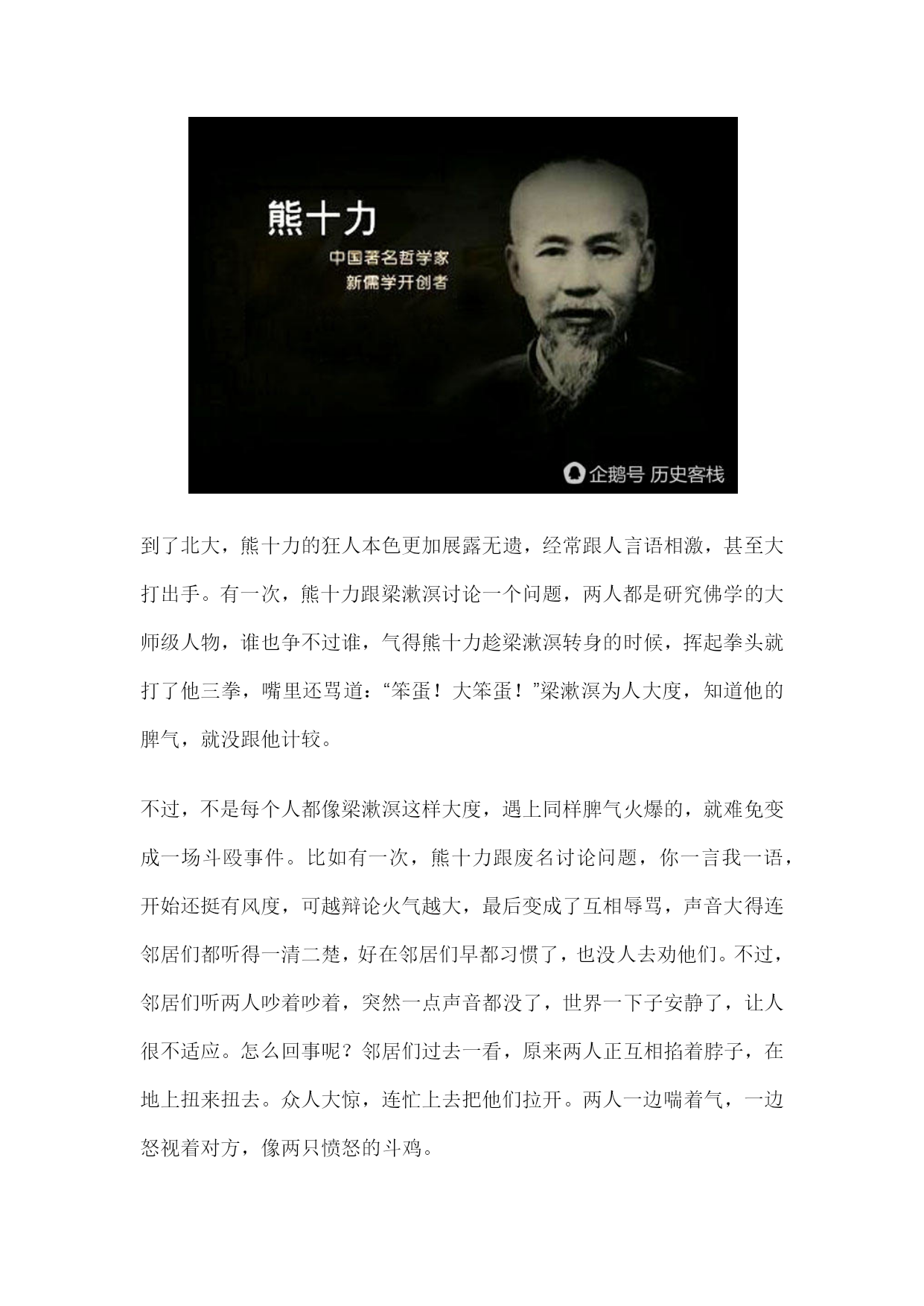 这才是民国文化界第一狂人,鲁迅在他面前只能算乖孩子 2017-03-27历史客栈27评 在民国这个特殊的时代,文化界出了很多牛人、狂人,比如章太炎、辜鸿铭、鲁迅等等,但要说天下第一狂人,还要数熊十力。 熊十力是一个狂人,这从他自己改的名字就能看出来:“十力”,是一个佛教术语,比喻佛祖拥有的十种无坚不摧的力量。而且这个人从小就表现出了狂人的潜质,曾口出狂言:“举头天外望,无我这般人!”颇有当年佛祖“天上地下,唯我独尊”的气概。 熊十力早年并没有投身于学术,而是立志革命,刚14岁时就不顾家人的反对,毅然加入了革命军,抱着枪杆子四处打仗。不过,多年的革命生涯,也让他看到了革命党人的很多龌龊事,很多革命领袖,说的都是革命的大道理,但做的却都是勾心斗角、争权夺利,让他非常痛心,经常“独自登高,苍茫望天,泪盈盈雨下”。 护法运动失败后,熊十力对革命彻底失望了,开始转而研究学问。1920年,已35岁的熊十力拜师于欧阳竟无大师,开始研习佛法。 因他的特殊经历,他在佛法的研究上也与众不同。1932年,熊十力出版了《新唯识论》,对佛教中的“唯识论”进行了大胆的解释,结果一出版就遭到了同门中人包括师傅欧阳竟无的驳斥。 面对同门中人的反对,熊十力的狂人本色被激发出来了,大骂师兄师弟们见识浅薄,自己的观点岂是他们这些井底之蛙能理解的。而且《新唯识论》再版的时候,熊十力竟然署名“黄冈熊十力造”,要知道,只有菩萨写的书才能叫“某某造”,熊十力俨然把自己当成了菩萨,自然引起了同门中人的又一轮围攻。 不过,当时的学术界倒对他的书评价非常高,马一浮竟然将他跟龙树大师并列,认为其学说已经超越了古代的玄奘、道生等佛学大师,蔡元培更是称他为“二千年来以哲学家之立场阐扬佛学最精深之第一人”。 因蔡元培的赏识,熊十力被聘为北大教授,主讲唯识论。 到了北大,熊十力的狂人本色更加展露无遗,经常跟人言语相激,甚至大打出手。有一次,熊十力跟梁漱溟讨论一个问题,两人都是研究佛学的大师级人物,谁也争不过谁,气得熊十力趁梁漱溟转身的时候,挥起拳头就打了他三拳,嘴里还骂道:“笨蛋!大笨蛋!”梁漱溟为人大度,知道他的脾气,就没跟他计较。 不过,不是每个人都像梁漱溟这样大度,遇上同样脾气火爆的,就难免变成一场斗殴事件。比如有一次,熊十力跟废名讨论问题,你一言我一语,开始还挺有风度,可越辩论火气越大,最后变成了互相辱骂,声音大得连邻居们都听得一清二楚,好在邻居们早都习惯了,也没人去劝他们。不过,邻居们听两人吵着吵着,突然一点声音都没了,世界一下子安静了,让人很不适应。怎么回事呢?邻居们过去一看,原来两人正互相掐着脖子,在地上扭来扭去。众人大惊,连忙上去把他们拉开。两人一边喘着气,一边怒视着对方,像两只愤怒的斗鸡。 熊十力讲课也很有特点,他不喜欢北大的讲课方式,认为老师跟学生离得太远。每次上课,他都让学生们围坐一团,自己坐在中间,没有课本,也不用黑板,上课就是聊天,在聊天中完成学问的传递。 熊十力还有一个习惯,就是拍人,每次讲到精彩的地方,就情不自禁地往旁边的人身上拍去,逮着哪儿拍哪儿,有时是头,有时是肩,有时是大腿,而且拍的力道极大,“啪”的一声,连隔壁教室都能听见。时间长了,学生们都不敢坐在他的旁边,离得远远的,可他不管,一看学生离得太远,又跟着过去了。 熊十力对治学极为严谨,得意弟子徐复观第一次去拜访他的时候,问他应该读什么书,熊十力推荐了王夫之的《读通鉴论》,徐复观说自己已经读过了,熊十力冷哼了一声,说:“回去继续读。” 过了几天,徐复观又来了,熊十力问他读得怎么样,徐复观说了一些不满意的地方,熊十力一听,跳了起来,指着他的鼻子骂道:“你这个东西,怎么会读得进书!任何书的内容,都是有好的地方,也有坏的地方。你为什么不先看出它的好的地方,却专门去挑坏的?这样读书,就是读了百部千部,你会受到书的什么益处?读书是要先看出它的好处,再批评它的坏处,这才像吃东西一样,经过消化而摄取了营养。比如《读通鉴论》,某一段该是多么有意义;又如某一段,理解是如何深刻;你记得吗?你懂得吗?你这样读书,真太没有出息!”骂得徐复观汗流浃背。 熊十力颇有魏晋名士之风,在跟欧阳竟无大师学习佛法时,因生活贫困,连裤子都只有一条,脏了就晚上洗洗第二天接着穿,有时候第二天干不了,就干脆光着腿,外面套一件长袍,风一吹,长长的腿毛随风而动,人送外号“空空道人”。 有时候他在家里洗澡,有客人来拜访,他也不回避,就坐在澡盆里跟客人交谈,一边搓泥一边谈话,潇洒之极。 熊十力还是一个“吃货”,每次到了宴席,只要有自己喜欢吃的菜,就把它拿到自己面前,大吃特吃,丝毫不顾别人的眼光。有一次,他在一个朋友家里住了几天,临走的时候,问朋友的小女儿:“你喜不喜欢我住在你家?”小女儿说:“不喜欢。”熊十力大吃一惊,问为什么,小女儿说:“你把我家