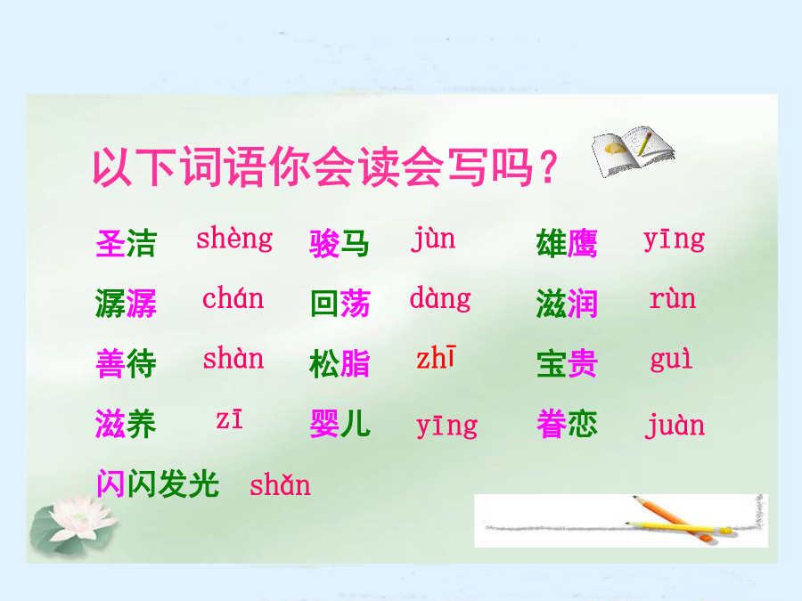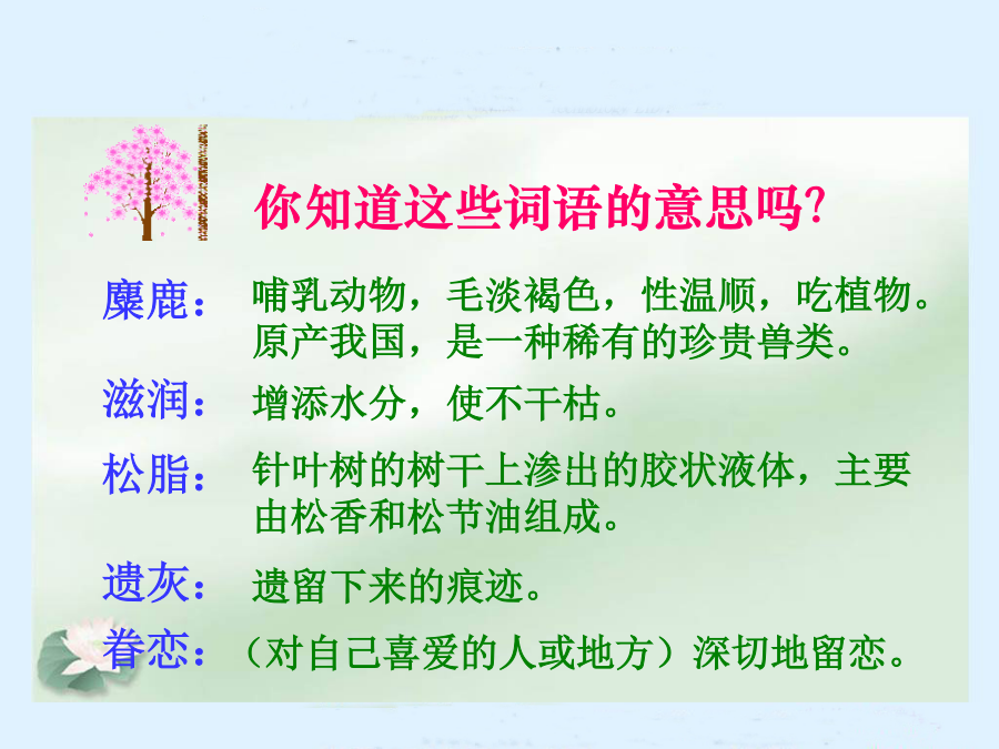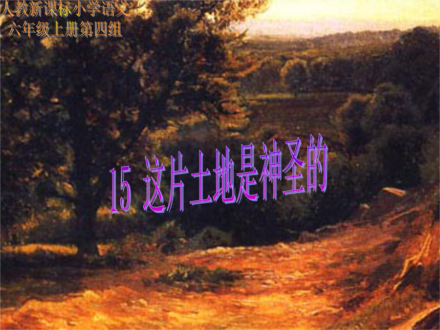 15这片土地是神圣的以下词语你会读会写吗?你知道这些词语的意思吗?小溪河流闪闪发光的松针美丽的昆虫蓝天上的白云在蓝天翱翔的雄鹰麋鹿奔腾的骏马写作背景印第安人印第安人常青城——西雅图想一想:西雅图在信中都讲了哪些内容?主要内容1、这片土地指的是哪片土地? 2、文中哪些地方体现了这片土地是神圣的?这片土地——美国西北部的印第安人领地。神圣的土地①我们是大地的一部分,大地也是我们的一部分。②我们和大地上的山峦河流、动物植物共同属于一个家园。③溪流河川中闪闪发光的不仅仅是水,也是我们祖先的血液。面对这片神圣的土地,西雅图认为我们应该怎么做? ①任何降临在大地上的事,终究会降临在大地的孩子身上。②大地不属于人类,而人类是属于大地的。思考问题再见