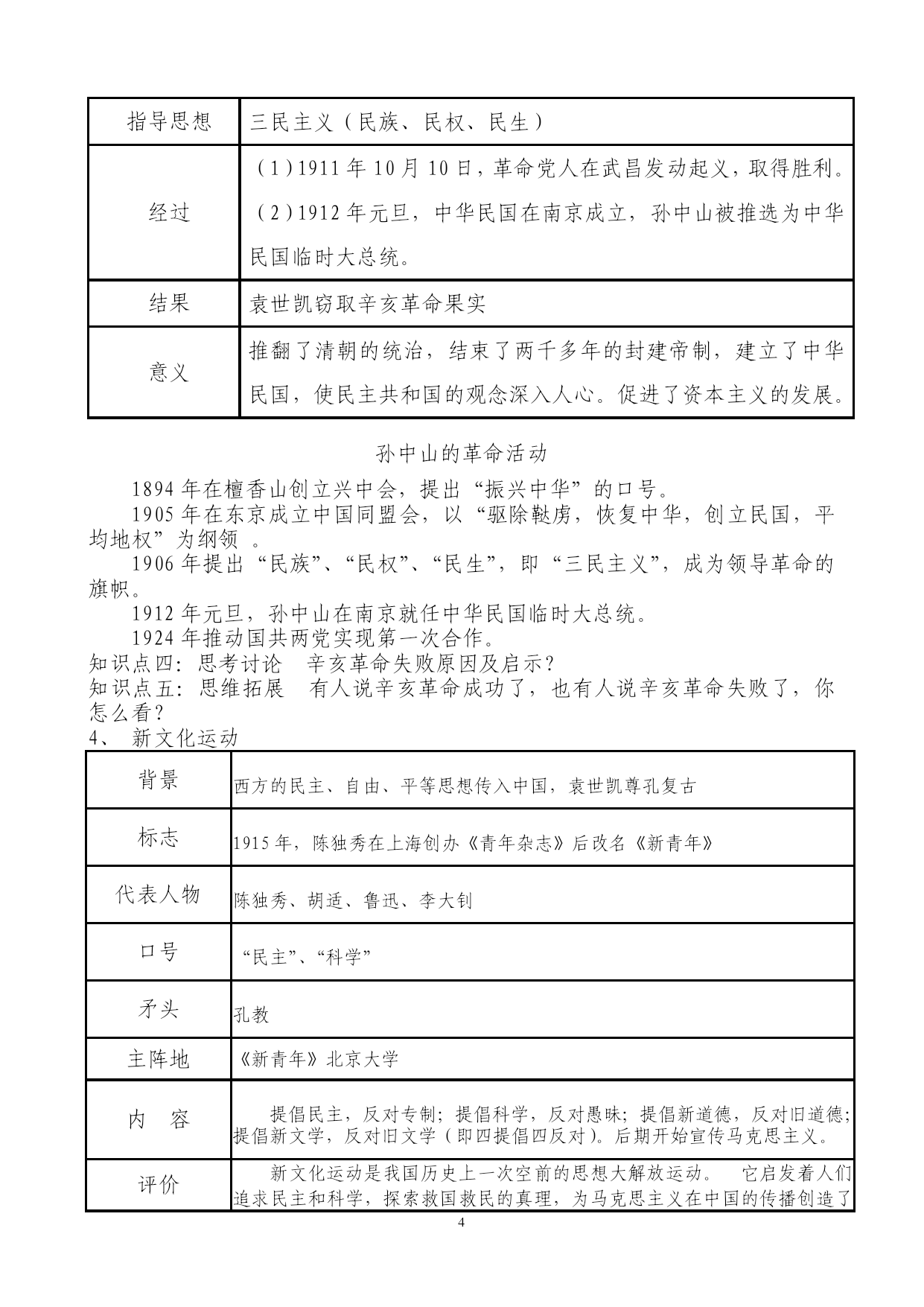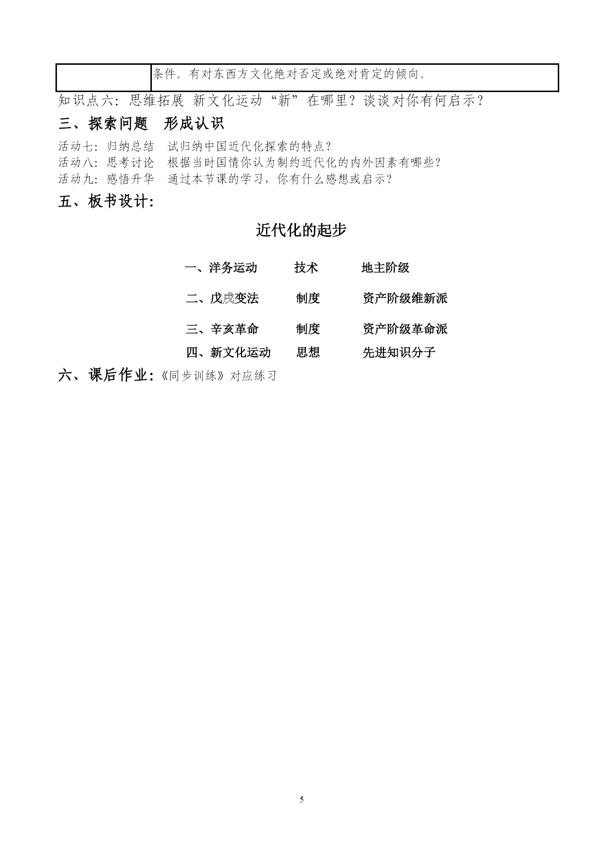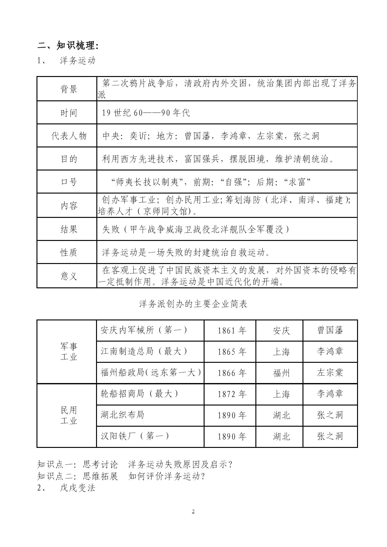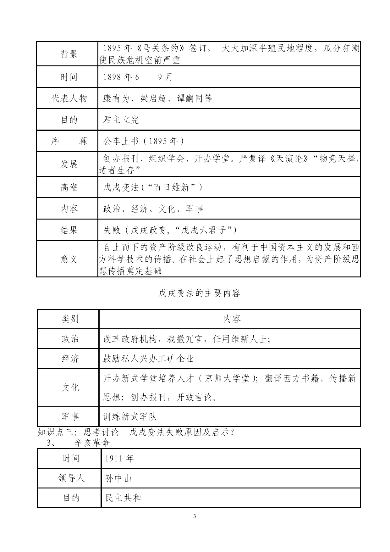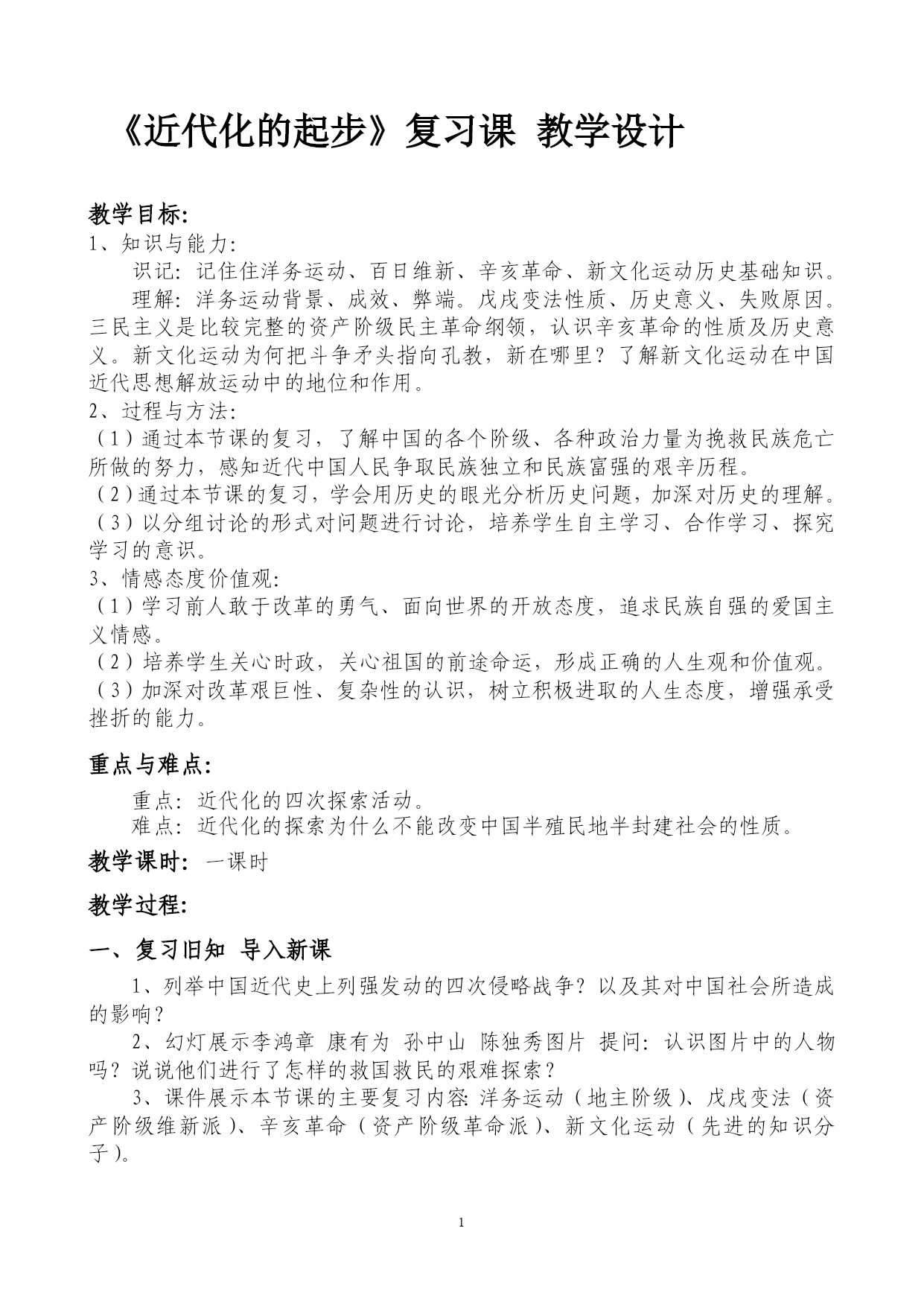 《近代化的起步》复习课教学设计 教学目标: 1、知识与能力: 识记:记住住洋务运动、百日维新、辛亥革命、新文化运动历史基础知识。 理解:洋务运动背景、成效、弊端。戊戌变法性质、历史意义、失败原因。三民主义是比较完整的资产阶级民主革命纲领,认识辛亥革命的性质及历史意义。新文化运动为何把斗争矛头指向孔教,新在哪里?了解新文化运动在中国近代思想解放运动中的地位和作用。 2、过程与方法: (1)通过本节课的复习,了解中国的各个阶级、各种政治力量为挽救民族危亡所做的努力,感知近代中国人民争取民族独立和民族富强的艰辛历程。 (2)通过本节课的复习,学会用历史的眼光分析历史问题,加深对历史的理解。 (3)以分组讨论的形式对问题进行讨论,培养学生自主学习、合作学习、探究学习的意识。 3、情感态度价值观: (1)学习前人敢于改革的勇气、面向世界的开放态度,追求民族自强的爱国主义情感。 (2)培养学生关心时政,关心祖国的前途命运,形成正确的人生观和价值观。 (3)加深对改革艰巨性、复杂性的认识,树立积极进取的人生态度,增强承受挫折的能力。 重点与难点: 重点:近代化的四次探索活动。 难点:近代化的探索为什么不能改变中国半殖民地半封建社会的性质。 教学课时:一课时 教学过程: 一、复习旧知导入新课 1、列举中国近代史上列强发动的四次侵略战争?以及其对中国社会所造成的影响? 2、幻灯展示李鸿章康有为孙中山陈独秀图片提问:认识图片中的人物吗?说说他们进行了怎样的救国救民的艰难探索? 3、课件展示本节课的主要复习内容:洋务运动(地主阶级)、戊戌变法(资产阶级维新派)、辛亥革命(资产阶级革命派)、新文化运动(先进的知识分子)。 二、知识梳理: 1、洋务运动 背景第二次鸦片战争后,清政府内外交困,统治集团内部出现了洋务派时间19世纪60——90年代代表人物中央:奕;地方:曾国藩,李鸿章,左宗棠,张之洞目的利用西方先进技术,富国强兵,摆脱困境,维护清朝统治。口号“师夷长技以制夷”,前期:“自强”;后期:“求富”内容创办军事工业;创办民用工业;筹划海防(北洋、南洋、福建);培养人才(京师同文馆)。结果失败(甲午战争威海卫战役北洋舰队全军覆没)性质洋务运动是一场失败的封建统治自救运动。意义在客观上促进了中国民族资本主义的发展,对外国资本的侵略有一定抵制作用。洋务运动是中国近代化的开端。 洋务派创办的主要企业简表 军事 工业安庆内军械所(第一)1861年安庆曾国藩江南制造总局(最大)1865年上海李鸿章福州船政局(远东第一大)1866年福州左宗棠民用 工业轮船招商局(最大)1872年上海李鸿章湖北织布局1890年湖北张之洞汉阳铁厂(第一)1890年湖北张之洞 知识点一:思考讨论洋务运动失败原因及启示? 知识点二:思维拓展如何评价洋务运动? 2、戊戌变法 背景1895年《马关条约》签订,大大加深半殖民地程度,瓜分狂潮使民族危机空前严重时间1898年6——9月代表人物康有为、梁启超、谭嗣同等目的君主立宪序幕公车上书(1895年)发展创办报刊、组织学会、开办学堂。严复译《天演论》“物竞天择,适者生存”高潮戊戌变法(“百日维新”)内容政治、经济、文化、军事结果失败(戊戌政变,“戊戌六君子”)意义自上而下的资产阶级改良运动,有利于中国资本主义的发展和西方科学技术的传播。在社会上起了思想启蒙的作用,为资产阶级思想传播奠定基础 戊戌变法的主要内容 类别内容政治改革政府机构,裁撤冗官,任用维新人士;经济鼓励私人兴办工矿企业文化开办新式学堂培养人才(京师大学堂);翻译西方书籍,传播新思想;创办报刊,开放言论。军事训练新式军队知识点三:思考讨论戊戌变法失败原因及启示? 3、辛亥革命 时间1911年领导人孙中山目的民主共和指导思想三民主义(民族、民权、民生)经过(1)1911年10月10日,革命党人在武昌发动起义,取得胜利。 (2)1912年元旦,中华民国在南京成立,孙中山被推选为中华民国临时大总统。结果袁世凯窃取辛亥革命果实意义推翻了清朝的统治,结束了两千多年的封建帝制,建立了中华民国,使民主共和国的观念深入人心。促进了资本主义的发展。孙中山的革命活动 1894年在檀香山创立兴中会,提出“振兴中华”的口号。 1905年在东京成立中国同盟会,以“驱除鞑虏,恢复中华,创立民国,平均地权”为纲领。 1906年提出“民族”、“民权”、“民生”,即“三民主义”,成为领导革命的旗帜。 1912年元旦,孙中山在南京就任中华民国临时大总统。 1924年推动国共两党实现第一次合作。 知识点四:思考讨论辛亥革命失败原因及启示? 知识点五:思维拓展有人说辛亥革命成功了,也有人说辛亥革命失败了,你怎么看? 4、新文化运动 背景西方的民主、自由、平等思想传入中国,袁世凯尊孔复古标志1915