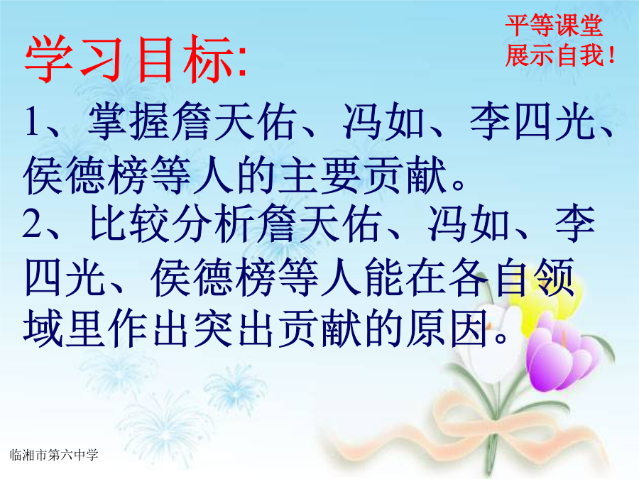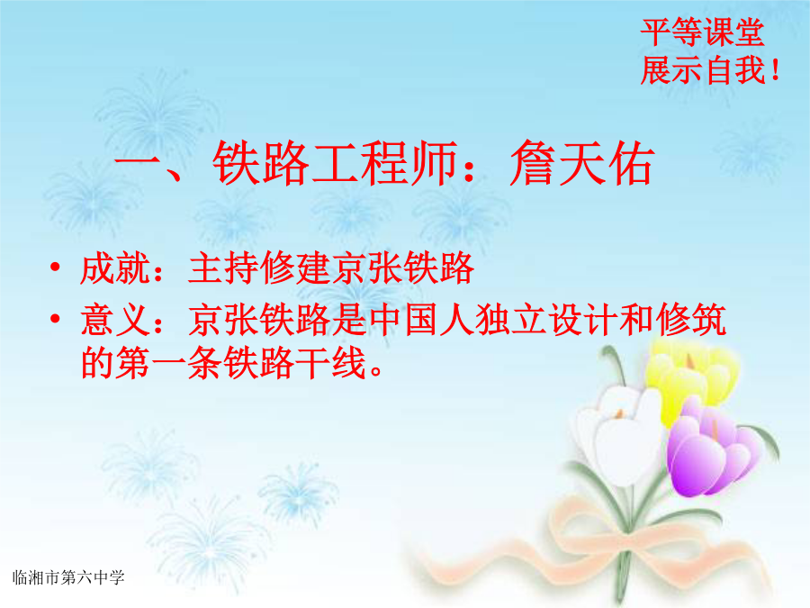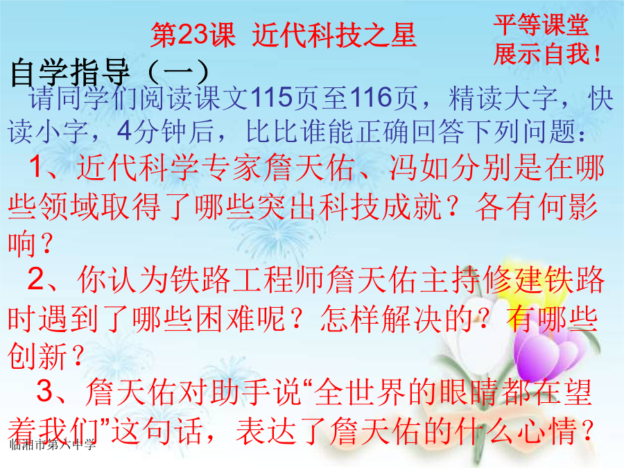 第23课近代科技之星学习目标:自学指导(一)一、铁路工程师:詹天佑一、詹天佑和京张铁路1、詹天佑在主持修建京张铁路时遇到了哪些艰难险阻呢?他又是怎样解决的? 首先是实地勘察,精选线路。“全世界的眼睛都在望着我们,必须成功。”这句话表达了詹天佑的什么心情? 阅读下列材料: 材料:我很幸运被任命担任现在的工作。中国已渐醒,而且急需铁路,现在全国各地都在征聘中国工程师。中国要用自己的资金,来建设自己的铁路,由于我成了中国第一流的工程师,因此全体中国人和外国人都密切注视着我的工作。如果我失败,不仅是我个人的不幸,因为中国工程师将不会再被人们所信赖。在我受命担任此工作前,甚至出任后,许多人公开宣称,中国工程师绝不可能担当如此艰巨的重任。 ——詹天佑给美国老师的信临湘六中赵学文