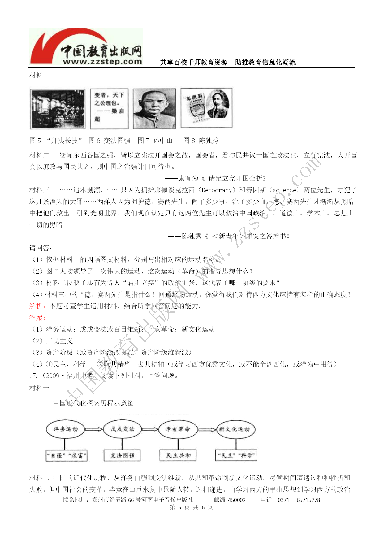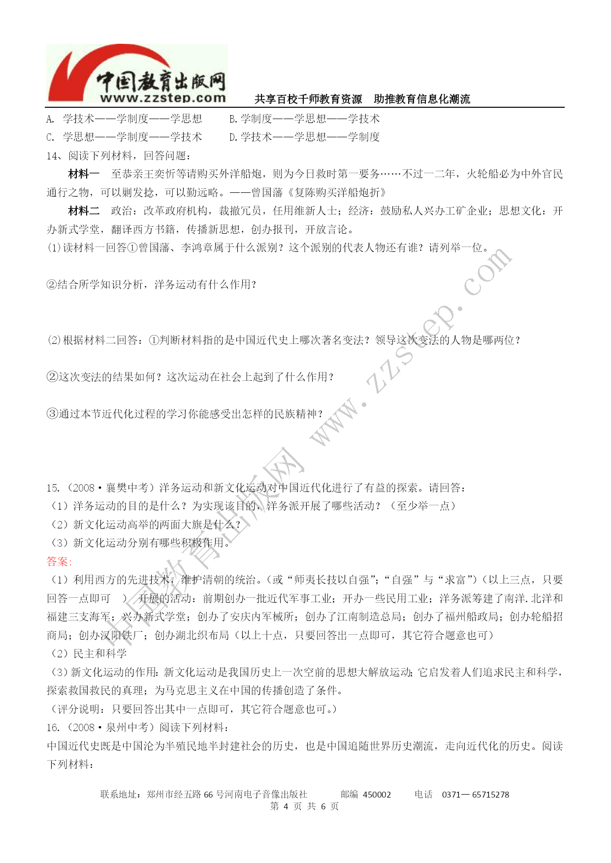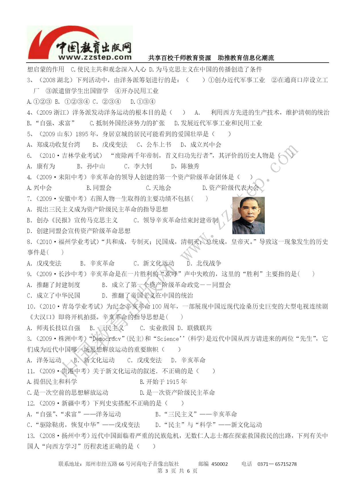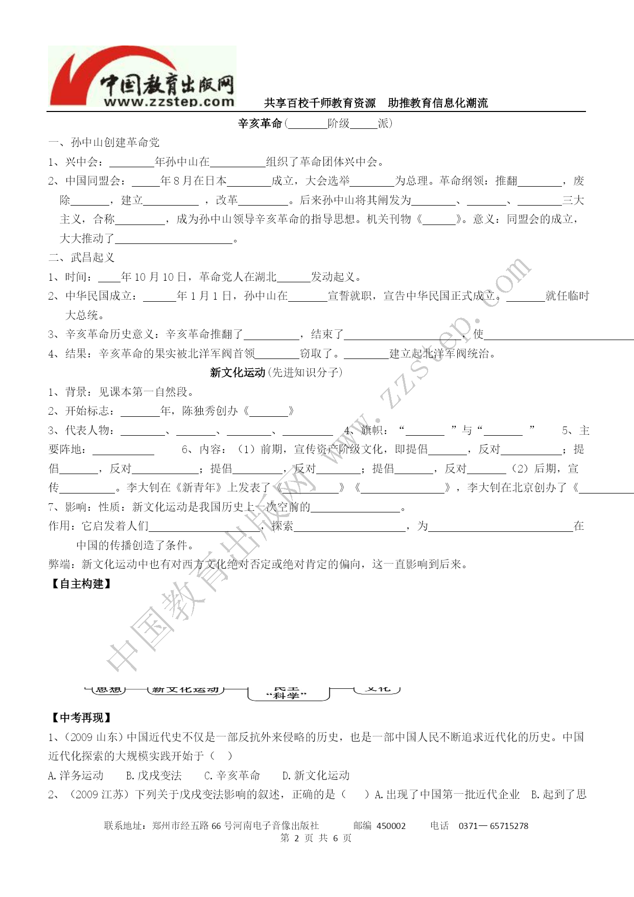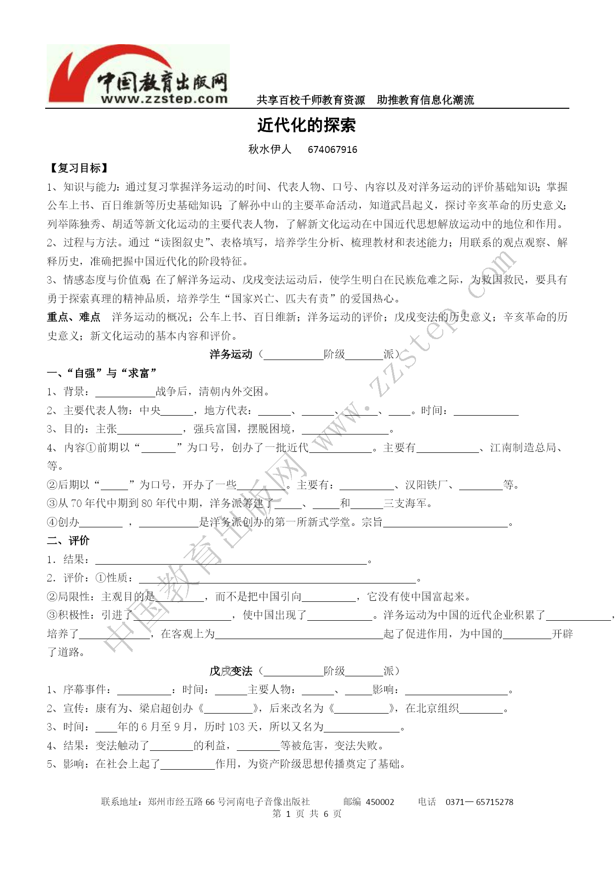 共享百校千师教育资源助推教育信息化潮流 联系地址:郑州市经五路66号河南电子音像出版社邮编450002电话0371—65715278 第页共NUMPAGES6页 近代化的探索 秋水伊人674067916 【复习目标】 1、知识与能力:通过复习掌握洋务运动的时间、代表人物、口号、内容以及对洋务运动的评价基础知识;掌握公车上书、百日维新等历史基础知识;了解孙中山的主要革命活动,知道武昌起义,探讨辛亥革命的历史意义;列举陈独秀、胡适等新文化运动的主要代表人物,了解新文化运动在中国近代思想解放运动中的地位和作用。 2、过程与方法。通过“读图叙史”、表格填写,培养学生分析、梳理教材和表述能力;用联系的观点观察、解释历史,准确把握中国近代化的阶段特征。 3、情感态度与价值观:在了解洋务运动、戊戌变法运动后,使学生明白在民族危难之际,为救国救民,要具有勇于探索真理的精神品质,培养学生“国家兴亡、匹夫有责”的爱国热心。 重点、难点洋务运动的概况;公车上书、百日维新;洋务运动的评价;戊戌变法的历史意义;辛亥革命的历史意义;新文化运动的基本内容和评价。 洋务运动(阶级派) 一、“自强”与“求富” 1、背景:战争后,清朝内外交困。 2、主要代表人物:中央,地方代表:、、、。时间: 3、目的:主张,强兵富国,摆脱困境,。 4、内容①前期以“”为口号,创办了一批近代。主要有、江南制造总局、等。 ②后期以“”为口号,开办了一些。主要有:、汉阳铁厂、等。 ③从70年代中期到80年代中期,洋务派筹建了、和三支海军。 ④创办,是洋务派创办的第一所新式学堂。宗旨。 二、评价 1.结果:。 2.评价:①性质:。 ②局限性:主观目的是,而不是把中国引向,它没有使中国富起来。 ③积极性:引进了,使中国出现了。洋务运动为中国的近代企业积累了,培养了,在客观上为起了促进作用,为中国的开辟了道路。 戊戌变法(阶级派) 1、序幕事件::时间:主要人物:、影响:。 2、宣传:康有为、梁启超创办《》,后来改名为《》,在北京组织。 3、时间:年的6月至9月,历时103天,所以又名为。 4、结果:变法触动了的利益,等被危害,变法失败。 5、影响:在社会上起了作用,为资产阶级思想传播奠定了基础。 辛亥革命(阶级派) 一、孙中山创建革命党 1、兴中会:年孙中山在组织了革命团体兴中会。 2、中国同盟会:年8月在日本成立,大会选举为总理。革命纲领:推翻,废除,建立,改革。后来孙中山将其阐发为、、三大主义,合称,成为孙中山领导辛亥革命的指导思想。机关刊物《》。意义:同盟会的成立,大大推动了。 二、武昌起义 1、时间:年10月10日,革命党人在湖北发动起义。 2、中华民国成立:年1月1日,孙中山在宣誓就职,宣告中华民国正式成立。就任临时大总统。 3、辛亥革命历史意义:辛亥革命推翻了,结束了,使。 4、结果:辛亥革命的果实被北洋军阀首领窃取了。建立起北洋军阀统治。 新文化运动(先进知识分子) 1、背景:见课本第一自然段。 2、开始标志:年,陈独秀创办《》 3、代表人物:、、、4、旗帜:“”与“”5、主要阵地:6、内容:(1)前期,宣传资产阶级文化,即提倡,反对;提倡,反对;提倡,反对;提倡,反对(2)后期,宣传。李大钊在《新青年》上发表了《》《》,李大钊在北京创办了《》 7、影响:性质:新文化运动是我国历史上一次空前的。 作用:它启发着人们,探索,为在中国的传播创造了条件。 弊端:新文化运动中也有对西方文化绝对否定或绝对肯定的偏向,这一直影响到后来。 【自主构建】 【中考再现】 1、(2009山东)中国近代史不仅是一部反抗外来侵略的历史,也是一部中国人民不断追求近代化的历史。中国近代化探索的大规模实践开始于() A.洋务运动B.戊戌变法C.辛亥革命D.新文化运动 2、(2009江苏)下列关于戊戌变法影响的叙述,正确的是()A.出现了中国第一批近代企业B.起到了思想启蒙的作用C.使民主共和观念深入人心D.为马克思主义在中国的传播创造了条件 3、(2008湖北)下列活动中,由洋务派筹划进行的是:()①创办近代军事工业②在通商口岸设立工厂③派遣留学生出国留学④开办民用工业 A.①②③B.①②③④C.②③④D.①③④ 4、(2009浙江)洋务派发动洋务运动的根本目的是()A.利用西方先进的生产技术,维护清朝的统治B.“自强、求富”C.抵制外国经济势力的扩张D.发展近代军事工业和民用工业 5、(2009山东)1895年,身居京城的居民可能看到的爱国壮举是()A、郑成功收复台湾B、戊戌变法C、公车上书D、成立兴中会 6.(2010·吉林学业考试)“废除两千年帝制,首义归功先行者”,其评价的历史人物是() A.康有为B.孙中山C.李大钊D,陈独秀 4.(2009·耒阳中考)辛亥革命的领导
