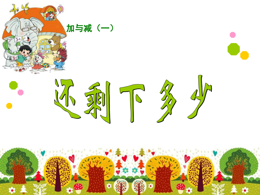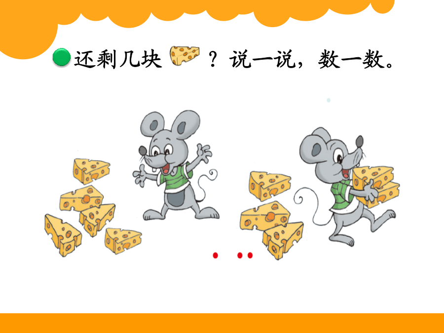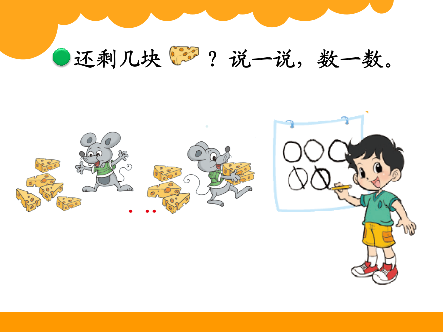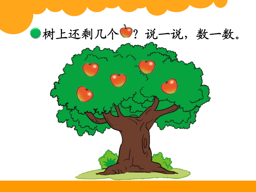 加与减(一)树上还剩几个?说一说,数一数。还剩几块?说一说,数一数。还剩几块?说一说,数一数。认一认。画一画,算一算。画一画,算一算。画一画,算一算。画一画,算一算画一画,算一算画一画,算一算还剩下多少?还剩下多少?说一说。4说一说3
