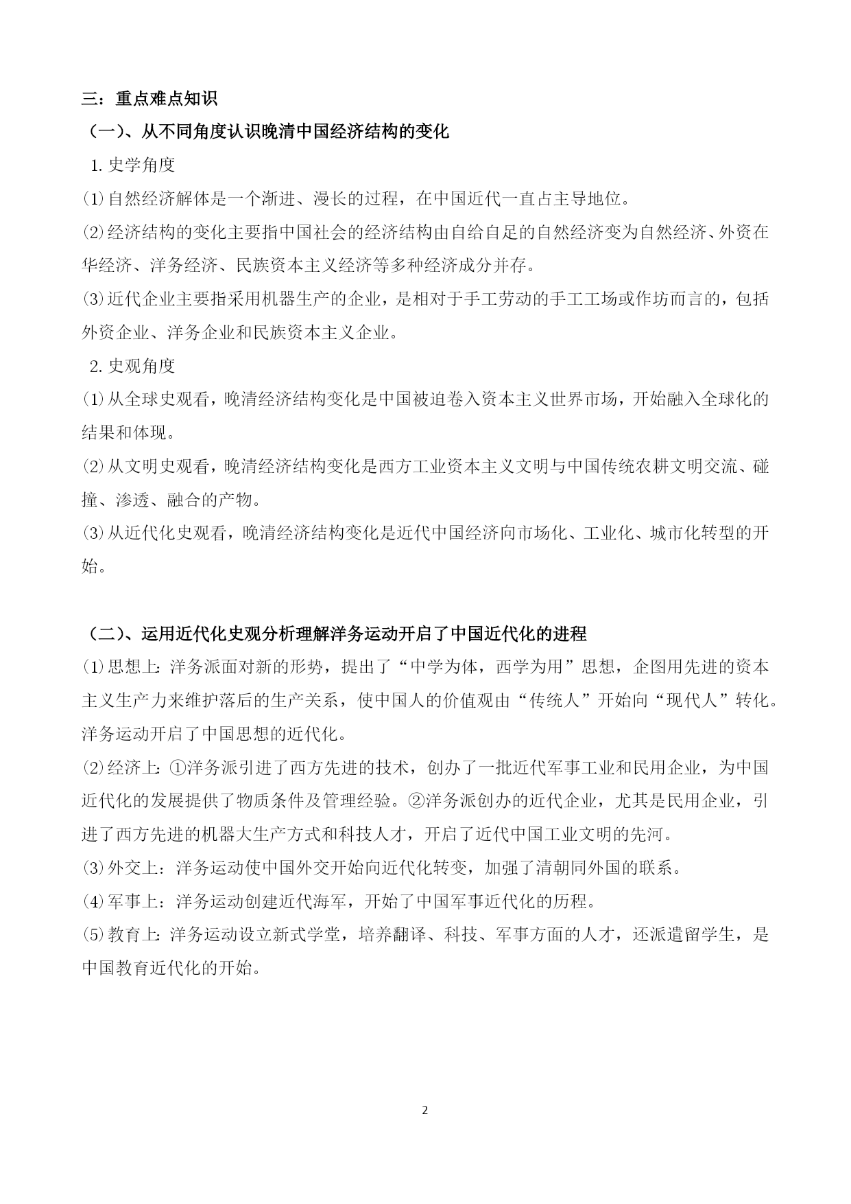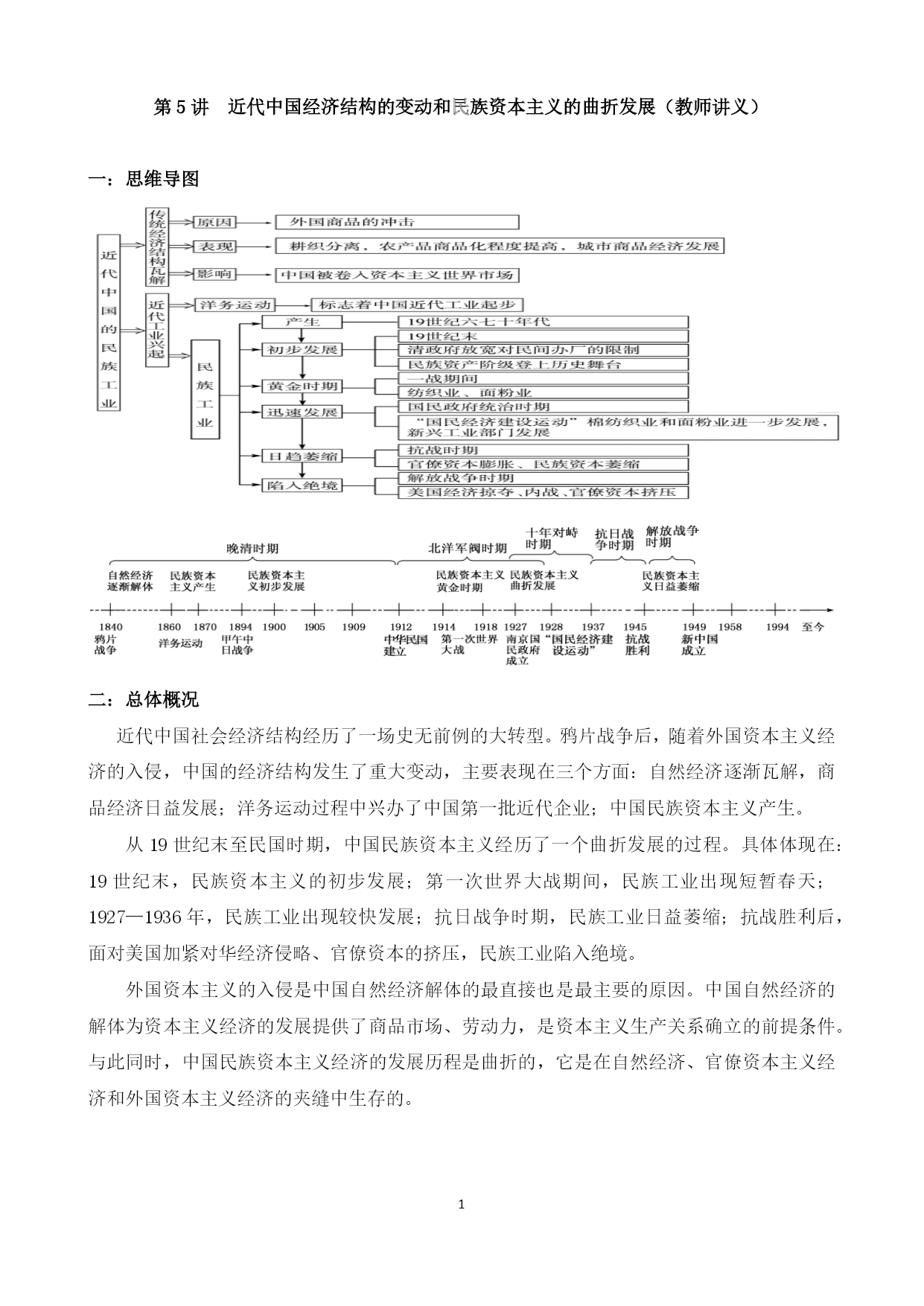 PAGE\*MERGEFORMAT4 第5讲近代中国经济结构的变动和民族资本主义的曲折发展(教师讲义) 一:思维导图 二:总体概况 近代中国社会经济结构经历了一场史无前例的大转型。鸦片战争后,随着外国资本主义经济的入侵,中国的经济结构发生了重大变动,主要表现在三个方面:自然经济逐渐瓦解,商品经济日益发展;洋务运动过程中兴办了中国第一批近代企业;中国民族资本主义产生。 从19世纪末至民国时期,中国民族资本主义经历了一个曲折发展的过程。具体体现在:19世纪末,民族资本主义的初步发展;第一次世界大战期间,民族工业出现短暂春天;1927—1936年,民族工业出现较快发展;抗日战争时期,民族工业日益萎缩;抗战胜利后,面对美国加紧对华经济侵略、官僚资本的挤压,民族工业陷入绝境。 外国资本主义的入侵是中国自然经济解体的最直接也是最主要的原因。中国自然经济的解体为资本主义经济的发展提供了商品市场、劳动力,是资本主义生产关系确立的前提条件。与此同时,中国民族资本主义经济的发展历程是曲折的,它是在自然经济、官僚资本主义经济和外国资本主义经济的夹缝中生存的。 三:重点难点知识 (一)、从不同角度认识晚清中国经济结构的变化 1.史学角度 (1)自然经济解体是一个渐进、漫长的过程,在中国近代一直占主导地位。 (2)经济结构的变化主要指中国社会的经济结构由自给自足的自然经济变为自然经济、外资在华经济、洋务经济、民族资本主义经济等多种经济成分并存。 (3)近代企业主要指采用机器生产的企业,是相对于手工劳动的手工工场或作坊而言的,包括外资企业、洋务企业和民族资本主义企业。 2.史观角度 (1)从全球史观看,晚清经济结构变化是中国被迫卷入资本主义世界市场,开始融入全球化的结果和体现。 (2)从文明史观看,晚清经济结构变化是西方工业资本主义文明与中国传统农耕文明交流、碰撞、渗透、融合的产物。 (3)从近代化史观看,晚清经济结构变化是近代中国经济向市场化、工业化、城市化转型的开始。 (二)、运用近代化史观分析理解洋务运动开启了中国近代化的进程 (1)思想上:洋务派面对新的形势,提出了“中学为体,西学为用”思想,企图用先进的资本主义生产力来维护落后的生产关系,使中国人的价值观由“传统人”开始向“现代人”转化。洋务运动开启了中国思想的近代化。 (2)经济上:①洋务派引进了西方先进的技术,创办了一批近代军事工业和民用企业,为中国近代化的发展提供了物质条件及管理经验。②洋务派创办的近代企业,尤其是民用企业,引进了西方先进的机器大生产方式和科技人才,开启了近代中国工业文明的先河。 (3)外交上:洋务运动使中国外交开始向近代化转变,加强了清朝同外国的联系。 (4)军事上:洋务运动创建近代海军,开始了中国军事近代化的历程。 (5)教育上:洋务运动设立新式学堂,培养翻译、科技、军事方面的人才,还派遣留学生,是中国教育近代化的开始。 (三)、近代中国民族资本主义经济的曲折发展历程 时期特征主要原因主要表现主要影响19世纪六七十年代产生鸦片战争后自然经济开始瓦解;外商企业和洋务运动的刺激、诱导上海发昌机器厂、天津贻来牟机器磨坊、广东继昌隆缫丝厂中国产生资本主义的生产方式,产生了民族资产阶级19世纪末初步发展自然经济进一步解体;清政府放宽对民间办厂的限制;“实业救国”思潮兴起棉纺织业发展尤为迅速民族资产阶级领导戊戌变法、辛亥革命一战期间黄金时期列强暂时放松对中国的经济侵略;中华民国的成立;群众性的反帝爱国运动推动轻工业迅速发展,重工业和新兴化学工业有一定发展为新文化运动开展、旧民主主义革命向新民主主义革命转变、中国共产党诞生提供物质和阶级基础国民政府统治前期(1927-1936年)较快发展国民政府实现形式上的全国基本统一;开展“国民经济建设运动”新建厂矿增多,部分工业品出口国外,经济增长速度创记录国民生产总值逐年增加,但没有成为中国近代化的主导国民政府统治后期(1937-1949年)日趋萎缩日伪政权对沦陷区经济的破坏;官僚资本的排挤和打击民族企业遭受空前打击。沦陷区的企业或被日军所毁,或被日军吞并;国统区的民族资本在官僚资本的压榨下日益萎缩民族工业陷入绝境,国民经济走向崩溃过渡时期(1949-1956年)走向新生合理调整政策;进行社会主义改造资本主义经济基本消失确立社会主义计划经济体制 (四)、民族资本主义在中国近代发展进程中的地位和作用 1.从经济上看,民族资本主义工业是一种新的经济因素,它的产生和发展有利于社会进步,符合历史发展的潮流。 2.从政治上看,它导致民族资产阶级产生并发展壮大,为维新变法运动和资产阶级民主革命提供了社会基础,也导致无产阶级队伍的壮大,为新民主主义革命的到来和中国共产党的诞生准备了阶级条件。 3.从思想上看,中国民族资本主义的产生和
