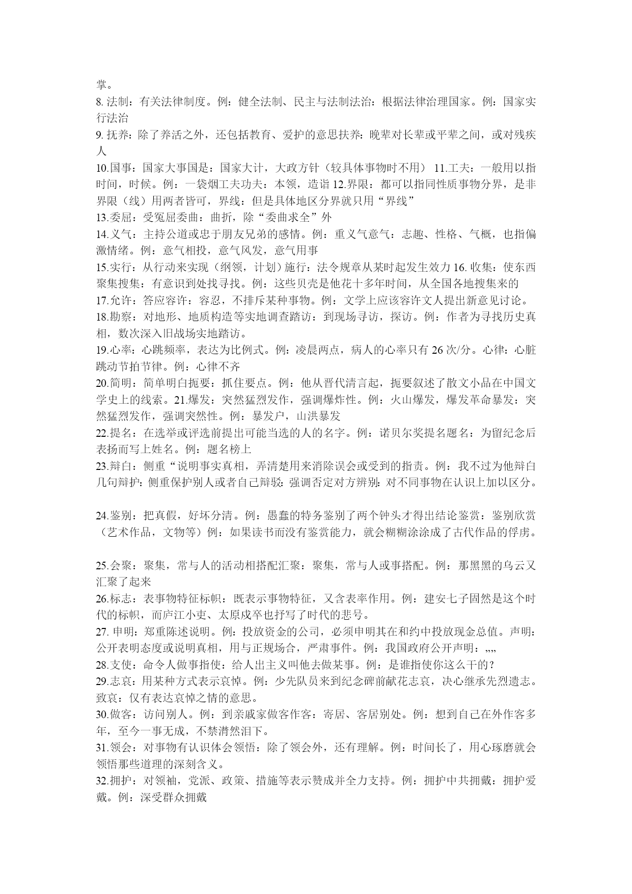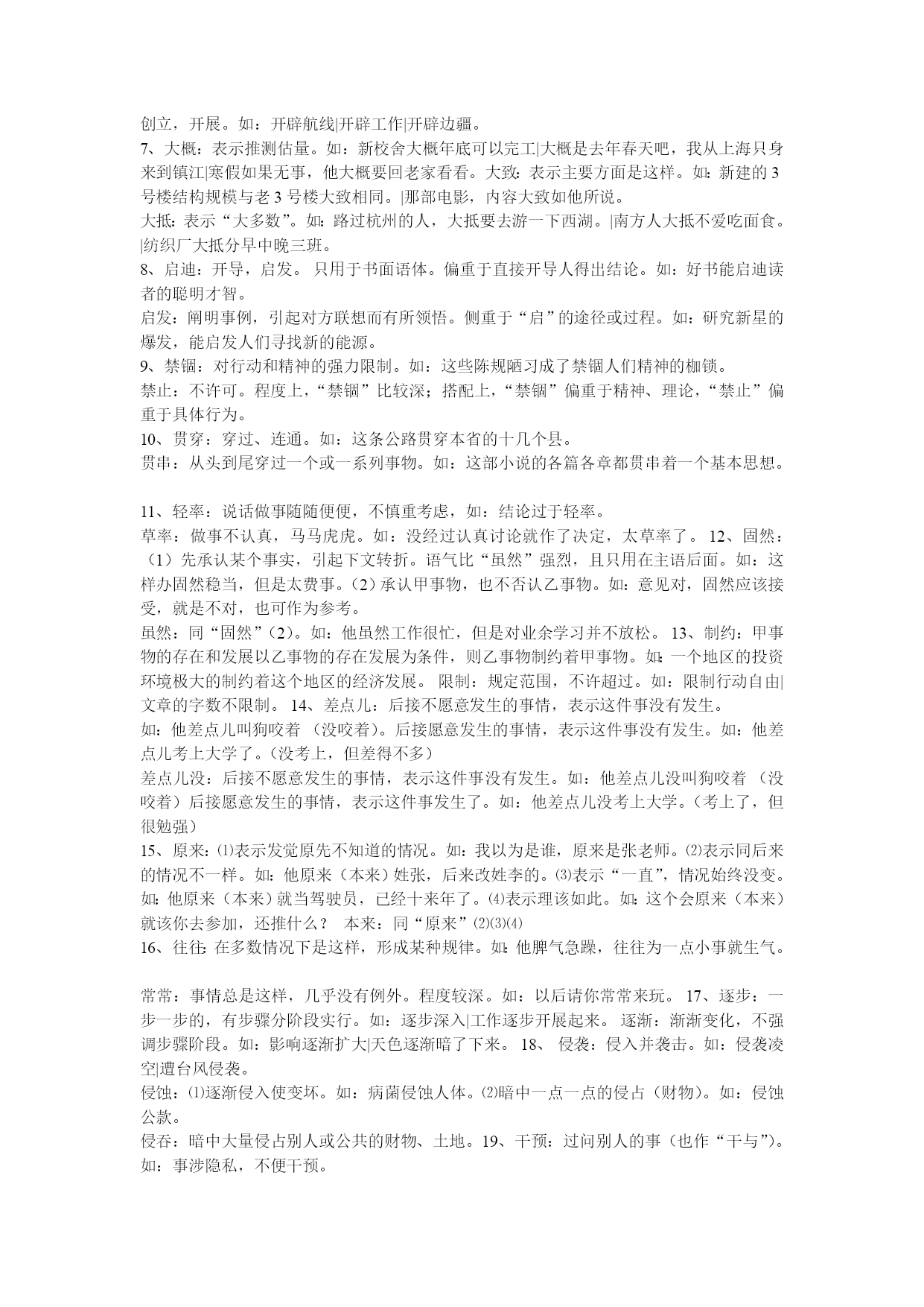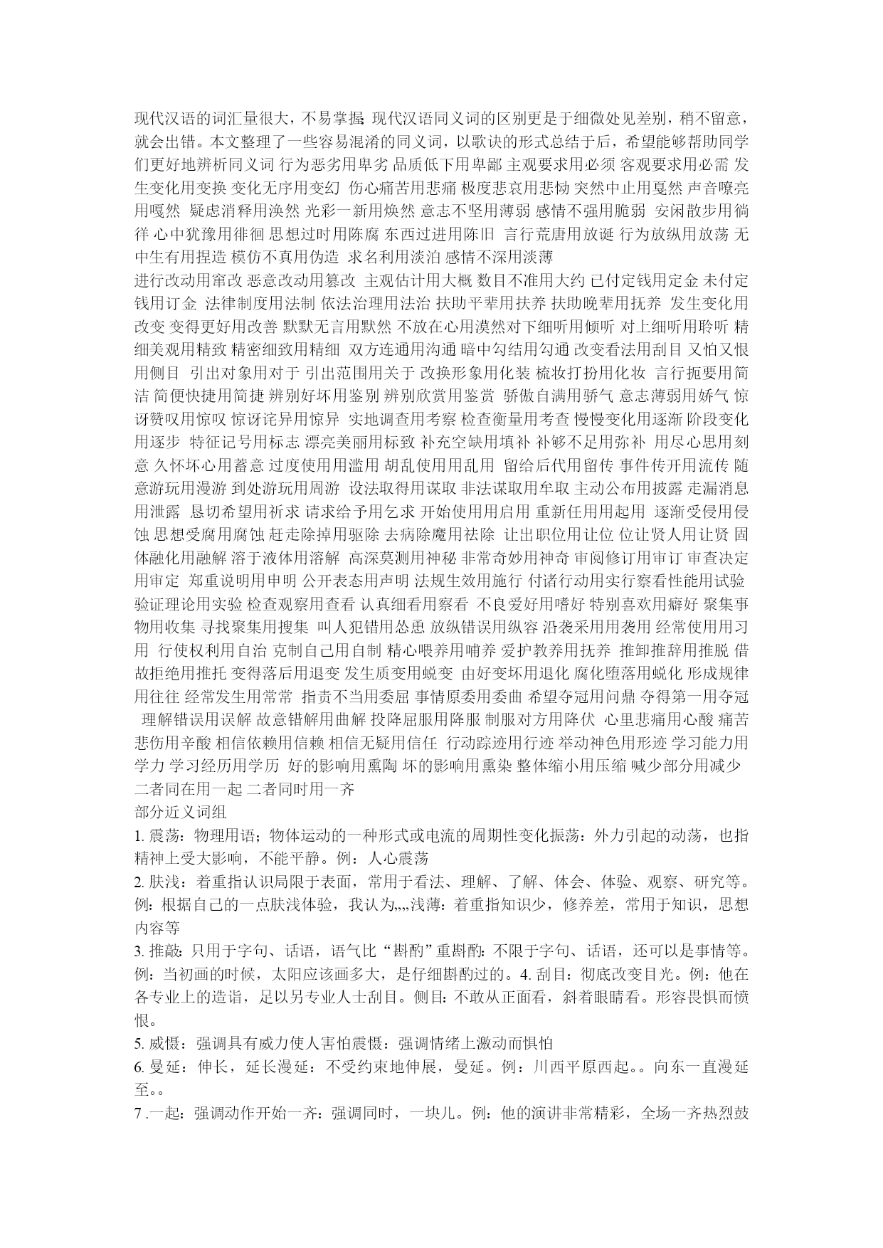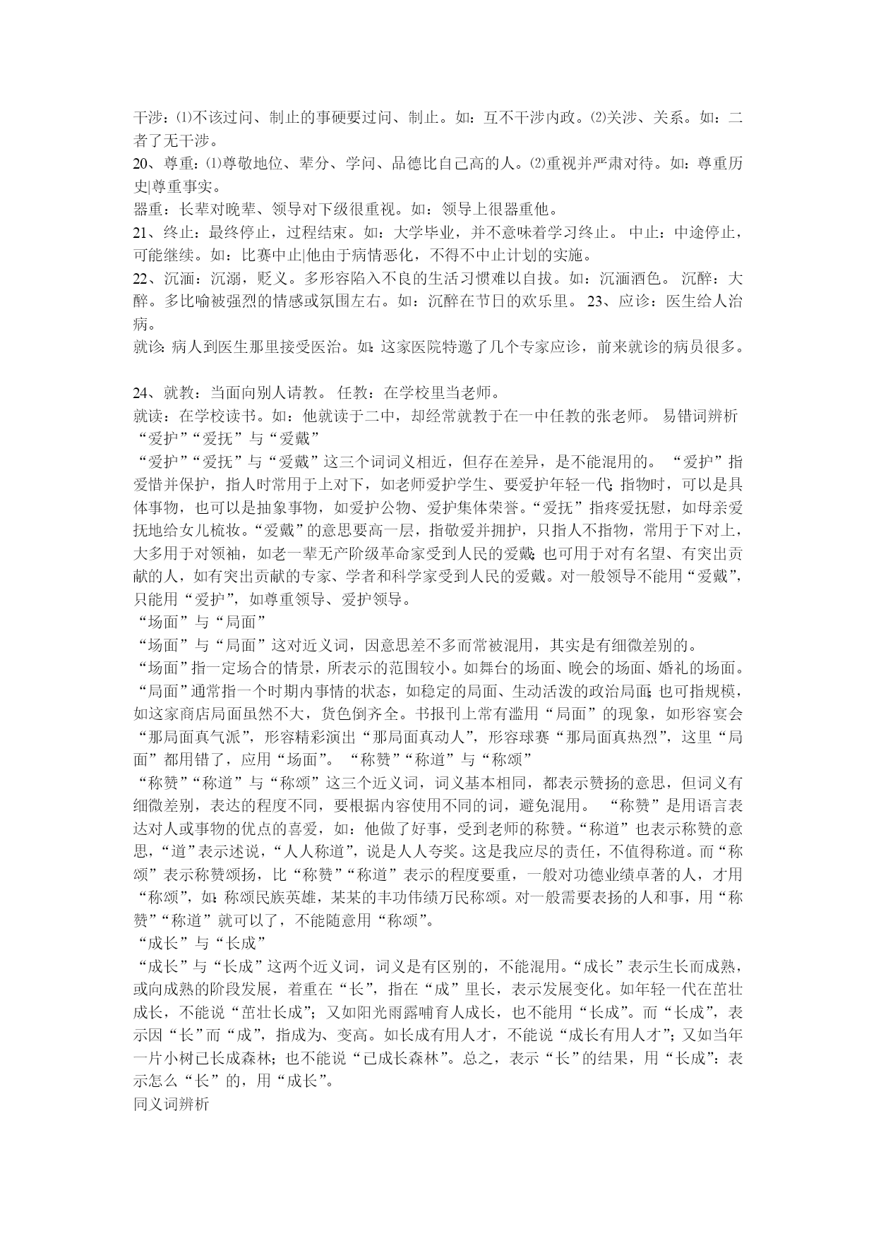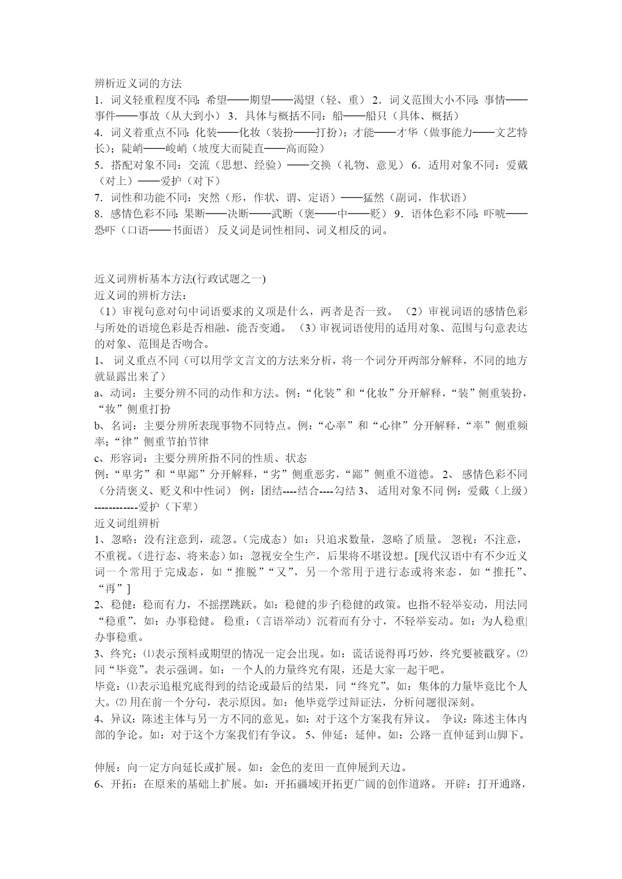 辨析近义词的方法 1.词义轻重程度不同:希望──期望──渴望(轻、重)2.词义范围大小不同:事情──事件──事故(从大到小)3.具体与概括不同:船──船只(具体、概括) 4.词义着重点不同:化装──化妆(装扮──打扮);才能──才华(做事能力──文艺特长);陡峭──峻峭(坡度大而陡直──高而险) 5.搭配对象不同:交流(思想、经验)──交换(礼物、意见)6.适用对象不同:爱戴(对上)──爱护(对下) 7.词性和功能不同:突然(形,作状、谓、定语)──猛然(副词,作状语) 8.感情色彩不同:果断──决断──武断(褒──中──贬)9.语体色彩不同:吓唬──恐吓(口语──书面语)反义词是词性相同、词义相反的词。 近义词辨析基本方法(行政试题之一) 近义词的辨析方法: (1)审视句意对句中词语要求的义项是什么,两者是否一致。(2)审视词语的感情色彩与所处的语境色彩是否相融,能否变通。(3)审视词语使用的适用对象、范围与句意表达的对象、范围是否吻合。 1、词义重点不同(可以用学文言文的方法来分析,将一个词分开两部分解释,不同的地方就显露出来了) a、动词:主要分辨不同的动作和方法。例:“化装”和“化妆”分开解释,“装”侧重装扮,“妆”侧重打扮 b、名词:主要分辨所表现事物不同特点。例:“心率”和“心律”分开解释,“率”侧重频率;“律”侧重节拍节律 c、形容词:主要分辨所指不同的性质、状态 例:“卑劣”和“卑鄙”分开解释,“劣”侧重恶劣,“鄙”侧重不道德。2、感情色彩不同(分清褒义、贬义和中性词)例:团结----结合----勾结3、适用对象不同例:爱戴(上级)------------爱护(下辈) 近义词组辨析 1、忽略:没有注意到,疏忽。(完成态)如:只追求数量,忽略了质量。忽视:不注意,不重视。(进行态、将来态)如:忽视安全生产,后果将不堪设想。[现代汉语中有不少近义词一个常用于完成态,如“推脱”“又”,另一个常用于进行态或将来态,如“推托”、“再”] 2、稳健:稳而有力,不摇摆跳跃。如:稳健的步子|稳健的政策。也指不轻举妄动,用法同“稳重”,如:办事稳健。稳重:(言语举动)沉着而有分寸,不轻举妄动。如:为人稳重|办事稳重。 3、终究:⑴表示预料或期望的情况一定会出现。如:谎话说得再巧妙,终究要被戳穿。⑵同“毕竟”。表示强调。如:一个人的力量终究有限,还是大家一起干吧。 毕竟:⑴表示追根究底得到的结论或最后的结果,同“终究”。如:集体的力量毕竟比个人大。⑵用在前一个分句,表示原因。如:他毕竟学过辩证法,分析问题很深刻。 4、异议:陈述主体与另一方不同的意见。如:对于这个方案我有异议。争议:陈述主体内部的争论。如:对于这个方案我们有争议。5、伸延:延伸。如:公路一直伸延到山脚下。 伸展:向一定方向延长或扩展。如:金色的麦田一直伸展到天边。 6、开拓:在原来的基础上扩展。如:开拓疆域|开拓更广阔的创作道路。开辟:打开通路,创立,开展。如:开辟航线|开辟工作|开辟边疆。 7、大概:表示推测估量。如:新校舍大概年底可以完工|大概是去年春天吧,我从上海只身来到镇江|寒假如果无事,他大概要回老家看看。大致:表示主要方面是这样。如:新建的3号楼结构规模与老3号楼大致相同。|那部电影,内容大致如他所说。 大抵:表示“大多数”。如:路过杭州的人,大抵要去游一下西湖。|南方人大抵不爱吃面食。|纺织厂大抵分早中晚三班。 8、启迪:开导,启发。只用于书面语体。偏重于直接开导人得出结论。如:好书能启迪读者的聪明才智。 启发:阐明事例,引起对方联想而有所领悟。侧重于“启”的途径或过程。如:研究新星的爆发,能启发人们寻找新的能源。 9、禁锢:对行动和精神的强力限制。如:这些陈规陋习成了禁锢人们精神的枷锁。 禁止:不许可。程度上,“禁锢”比较深;搭配上,“禁锢”偏重于精神、理论,“禁止”偏重于具体行为。 10、贯穿:穿过、连通。如:这条公路贯穿本省的十几个县。 贯串:从头到尾穿过一个或一系列事物。如:这部小说的各篇各章都贯串着一个基本思想。 11、轻率:说话做事随随便便,不慎重考虑,如:结论过于轻率。 草率:做事不认真,马马虎虎。如:没经过认真讨论就作了决定,太草率了。12、固然:(1)先承认某个事实,引起下文转折。语气比“虽然”强烈,且只用在主语后面。如:这样办固然稳当,但是太费事。(2)承认甲事物,也不否认乙事物。如:意见对,固然应该接受,就是不对,也可作为参考。 虽然:同“固然”(2)。如:他虽然工作很忙,但是对业余学习并不放松。13、制约:甲事物的存在和发展以乙事物的存在发展为条件,则乙事物制约着甲事物。如:一个地区的投资环境极大的制约着这个地区的经济发展。限制:规定范围,不许超过。如:限制行动自由|文章的字数不限制。14、差点儿:后接不愿意发生的事情,表