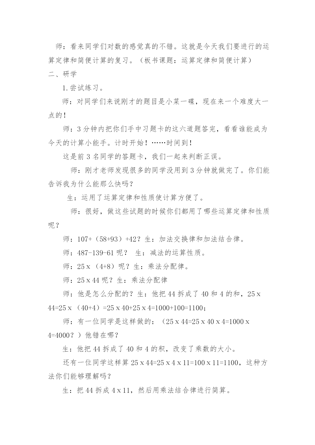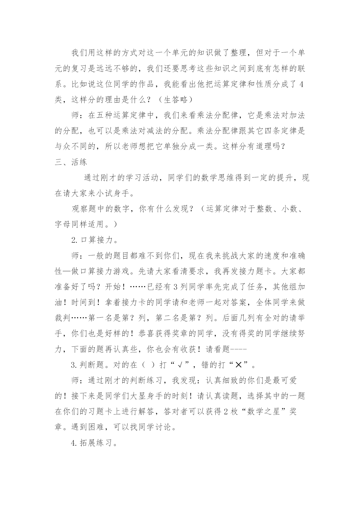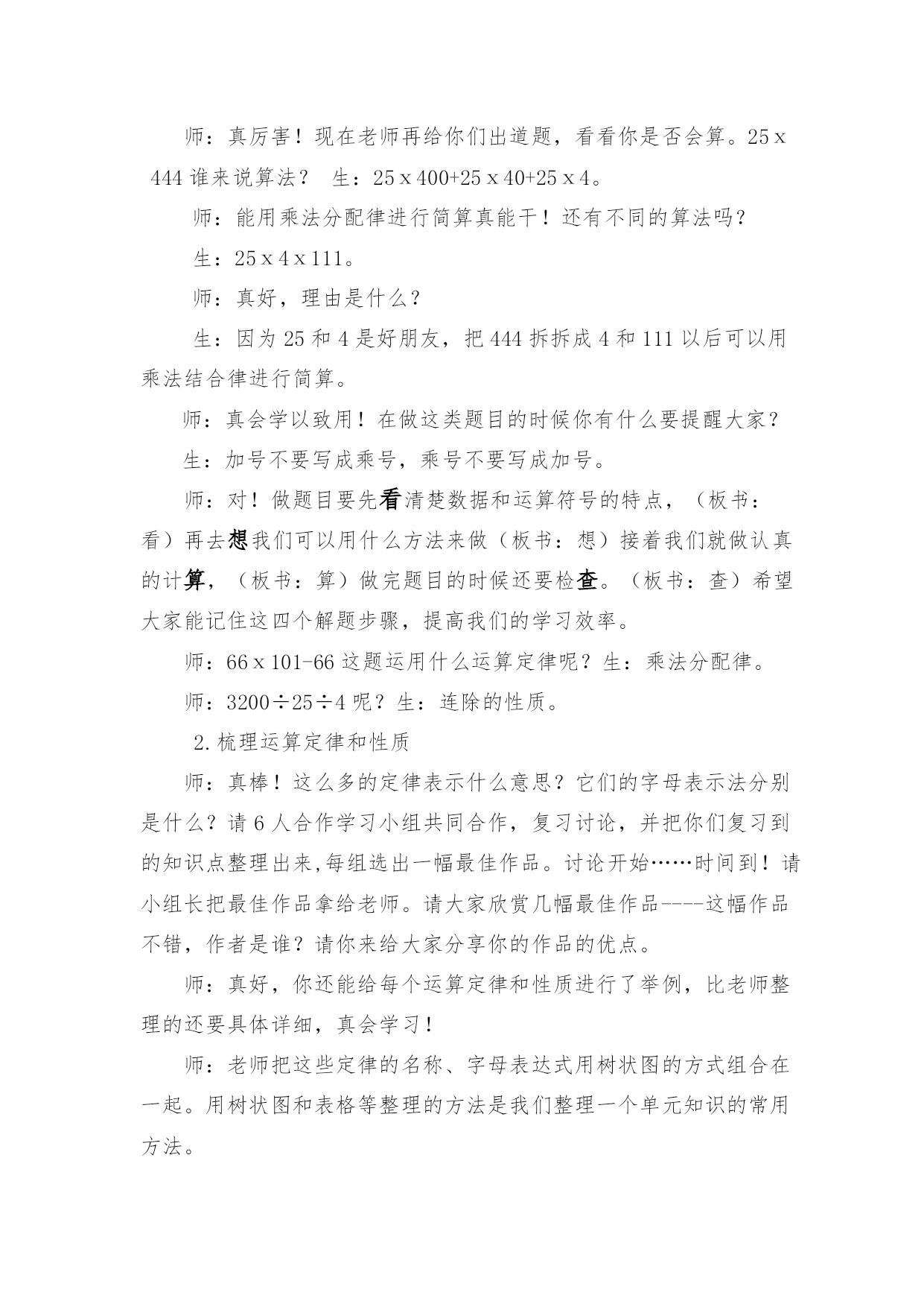 人教版小学数学四年级下册 运算定律与简便计算的复习 执教者:韦慧儒执教班级:四(5)班 教学目标: 1.通过复习,使学生进一步理解和掌握加法和乘法的运算定律,并能根据数据特征灵活选择运算方法进行简便计算。 2.通过复习,引导学生学会回顾梳理知识内容的基本方法,积累梳理知识的活动经验,提高梳理知识的能力。 教学重点:整理并运用运算定律和性质简便计算。 教学难点:根据算式的特点灵活选择计算方法,正确计算。 教学过程: 一、智导——谈话激趣,引入课题 师:我知道同学们非常喜欢数学,喜欢数学的人对数的感觉往往是不错的,现在我要试试同学们对数的感觉。125ⅹ45ⅹ(),要快速的计算你认为横线应该填什么数字。生:填8。 师:为什么填8?生:填8可以使计算简便。 师:怎么算?生:125ⅹ45ⅹ8=(125ⅹ8)ⅹ45=1000ⅹ45=45000 师:请观察这个等式:125ⅹ45ⅹ8=(125ⅹ8)ⅹ45什么变了什么没有变?生:运算顺序变了,数字没有变。 师:这样变的依据是什么呢? 生:乘法的交换律和乘法的结合律使125和8凑成整千,这样运算就方便了。 师:看来同学们对数的感觉真的不错。这就是今天我们要进行的运算定律和简便计算的复习。(板书课题:运算定律和简便计算) 二、研学 1.尝试练习。 师:对同学们来说刚才的题目是小菜一碟,现在来一个难度大一点的! 师:3分钟内把你们手中习题卡的这六道题答完,看看谁能成为今天的计算小能手。计时开始!……时间到! 这是前3名同学的答题卡,我们一起来判断正误。 师:刚才老师发现很多的同学没用到3分钟就做完了。你们能告诉我为什么能那么快吗? 生:运用了运算定律和性质使计算方便了。 师:很好,做这些试题的时候你们都用了哪些运算定律和性质呢? 师:107+(58+93)+42?生:加法交换律和加法结合律。 师:487-139-61呢?生:减法的运算性质。 师:25ⅹ(4+8)呢?生:乘法分配律。 师:25ⅹ44呢?生:乘法分配律 师:他是怎么分配的?生:他把44拆成了40和4的和,25ⅹ44=25ⅹ(40+4)=25ⅹ40+25ⅹ4=1000+100=1100; 师:有一位同学是这样做的:(25ⅹ44=25ⅹ40ⅹ4=1000ⅹ4=4000?)他错在哪? 生:他把44拆成了40和4的积,改变了乘数的大小。 还有一位同学这样算25ⅹ44=25ⅹ4ⅹ11=100ⅹ11=1100,这种方法你们能够理解吗? 生:把44拆成4ⅹ11,然后用乘法结合律进行简算。 师:真厉害!现在老师再给你们出道题,看看你是否会算。25ⅹ444谁来说算法?生:25ⅹ400+25ⅹ40+25ⅹ4。 师:能用乘法分配律进行简算真能干!还有不同的算法吗? 生:25ⅹ4ⅹ111。 师:真好,理由是什么? 生:因为25和4是好朋友,把444拆拆成4和111以后可以用乘法结合律进行简算。 师:真会学以致用!在做这类题目的时候你有什么要提醒大家? 生:加号不要写成乘号,乘号不要写成加号。 师:对!做题目要先看清楚数据和运算符号的特点,(板书:看)再去想我们可以用什么方法来做(板书:想)接着我们就做认真的计算,(板书:算)做完题目的时候还要检查。(板书:查)希望大家能记住这四个解题步骤,提高我们的学习效率。 师:66ⅹ101-66这题运用什么运算定律呢?生:乘法分配律。 师:3200÷25÷4呢?生:连除的性质。 2.梳理运算定律和性质 师:真棒!这么多的定律表示什么意思?它们的字母表示法分别是什么?请6人合作学习小组共同合作,复习讨论,并把你们复习到的知识点整理出来,每组选出一幅最佳作品。讨论开始……时间到!请小组长把最佳作品拿给老师。请大家欣赏几幅最佳作品----这幅作品不错,作者是谁?请你来给大家分享你的作品的优点。 师:真好,你还能给每个运算定律和性质进行了举例,比老师整理的还要具体详细,真会学习! 师:老师把这些定律的名称、字母表达式用树状图的方式组合在一起。用树状图和表格等整理的方法是我们整理一个单元知识的常用方法。 我们用这样的方式对这一个单元的知识做了整理,但对于一个单元的复习是远远不够的,我们还要思考这些知识之间到底有怎样的联系。比如说这位同学的作品,我能看出他把运算定律和性质分成了4类,这样分的理由是什么?(生答略) 师:在五种运算定律中,我们来看乘法分配律,它是乘法对加法的分配,也可以是乘法对减法的分配。乘法分配律跟其它四条定律是与众不同的,所以老师想把它单独分成一类。这样分有道理吗? 三、活练 通过刚才的学习活动,同学们的数学思维得到一定的提升,现在请大家来小试身手。 观察题中的数字,你有什么发现?(运算定律对于整数、小数、字母同样适用。) 2.口算接力。 师:一般的题目都难不到你们,现在我来挑战大家的速度和准确性—做口算接力游戏