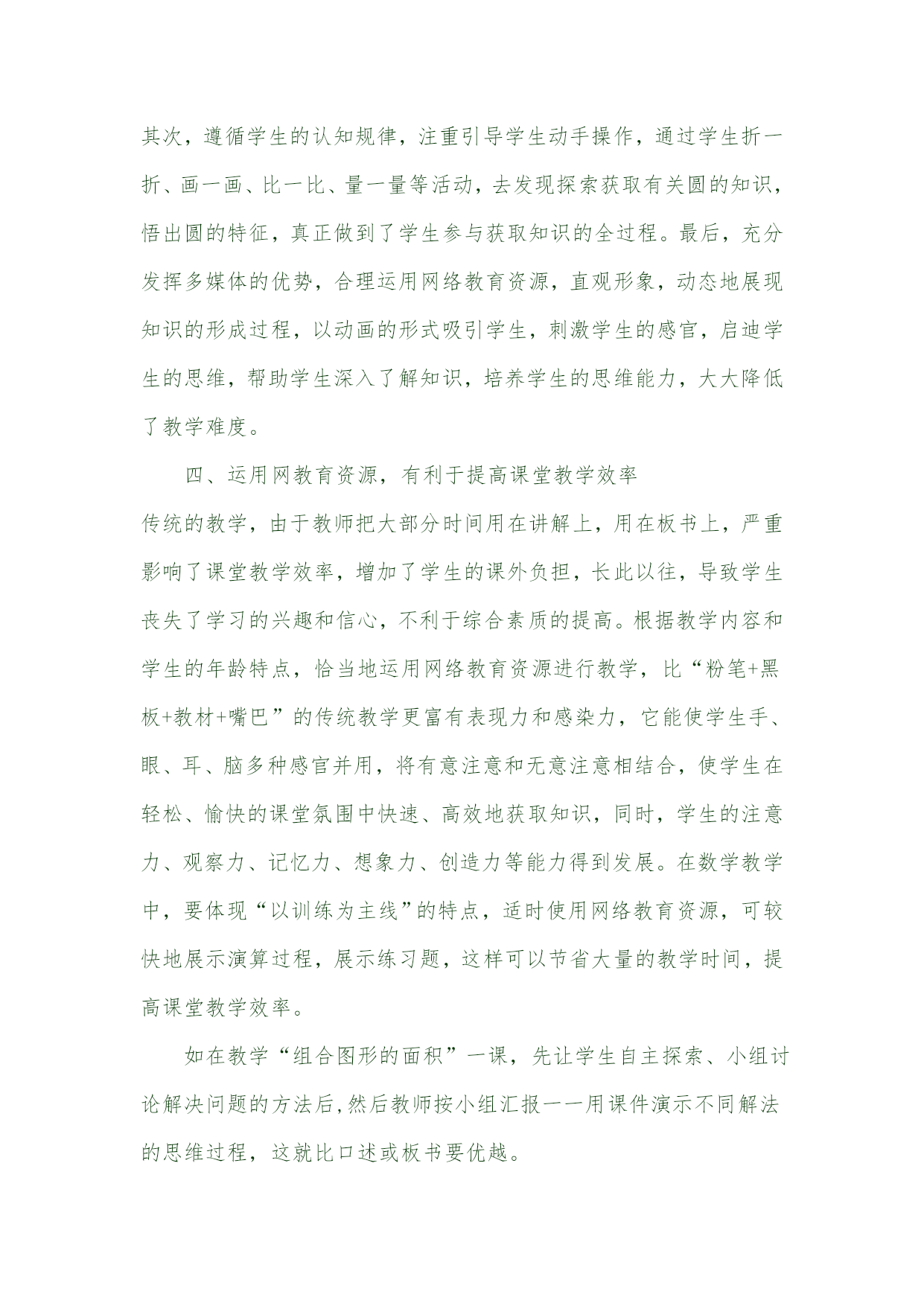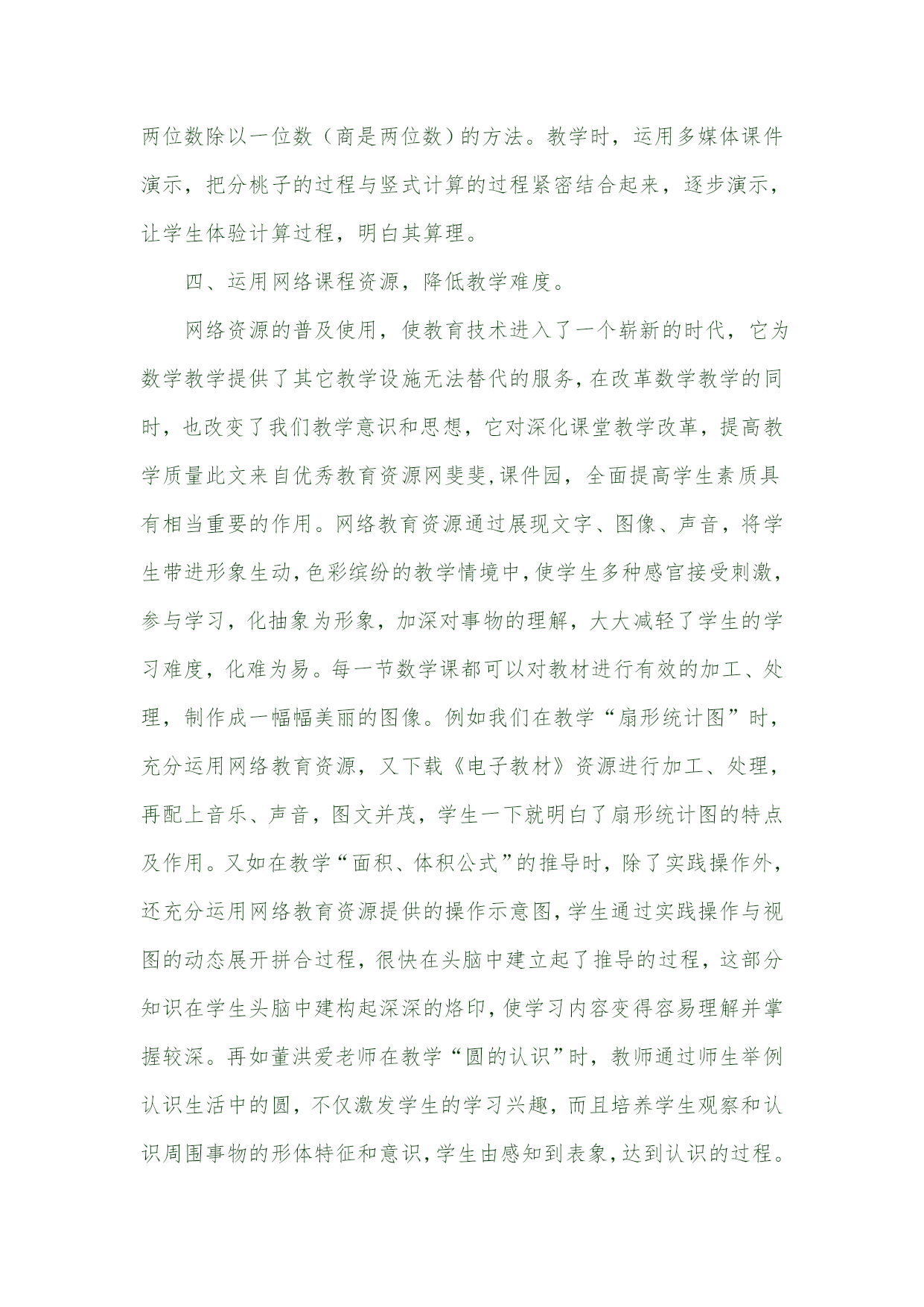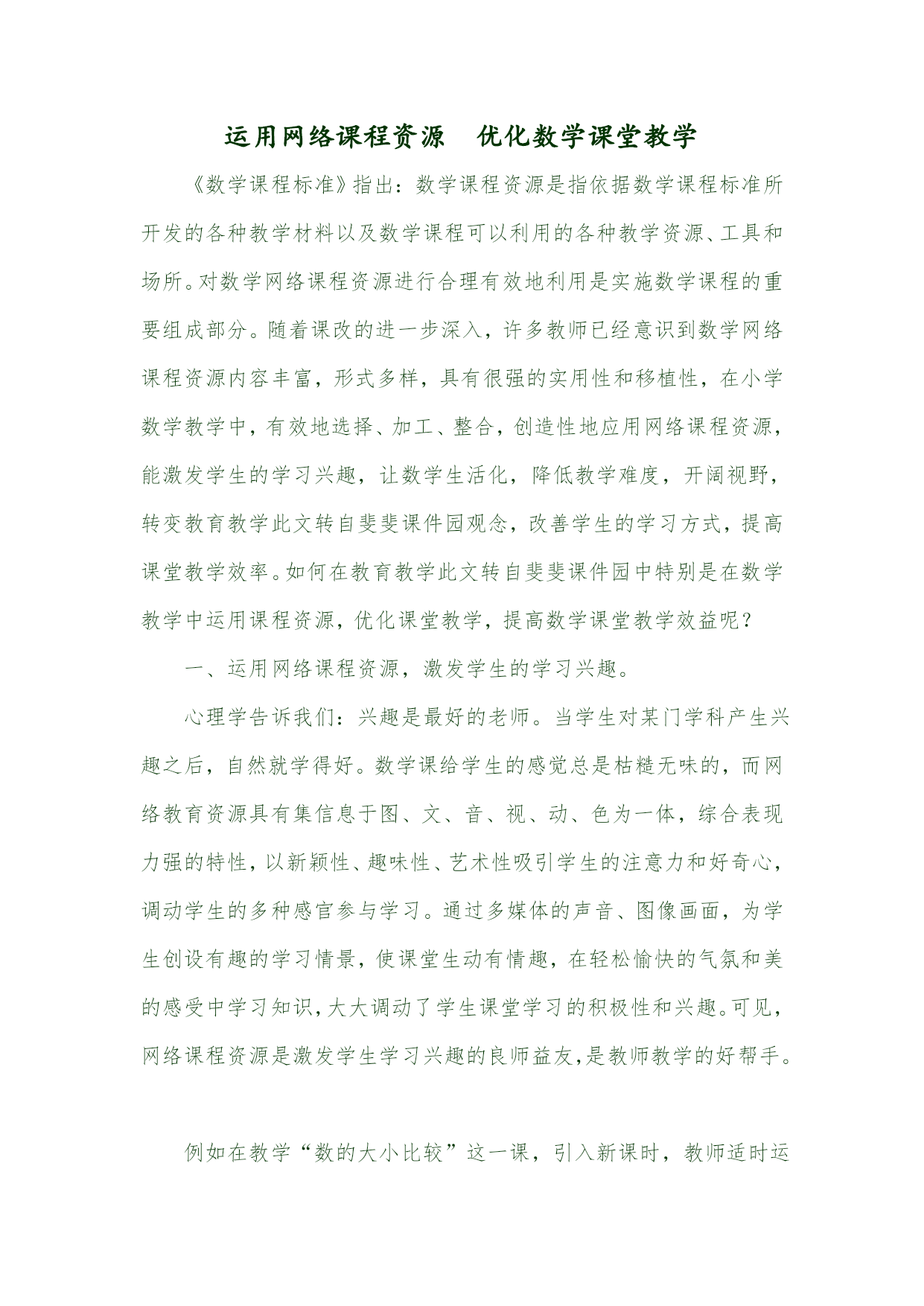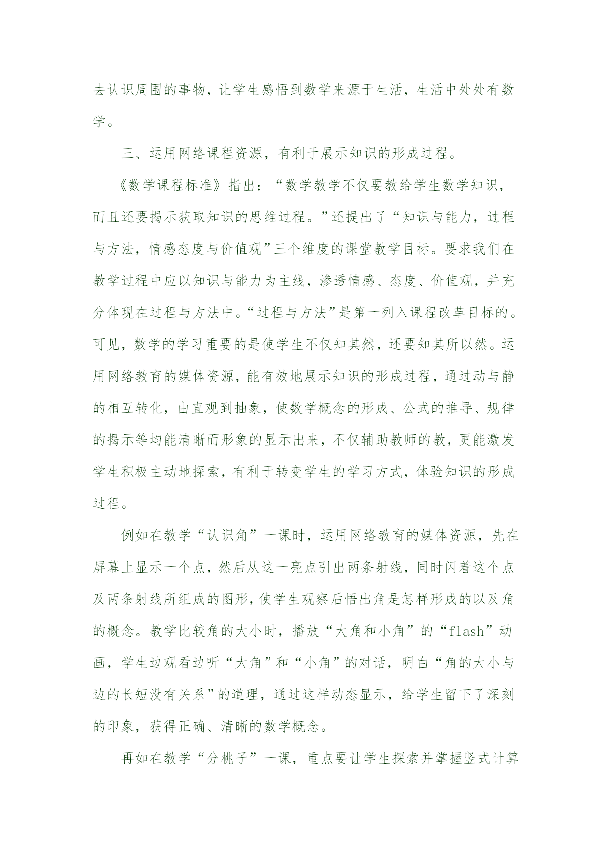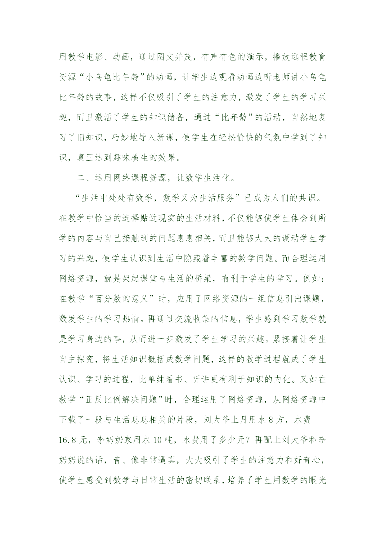 运用网络课程资源优化数学课堂教学 《数学课程标准》指出:数学课程资源是指依据数学课程标准所开发的各种教学材料以及数学课程可以利用的各种教学资源、工具和场所。对数学网络课程资源进行合理有效地利用是实施数学课程的重要组成部分。随着课改的进一步深入,许多教师已经意识到数学网络课程资源内容丰富,形式多样,具有很强的实用性和移植性,在小学数学教学中,有效地选择、加工、整合,创造性地应用网络课程资源,能激发学生的学习兴趣,让数学生活化,降低教学难度,开阔视野,转变教育教学此文转自斐斐课件园观念,改善学生的学习方式,提高课堂教学效率。如何在教育教学此文转自斐斐课件园中特别是在数学教学中运用课程资源,优化课堂教学,提高数学课堂教学效益呢?一、运用网络课程资源,激发学生的学习兴趣。心理学告诉我们:兴趣是最好的老师。当学生对某门学科产生兴趣之后,自然就学得好。数学课给学生的感觉总是枯糙无味的,而网络教育资源具有集信息于图、文、音、视、动、色为一体,综合表现力强的特性,以新颖性、趣味性、艺术性吸引学生的注意力和好奇心,调动学生的多种感官参与学习。通过多媒体的声音、图像画面,为学生创设有趣的学习情景,使课堂生动有情趣,在轻松愉快的气氛和美的感受中学习知识,大大调动了学生课堂学习的积极性和兴趣。可见,网络课程资源是激发学生学习兴趣的良师益友,是教师教学的好帮手。例如在教学“数的大小比较”这一课,引入新课时,教师适时运用教学电影、动画,通过图文并茂,有声有色的演示,播放远程教育资源“小乌龟比年龄”的动画,让学生边观看动画边听老师讲小乌龟比年龄的故事,这样不仅吸引了学生的注意力,激发了学生的学习兴趣,而且激活了学生的知识储备,通过“比年龄”的活动,自然地复习了旧知识,巧妙地导入新课,使学生在轻松愉快的气氛中学到了知识,真正达到趣味横生的效果。二、运用网络课程资源,让数学生活化。“生活中处处有数学,数学又为生活服务”已成为人们的共识。在教学中恰当的选择贴近现实的生活材料,不仅能够使学生体会到所学的内容与自己接触到的问题息息相关,而且能够大大的调动学生学习的兴趣,使学生认识到生活中隐藏着丰富的数学问题。而合理运用网络资源,就是架起课堂与生活的桥梁,有利于学生的学习。例如:在教学“百分数的意义”时,应用了网络资源的一组信息引出课题,激发学生的学习热情。再通过交流收集的信息,学生感到学习数学就是学习身边的事,从而进一步激发了学生学习的兴趣。紧接着让学生自主探究,将生活知识概括成数学问题,这样的教学过程就成了学生认识、学习的过程,比单纯看书、听讲更有利于知识的内化。又如在教学“正反比例解决问题”时,合理运用了网络资源,从网络资源中下载了一段与生活息息相关的片段,刘大爷上月用水8方,水费16.8元,李奶奶家用水10吨,水费用了多少元?再配上刘大爷和李奶奶说的话,音、像非常逼真,大大吸引了学生的注意力和好奇心,使学生感受到数学与日常生活的密切联系,培养了学生用数学的眼光去认识周围的事物,让学生感悟到数学来源于生活,生活中处处有数学。三、运用网络课程资源,有利于展示知识的形成过程。《数学课程标准》指出:“数学教学不仅要教给学生数学知识,而且还要揭示获取知识的思维过程。”还提出了“知识与能力,过程与方法,情感态度与价值观”三个维度的课堂教学目标。要求我们在教学过程中应以知识与能力为主线,渗透情感、态度、价值观,并充分体现在过程与方法中。“过程与方法”是第一列入课程改革目标的。可见,数学的学习重要的是使学生不仅知其然,还要知其所以然。运用网络教育的媒体资源,能有效地展示知识的形成过程,通过动与静的相互转化,由直观到抽象,使数学概念的形成、公式的推导、规律的揭示等均能清晰而形象的显示出来,不仅辅助教师的教,更能激发学生积极主动地探索,有利于转变学生的学习方式,体验知识的形成过程。例如在教学“认识角”一课时,运用网络教育的媒体资源,先在屏幕上显示一个点,然后从这一亮点引出两条射线,同时闪着这个点及两条射线所组成的图形,使学生观察后悟出角是怎样形成的以及角的概念。教学比较角的大小时,播放“大角和小角”的“flash”动画,学生边观看边听“大角”和“小角”的对话,明白“角的大小与边的长短没有关系”的道理,通过这样动态显示,给学生留下了深刻的印象,获得正确、清晰的数学概念。再如在教学“分桃子”一课,重点要让学生探索并掌握竖式计算两位数除以一位数(商是两位数)的方法。教学时,运用多媒体课件演示,把分桃子的过程与竖式计算的过程紧密结合起来,逐步演示,让学生体验计算过程,明白其算理。四、运用网络课程资源,降低教学难度。网络资源的普及使用,使教育技术进入了一个崭新的时代,它为数学教学提供了其它教学设施无法替代的服务,在改革数学教学的同时,也改变了我们教学意识和思想,它对深化课堂教学改革,提高教