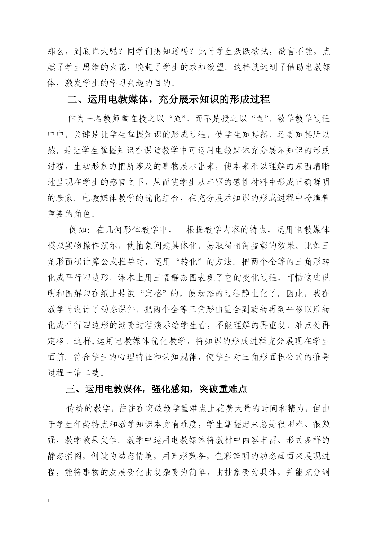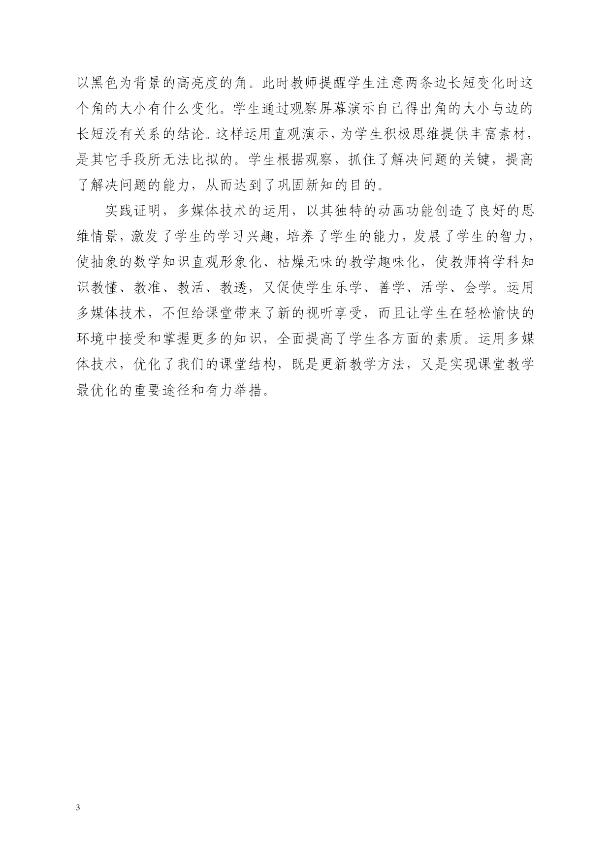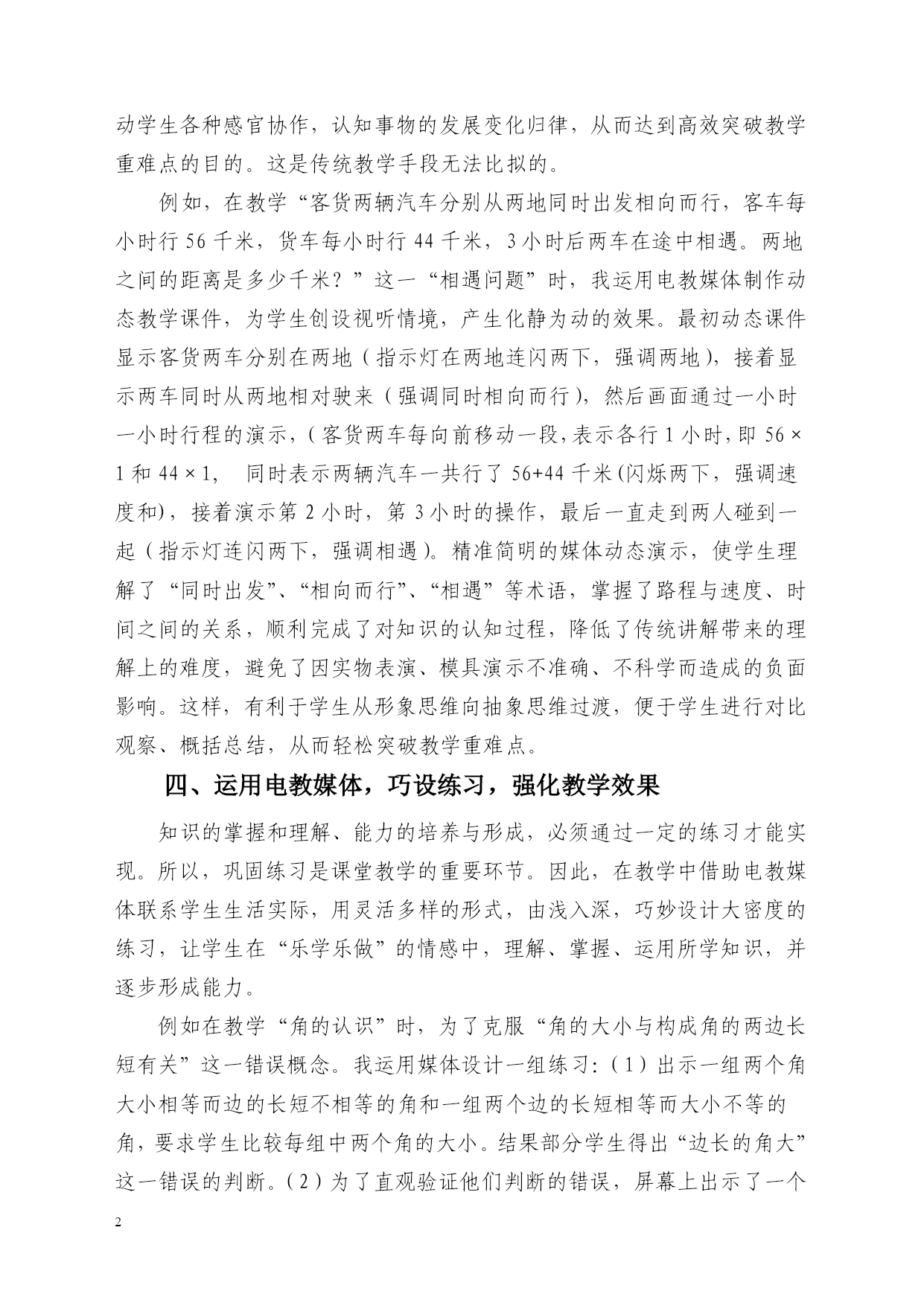 参评论文 运用多媒体技术实现课堂最优化 临湘市第一完全小学梅薇 当今时代是一个信息化的时代,由于计算机技术,特别是互联网技术的飞速发展,使人类无论在生产还是在生活方式上都发生了划时代的变化。随之出现的电化教育是一种运用现代技术手段的教学形式,它能凭其形、声、色具备的优势,向学生展现具体直观、声画并茂的视听材料,充分调动学生多种感觉器官参与学习,提高教学效率。数学是一门具有高度的抽象性和严密的逻辑性的学科,而电教媒体具有丰富的感受性和新颖性,是解剖抽象复杂性数学知识的有力手段。因此,合理运用电教媒体,能吸引学生的注意,启发学生一系列的思维活动参与,不但可以提高课堂教学效益,而且还有利于激发学生的学习兴趣,发展学生的观察力,有利于因材施教,还有利于大面积提高教学水平,从而促进素质教育。如何在课堂教学中合理运用电教媒体,优化数学课堂教学? 一、运用电教媒体,创设意境,以景激情 电教媒体聚“声、色、画、乐”于一体,色彩丰富的画面,生动可感的声音有利于创设特定的意境,激发学生学习兴趣。兴趣是最好的老师,当学生对所学内容产生兴趣时,教师也就掌握了教学的第一把钥匙。但兴趣并不是天生就固有的,而是通过外界事物的新颖性、独特性而引起的。所以,在学生即将学习新知识的时候,教师要根据教学内容,选择适当的电教手段,创设新奇的学习情境,充分调动学生的学习积极性,提高学生的学习兴趣。例如,教学“小数的性质”这一内容时,先播放一段录像,就是动物王国举行数学比赛的镜头,小猪、小猴,小猫都高高兴兴地去参加了,大象爷爷出了这样一道题:比较1.5、1.500……00(80个0)1.500……00(100个0)这三个数的大小,小猪认为第三个数最大,小猫认为第一个数最大,而小猴呢认为一样大……那么,到底谁大呢?同学们想知道吗?此时学生跃跃欲试,欲言不能,点燃了学生思维的火花,唤起了学生的求知欲望。这样就达到了借助电教媒体,激发学生的学习兴趣的目的。 二、运用电教媒体,充分展示知识的形成过程 作为一名教师重在授之以“渔”,而不是授之以“鱼”,数学教学过程中中,关键是让学生掌握知识的形成过程,使学生知其然,还要知其所以然。是让学生掌握知识在课堂教学中可运用电教媒体充分展示知识的形成过程,生动形象的把所涉及的事物展示出来,使本来难以理解的东西清晰地呈现在学生的感官之下,从而使学生从丰富的感性材料中形成正确鲜明的表象。电教媒体教学的优化组合,在充分展示知识的形成过程中扮演着重要的角色。 例如:在几何形体教学中,根据教学内容的特点,运用电教媒体模拟实物操作演示,使抽象问题具体化,易取得相得益彰的效果。比如三角形面积计算公式推导时,运用“转化”的方法。把两个全等的三角形转化成平行四边形,课本上用三幅静态图表现了它的变化过程,可惜这些说明和图解印在纸上是被“定格”的,使动态的过程静止化了。因此,我在教学时设计了动态课件,把两个全等三角形由重合到旋转再到平移以后转化成平行四边形的渐变过程演示给学生看,不能理解的再重复,难点处再定格。这样,运用电教媒体优化教学,将知识的形成过程充分展现在学生面前。符合学生的心理特征和认知规律,使学生对三角形面积公式的推导过程一清二楚。 三、运用电教媒体,强化感知,突破重难点 传统的教学,往往在突破教学重难点上花费大量的时间和精力,但由于学生年龄特点和教学知识本身有难度,学生掌握起来总是很困难、很勉强,教学效果欠佳。教学中运用电教媒体将教材中内容丰富、形式多样的静态插图,创设为动态情境,用声形兼备,色彩鲜明的动态画面来展现过程,能将事物的发展变化由复杂变为简单,由抽象变为具体,并能充分调动学生各种感官协作,认知事物的发展变化归律,从而达到高效突破教学重难点的目的。这是传统教学手段无法比拟的。 例如,在教学“客货两辆汽车分别从两地同时出发相向而行,客车每小时行56千米,货车每小时行44千米,3小时后两车在途中相遇。两地之间的距离是多少千米?”这一“相遇问题”时,我运用电教媒体制作动态教学课件,为学生创设视听情境,产生化静为动的效果。最初动态课件显示客货两车分别在两地(指示灯在两地连闪两下,强调两地),接着显示两车同时从两地相对驶来(强调同时相向而行),然后画面通过一小时一小时行程的演示,(客货两车每向前移动一段,表示各行1小时,即56×1和44×1,同时表示两辆汽车一共行了56+44千米(闪烁两下,强调速度和),接着演示第2小时,第3小时的操作,最后一直走到两人碰到一起(指示灯连闪两下,强调相遇)。精准简明的媒体动态演示,使学生理解了“同时出发”、“相向而行”、“相遇”等术语,掌握了路程与速度、时间之间的关系,顺利完成了对知识的认知过程,降低了传统讲解带来的理解上的难度,避免了因实物表演、模具演示不准确、不科学而造成的负面影响。这样,有利于学生