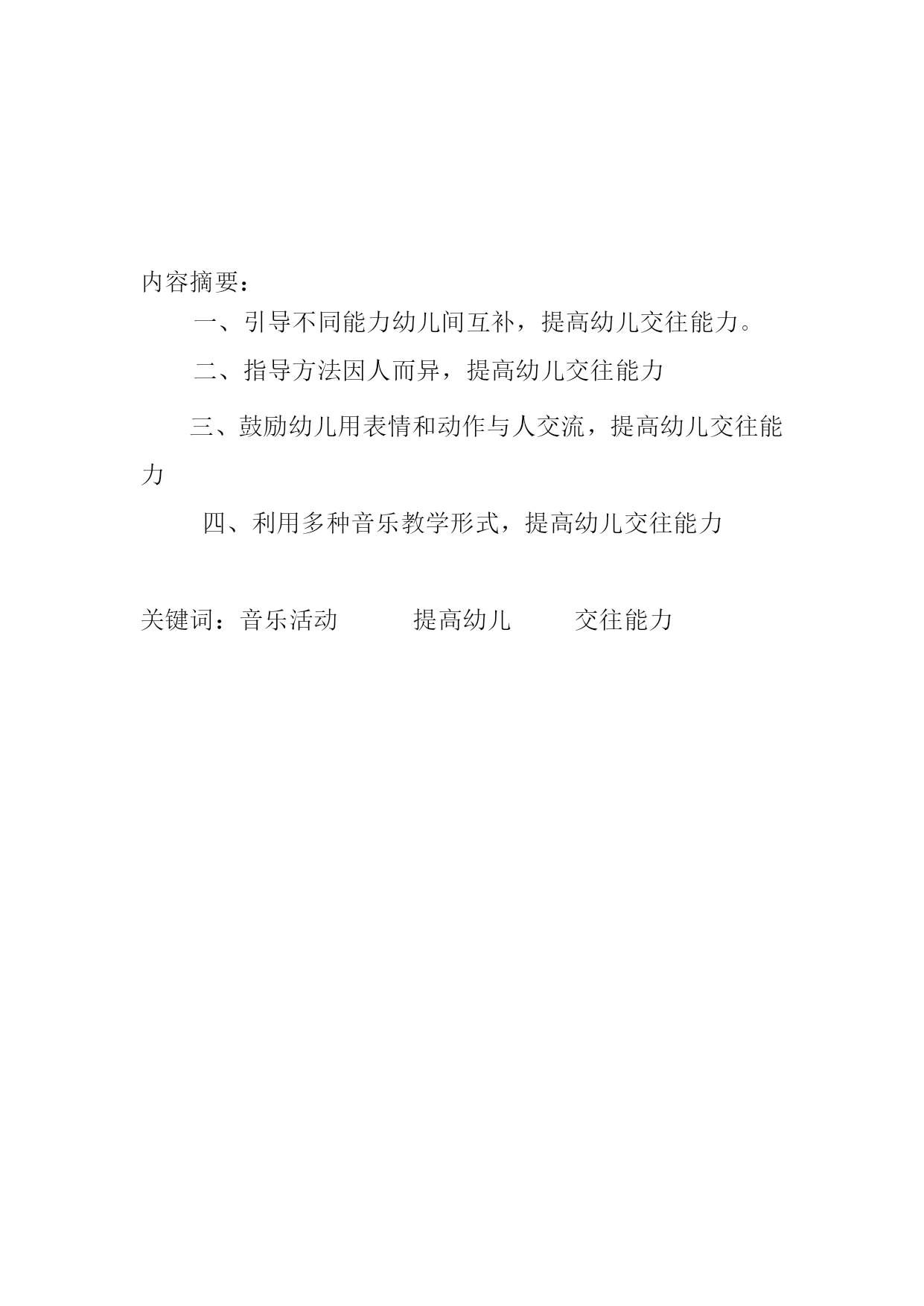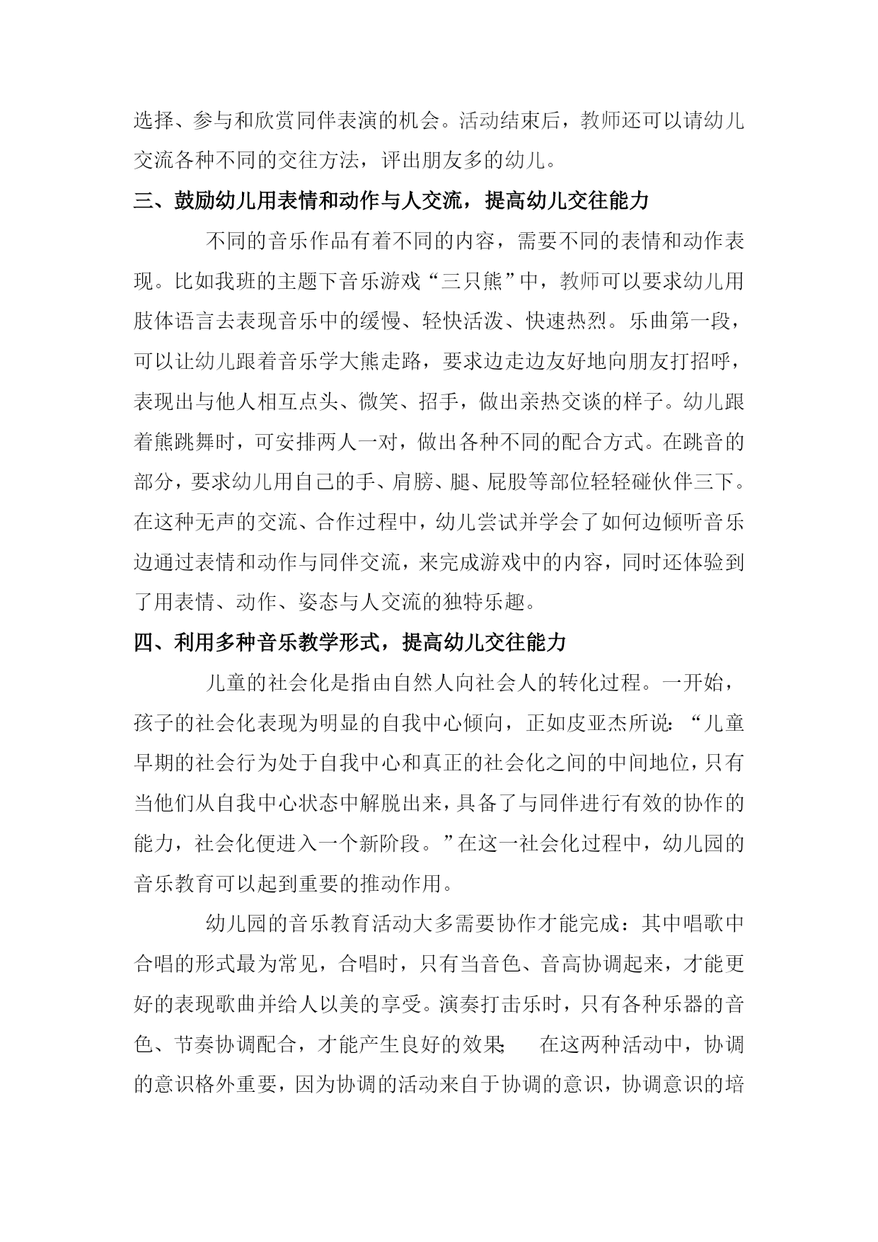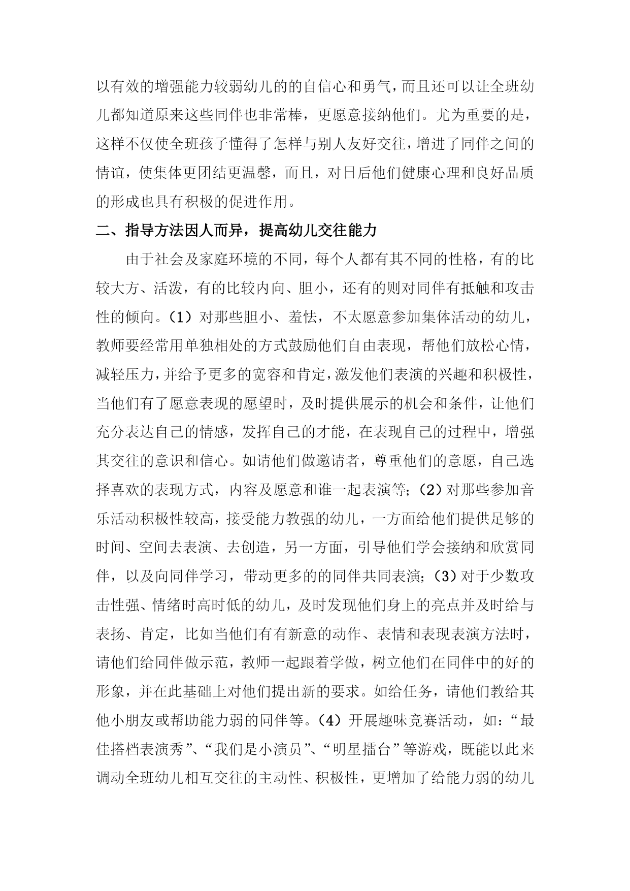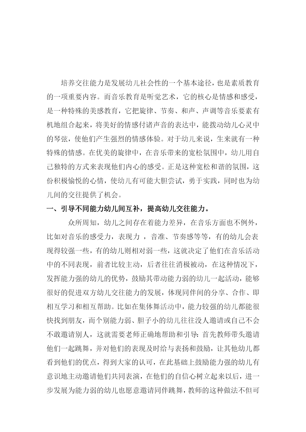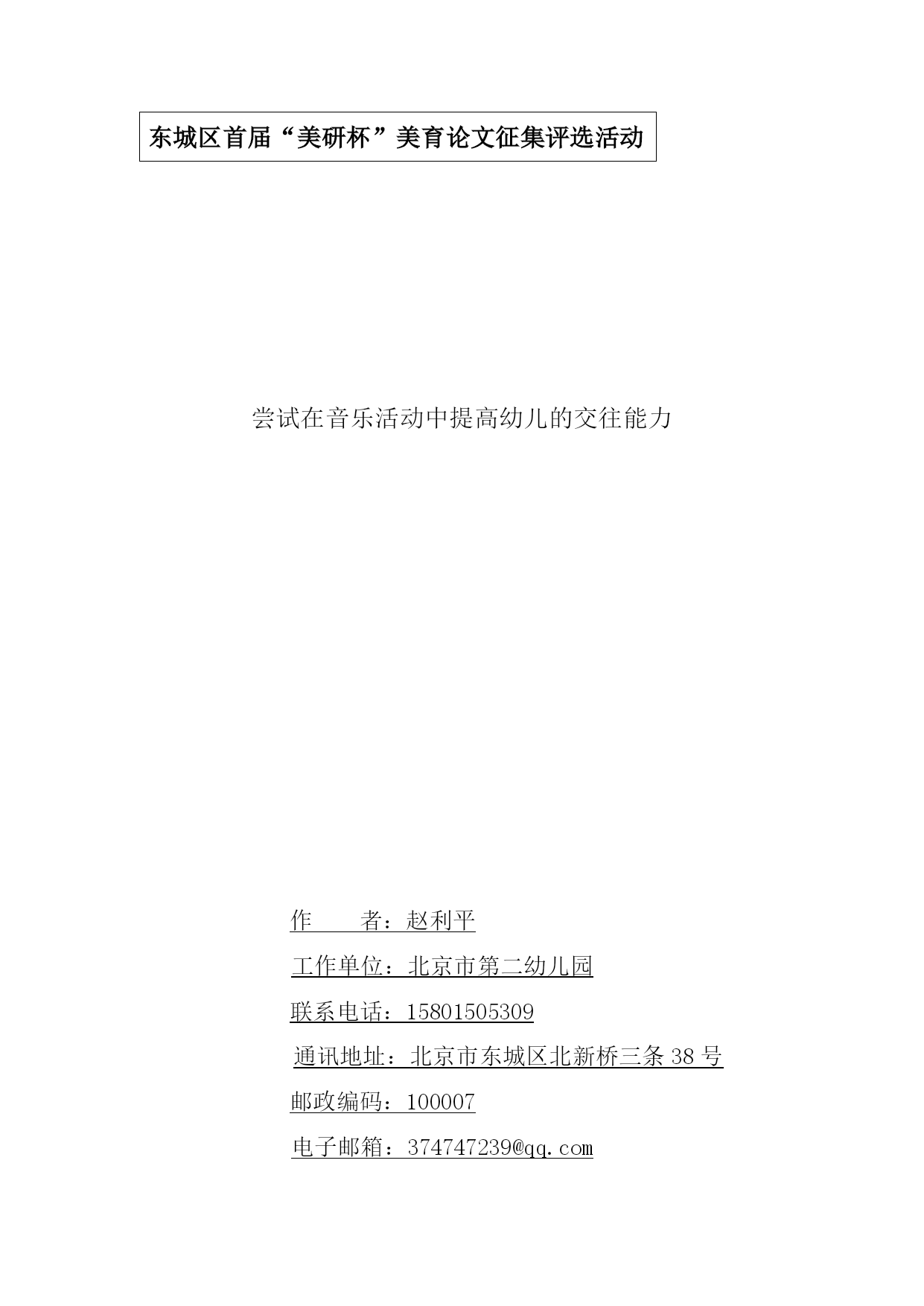 东城区首届“美研杯”美育论文征集评选活动 尝试在音乐活动中提高幼儿的交往能力 作者:赵利平 工作单位:北京市第二幼儿园 联系电话:15801505309 通讯地址:北京市东城区北新桥三条38号 邮政编码:100007 电子邮箱:374747239@qq.com 内容摘要: 一、引导不同能力幼儿间互补,提高幼儿交往能力。二、指导方法因人而异,提高幼儿交往能力 三、鼓励幼儿用表情和动作与人交流,提高幼儿交往能力四、利用多种音乐教学形式,提高幼儿交往能力关键词:音乐活动提高幼儿交往能力 培养交往能力是发展HYPERLINK"http://moonedu.com"幼儿社会性的一个基本途径,也是素质教育的一项重要内容。而音乐教育是听觉艺术,它的核心是情感和感受,是一种特殊的美感教育,它把旋律、节奏、和声、声调等音乐要素有机地组合起来,将美好的情感付诸声音的表达中,能拨动幼儿心灵中的琴弦,使他们产生强烈的情感体验。对于HYPERLINK"http://moonedu.com"幼儿来说,生来就有一种特殊的情感。在优美的旋律中,在音乐带来的宽松氛围中,HYPERLINK"http://moonedu.com"幼儿用自己独特的方式来表现他们内心的感受。正是这种宽松和谐的氛围,这份积极愉悦的心情,使HYPERLINK"http://moonedu.com"幼儿有可能大胆尝试,勇于实践,同时也为HYPERLINK"http://moonedu.com"幼儿间的交往提供了机会。一、引导不同能力幼儿间互补,提高幼儿交往能力。众所周知,幼儿之间存在着能力差异,在音乐方面也不例外,比如对音乐的感受力,表现力,音准、节奏感等等,有的幼儿会表现得较强一些,有的幼儿则相对弱一些,这就决定了他们在音乐活动中的不同表现,前者比较主动,后者往往消极被动,在这种情况下,发挥能力强的幼儿的优势,鼓励其带动能力弱的HYPERLINK"http://moonedu.com"幼儿一起活动,能够很好的促进双方幼儿交往能力的发展,体现同伴间的分享、合作、即相互学习和相互帮助。比如在集体舞HYPERLINK"http://www.moonedu.com/"活动中,能力较强的HYPERLINK"http://moonedu.com"幼儿都能很快找到朋友,而个别能力弱、胆子小的HYPERLINK"http://moonedu.com"幼儿往往没人邀请或自己不会不敢邀请别人,这就需要老师正确地帮助和引导:首先教师带头邀请他们一起跳舞,并对他们的表现及时给与表扬和鼓励,让其他幼儿都看到他们的优点,得到大家的认可,在此基础上鼓励能力强的幼儿有意识地主动邀请他们共同表演,在他们的自信心树立起来以后,进一步发展为能力弱的幼儿也愿意邀请同伴跳舞,教师的这种做法不但可以有效的增强能力较弱幼儿的的自信心和勇气,而且还可以让全班HYPERLINK"http://moonedu.com"幼儿都知道原来这些同伴也非常棒,更愿意接纳他们。尤为重要的是,这样不仅使全班孩子懂得了怎样与别人友好交往,增进了同伴之间的情谊,使集体更团结更温馨,而且,对日后他们健康心理和良好品质的形成也具有积极的促进作用。 二、指导方法因人而异,提高幼儿交往能力 由于社会及家庭环境的不同,每个人都有其不同的性格,有的比较大方、活泼,有的比较内向、胆小,还有的则对同伴有抵触和攻击性的倾向。(1)对那些胆小、羞怯,不太愿意参加集体HYPERLINK"http://www.moonedu.com/"活动的HYPERLINK"http://moonedu.com"幼儿,教师要经常用单独相处的方式鼓励他们自由表现,帮他们放松心情,减轻压力,并给予更多的宽容和肯定,激发他们表演的兴趣和积极性,当他们有了愿意表现的愿望时,及时提供展示的机会和条件,让他们充分表达自己的情感,发挥自己的才能,在表现自己的过程中,增强其交往的意识和信心。如请他们做邀请者,尊重他们的意愿,自己选择喜欢的表现方式,内容及愿意和谁一起表演等;(2)对那些参加音乐HYPERLINK"http://www.moonedu.com/"活动积极性较高,接受能力教强的HYPERLINK"http://moonedu.com"幼儿,一方面给他们提供足够的时间、空间去表演、去创造,另一方面,引导他们学会接纳和欣赏同伴,以及向同伴学习,带动更多的的同伴共同表演;(3)对于少数攻击性强、情绪时高时低的HYPERLINK"http://moonedu.com"幼儿,及时发现他们身上的亮点并及时给与表扬、肯定,比如当他们有有新意的动作、表情和表现表演方法时,请他们给同