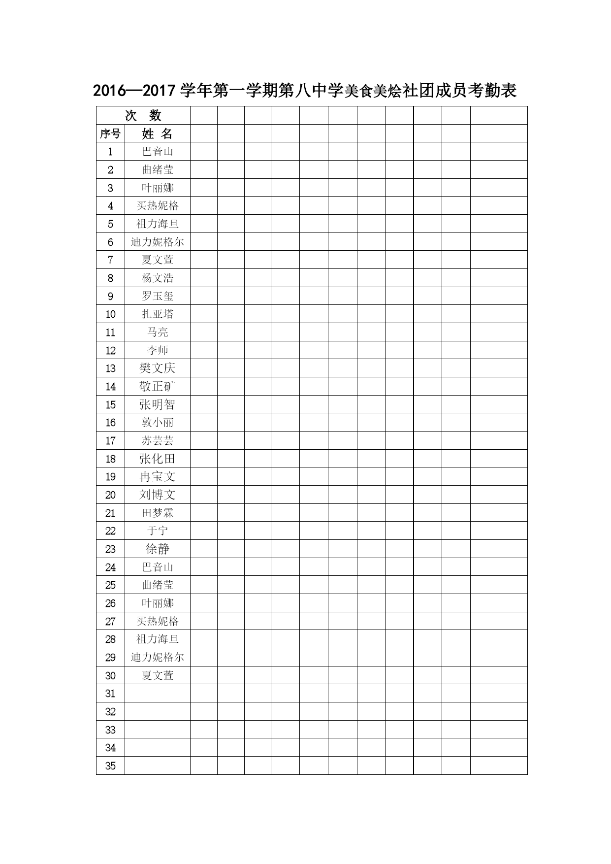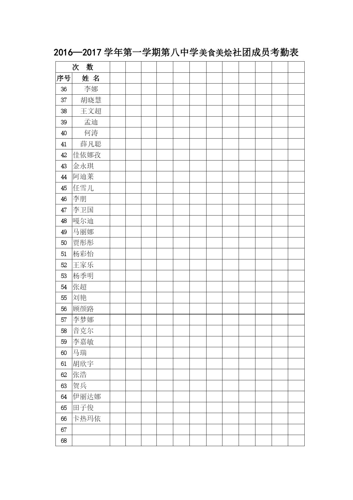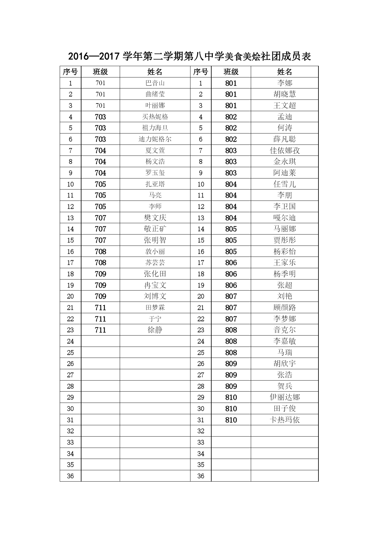 2016—2017学年第二学期第八中学美食美烩社团成员表 序号班级姓名序号班级姓名1701巴音山1801李娜2701曲绪莹2801胡晓慧3701叶丽娜3801王文超4703买热妮格4802孟迪5703祖力海旦5802何涛6703迪力妮格尔6802薛凡聪7704夏文萱7803佳依娜孜8704杨文浩8803金永琪9704罗玉玺9803阿迪莱10705扎亚塔10804任雪儿11705马亮11804李朋12705李师12804李卫国13707樊文庆13804嘠尔迪14707敬正矿14805马丽娜15707张明智15805贾彤彤16708敦小丽16805杨彩怡17708苏芸芸17806王家乐18709张化田18806杨季明19709冉宝文19806张超20709刘博文20807刘艳21711田梦霖21807顾颜路22711于宁22807李梦娜23711徐静23808音克尔2424808李嘉敏2525808马瑞2626809胡欣宇2727809张浩2828809贺兵2929810伊丽达娜3030810田子俊3131810卡热玛依32323333343435353636 2016—2017学年第一学期第八中学美食美烩社团成员考勤表 次数序号姓名1巴音山2曲绪莹3叶丽娜4买热妮格5祖力海旦6迪力妮格尔7夏文萱8杨文浩9罗玉玺10扎亚塔11马亮12李师13樊文庆14敬正矿15张明智16敦小丽17苏芸芸18张化田19冉宝文20刘博文21田梦霖22于宁23徐静24巴音山25曲绪莹26叶丽娜27买热妮格28祖力海旦29迪力妮格尔30夏文萱31323334352016—2017学年第一学期第八中学美食美烩社团成员考勤表 次数序号姓名36李娜37胡晓慧38王文超39孟迪40何涛41薛凡聪42佳依娜孜43金永琪44阿迪莱45任雪儿46李朋47李卫国48嘠尔迪49马丽娜50贾彤彤51杨彩怡52王家乐53杨季明54张超55刘艳56顾颜路57李梦娜58音克尔59李嘉敏60马瑞61胡欣宇62张浩63贺兵64伊丽达娜65田子俊66卡热玛依6768
