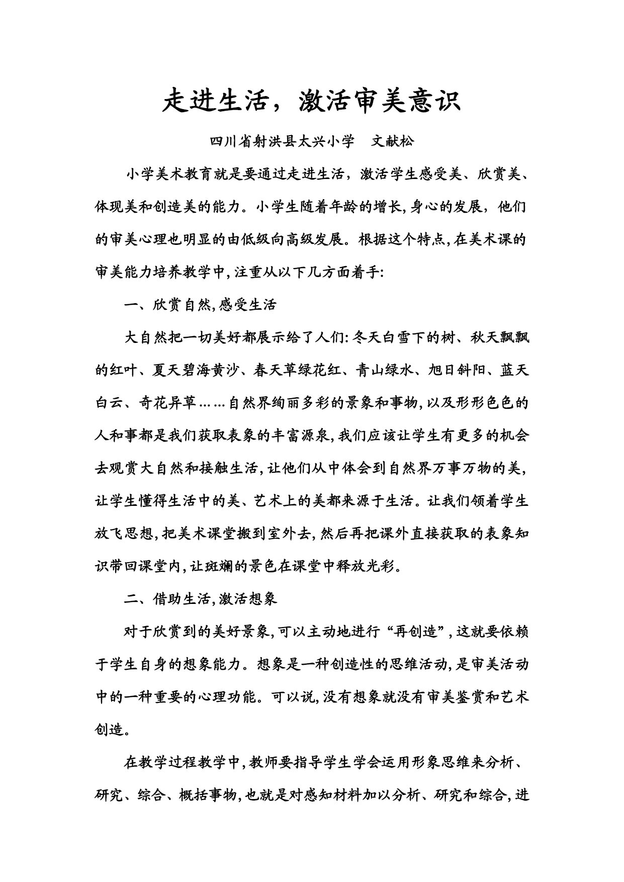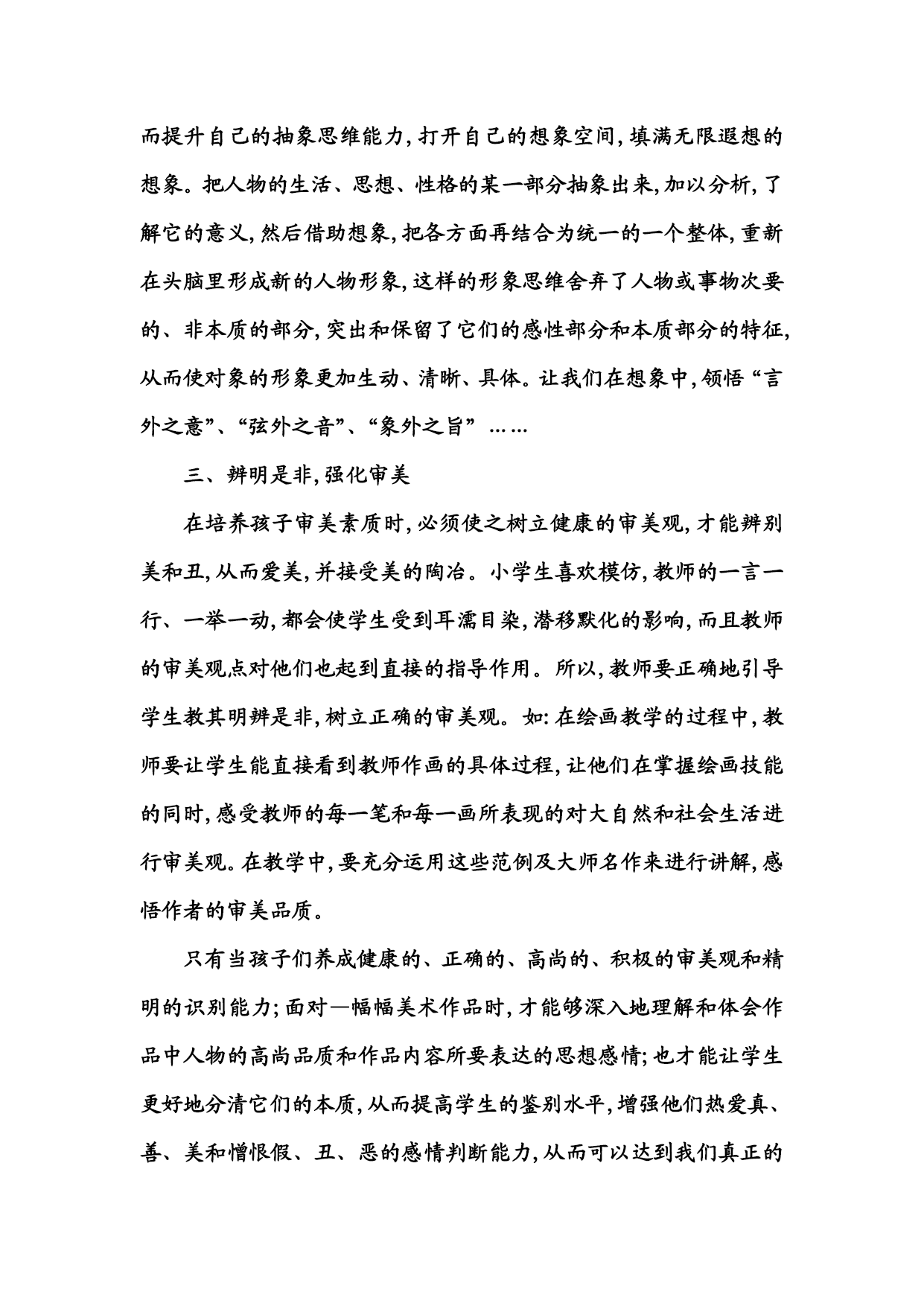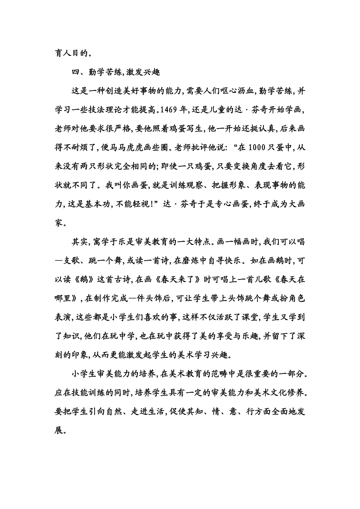 走进生活,激活审美意识 四川省射洪县太兴小学文献松 小学美术教育就是要通过走进生活,激活学生感受美、欣赏美、体现美和创造美的能力。小学生随着年龄的增长,身心的发展,他们的审美心理也明显的由低级向高级发展。根据这个特点,在美术课的审美能力培养教学中,注重从以下几方面着手: 欣赏自然,感受生活 大自然把一切美好都展示给了人们:冬天白雪下的树、秋天飘飘的红叶、夏天碧海黄沙、春天草绿花红、青山绿水、旭日斜阳、蓝天白云、奇花异草……自然界绚丽多彩的景象和事物,以及形形色色的人和事都是我们获取表象的丰富源泉,我们应该让学生有更多的机会去观赏大自然和接触生活,让他们从中体会到自然界万事万物的美,让学生懂得生活中的美、艺术上的美都来源于生活。让我们领着学生放飞思想,把美术课堂搬到室外去,然后再把课外直接获取的表象知识带回课堂内,让斑斓的景色在课堂中释放光彩。 借助生活,激活想象 对于欣赏到的美好景象,可以主动地进行“再创造”,这就要依赖于学生自身的想象能力。想象是一种创造性的思维活动,是审美活动中的一种重要的心理功能。可以说,没有想象就没有审美鉴赏和艺术创造。 在教学过程教学中,教师要指导学生学会运用形象思维来分析、研究、综合、概括事物,也就是对感知材料加以分析、研究和综合,进而提升自己的抽象思维能力,打开自己的想象空间,填满无限遐想的想象。把人物的生活、思想、性格的某一部分抽象出来,加以分析,了解它的意义,然后借助想象,把各方面再结合为统一的一个整体,重新在头脑里形成新的人物形象,这样的形象思维舍弃了人物或事物次要的、非本质的部分,突出和保留了它们的感性部分和本质部分的特征,从而使对象的形象更加生动、清晰、具体。让我们在想象中,领悟“言外之意”、“弦外之音”、“象外之旨”…… 辨明是非,强化审美 在培养孩子审美素质时,必须使之树立健康的审美观,才能辨别美和丑,从而爱美,并接受美的陶冶。小学生喜欢模仿,教师的一言一行、一举一动,都会使学生受到耳濡目染,潜移默化的影响,而且教师的审美观点对他们也起到直接的指导作用。所以,教师要正确地引导学生教其明辨是非,树立正确的审美观。如:在绘画教学的过程中,教师要让学生能直接看到教师作画的具体过程,让他们在掌握绘画技能的同时,感受教师的每一笔和每一画所表现的对大自然和社会生活进行审美观。在教学中,要充分运用这些范例及大师名作来进行讲解,感悟作者的审美品质。 只有当孩子们养成健康的、正确的、高尚的、积极的审美观和精明的识别能力;面对—幅幅美术作品时,才能够深入地理解和体会作品中人物的高尚品质和作品内容所要表达的思想感情;也才能让学生更好地分清它们的本质,从而提高学生的鉴别水平,增强他们热爱真、善、美和憎恨假、丑、恶的感情判断能力,从而可以达到我们真正的育人目的。 勤学苦练,激发兴趣 这是一种创造美好事物的能力,需要人们呕心沥血,勤学苦练,并学习一些技法理论才能提高。1469年,还是儿童的达·芬奇开始学画,老师对他要求很严格,要他照着鸡蛋写生,他一开始还挺认真,后来画得不耐烦了,便马马虎虎画些圈。老师批评他说:“在1000只蛋中,从来没有两只形状完全相同的;即使一只鸡蛋,只要变换角度去看它,形状就不同了。我叫你画蛋,就是训练观察、把握形象、表现事物的能力,这是基本功,不能轻视!”达·芬奇于是专心画蛋,终于成为大画家。 其实,寓学于乐是审美教育的一大特点。画一幅画时,我们可以唱—支歌、跳一个舞,或读一首诗,在磨炼中自寻快乐。如在画鹅时,可以读《鹅》这首古诗,在画《春天来了》时可唱上一首儿歌《春天在哪里》,在制作完成—件头饰后,可让学生带上头饰跳个舞或扮角色表演,这些都是小学生们喜欢的事,这样不仅活跃了课堂,学生又学到了知识,他们在玩中学,也在玩中获得了美的享受与乐趣,并留下了深刻的印象,从而更能激发起学生的美术学习兴趣。 小学生审美能力的培养,在美术教育的范畴中是很重要的一部分。应在技能训练的同时,培养学生具有一定的审美能力和美术文化修养。要把学生引向自然、走进生活,促使其知、情、意、行方面全面地发展。