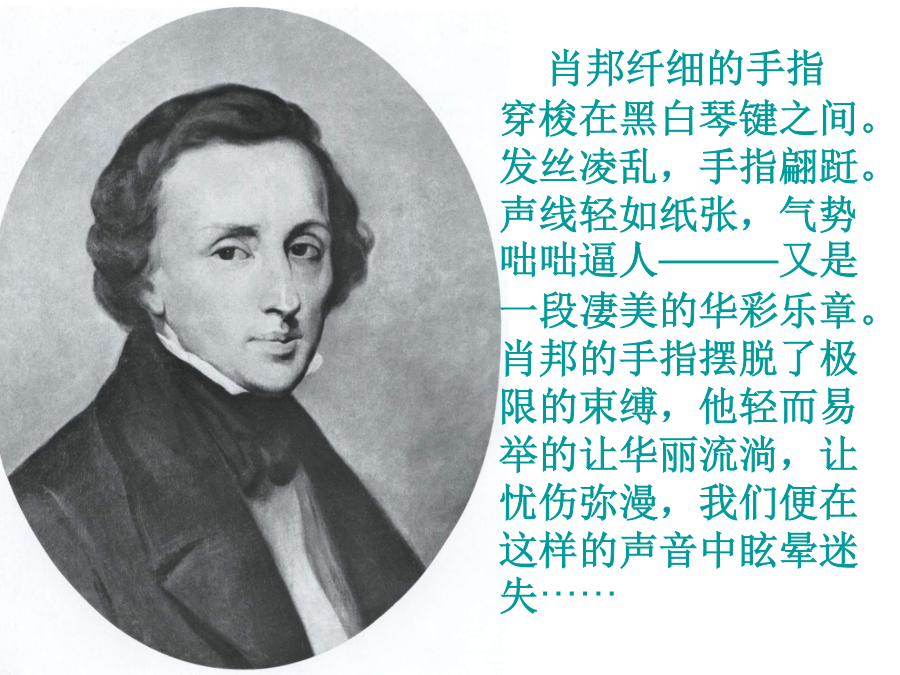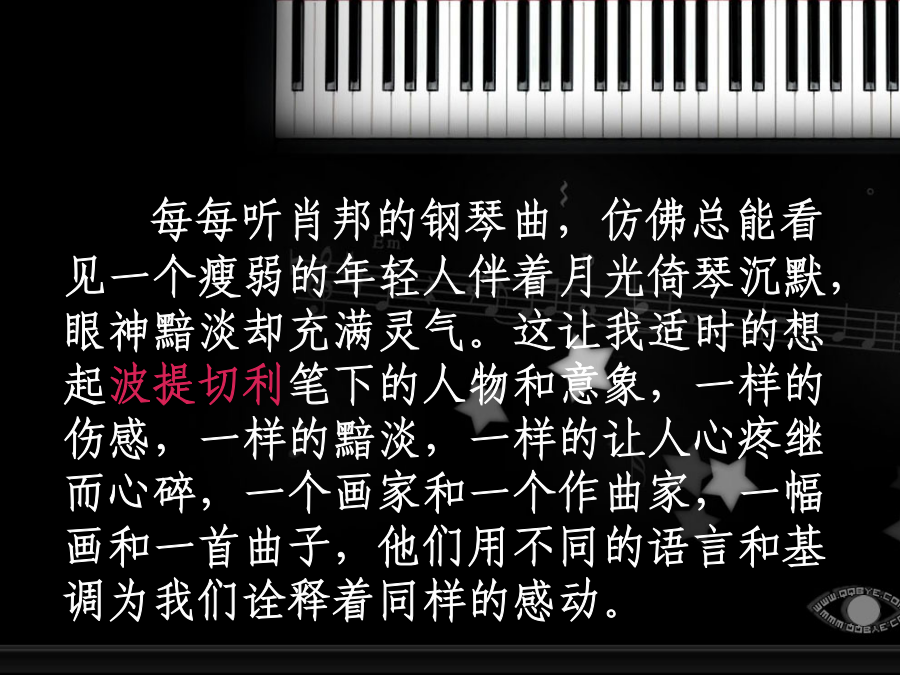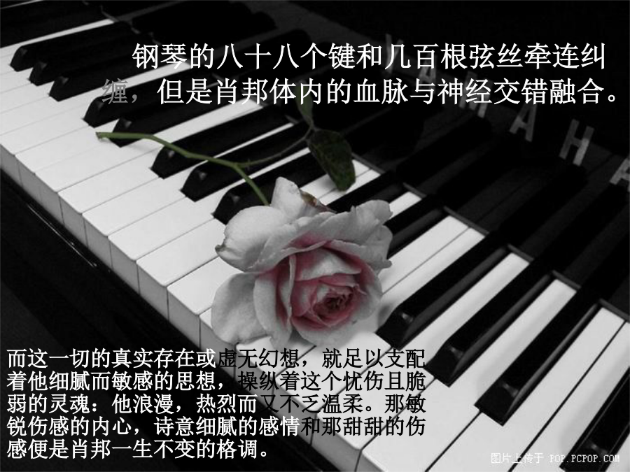 流淌在琴键上的华丽与忧伤肖邦纤细的手指穿梭在黑白琴键之间。发丝凌乱,手指翩跹。声线轻如纸张,气势咄咄逼人———又是一段凄美的华彩乐章。肖邦的手指摆脱了极限的束缚,他轻而易举的让华丽流淌,让忧伤弥漫,我们便在这样的声音中眩晕迷失······钢琴的八十八个键和几百根弦丝牵连纠缠,但是肖邦体内的血脉与神经交错融合。每每听肖邦的钢琴曲,仿佛总能看见一个瘦弱的年轻人伴着月光倚琴沉默,眼神黯淡却充满灵气。这让我适时的想起波提切利笔下的人物和意象,一样的伤感,一样的黯淡,一样的让人心疼继而心碎,一个画家和一个作曲家,一幅画和一首曲子,他们用不同的语言和基调为我们诠释着同样的感动。《革命练习曲》后,我感到肖邦对祖国的热爱已融入了血液和呼吸。即使不知他身逢乱世,也能听得出那种不带病容的幽微之情一定牵连着某种大的东西;知道他二十载的异乡生活,就更能悟出其中有理想中的故土和那永不消失的绵绵遗恨。国土,故乡,母亲,始终是这个男人心中难以言表的伤痛。匆匆逝去的岁月你是我一生珍藏的钢琴曲,密码就是我们的心灵的默契,相逢恨晚是一种遗憾就象我晚恋的钢琴曲一样,同样会以一种激情在诠释着浑厚与柔和,每一次听着钢琴曲的时候都能从跳动的线谱上听出伤感,来去的洒脱之中在心灵上种下了一种无从消磨的种子,读懂了那双眼睛就象听懂了钢琴曲的离愁别绪一样在平和与激昂中感受着生命来去的潇洒。在落寞的枫叶林的背后会是一段永恒的故事和一段完美的结局,尽管曾经沧海桑田,我想风带走了晨埃,留下的只是被风吹过的沧桑,午夜的钢琴曲永远都带给别人一种理解不了的情调也会因此为我的生活添加一种调试不出的色调,总会有一天会有属于我们的曲调.