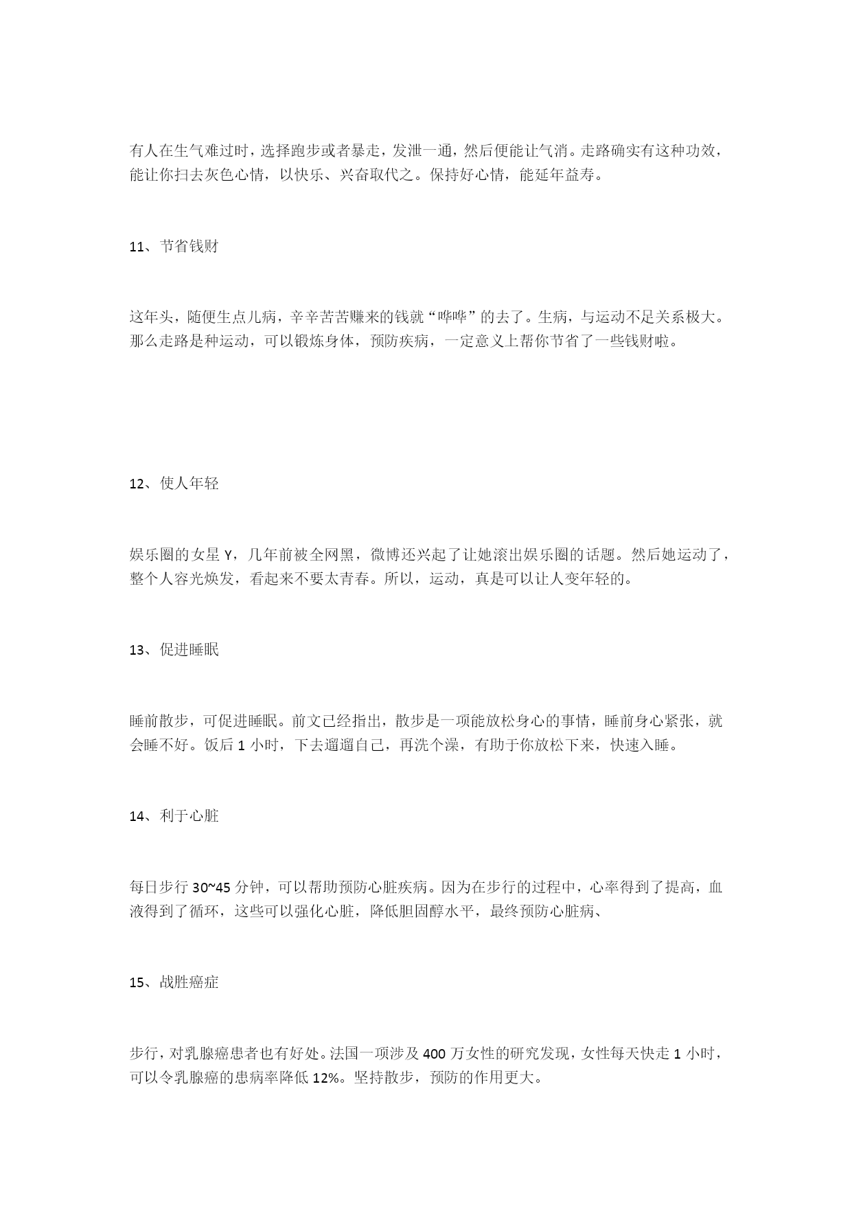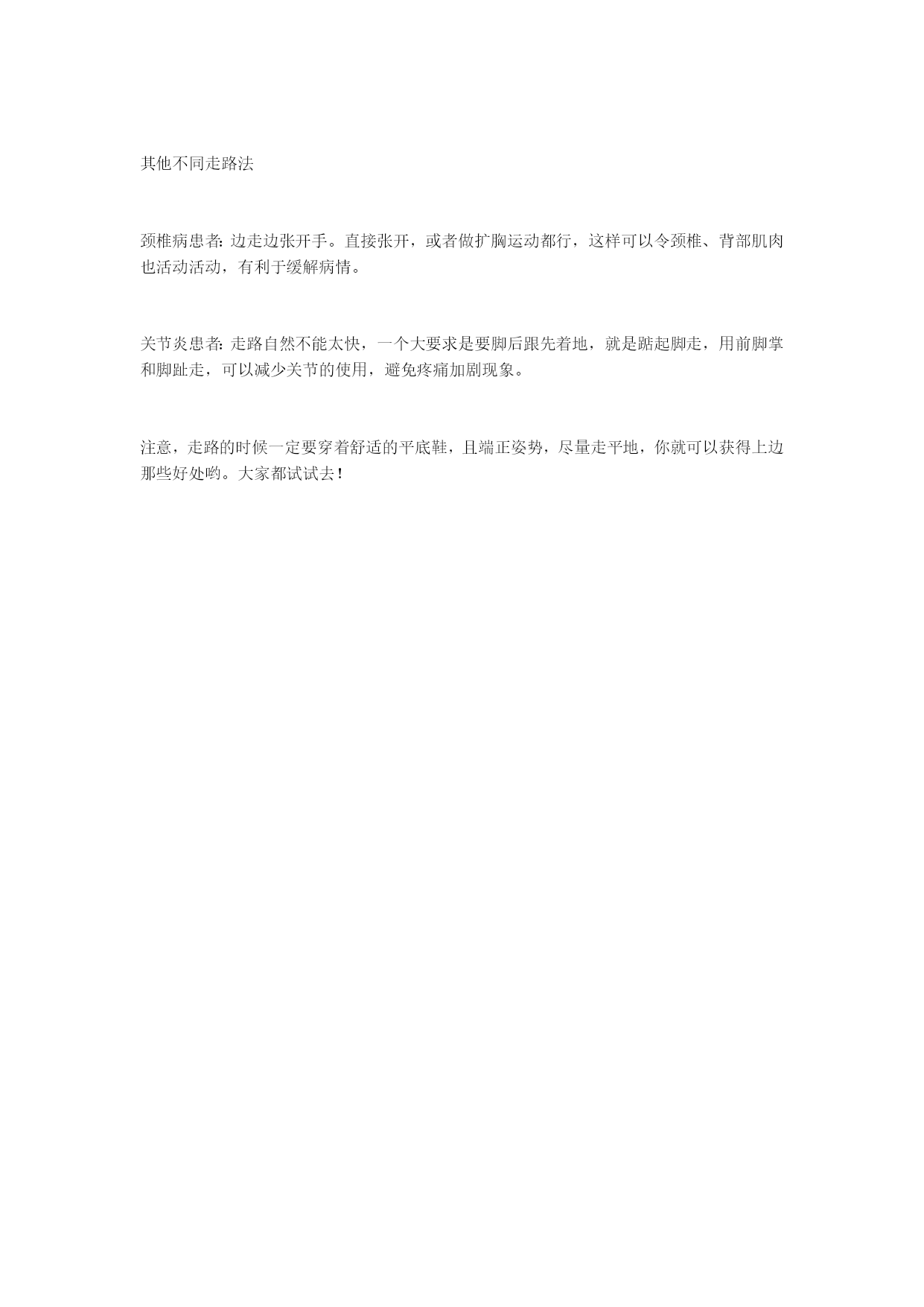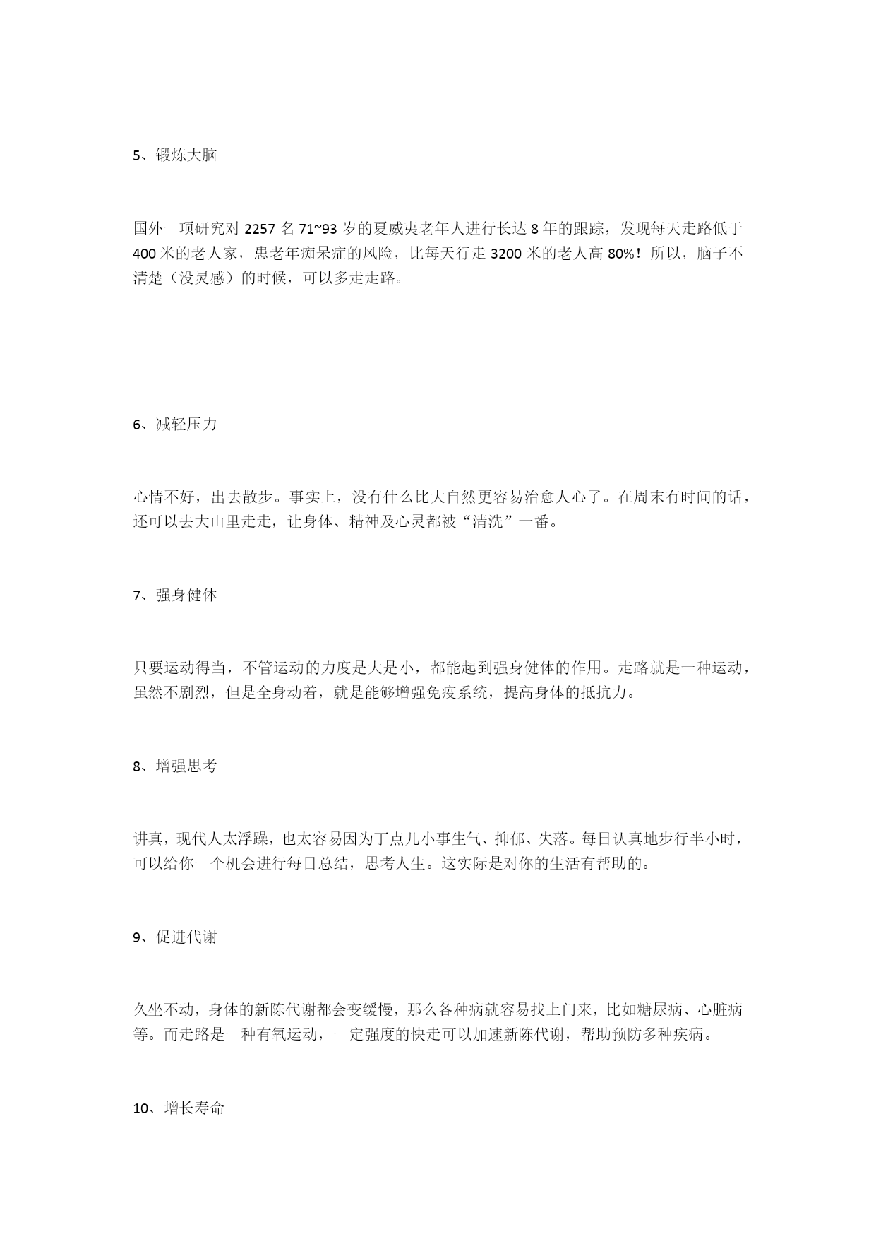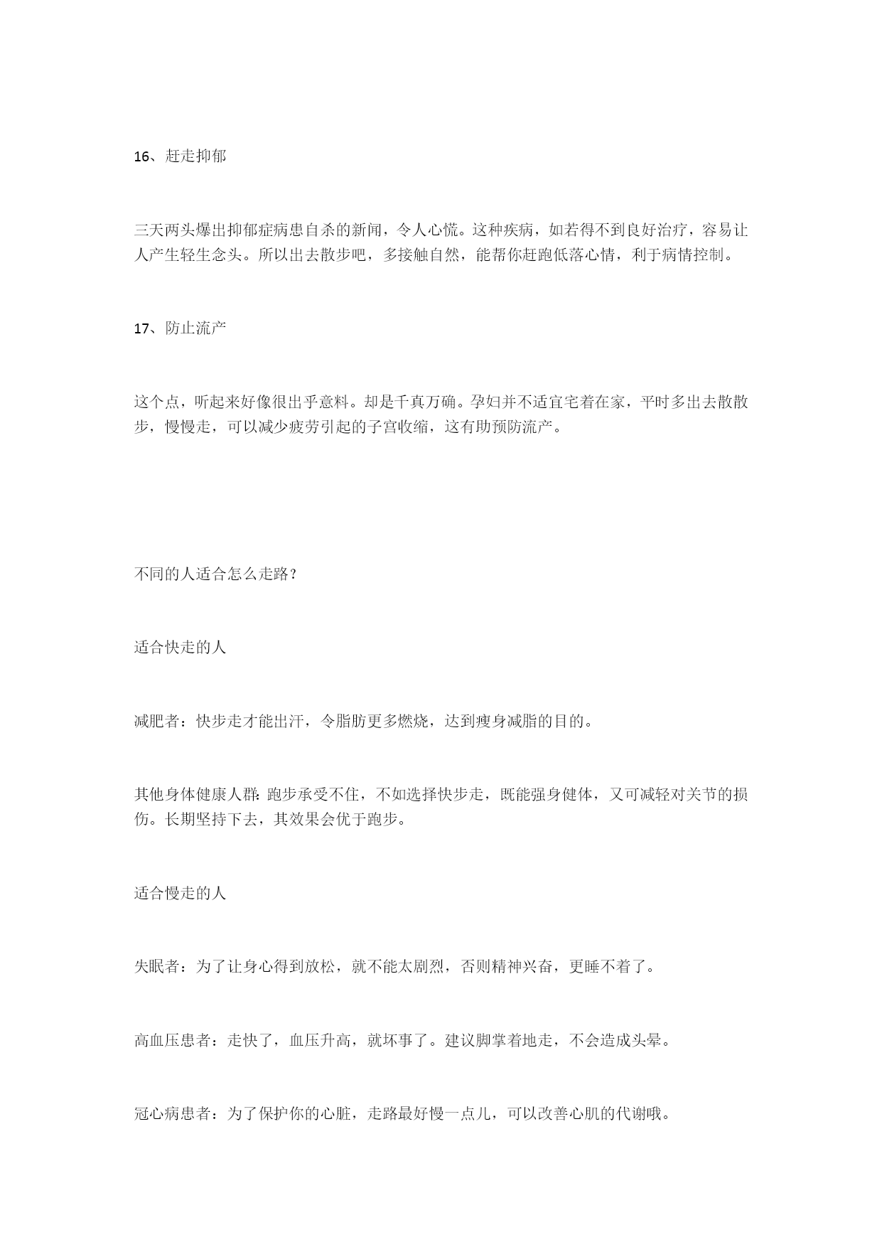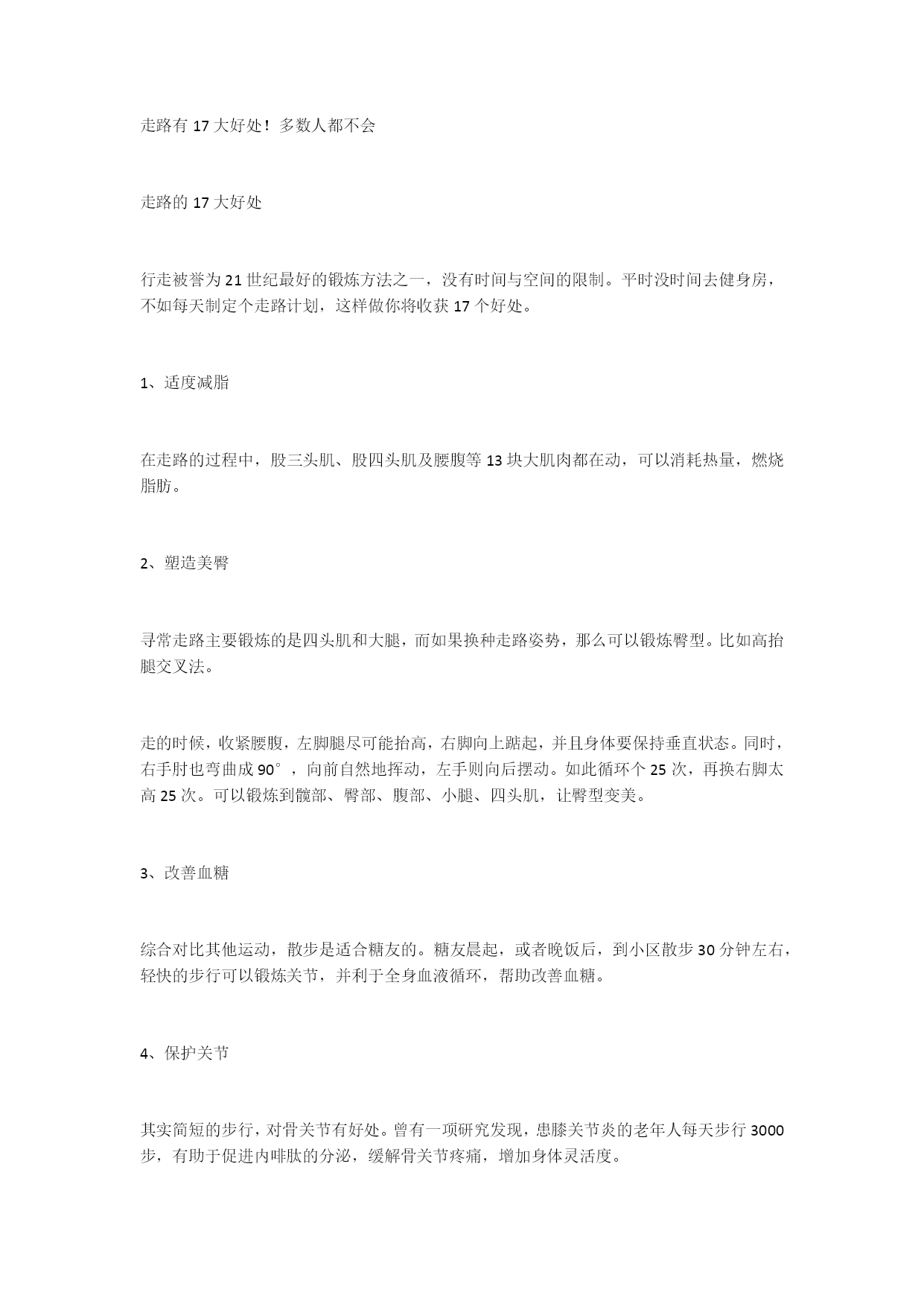 走路有17大好处!多数人都不会 走路的17大好处 行走被誉为21世纪最好的锻炼方法之一,没有时间与空间的限制。平时没时间去健身房,不如每天制定个走路计划,这样做你将收获17个好处。 1、适度减脂 在走路的过程中,股三头肌、股四头肌及腰腹等13块大肌肉都在动,可以消耗热量,燃烧脂肪。 2、塑造美臀 寻常走路主要锻炼的是四头肌和大腿,而如果换种走路姿势,那么可以锻炼臀型。比如高抬腿交叉法。 走的时候,收紧腰腹,左脚腿尽可能抬高,右脚向上踮起,并且身体要保持垂直状态。同时,右手肘也弯曲成90°,向前自然地挥动,左手则向后摆动。如此循环个25次,再换右脚太高25次。可以锻炼到髋部、臀部、腹部、小腿、四头肌,让臀型变美。 3、改善血糖 综合对比其他运动,散步是适合糖友的。糖友晨起,或者晚饭后,到小区散步30分钟左右,轻快的步行可以锻炼关节,并利于全身血液循环,帮助改善血糖。 4、保护关节 其实简短的步行,对骨关节有好处。曾有一项研究发现,患膝关节炎的老年人每天步行3000步,有助于促进内啡肽的分泌,缓解骨关节疼痛,增加身体灵活度。 5、锻炼大脑 国外一项研究对2257名71~93岁的夏威夷老年人进行长达8年的跟踪,发现每天走路低于400米的老人家,患老年痴呆症的风险,比每天行走3200米的老人高80%!所以,脑子不清楚(没灵感)的时候,可以多走走路。 6、减轻压力 心情不好,出去散步。事实上,没有什么比大自然更容易治愈人心了。在周末有时间的话,还可以去大山里走走,让身体、精神及心灵都被“清洗”一番。 7、强身健体 只要运动得当,不管运动的力度是大是小,都能起到强身健体的作用。走路就是一种运动,虽然不剧烈,但是全身动着,就是能够增强免疫系统,提高身体的抵抗力。 8、增强思考 讲真,现代人太浮躁,也太容易因为丁点儿小事生气、抑郁、失落。每日认真地步行半小时,可以给你一个机会进行每日总结,思考人生。这实际是对你的生活有帮助的。 9、促进代谢 久坐不动,身体的新陈代谢都会变缓慢,那么各种病就容易找上门来,比如糖尿病、心脏病等。而走路是一种有氧运动,一定强度的快走可以加速新陈代谢,帮助预防多种疾病。 10、增长寿命 有人在生气难过时,选择跑步或者暴走,发泄一通,然后便能让气消。走路确实有这种功效,能让你扫去灰色心情,以快乐、兴奋取代之。保持好心情,能延年益寿。 11、节省钱财 这年头,随便生点儿病,辛辛苦苦赚来的钱就“哗哗”的去了。生病,与运动不足关系极大。那么走路是种运动,可以锻炼身体,预防疾病,一定意义上帮你节省了一些钱财啦。 12、使人年轻 娱乐圈的女星Y,几年前被全网黑,微博还兴起了让她滚出娱乐圈的话题。然后她运动了,整个人容光焕发,看起来不要太青春。所以,运动,真是可以让人变年轻的。 13、促进睡眠 睡前散步,可促进睡眠。前文已经指出,散步是一项能放松身心的事情,睡前身心紧张,就会睡不好。饭后1小时,下去遛遛自己,再洗个澡,有助于你放松下来,快速入睡。 14、利于心脏 每日步行30~45分钟,可以帮助预防心脏疾病。因为在步行的过程中,心率得到了提高,血液得到了循环,这些可以强化心脏,降低胆固醇水平,最终预防心脏病、 15、战胜癌症 步行,对乳腺癌患者也有好处。法国一项涉及400万女性的研究发现,女性每天快走1小时,可以令乳腺癌的患病率降低12%。坚持散步,预防的作用更大。 16、赶走抑郁 三天两头爆出抑郁症病患自杀的新闻,令人心慌。这种疾病,如若得不到良好治疗,容易让人产生轻生念头。所以出去散步吧,多接触自然,能帮你赶跑低落心情,利于病情控制。 17、防止流产 这个点,听起来好像很出乎意料。却是千真万确。孕妇并不适宜宅着在家,平时多出去散散步,慢慢走,可以减少疲劳引起的子宫收缩,这有助预防流产。 不同的人适合怎么走路? 适合快走的人 减肥者:快步走才能出汗,令脂肪更多燃烧,达到瘦身减脂的目的。 其他身体健康人群:跑步承受不住,不如选择快步走,既能强身健体,又可减轻对关节的损伤。长期坚持下去,其效果会优于跑步。 适合慢走的人 失眠者:为了让身心得到放松,就不能太剧烈,否则精神兴奋,更睡不着了。 高血压患者:走快了,血压升高,就坏事了。建议脚掌着地走,不会造成头晕。 冠心病患者:为了保护你的心脏,走路最好慢一点儿,可以改善心肌的代谢哦。 其他不同走路法 颈椎病患者:边走边张开手。直接张开,或者做扩胸运动都行,这样可以令颈椎、背部肌肉也活动活动,有利于缓解病情。 关节炎患者:走路自然不能太快,一个大要求是要脚后跟先着地,就是踮起脚走,用前脚掌和脚趾走,可以减少关节的使用,避免疼痛加剧现象。 注意,走路的时候一定要穿着舒适的平底鞋,且端