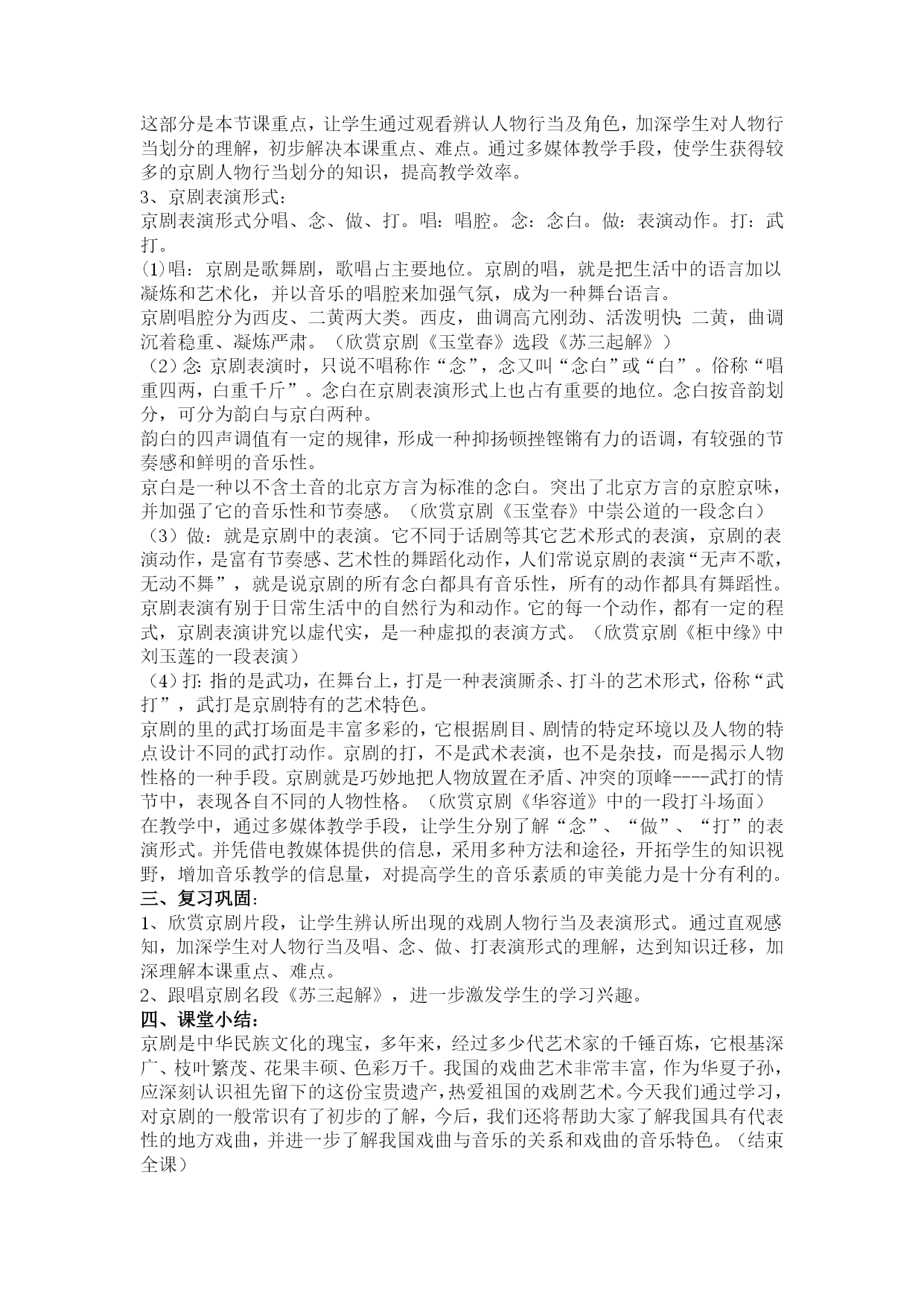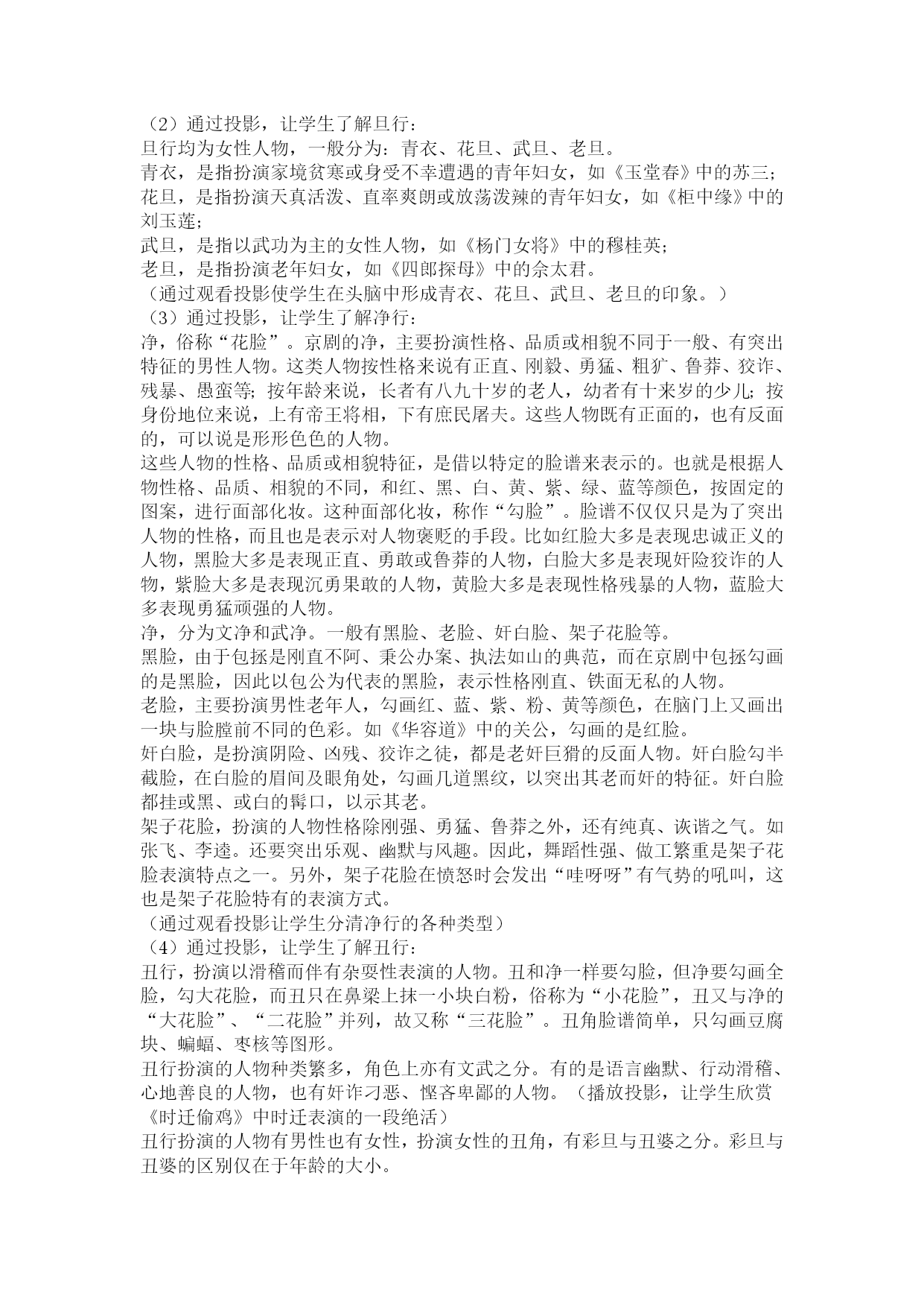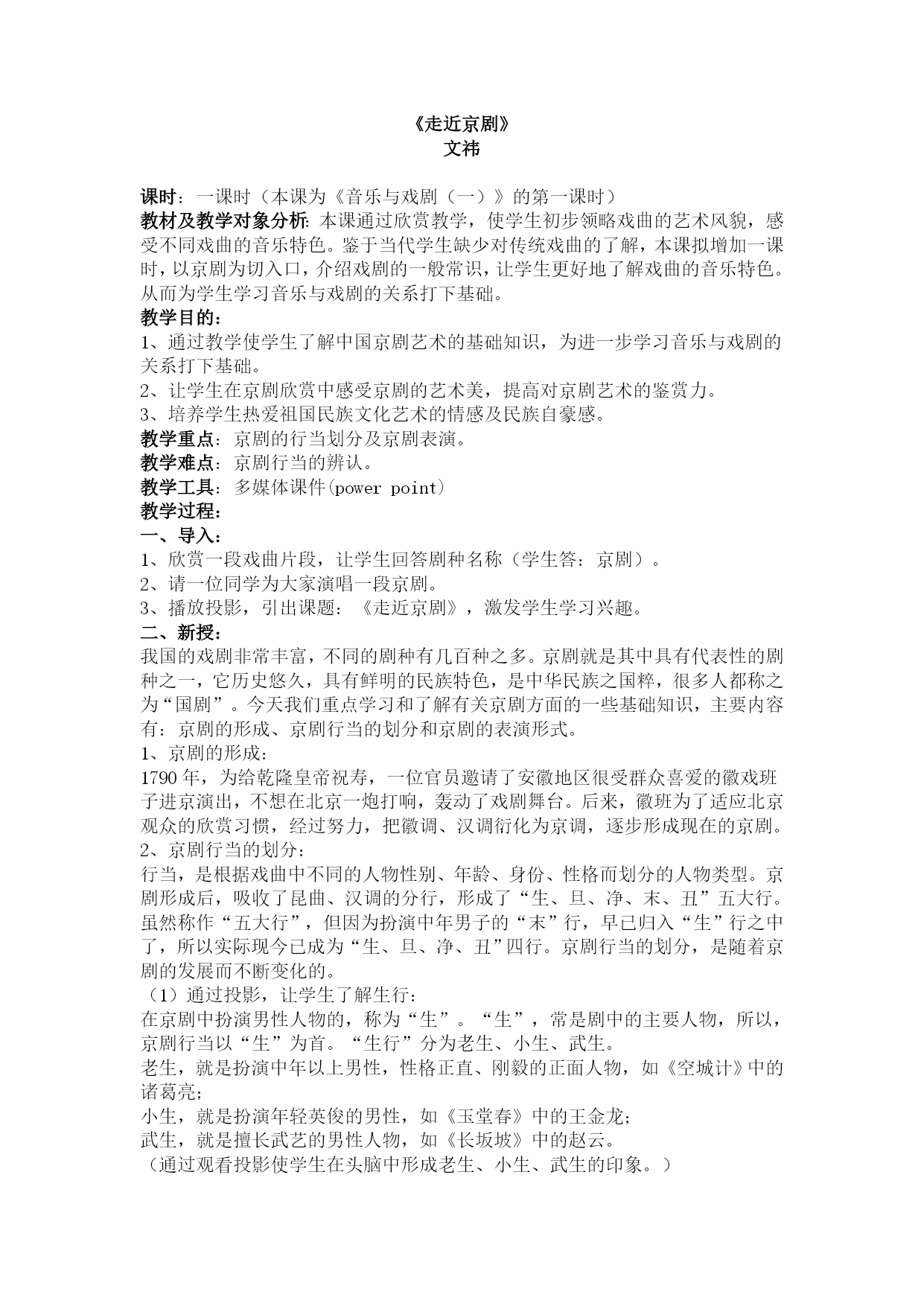 《走近京剧》 文祎 课时:一课时(本课为《音乐与戏剧(一)》的第一课时) 教材及教学对象分析:本课通过欣赏教学,使学生初步领略戏曲的艺术风貌,感受不同戏曲的音乐特色。鉴于当代学生缺少对传统戏曲的了解,本课拟增加一课时,以京剧为切入口,介绍戏剧的一般常识,让学生更好地了解戏曲的音乐特色。从而为学生学习音乐与戏剧的关系打下基础。 教学目的: 1、通过教学使学生了解中国京剧艺术的基础知识,为进一步学习音乐与戏剧的关系打下基础。 2、让学生在京剧欣赏中感受京剧的艺术美,提高对京剧艺术的鉴赏力。 3、培养学生热爱祖国民族文化艺术的情感及民族自豪感。 教学重点:京剧的行当划分及京剧表演。 教学难点:京剧行当的辨认。 教学工具:多媒体课件(powerpoint) 教学过程: 一、导入: 1、欣赏一段戏曲片段,让学生回答剧种名称(学生答:京剧)。 2、请一位同学为大家演唱一段京剧。 3、播放投影,引出课题:《走近京剧》,激发学生学习兴趣。 二、新授: 我国的戏剧非常丰富,不同的剧种有几百种之多。京剧就是其中具有代表性的剧种之一,它历史悠久,具有鲜明的民族特色,是中华民族之国粹,很多人都称之为“国剧”。今天我们重点学习和了解有关京剧方面的一些基础知识,主要内容有:京剧的形成、京剧行当的划分和京剧的表演形式。 1、京剧的形成: 1790年,为给乾隆皇帝祝寿,一位官员邀请了安徽地区很受群众喜爱的徽戏班子进京演出,不想在北京一炮打响,轰动了戏剧舞台。后来,徽班为了适应北京观众的欣赏习惯,经过努力,把徽调、汉调衍化为京调,逐步形成现在的京剧。 2、京剧行当的划分: 行当,是根据戏曲中不同的人物性别、年龄、身份、性格而划分的人物类型。京剧形成后,吸收了昆曲、汉调的分行,形成了“生、旦、净、末、丑”五大行。虽然称作“五大行”,但因为扮演中年男子的“末”行,早已归入“生”行之中了,所以实际现今已成为“生、旦、净、丑”四行。京剧行当的划分,是随着京剧的发展而不断变化的。 (1)通过投影,让学生了解生行: 在京剧中扮演男性人物的,称为“生”。“生”,常是剧中的主要人物,所以,京剧行当以“生”为首。“生行”分为老生、小生、武生。 老生,就是扮演中年以上男性,性格正直、刚毅的正面人物,如《空城计》中的诸葛亮; 小生,就是扮演年轻英俊的男性,如《玉堂春》中的王金龙; 武生,就是擅长武艺的男性人物,如《长坂坡》中的赵云。 (通过观看投影使学生在头脑中形成老生、小生、武生的印象。) (2)通过投影,让学生了解旦行: 旦行均为女性人物,一般分为:青衣、花旦、武旦、老旦。 青衣,是指扮演家境贫寒或身受不幸遭遇的青年妇女,如《玉堂春》中的苏三; 花旦,是指扮演天真活泼、直率爽朗或放荡泼辣的青年妇女,如《柜中缘》中的刘玉莲; 武旦,是指以武功为主的女性人物,如《杨门女将》中的穆桂英; 老旦,是指扮演老年妇女,如《四郎探母》中的佘太君。 (通过观看投影使学生在头脑中形成青衣、花旦、武旦、老旦的印象。) (3)通过投影,让学生了解净行: 净,俗称“花脸”。京剧的净,主要扮演性格、品质或相貌不同于一般、有突出特征的男性人物。这类人物按性格来说有正直、刚毅、勇猛、粗犷、鲁莽、狡诈、残暴、愚蛮等;按年龄来说,长者有八九十岁的老人,幼者有十来岁的少儿;按身份地位来说,上有帝王将相,下有庶民屠夫。这些人物既有正面的,也有反面的,可以说是形形色色的人物。 这些人物的性格、品质或相貌特征,是借以特定的脸谱来表示的。也就是根据人物性格、品质、相貌的不同,和红、黑、白、黄、紫、绿、蓝等颜色,按固定的图案,进行面部化妆。这种面部化妆,称作“勾脸”。脸谱不仅仅只是为了突出人物的性格,而且也是表示对人物褒贬的手段。比如红脸大多是表现忠诚正义的人物,黑脸大多是表现正直、勇敢或鲁莽的人物,白脸大多是表现奸险狡诈的人物,紫脸大多是表现沉勇果敢的人物,黄脸大多是表现性格残暴的人物,蓝脸大多表现勇猛顽强的人物。 净,分为文净和武净。一般有黑脸、老脸、奸白脸、架子花脸等。 黑脸,由于包拯是刚直不阿、秉公办案、执法如山的典范,而在京剧中包拯勾画的是黑脸,因此以包公为代表的黑脸,表示性格刚直、铁面无私的人物。 老脸,主要扮演男性老年人,勾画红、蓝、紫、粉、黄等颜色,在脑门上又画出一块与脸膛前不同的色彩。如《华容道》中的关公,勾画的是红脸。 奸白脸,是扮演阴险、凶残、狡诈之徒,都是老奸巨猾的反面人物。奸白脸勾半截脸,在白脸的眉间及眼角处,勾画几道黑纹,以突出其老而奸的特征。奸白脸都挂或黑、或白的髯口,以示其老。 架子花脸,扮演的人物性格除刚强、勇猛、鲁莽之外,还有纯真、诙谐之气。如张飞、李逵。还要突出乐观、幽默与风趣。因此,舞蹈性强、做工繁重是架子花脸表演特点之一。另外,架子花脸在愤怒时会发出“哇呀呀”有气势的吼叫,这也是