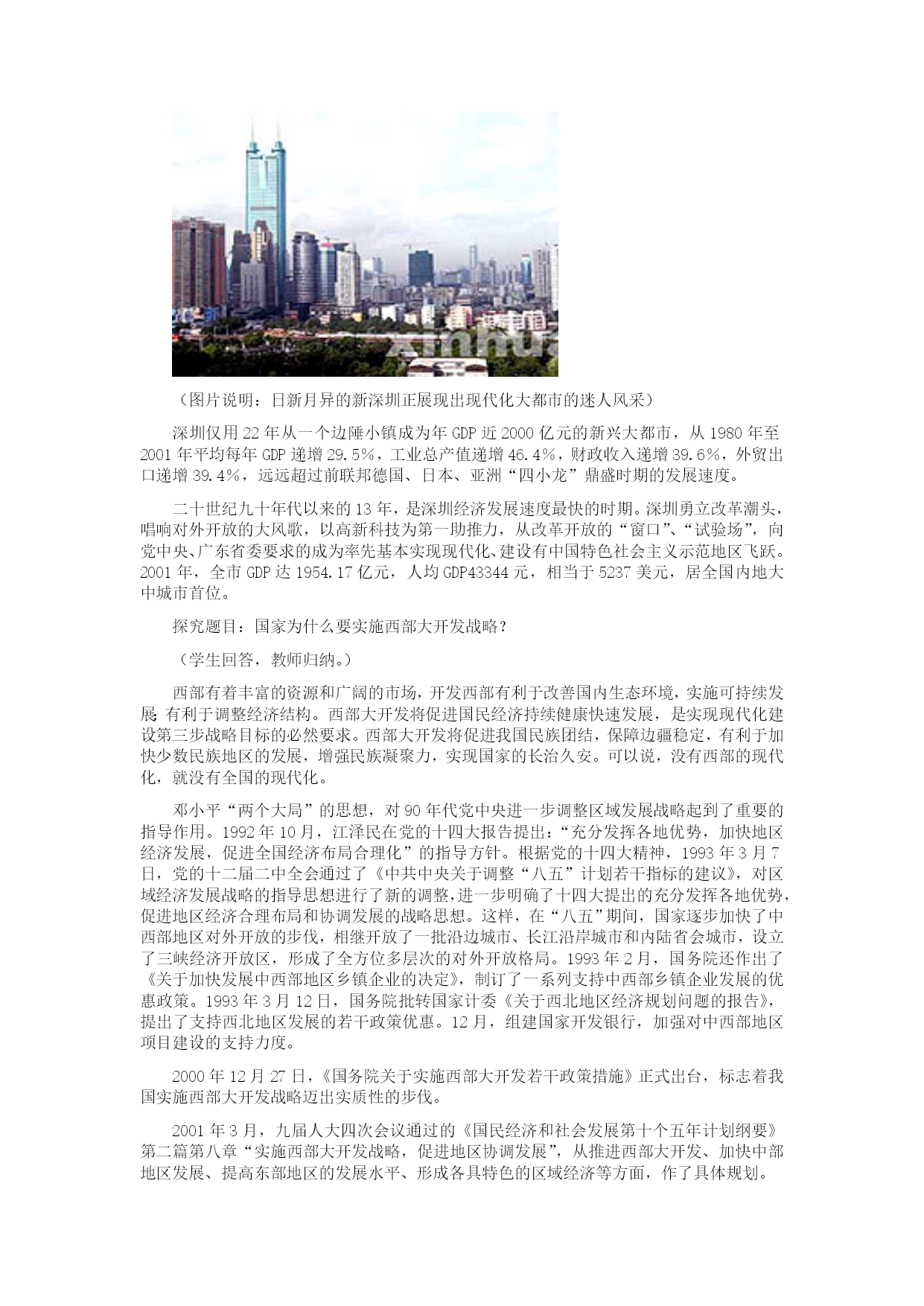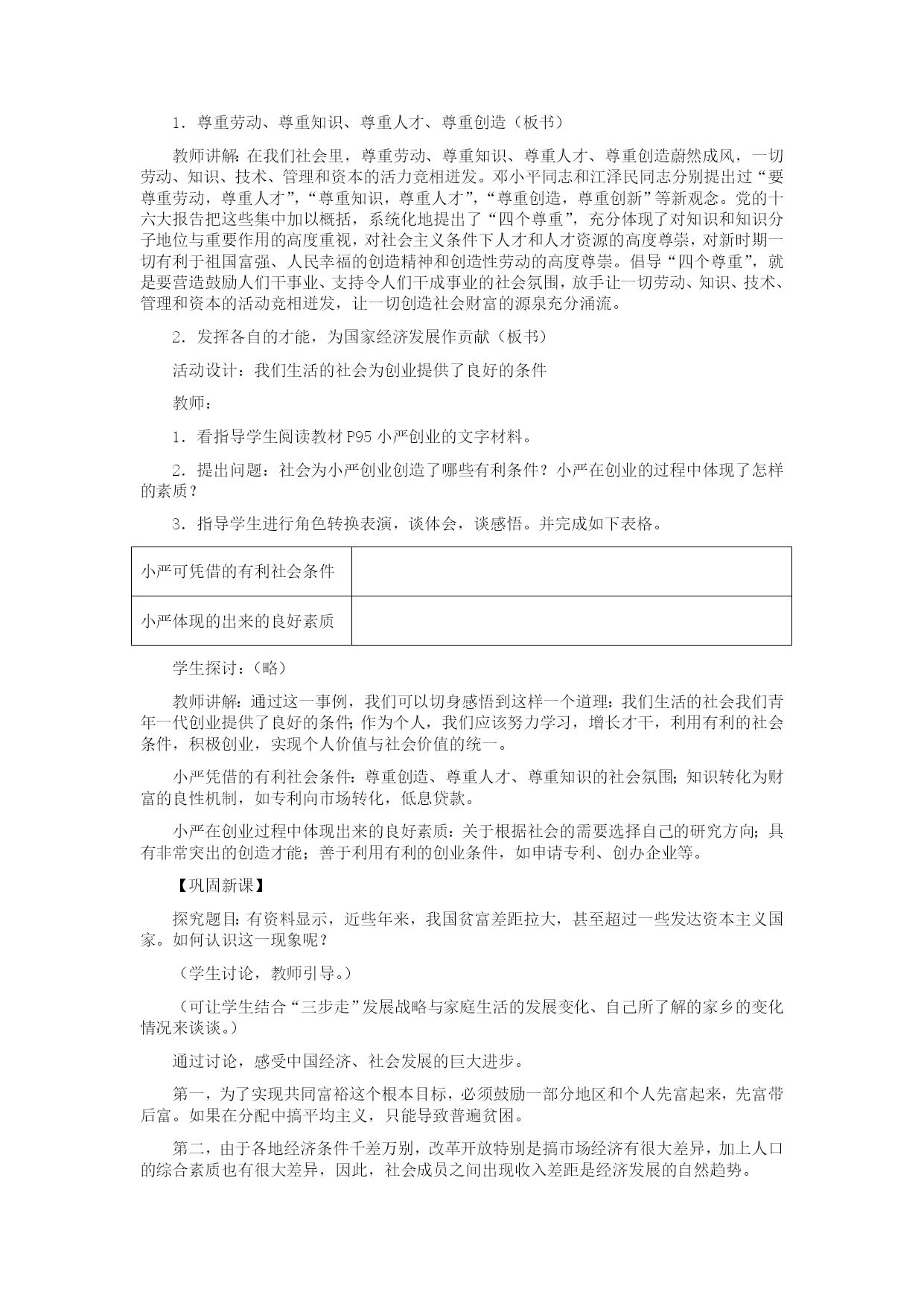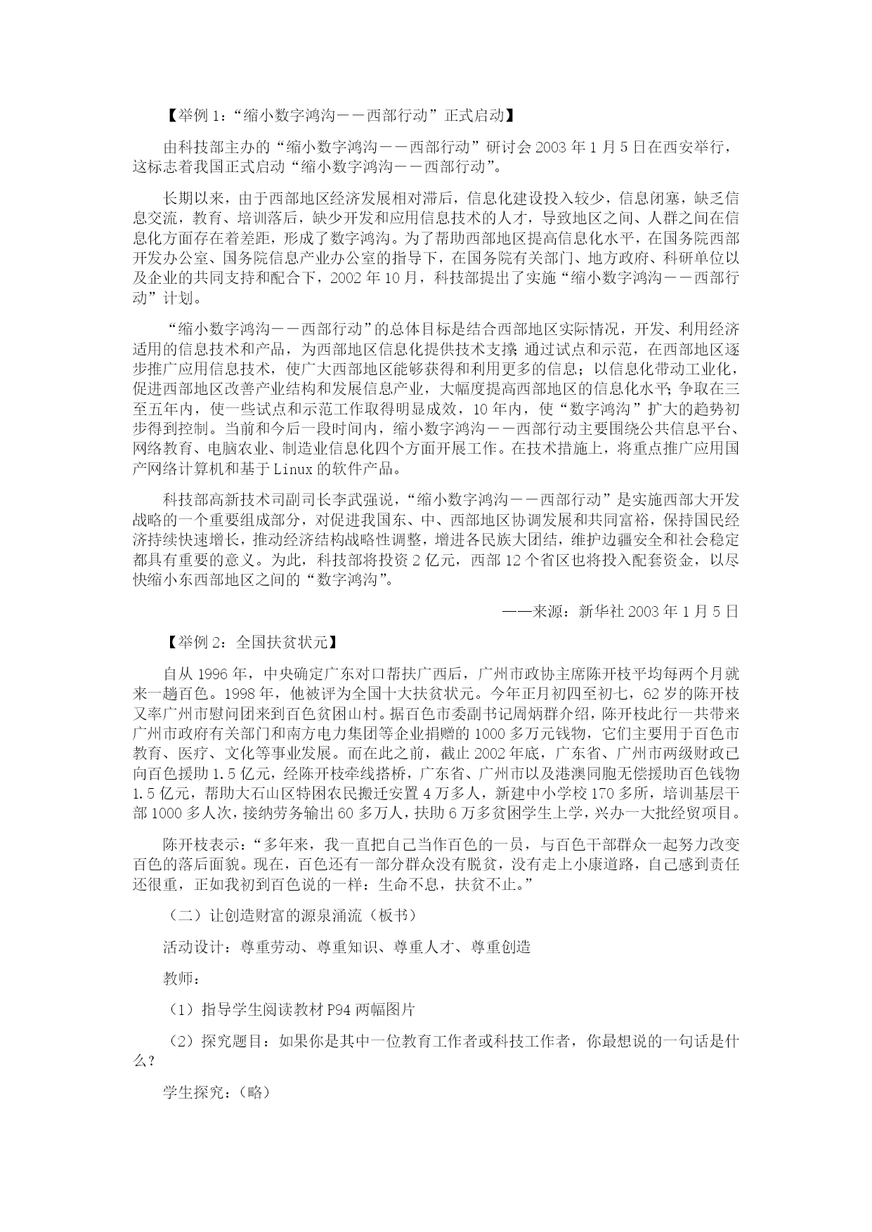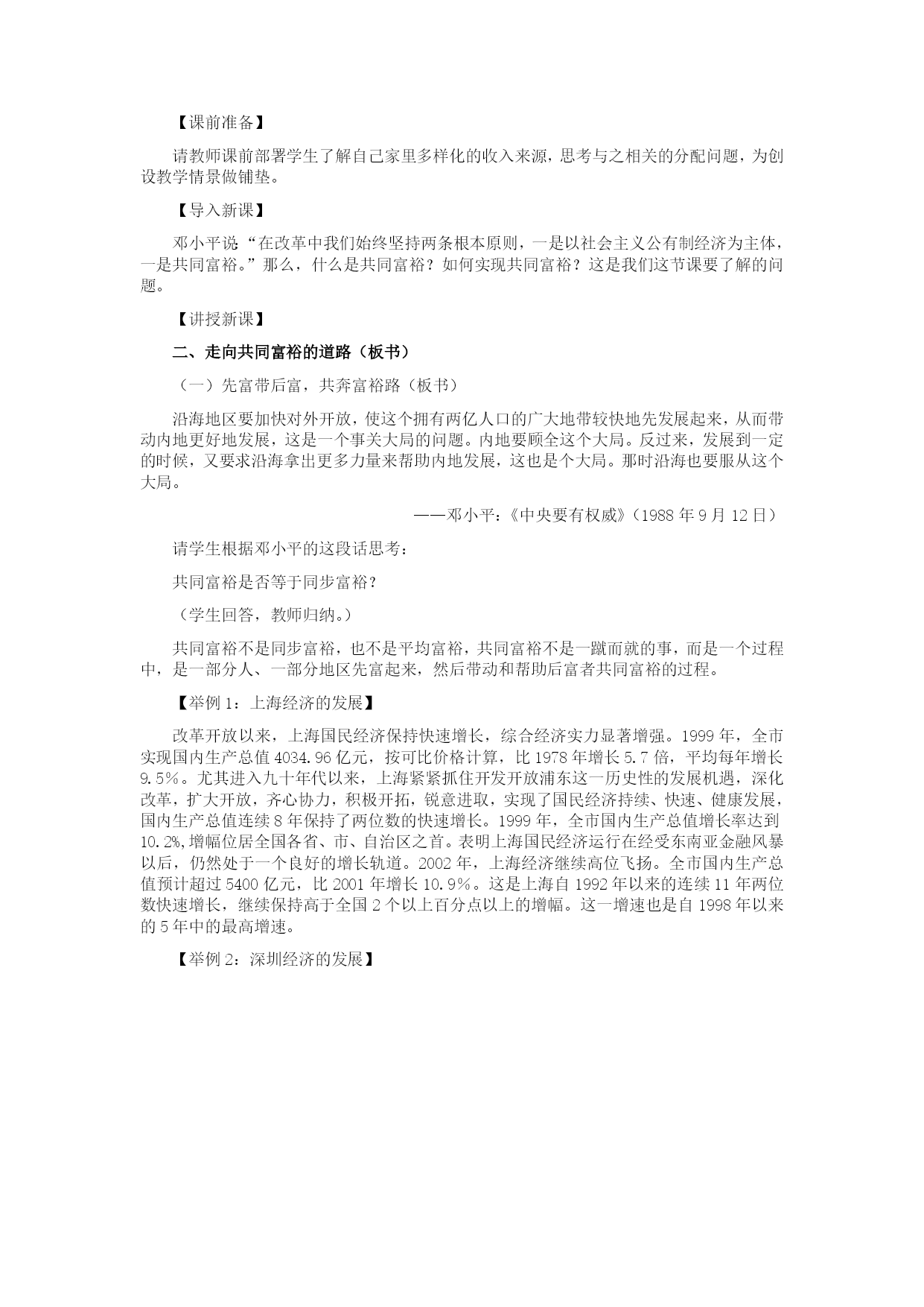 走向共同富裕的道路教学设计 【设计思路】 本教学设计以上海、深圳的经济发展为例说明共同富裕是让一部分人、一部分地区先富起来;以西部大开发、全国扶贫状元故事为例说明共同富裕是先富者带动和帮助后富者共同富裕的过程;通过小组讨论的形式感受中国经济、社会发展的巨大进步;最后对如何认识中国先阶段的贫富差距进行讨论,以巩固新课。这种举例比较探究式的教学方式比较符合学生的认知规律,能使学生更快地掌握新知识。 教学目标 (一)知识目标 1.说出社会主义初级阶段的基本分配制度; 2.理解尊重劳动、尊重知识、尊重人才、尊重创造; 3.一切劳动、知识、技术、管理和资本的活力竞相迸发,一切创造社会财富的源泉充分涌流。 (二)能力目标 1.结合我国生产力水平、教育科学文化水平、地理位置等方面的情形,体会共同富裕是一个先富带后富、共奔富裕路的过程; 2.从有利于调动广大人民群众的积极性和体现社会主义优越性这两方面,体会“在分配中,既要提倡奉献精神,又要落实分配政策”的辩证统一性。 (三)情感、态度与价值观目标 1.从促进生产力发展、发挥社会主义优越性的角度,认同“确立劳动、资本、技术、管理等生产要素,按贡献参与分配的原则”; 2.从科学技术是第一生产力、财富的创造和社会的发展有赖于劳动、知识、科技等角度,培养“尊重劳动、尊重知识、尊重人才、尊重创造”的意识。 教学重点 坚持和完善按劳分配为主体、多种分配方式并存的分配制度。 教学难点 共同富裕与同步富裕; 确立劳动、资本、技术和管理等生产要素,按贡献参与分配。 教学方法 比较探究式、体验与感悟法 教学媒体 多媒体及通用环境 课时安排 一课时 教学过程与结构 【课前准备】 请教师课前部署学生了解自己家里多样化的收入来源,思考与之相关的分配问题,为创设教学情景做铺垫。 【导入新课】 邓小平说:“在改革中我们始终坚持两条根本原则,一是以社会主义公有制经济为主体,一是共同富裕。”那么,什么是共同富裕?如何实现共同富裕?这是我们这节课要了解的问题。 【讲授新课】 二、走向共同富裕的道路(板书) (一)先富带后富,共奔富裕路(板书) 沿海地区要加快对外开放,使这个拥有两亿人口的广大地带较快地先发展起来,从而带动内地更好地发展,这是一个事关大局的问题。内地要顾全这个大局。反过来,发展到一定的时候,又要求沿海拿出更多力量来帮助内地发展,这也是个大局。那时沿海也要服从这个大局。 ——邓小平:《中央要有权威》(1988年9月12日) 请学生根据邓小平的这段话思考: 共同富裕是否等于同步富裕? (学生回答,教师归纳。) 共同富裕不是同步富裕,也不是平均富裕,共同富裕不是一蹴而就的事,而是一个过程中,是一部分人、一部分地区先富起来,然后带动和帮助后富者共同富裕的过程。 【举例1:上海经济的发展】 改革开放以来,上海国民经济保持快速增长,综合经济实力显著增强。1999年,全市实现国内生产总值4034.96亿元,按可比价格计算,比1978年增长5.7倍,平均每年增长9.5%。尤其进入九十年代以来,上海紧紧抓住开发开放浦东这一历史性的发展机遇,深化改革,扩大开放,齐心协力,积极开拓,锐意进取,实现了国民经济持续、快速、健康发展,国内生产总值连续8年保持了两位数的快速增长。1999年,全市国内生产总值增长率达到10.2%,增幅位居全国各省、市、自治区之首。表明上海国民经济运行在经受东南亚金融风暴以后,仍然处于一个良好的增长轨道。2002年,上海经济继续高位飞扬。全市国内生产总值预计超过5400亿元,比2001年增长10.9%。这是上海自1992年以来的连续11年两位数快速增长,继续保持高于全国2个以上百分点以上的增幅。这一增速也是自1998年以来的5年中的最高增速。 【举例2:深圳经济的发展】 (图片说明:日新月异的新深圳正展现出现代化大都市的迷人风采) 深圳仅用22年从一个边陲小镇成为年GDP近2000亿元的新兴大都市,从1980年至2001年平均每年GDP递增29.5%,工业总产值递增46.4%,财政收入递增39.6%,外贸出口递增39.4%,远远超过前联邦德国、日本、亚洲“四小龙”鼎盛时期的发展速度。 二十世纪九十年代以来的13年,是深圳经济发展速度最快的时期。深圳勇立改革潮头,唱响对外开放的大风歌,以高新科技为第一助推力,从改革开放的“窗口”、“试验场”,向党中央、广东省委要求的成为率先基本实现现代化、建设有中国特色社会主义示范地区飞跃。2001年,全市GDP达1954.17亿元,人均GDP43344元,相当于5237美元,居全国内地大中城市首位。 探究题目:国家为什么要实施西部大开发战略? (学生回答,教师归纳。) 西部有着丰富的资源和广阔的市场,开发西部有利于改善国内生态环境,实施可持续发展;有利于调整经济结构。西部大开发