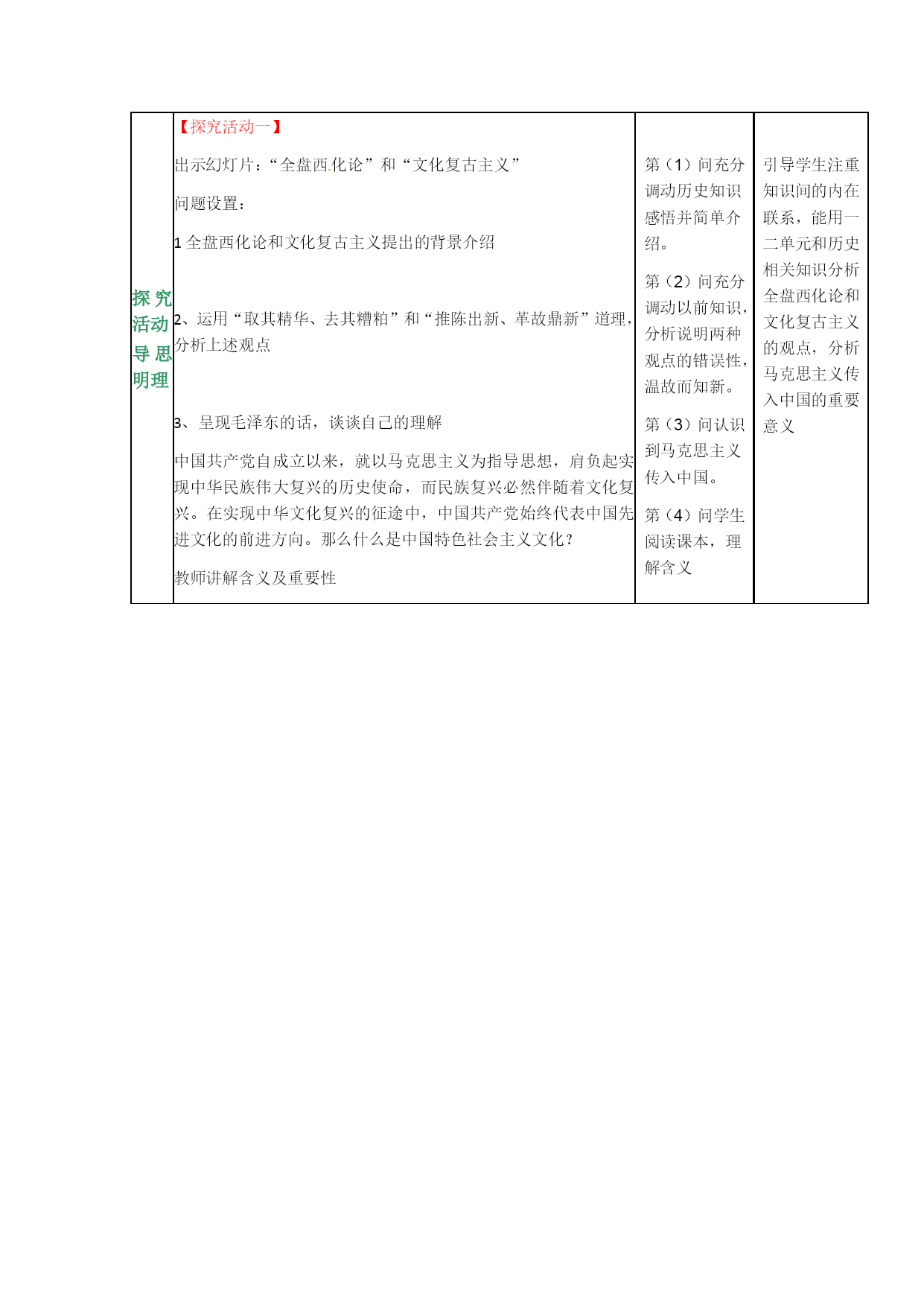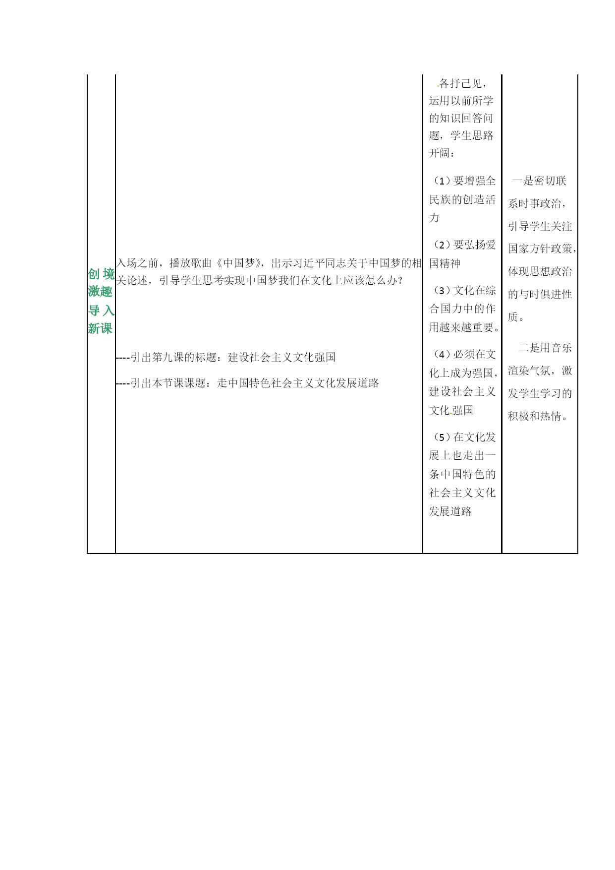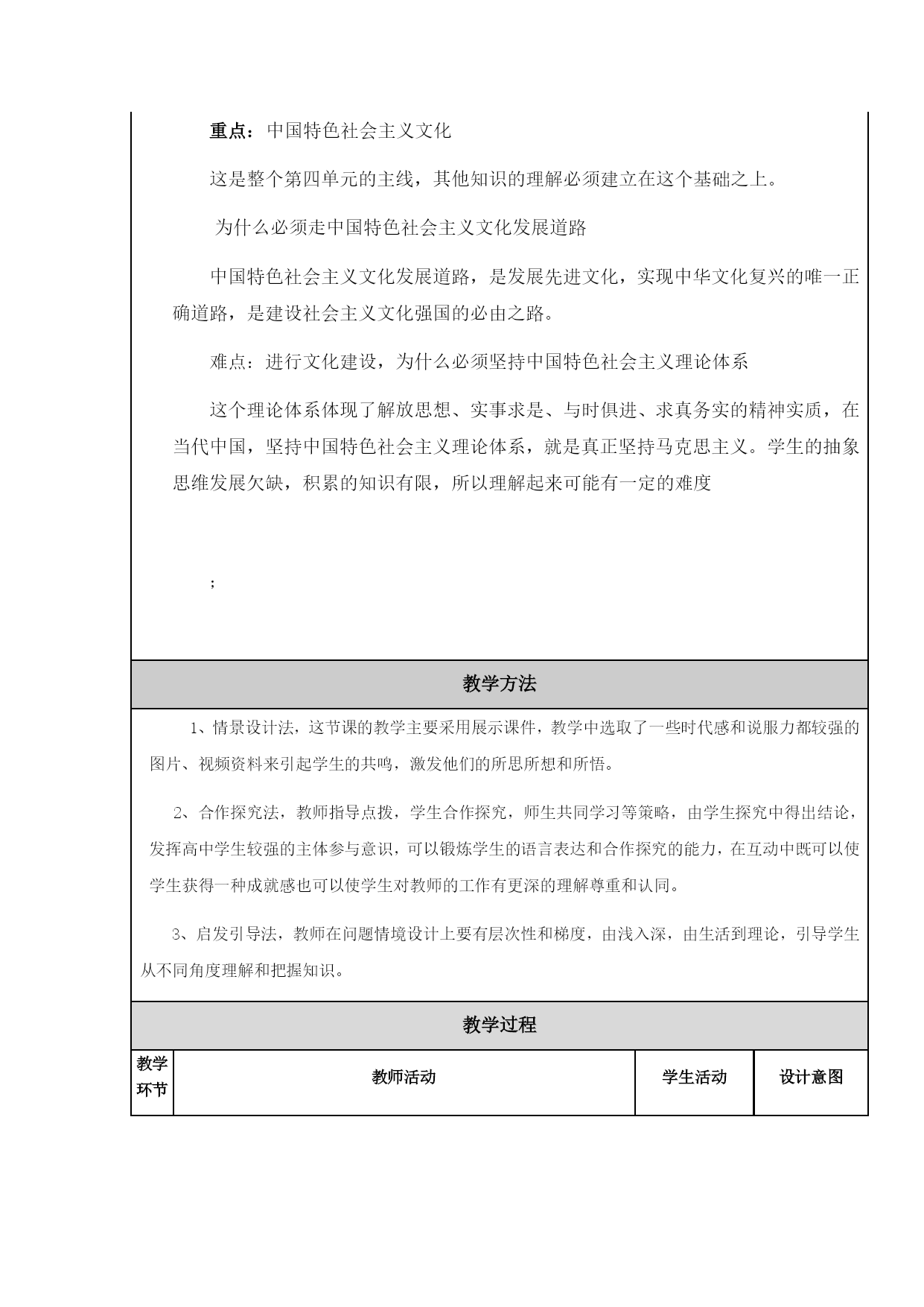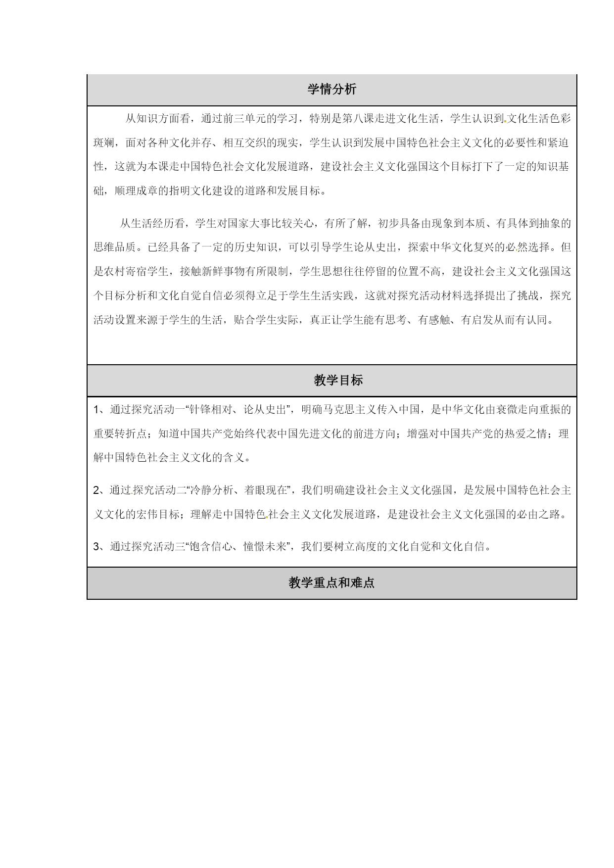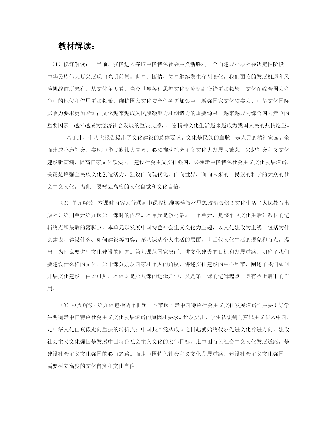 教材解读: (1)修订解读:当前,我国进入夺取中国特色社会主义新胜利,全面建成小康社会决定性阶段,中华民族伟大复兴展现出光明前景。世情、国情、党情继续发生深刻变化,我们面临的发展机遇和风险挑战前所未有。从文化角度看,当今世界各种思想文化交流交融交锋更加频繁,文化在综合国力竞争中的地位和作用更加频繁,维护国家文化安全任务更加艰巨,增强国家文化软实力、中华文化国际影响力要求更加紧迫;文化越来越成为民族凝聚力和创造力的重要源泉,越来越成为综合国力竞争的重要因素,越来越成为经济社会发展的重要支撑,丰富精神文化生活越来越成为我国人民的热情愿望。基于此,十八大报告提出了文化建设的总体要求。文化是民族的血脉,是人民的精神家园。全面建成小康社会,实现中华民族伟大复兴,必须推动社会主义文化大发展大繁荣,兴起社会主义文化建设新高潮,提高国家文化软实力。建设社会主义文化强国,必须走中国特色社会主义文化发展道路,关键是增强全民族文化创造活力,建设面向现代化、面向世界、面向未来的,民族的科学的大众的社会主义文化。为此,要树立高度的文化自觉和文化自信, (2)单元解读:本课时内容为普通高中课程标准实验教材思想政治必修3文化生活(人民教育出版社)第四单元第九课第一课时的内容。本单元是教材最后一个单元,是整个《文化生活》教材的逻辑终点和最后的落脚点。本单元以发展中国特色社会主义文化为主题,以文化建设为主线,包括为什么建设、建设什么、如何建设等内容。第八课从个人生活的层面,讲当代文化生活的现象和特点,提出了为什么要进行文化建设的问题。第九课从国家层面,讲文化建设的目标和发展道路,明确了我们要建设什么样的文化。第十课分别从国家和个人的角度,讲述文化建设的中心环节,阐述了我们如何开展文化建设。由此可见,本课既是第八课的逻辑延伸,又是第十课的逻辑起点,具有承上启下的作用。 (3)框题解读:第九课包括两个框题,本节课“走中国特色社会主义文化发展道路”主要引导学生明确走中国特色社会主义文化发展道路的原因和要求。论从史出,学生认识到马克思主义传入中国,是中华文化由衰微走向重振的转折点;中国共产党从成立之日起就始终代表先进文化前进方向。建设社会主义文化强国是发展中国特色社会主义文化的宏伟目标,走中国特色社会主义文化发展道路,是建设社会主义文化强国的必由之路。而走中国特色社会主义文化发展道路,建设社会主义文化强国,需要树立高度的文化自觉和文化自信。 学情分析从知识方面看,通过前三单元的学习,特别是第八课走进文化生活,学生认识到文化生活色彩斑斓,面对各种文化并存、相互交织的现实,学生认识到发展中国特色社会主义文化的必要性和紧迫性,这就为本课走中国特色社会文化发展道路,建设社会主义文化强国这个目标打下了一定的知识基础,顺理成章的指明文化建设的道路和发展目标。 从生活经历看,学生对国家大事比较关心,有所了解,初步具备由现象到本质、有具体到抽象的思维品质。已经具备了一定的历史知识,可以引导学生论从史出,探索中华文化复兴的必然选择。但是农村寄宿学生,接触新鲜事物有所限制,学生思想往往停留的位置不高,建设社会主义文化强国这个目标分析和文化自觉自信必须得立足于学生生活实践,这就对探究活动材料选择提出了挑战,探究活动设置来源于学生的生活,贴合学生实际,真正让学生能有思考、有感触、有启发从而有认同。 教学目标1、通过探究活动一“针锋相对、论从史出”,明确马克思主义传入中国,是中华文化由衰微走向重振的重要转折点;知道中国共产党始终代表中国先进文化的前进方向;增强对中国共产党的热爱之情;理解中国特色社会主义文化的含义。[来源:Z&xx&k.Com] 2、通过探究活动二“冷静分析、着眼现在”,我们明确建设社会主义文化强国,是发展中国特色社会主义文化的宏伟目标;理解走中国特色社会主义文化发展道路,是建设社会主义文化强国的必由之路。 3、通过探究活动三“饱含信心、憧憬未来”,我们要树立高度的文化自觉和文化自信。教学重点和难点重点:中国特色社会主义文化 这是整个第四单元的主线,其他知识的理解必须建立在这个基础之上。 为什么必须走中国特色社会主义文化发展道路 中国特色社会主义文化发展道路,是发展先进文化,实现中华文化复兴的唯一正确道路,是建设社会主义文化强国的必由之路。 难点:进行文化建设,为什么必须坚持中国特色社会主义理论体系 这个理论体系体现了解放思想、实事求是、与时俱进、求真务实的精神实质,在当代中国,坚持中国特色社会主义理论体系,就是真正坚持马克思主义。学生的抽象思维发展欠缺,积累的知识有限,所以理解起来可能有一定的难度 ; 教学方法1、情景设计法,这节课的教学主要采用展示课件,教学中选取了一些时代感和说服力都较强的图片、视频资料来引起学生的共鸣,激发他们的所思所想和所悟。 2、合作探究法,教师指