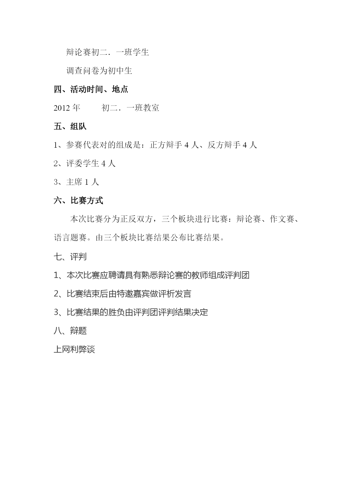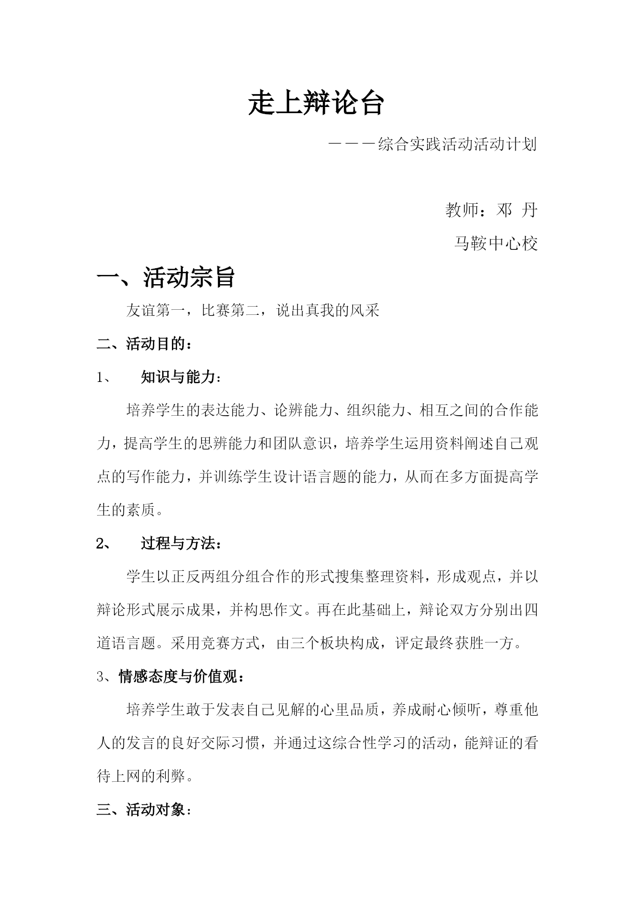 走上辩论台 ―――综合实践活动活动计划 教师:邓丹 马鞍中心校 一、活动宗旨 友谊第一,比赛第二,说出真我的风采 二、活动目的: 知识与能力: 培养学生的表达能力、论辨能力、组织能力、相互之间的合作能力,提高学生的思辨能力和团队意识,培养学生运用资料阐述自己观点的写作能力,并训练学生设计语言题的能力,从而在多方面提高学生的素质。 过程与方法: 学生以正反两组分组合作的形式搜集整理资料,形成观点,并以辩论形式展示成果,并构思作文。再在此基础上,辩论双方分别出四道语言题。采用竞赛方式,由三个板块构成,评定最终获胜一方。 3、情感态度与价值观: 培养学生敢于发表自己见解的心里品质,养成耐心倾听,尊重他人的发言的良好交际习惯,并通过这综合性学习的活动,能辩证的看待上网的利弊。 三、活动对象: 辩论赛初二.一班学生 调查问卷为初中生 四、活动时间、地点 2012年初二.一班教室 五、组队 1、参赛代表对的组成是:正方辩手4人、反方辩手4人 2、评委学生4人 3、主席1人 六、比赛方式 本次比赛分为正反双方,三个板块进行比赛:辩论赛、作文赛、语言题赛。由三个板块比赛结果公布比赛结果。 七、评判 1、本次比赛应聘请具有熟悉辩论赛的教师组成评判团 2、比赛结束后由特邀嘉宾做评析发言 3、比赛结果的胜负由评判团评判结果决定 八、辩题 上网利弊谈 -