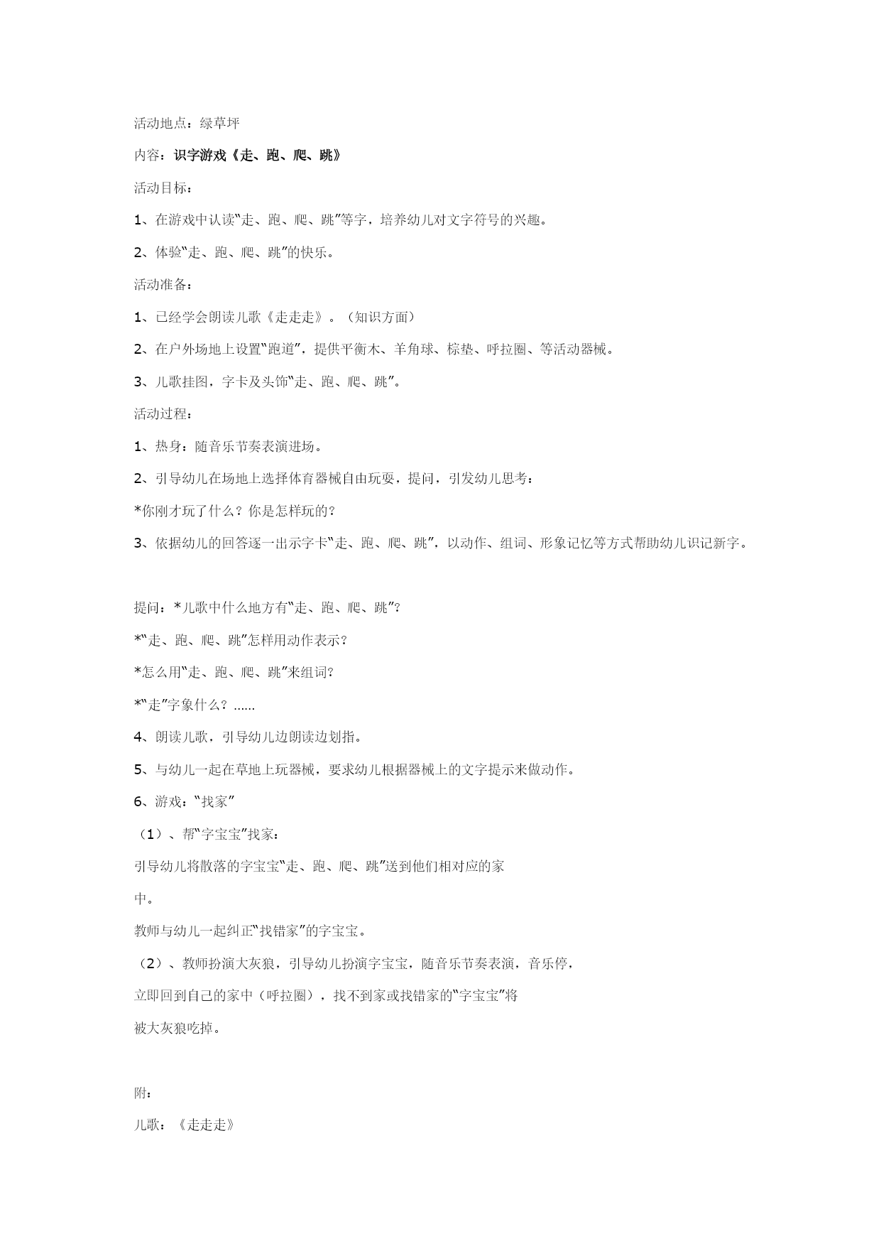 活动地点:绿草坪内容:识字游戏《走、跑、爬、跳》活动目标:1、在游戏中认读“走、跑、爬、跳”等字,培养幼儿对文字符号的兴趣。2、体验“走、跑、爬、跳”的快乐。活动准备:1、已经学会朗读儿歌《走走走》。(知识方面)2、在户外场地上设置“跑道”,提供平衡木、羊角球、棕垫、呼拉圈、等活动器械。3、儿歌挂图,字卡及头饰“走、跑、爬、跳”。活动过程:1、热身:随音乐节奏表演进场。2、引导幼儿在场地上选择体育器械自由玩耍,提问,引发幼儿思考:*你刚才玩了什么?你是怎样玩的?3、依据幼儿的回答逐一出示字卡“走、跑、爬、跳”,以动作、组词、形象记忆等方式帮助幼儿识记新字。提问:*儿歌中什么地方有“走、跑、爬、跳”?*“走、跑、爬、跳”怎样用动作表示?*怎么用“走、跑、爬、跳”来组词?*“走”字象什么?……4、朗读儿歌,引导幼儿边朗读边划指。5、与幼儿一起在草地上玩器械,要求幼儿根据器械上的文字提示来做动作。6、游戏:“找家”(1)、帮“字宝宝”找家:引导幼儿将散落的字宝宝“走、跑、爬、跳”送到他们相对应的家中。教师与幼儿一起纠正“找错家”的字宝宝。(2)、教师扮演大灰狼,引导幼儿扮演字宝宝,随音乐节奏表演,音乐停,立即回到自己的家中(呼拉圈),找不到家或找错家的“字宝宝”将被大灰狼吃掉。附:儿歌:《走走走》走走走,小猫轻轻走。爬爬爬,乌龟慢慢爬。跳跳跳,小兔蹦蹦跳。跑跑跑,小朋友快快跑。