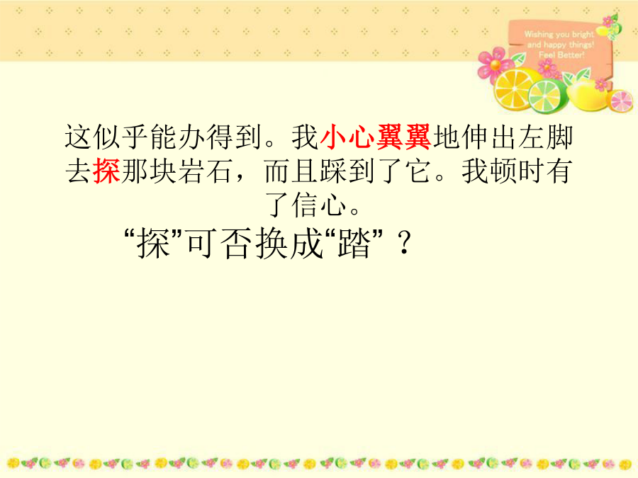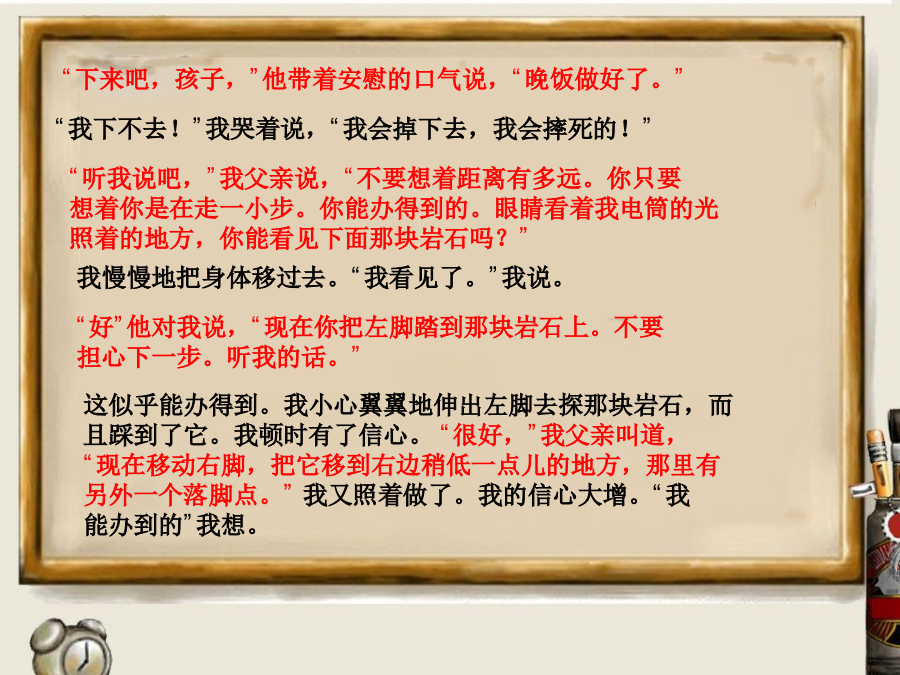 我没法?谁有法?“下来吧,孩子,”他带着安慰的口气说,“晚饭做好了。”这似乎能办得到。我小心翼翼地伸出左脚去探那块岩石,而且踩到了它。我顿时有了信心。“探”可否换成“踏”?最后产生一种巨大的成就感1945年1月,正是二战期间。在英格兰的沃顿空军基地,作为上尉飞行员的莫顿·亨特接受了一项任务,驾驶没有任何武器装备和防护设施的蚊式双引擎飞机深入到德军本土执行侦察任务。他觉得几乎无法完成任务,他想象着飞机坐舱被炮弹击中,自己鲜血飞溅,连跳伞的力气都没有。 第二天,他驾机滑行在跑道上,他告诫自己,现在,只是起飞,飞起来就行。升到两万五千米高空时,他又告诫自己,现在所要做的,是在地面无线电的指导下,保持这个航向20分钟,就可以到达荷兰的素文岛,这个,不难做到。 就这样,他不断告诫自己,下面,只是飞越荷兰,这并不难。然后,是飞临德国,根本不须想更多的事,而且,还有后方的无线电支持。 就这样,一程又一程,这位上尉终于完成了任务,当他接受盟军的奖励时,他说,我之所以能够成为孤胆英雄,完全是因为我小时候一段经历的启示。一步又一步,终会达到自己的目的地。
