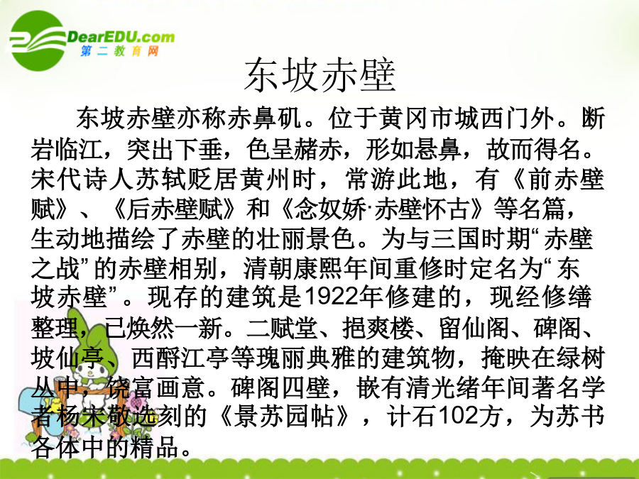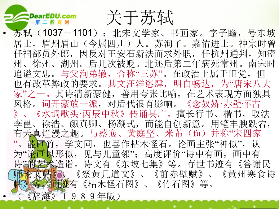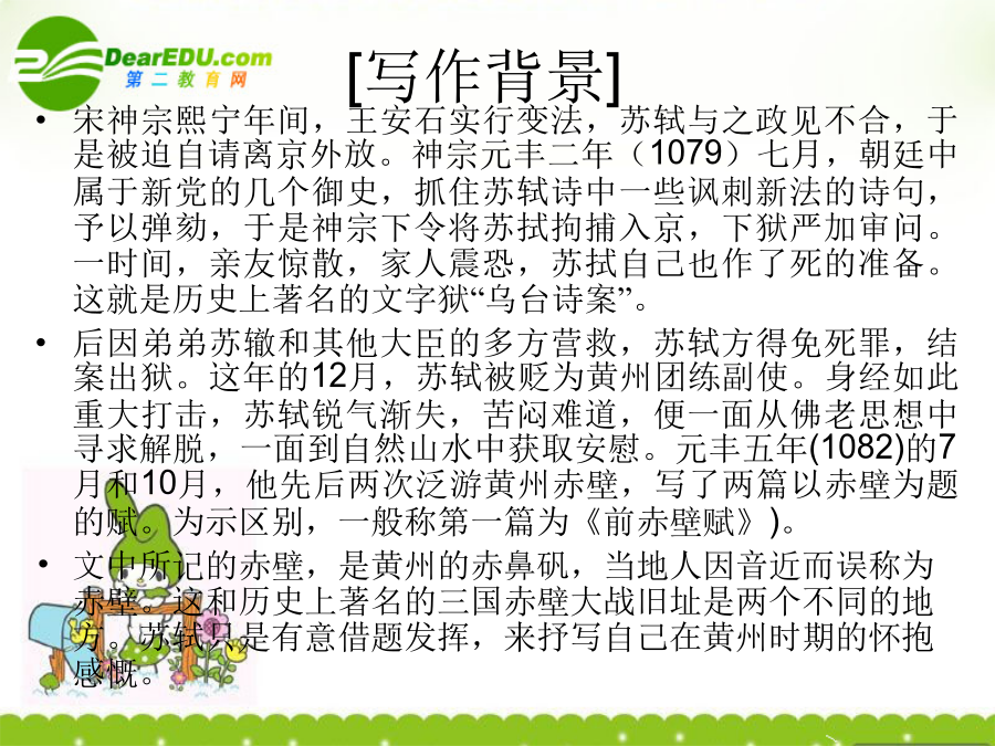 前赤壁赋关于苏轼东坡赤壁[写作背景][层次结构][内容述评][艺术特色]重点词句重要的不是发生了什么事情,而是你怎样看待。赋骈赋(魏晋南北朝) 受骈文影响,讲究对仗工整。 律赋(唐) 科举中写赋,按照诗歌声律,除句式对偶外,还限制用韵,规定平仄配合,音律谐和。 文赋(宋) 打破声律限制,加入散文特点。