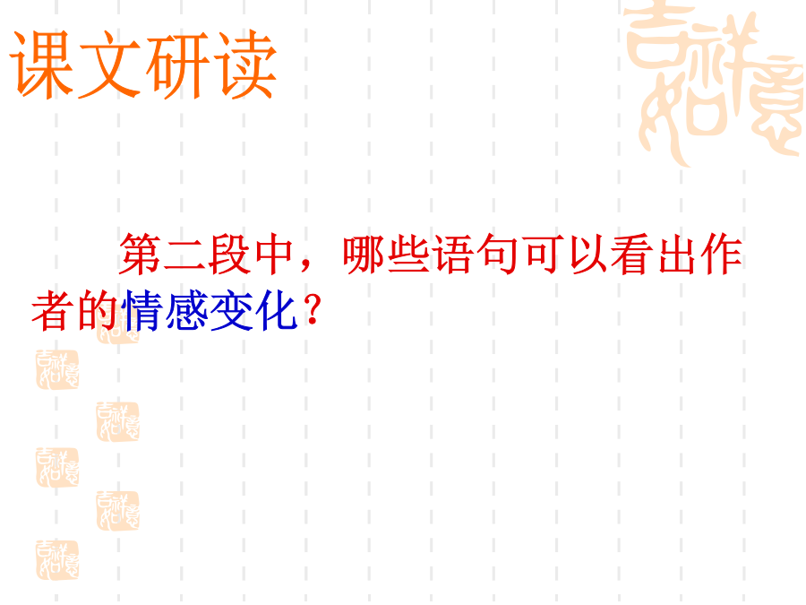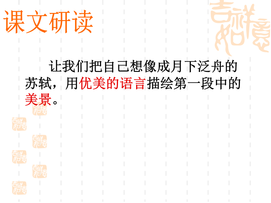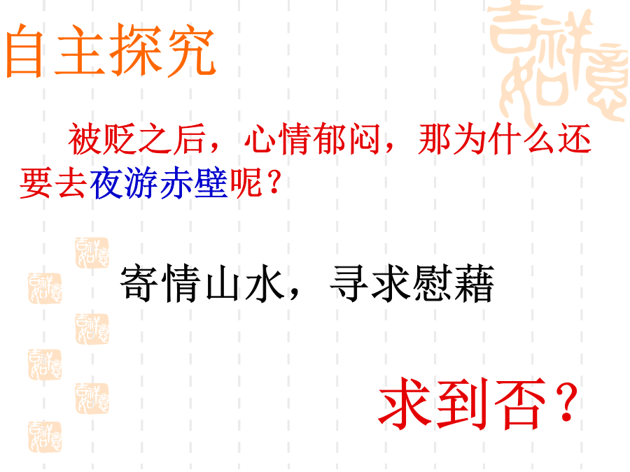 赤壁赋被贬之后,心情郁闷,那为什么还要去夜游赤壁呢?第二段中,哪些语句可以看出作者的情感变化?如怨如慕下文中,苏子“愀然”。难道苏子的色变仅仅只是因为客人的箫声吗?第三段中,作者借客人之口发出的关于英雄曹操的三问能否调换顺序?滚滚长江东逝水,浪花淘尽英雄。是非成败转头空。由英雄曹操想到自己,那么作者究竟还有哪些无法排遣的悲伤呢?如果你是被这种忧伤所笼罩的苏轼,你能解开这个心结吗?苏轼又是怎样走出心灵的困境的呢?文中哪些语句让你有所启发?心灵鸡汤:课文研读如果给你一次穿越历史的机会,你想对苏轼说些什么呢?樱花的粉红在时间晦涩不语的光芒里渐渐黯淡,陨落在黑色的泥土。 你始终不相信的命运,一寸,一寸残缺凋零,被湮没进历史未曾拓印的章节。 你不相信。你意气风发的样子。左牵黄,右擎苍。 苍老已在你的鬓角蔓延出细碎的枝叶,一天一天开出斑驳的白色。但你那松散开的发尾在风中舒卷翻飞,如同往昔战场上腥风血雨中的旗帜猎猎捕风。浊酒顺着滚烫的喉咙流下,如同惊雷滚过喑哑的天空。你猛然满弓如月,西北望,射天狼! 七年后的赤壁。 你掩饰着自己淡淡的忧伤,你始终是那个豪气云干,永不退缩的苏轼。总是酸痛已哽在咽喉,一声“也无风雨也无晴”便悄悄咽下。然而你曾是那样难以抑制的伤痛与寂寞。 离散的岁月,重回身边,消逝的韶光,缠绕心田。湿热的液体无声无息地滑过憔悴的眼角,那是被无数人所忽视的。忽视那豪情万丈的你,也曾这样的……泪千行。