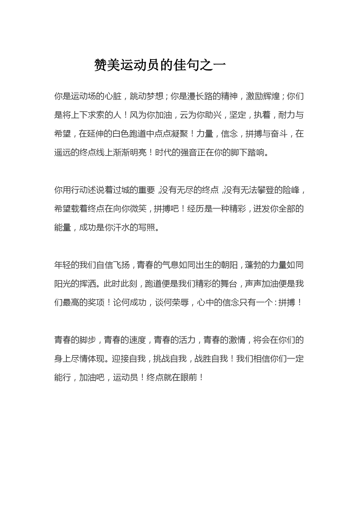 赞美运动员的佳句之一 你是运动场的心脏,跳动梦想;你是漫长路的精神,激励辉煌;你们是将上下求索的人!风为你加油,云为你助兴,坚定,执着,耐力与希望,在延伸的白色跑道中点点凝聚!力量,信念,拼搏与奋斗,在遥远的终点线上渐渐明亮!时代的强音正在你的脚下踏响。你用行动述说着过城的重要,没有无尽的终点,没有无法攀登的险峰,希望载着终点在向你微笑,拼搏吧!经历是一种精彩,迸发你全部的能量,成功是你汗水的写照。年轻的我们自信飞扬,青春的气息如同出生的朝阳,蓬勃的力量如同阳光的挥洒。此时此刻,跑道便是我们精彩的舞台,声声加油便是我们最高的奖项!论何成功,谈何荣辱,心中的信念只有一个:拼搏!青春的脚步,青春的速度,青春的活力,青春的激情,将会在你们的身上尽情体现。迎接自我,挑战自我,战胜自我!我们相信你们一定能行,加油吧,运动员!终点就在眼前!