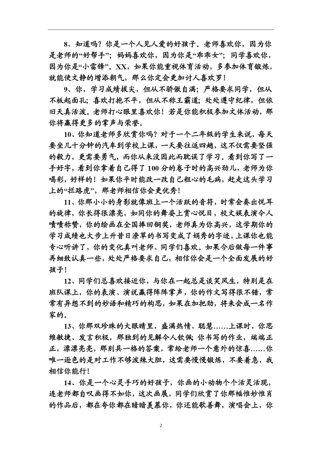 小学生期末评语大全(适合一到六年级) 1你是一个积极向上,有自信心的男孩。学习上有计划、有目标,能够合理安排自己的时间,学习状态挺好;心态平和,关心、帮助同学,关心班集体,积极参加班级、学校组织的各项活动,具有较强的劳动观念,积极参加体育活动,尊敬师长。希望你再接再厉,不满足于现状,争取做的更好。 2、你是一个开朗、大方、有礼貌的可爱女孩,团结同学,乐于助人;积极参加社会活动,关心班集体,生活上比较俭朴,热爱劳动,能严格要求自己;学习上认真、有目标,但缺乏吃苦精神;能积极参加班级、学校组织的各项活动,心理素质好。希望你在今后的学习中继续努力,各方面取得更好成绩。 3、你是个朴实、勤奋、聪明的女生。听课用心,学习刻苦,勤于思考,有很强的进取心,能克服在外求学的诸多困难,有较强的生活自理能力,能吃苦,与人为善,尊敬师长,积极参加班级事务,学习成绩优良且稳定。 望继续努力,始终保持稳中有进的态势,相信你会做的更好。 4、你是个既聪明又勤奋,有思想、有目标的男生。善于思考,听课认真,做事仔细,尊敬老师,友善同学,尤其是热情为班级服务,协助老师工作,具有很好的综合能力。学习处事都能冷静面对,成绩优良且较稳定。品质好,潜力大,相信你会更加努力,学无止境,争取更好的成绩。 5、你是一个内心世界丰富,但不善表达的男孩,你有思想、聪明。在班里你团结同学,劳动踏实,有集体荣誉感。在学习上你能认真听老师上课,作业能按时完成。老师记住了你的优点。 老师希望你在学习上再刻苦些,对不会的问题要大胆地问,注意学习方法。老师相信你一定能做好。 6、你是一个言语不多,性格文静的女孩。在班上你能团结同学,尊重老师,思想品德好,劳动踏实。学习上你能按时完成作业,学习目的明确,同时你的自理能力很强。 7、真是人如其名,你长得秀气,富有灵气。一学期来,难忘的是你那甜美的歌声,腼腆的笑容,娟秀的字迹。平时你学习勤奋,工作负责,是位称职的小干部。如果多多参加集体活动,更活跃些,相信你将赢得更多的掌声!试试看! 8、知道吗?你是一个人见人爱的好孩子。老师喜欢你,因为你是老师的“好帮手”;妈妈喜欢你,因为你是“乖乖女”;同学喜欢你,因为你是“小雷锋”。XX,如果你能重视体育活动,多参加体育锻炼,就能使文静的增添朝气,那么你定会更加讨人喜欢罗! 9、你,学习成绩拔尖,但从不骄傲自满;严格要求同学,但从不板起面孔;喜欢打抱不平,但从不称王霸道;处处遵守纪律,但依旧天真活泼。老师打心眼里喜欢你!若是你能积极参加文体活动,那你将赢得更多的掌声与荣誉。 10、你知道老师多欣赏你吗?对于一个二年级的学生来说,每天要坐几十分钟的汽车到学校上课,一天要往返四趟,这不仅需要坚强的毅力,更需要勇气,而你从来没因此而耽误了学习。看到你写了一手好字,看到你拿着自己得了100分的卷子时的高兴劲儿,老师为你喝彩,好样的!如果你平时能改一改自己粗心的毛病,赶走这头学习上的“拦路虎”,那老师相信你会更优秀! 11、你那小小的身影就像班上一个活跃的音符,时常会奏出悦耳的旋律,你长得很漂亮,如同你的舞姿上赏心悦目,校文娱表演令人啧啧称赞,你的绘画在全国捧回铜奖,老师真为你高兴,这学期你的学习成绩也大步上升昔日潦草的书写变成了娟秀的字迹,上课你也能专心听讲了,你的变化真叫老师、同学们喜欢。如果今后做每一件事再细致认真一些,处处严格要求自己,相信你会是一个全面发展的好孩子! 12、同学们总喜欢接近你,与你在一起总是谈笑风生,特别是在班队课上,你的表演、演说赢得阵阵掌声,你的作文写得很不错,常常有异想不到的妙语和精巧的构思,如果在加把劲,将来会成一名作家的。 13、你那双珍珠的大眼睛里,盛满热情、聪慧……上课时,你思维敏捷、发言积极,那独到的见解令人钦佩;你书写的作业,端端正正,漂漂亮亮,那别具一格的答案,常给老师一个意外的惊喜……你唯一逊色的是对工作不够泼辣大胆,这需要慢慢锻炼,不要着急,我相信你能行! 14、你是一个心灵手巧的好孩子,你画的小动物个个活灵活现,连老师都自叹画得不如你,这次画展,同学们欣赏了你那幅惟妙惟肖的作品后,都在夸你都在暗暗羡慕你,你还能歌善舞,演唱会上,你那可爱的模样,甜美的歌声都给老师和同学流下了深刻的印象。你学习也很棒,课堂上,你发言积极,那独到的见解令同学们刮目相看。工作上,你很踏实。多少次,天黑了你还忙碌在校园;多少回,天一亮你就到教室来打扫……你就是这样一位女孩子,积极进取,在各方面不断的努力着,努力着。 15、撒下一路笑声,好像从未体验过忧愁,你的快乐感染了与你一起生活的小伙伴,因此,大家都喜欢接近你。你当生活委员工作得很辛苦,也卓有成效老师和同学们感谢你。老师还喜欢你课堂上,聚精会神的神态,喜欢你字正腔圆的朗读,更喜欢你运动上顽强拼搏的英姿。要是你多看书,勤练笔,你的写作