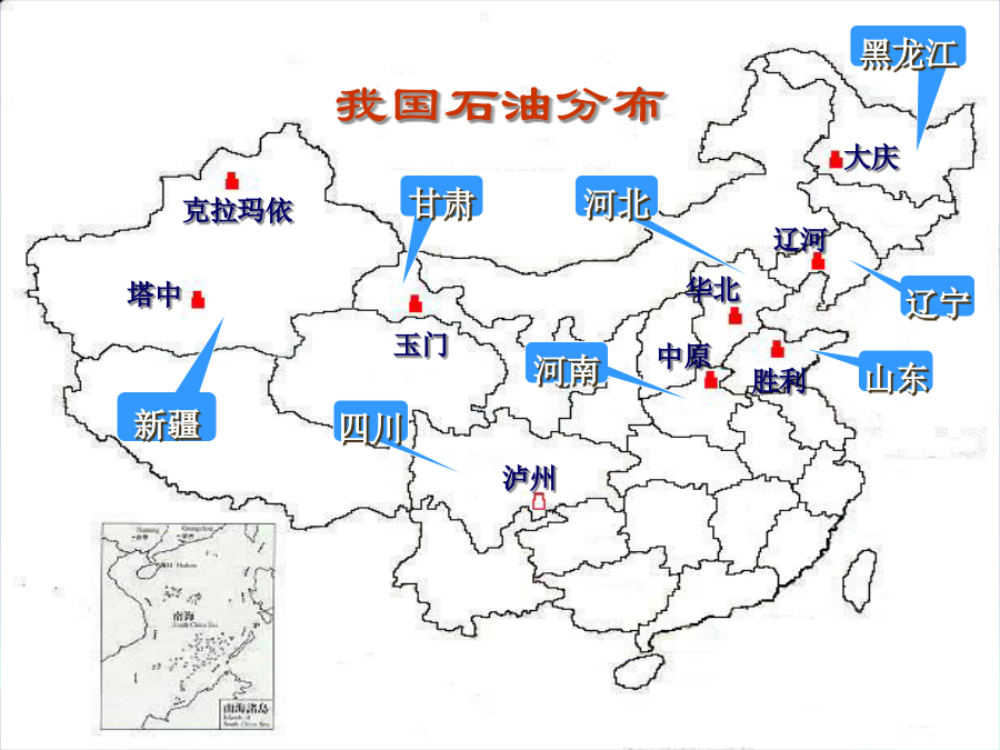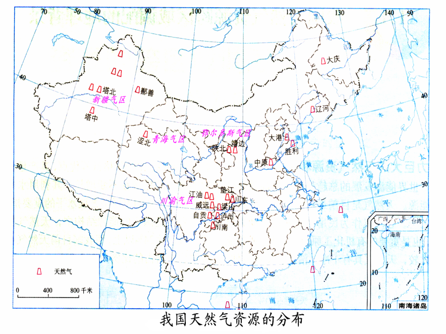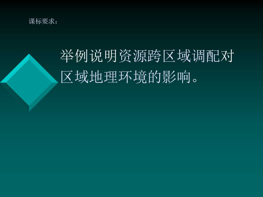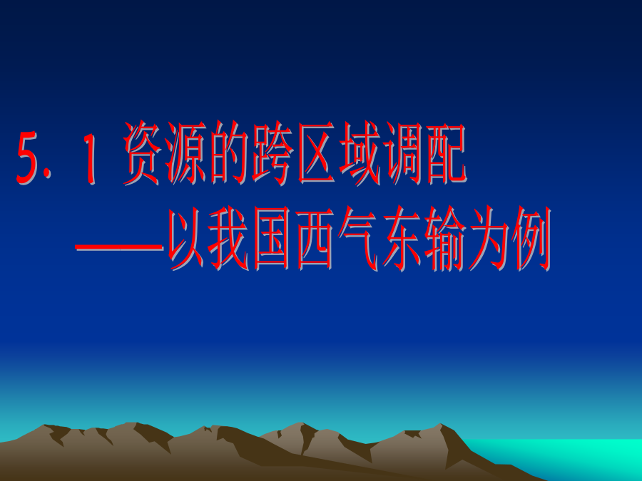 5.1资源的跨区域调配 ——以我国西气东输为例课标要求:鹤岗大庆归纳总结资源跨区域调配的必要性南水北调 西气东输 西电东送 北煤南运 (晋煤外运)掌握有关西气东输的基础知识:(读图回答) 一、西气东输的原因(读图分析)一、西气东输的原因(读图分析)一、西气东输的原因二、西气东输对区域发展的影响优化探究2、对东部地区发展的影响3、提高资源的利用效率,促进东、西部的协调发展 4、对环境的影响改善东部地区的大气质量
