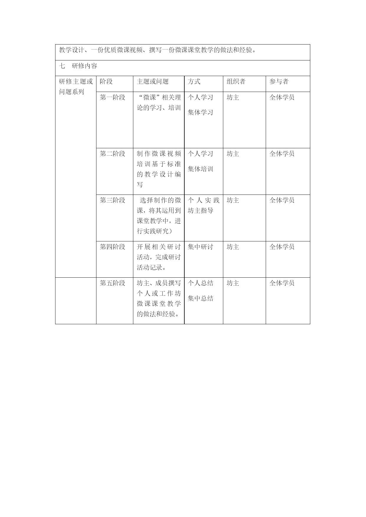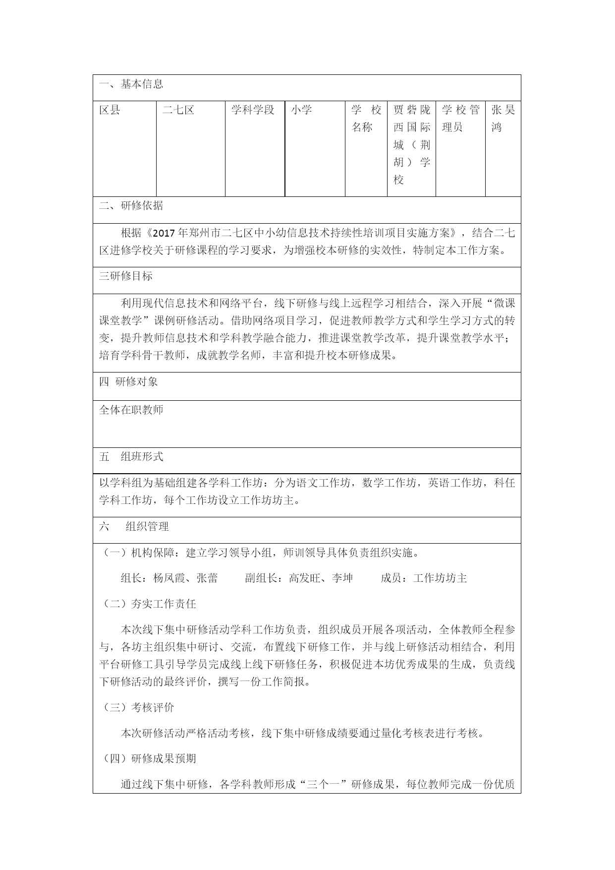 一、基本信息区县二七区学科学段小学学校名称贾砦陇西国际城(荆胡)学校学校管理员张昊鸿二、研修依据根据《2017年郑州市二七区中小幼信息技术持续性培训项目实施方案》,结合二七区进修学校关于研修课程的学习要求,为增强校本研修的实效性,特制定本工作方案。三研修目标利用现代信息技术和网络平台,线下研修与线上远程学习相结合,深入开展“微课课堂教学”课例研修活动。借助网络项目学习,促进教师教学方式和学生学习方式的转变,提升教师信息技术和学科教学融合能力,推进课堂教学改革,提升课堂教学水平;培育学科骨干教师,成就教学名师,丰富和提升校本研修成果。四研修对象全体在职教师五组班形式以学科组为基础组建各学科工作坊:分为语文工作坊,数学工作坊,英语工作坊,科任学科工作坊,每个工作坊设立工作坊坊主。六组织管理(一)机构保障:建立学习领导小组,师训领导具体负责组织实施。 组长:杨凤霞、张蕾副组长:高发旺、李坤成员:工作坊坊主 (二)夯实工作责任 本次线下集中研修活动学科工作坊负责,组织成员开展各项活动,全体教师全程参与,各坊主组织集中研讨、交流,布置线下研修工作,并与线上研修活动相结合,利用平台研修工具引导学员完成线上线下研修任务,积极促进本坊优秀成果的生成,负责线下研修活动的最终评价,撰写一份工作简报。 (三)考核评价 本次研修活动严格活动考核,线下集中研修成绩要通过量化考核表进行考核。 研修成果预期 通过线下集中研修,各学科教师形成“三个一”研修成果,每位教师完成一份优质教学设计、一份优质微课视频、撰写一份微课课堂教学的做法和经验。七研修内容研修主题或问题系列阶段主题或问题方式组织者参与者第一阶段“微课”相关理论的学习、培训 个人学习 集体学习坊主全体学员第二阶段制作微课视频培训基于标准的教学设计编写个人学习 集体培训坊主全体学员第三阶段选择制作的微课,将其运用到课堂教学中,进行实践研究)个人实践坊主指导坊主全体学员第四阶段开展相关研讨活动,完成研讨活动记录。集中研讨坊主全体学员第五阶段坊主、成员撰写个人或工作坊微课课堂教学的做法和经验。个人总结 集中总结坊主全体学员
