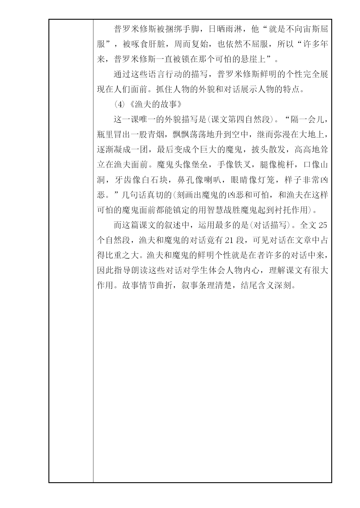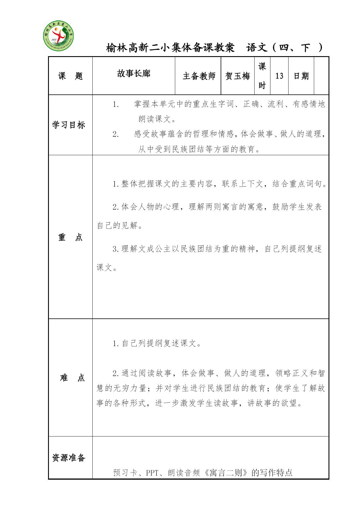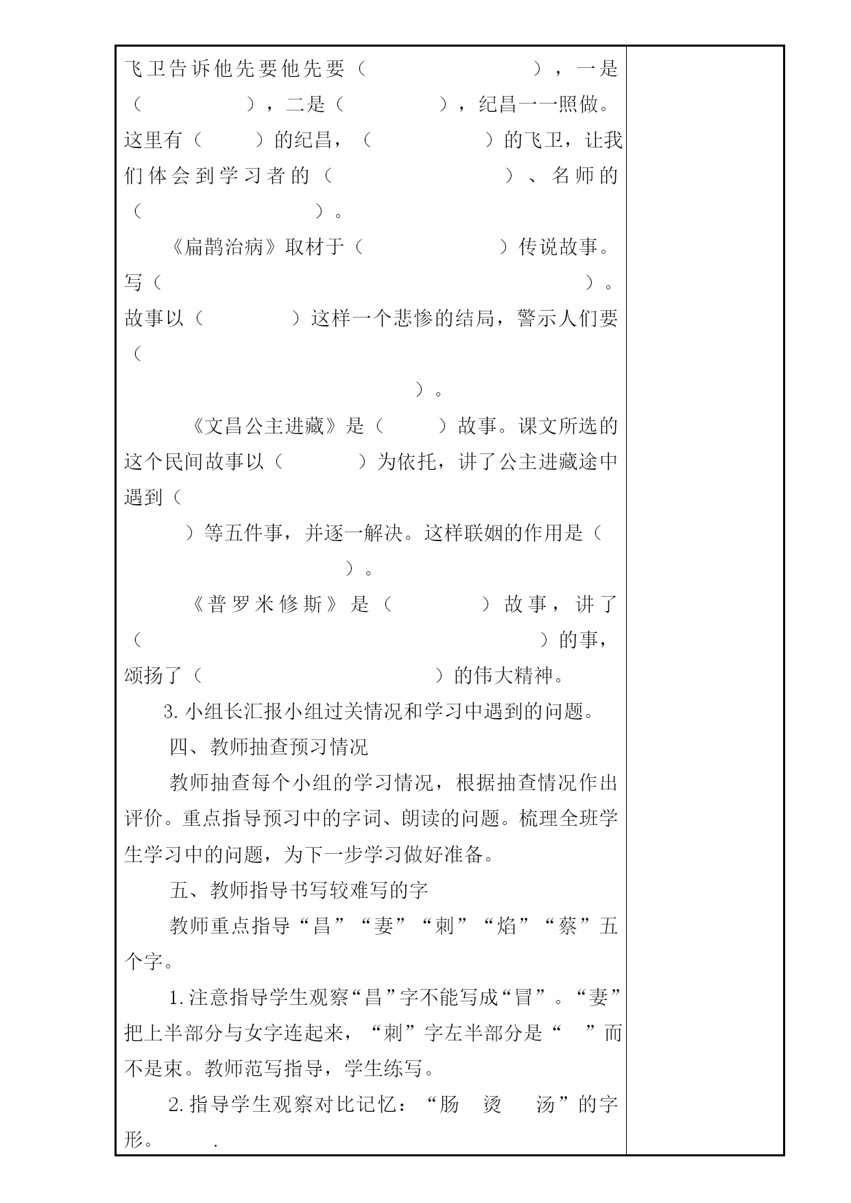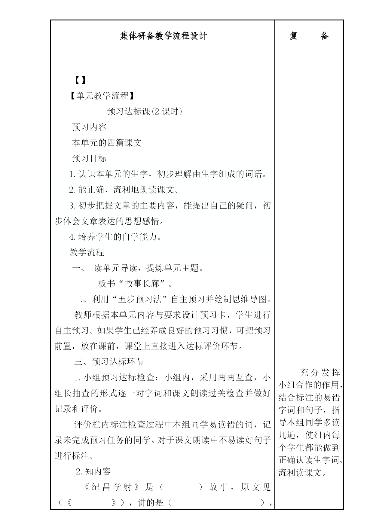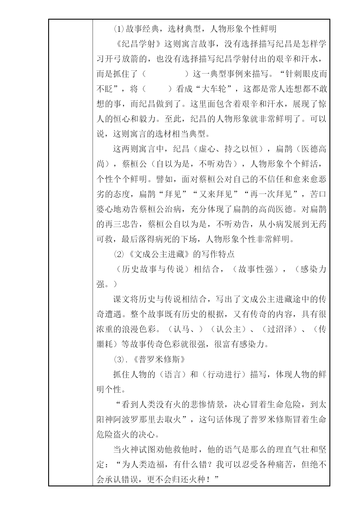 榆林高新二小集体备课教案语文(四、下) 课题 故事长廊 主备教师贺玉梅课时13日期学习目标掌握本单元中的重点生字词、正确、流利、有感情地朗读课文。 感受故事蕴含的哲理和情感,体会做事、做人的道理,从中受到民族团结等方面的教育。重点 1.整体把握课文的主要内容,联系上下文,结合重点词句。 2.体会人物的心理,理解两则寓言的寓意,鼓励学生发表自己的见解。 3.理解文成公主以民族团结为重的精神,自己列提纲复述课文。 难点 1.自己列提纲复述课文。 2.通过阅读故事,体会做事、做人的道理,领略正义和智慧的无穷力量;并对学生进行民族团结的教育;使学生了解故事的各种形式,进一步激发学生读故事,讲故事的欲望。 资源准备 预习卡、PPT、朗读音频《寓言二则》的写作特点 (1)故事经典,选材典型,人物形象个性鲜明 《纪昌学射》这则寓言故事,没有选择描写纪昌是怎样学习开弓放箭的,也没有选择描写纪昌学射付出的艰辛和汗水,而是抓住了()这一典型事例来描写。“针刺眼皮而不眨”,将()看成“大车轮”,这都是常人连想都不敢想的事,而纪昌做到了。这里面包含着艰辛和汗水,展现了惊人的恒心和毅力。至此,纪昌的人物形象就非常鲜明了。可以说,这则寓言的选材相当典型。 这两则寓言中,纪昌(虚心、持之以恒),扁鹊(医德高尚),蔡桓公(自以为是,不听劝告),人物形象个个鲜活,个性个个鲜明。譬如,面对蔡桓公对自己的不信任和愈来愈恶劣的态度,扁鹊“拜见”“又来拜见”“再一次拜见”,苦口婆心地劝告蔡桓公治病,充分体现了扁鹊的高尚医德。对扁鹊的再三忠告,蔡桓公自以为是,不听劝告,从小病发展到无药可救,最后落得病死的下场,人物形象个性非常鲜明。 (2)《文成公主进藏》的写作特点 (历史故事与传说)相结合,(故事性强),(感染力强。) 课文将历史与传说相结合,写出了文成公主进藏途中的传奇遭遇。整个故事既有历史的根据,又有传奇的内容,具有很浓重的浪漫色彩。(认马、)(认公主)、(过沼泽)、(传噩耗)等故事传奇色彩就很强,很富有感染力。 (3).《普罗米修斯》 抓住人物的(语言)和(行动进行)描写,体现人物的鲜明个性。 “看到人类没有火的悲惨情景,决心冒着生命危险,到太阳神阿波罗那里去取火”,这句话体现了普罗米修斯冒着生命危险盗火的决心。 当火神试图劝他救他时,他的语气是那么的理直气壮和坚定:“为人类造福,有什么错?我可以忍受各种痛苦,但绝不会承认错误,更不会归还火种!” 普罗米修斯被捆绑手脚,日晒雨淋,他“就是不向宙斯屈服”,被啄食肝脏,周而复始,也依然不屈服,所以“许多年来,普罗米修斯一直被锁在那个可怕的悬崖上”。 通过这些语言行动的描写,普罗米修斯鲜明的个性完全展现在人们面前。抓住人物的外貌和对话展示人物的特点。 (4)《渔夫的故事》 这一课唯一的外貌描写是(课文第四自然段)。“隔一会儿,瓶里冒出一股青烟,飘飘荡荡地升到空中,继而弥漫在大地上,逐渐凝成一团,最后变成个巨大的魔鬼,披头散发,高高地耸立在渔夫面前。魔鬼头像堡垒,手像铁叉,腿像桅杆,口像山洞,牙齿像白石块,鼻孔像喇叭,眼睛像灯笼,样子非常凶恶。”几句话真切的(刻画出魔鬼的凶恶和可怕,和渔夫在这样可怕的魔鬼面前都能镇定的用智慧战胜魔鬼起到衬托作用)。 而这篇课文的叙述中,运用最多的是(对话描写)。全文25个自然段,渔夫和魔鬼的对话竟有21段,可见对话在文章中占得比重之大。渔夫和魔鬼的鲜明个性就是在者许多的对话中来,因此指导朗读这些对话对学生体会人物内心,理解课文有很大作用。故事情节曲折,叙事条理清楚,结尾含义深刻。 集体研备教学流程设计复备 【】 【单元教学流程】 预习达标课(2课时) 预习内容 本单元的四篇课文 预习目标 1.认识本单元的生字,初步理解由生字组成的词语。 2.能正确、流利地朗读课文。 3.初步把握文章的主要内容,能提出自己的疑问,初步体会文章表达的思想感情。 4.培养学生的自学能力。 教学流程 读单元导读,提炼单元主题。 板书“故事长廊”。 二、利用“五步预习法”自主预习并绘制思维导图。 教师根据本单元内容与要求设计预习卡,学生进行自主预习。如果学生已经养成良好的预习习惯,可把预习前置,放在课前,课堂上直接进入达标评价环节。 三、预习达标环节 1.小组预习达标检查:小组内,采用两两互查,小组长抽查的形式逐一对字词和课文朗读过关检查并做好记录和评价。 评价栏内标注检查过程中本组同学易读错的词,记录未完成预习任务的同学。对于课文朗读中不易读好句子进行标注。 2.知内容 《纪昌学射》是()故事,原文见(《》),讲的是(),飞卫告诉他先要他先要(),一是(),二是(),纪昌一一照做。这里有()的纪昌,()的飞卫,让我们体会到学习者的()、名师的()。 《扁鹊治病》取材于()传说故事。写()。故事以