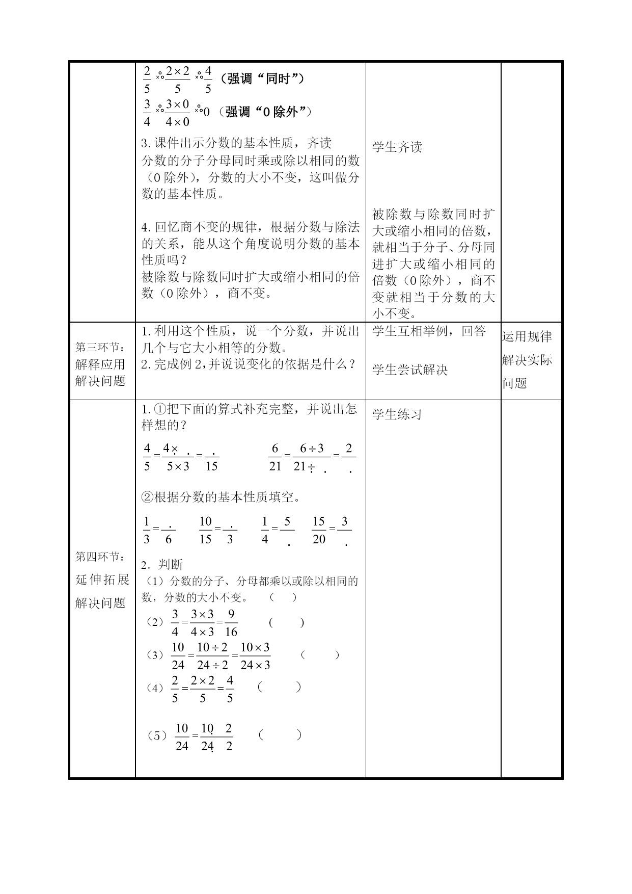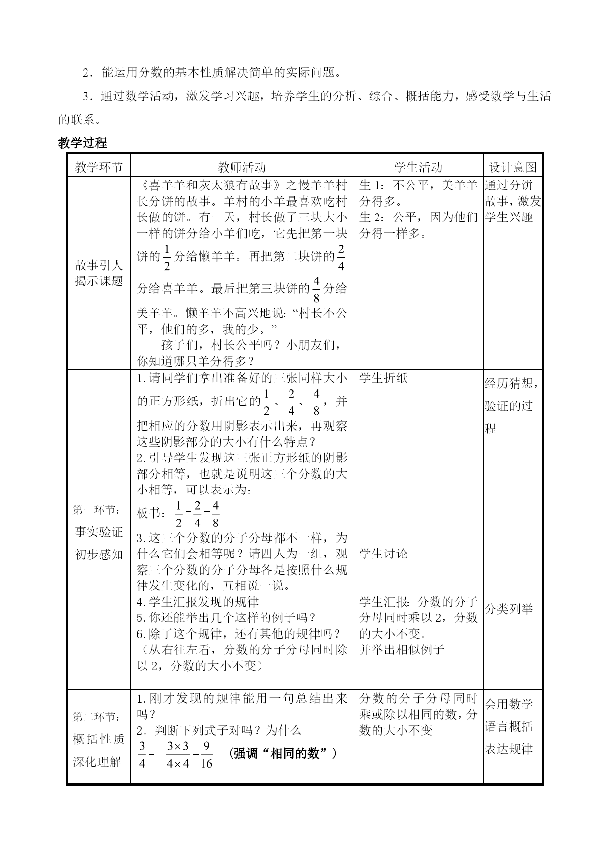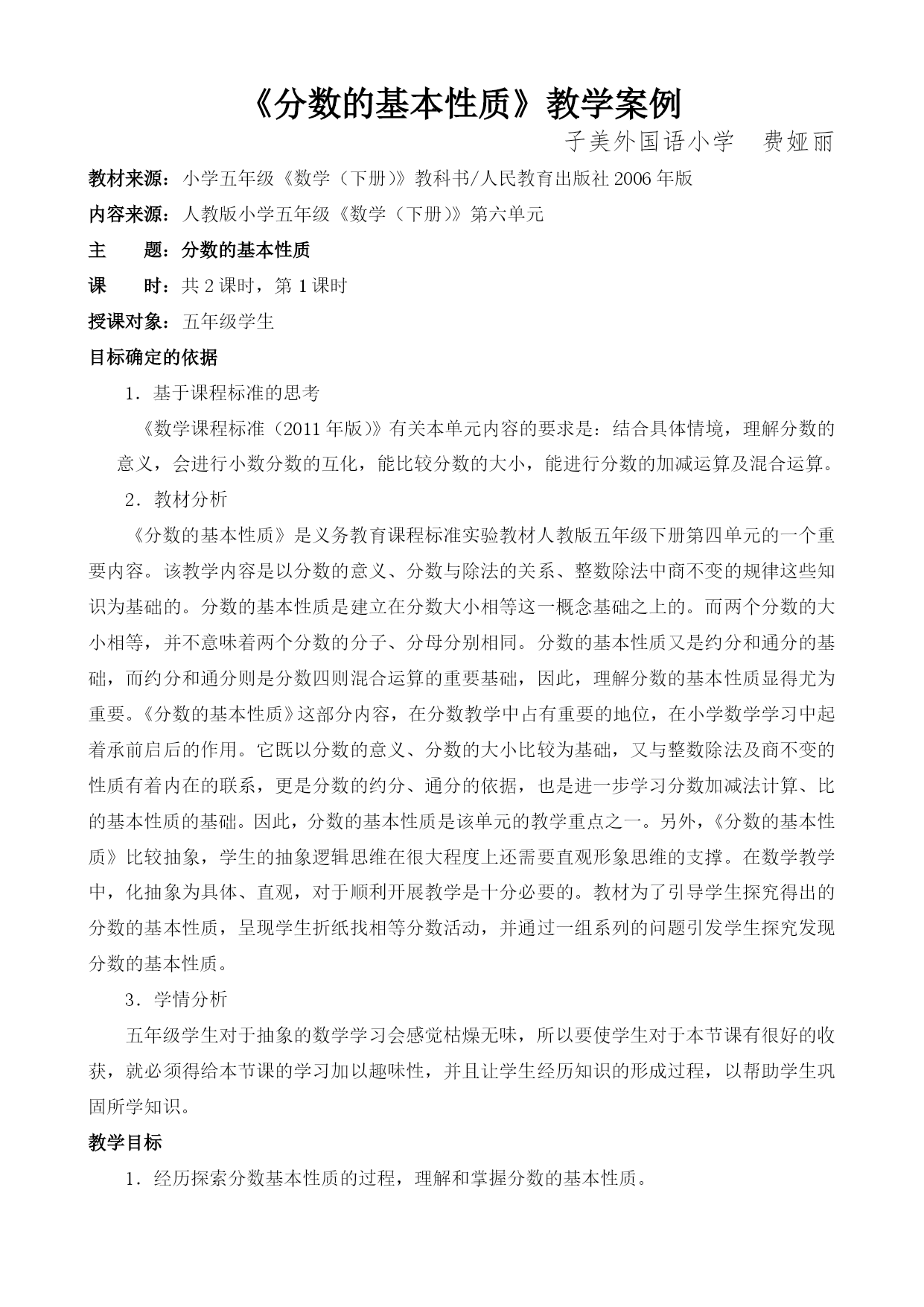 《分数的基本性质》教学案例 子美外国语小学费娅丽 教材来源:小学五年级《数学(下册)》教科书/人民教育出版社2006年版 内容来源:人教版小学五年级《数学(下册)》第六单元 主题:分数的基本性质 课时:共2课时,第1课时 授课对象:五年级学生 目标确定的依据 1.基于课程标准的思考 《数学课程标准(2011年版)》有关本单元内容的要求是:结合具体情境,理解分数的意义,会进行小数分数的互化,能比较分数的大小,能进行分数的加减运算及混合运算。 2.教材分析 《分数的基本性质》是义务教育课程标准实验教材人教版五年级下册第四单元的一个重要内容。该教学内容是以分数的意义、分数与除法的关系、整数除法中商不变的规律这些知识为基础的。分数的基本性质是建立在分数大小相等这一概念基础之上的。而两个分数的大小相等,并不意味着两个分数的分子、分母分别相同。分数的基本性质又是约分和通分的基础,而约分和通分则是分数四则混合运算的重要基础,因此,理解分数的基本性质显得尤为重要。《分数的基本性质》这部分内容,在分数教学中占有重要的地位,在小学数学学习中起着承前启后的作用。它既以分数的意义、分数的大小比较为基础,又与整数除法及商不变的性质有着内在的联系,更是分数的约分、通分的依据,也是进一步学习分数加减法计算、比的基本性质的基础。因此,分数的基本性质是该单元的教学重点之一。另外,《分数的基本性质》比较抽象,学生的抽象逻辑思维在很大程度上还需要直观形象思维的支撑。在数学教学中,化抽象为具体、直观,对于顺利开展教学是十分必要的。教材为了引导学生探究得出的分数的基本性质,呈现学生折纸找相等分数活动,并通过一组系列的问题引发学生探究发现分数的基本性质。 3.学情分析 五年级学生对于抽象的数学学习会感觉枯燥无味,所以要使学生对于本节课有很好的收获,就必须得给本节课的学习加以趣味性,并且让学生经历知识的形成过程,以帮助学生巩固所学知识。 教学目标 1.经历探索分数基本性质的过程,理解和掌握分数的基本性质。 2.能运用分数的基本性质解决简单的实际问题。 3.通过数学活动,激发学习兴趣,培养学生的分析、综合、概括能力,感受数学与生活的联系。 教学过程 教学环节教师活动学生活动设计意图故事引人揭示课题《喜羊羊和灰太狼有故事》之慢羊羊村长分饼的故事。羊村的小羊最喜欢吃村长做的饼。有一天,村长做了三块大小一样的饼分给小羊们吃,它先把第一块饼的分给懒羊羊。再把第二块饼的分给喜羊羊。最后把第三块饼的分给美羊羊。懒羊羊不高兴地说:“村长不公平,他们的多,我的少。” 孩子们,村长公平吗?小朋友们,你知道哪只羊分得多?生1:不公平,美羊羊分得多。 生2:公平,因为他们分得一样多。通过分饼故事,激发学生兴趣第一环节: 事实验证初步感知1.请同学们拿出准备好的三张同样大小的正方形纸,折出它的、、,并把相应的分数用阴影表示出来,再观察这些阴影部分的大小有什么特点? 2.引导学生发现这三张正方形纸的阴影部分相等,也就是说明这三个分数的大小相等,可以表示为: 板书:== 3.这三个分数的分子分母都不一样,为什么它们会相等呢?请四人为一组,观察三个分数的分子分母各是按照什么规律发生变化的,互相说一说。 4.学生汇报发现的规律 5.你还能举出几个这样的例子吗? 6.除了这个规律,还有其他的规律吗? (从右往左看,分数的分子分母同时除以2,分数的大小不变) 学生折纸 学生讨论 学生汇报:分数的分子分母同时乘以2,分数的大小不变。 并举出相似例子 经历猜想,验证的过程 分类列举第二环节: 概括性质深化理解1.刚才发现的规律能用一句总结出来吗? 2.判断下列式子对吗?为什么 ==(强调“相同的数”) (强调“同时”) (强调“0除外”) 3.课件出示分数的基本性质,齐读 分数的分子分母同时乘或除以相同的数(0除外),分数的大小不变,这叫做分数的基本性质。 4.回忆商不变的规律,根据分数与除法的关系,能从这个角度说明分数的基本性质吗? 被除数与除数同时扩大或缩小相同的倍数(0除外),商不变。分数的分子分母同时乘或除以相同的数,分数的大小不变 学生齐读 被除数与除数同时扩大或缩小相同的倍数,就相当于分子、分母同进扩大或缩小相同的倍数(0除外),商不变就相当于分数的大小不变。会用数学语言概括表达规律 第三环节: 解释应用 解决问题1.利用这个性质,说一个分数,并说出几个与它大小相等的分数。 2.完成例2,并说说变化的依据是什么?学生互相举例,回答 学生尝试解决运用规律解决实际问题第四环节: 延伸拓展解决问题 1.①把下面的算式补充完整,并说出怎样想的? ==== ②根据分数的基本性质填空。 ==== 2.判断 (1)分数的分子、分母都乘以或除以