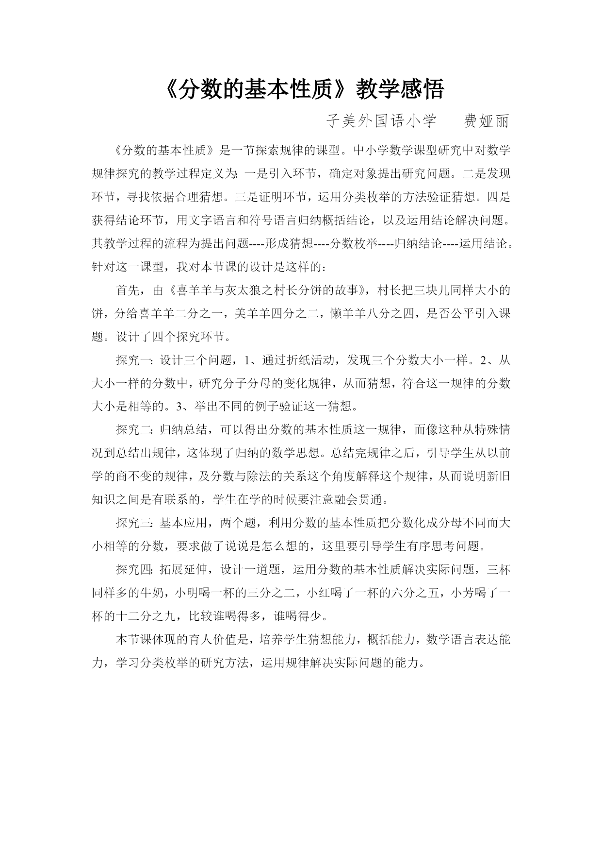 《分数的基本性质》教学感悟 子美外国语小学费娅丽 《分数的基本性质》是一节探索规律的课型。中小学数学课型研究中对数学规律探究的教学过程定义为:一是引入环节,确定对象提出研究问题。二是发现环节,寻找依据合理猜想。三是证明环节,运用分类枚举的方法验证猜想。四是获得结论环节,用文字语言和符号语言归纳概括结论,以及运用结论解决问题。其教学过程的流程为提出问题----形成猜想----分数枚举----归纳结论----运用结论。针对这一课型,我对本节课的设计是这样的: 首先,由《喜羊羊与灰太狼之村长分饼的故事》,村长把三块儿同样大小的饼,分给喜羊羊二分之一,美羊羊四分之二,懒羊羊八分之四,是否公平引入课题。设计了四个探究环节。 探究一:设计三个问题,1、通过折纸活动,发现三个分数大小一样。2、从大小一样的分数中,研究分子分母的变化规律,从而猜想,符合这一规律的分数大小是相等的。3、举出不同的例子验证这一猜想。 探究二:归纳总结,可以得出分数的基本性质这一规律,而像这种从特殊情况到总结出规律,这体现了归纳的数学思想。总结完规律之后,引导学生从以前学的商不变的规律,及分数与除法的关系这个角度解释这个规律,从而说明新旧知识之间是有联系的,学生在学的时候要注意融会贯通。 探究三:基本应用,两个题,利用分数的基本性质把分数化成分母不同而大小相等的分数,要求做了说说是怎么想的,这里要引导学生有序思考问题。 探究四:拓展延伸,设计一道题,运用分数的基本性质解决实际问题,三杯同样多的牛奶,小明喝一杯的三分之二,小红喝了一杯的六分之五,小芳喝了一杯的十二分之九,比较谁喝得多,谁喝得少。 本节课体现的育人价值是,培养学生猜想能力,概括能力,数学语言表达能力,学习分类枚举的研究方法,运用规律解决实际问题的能力。
