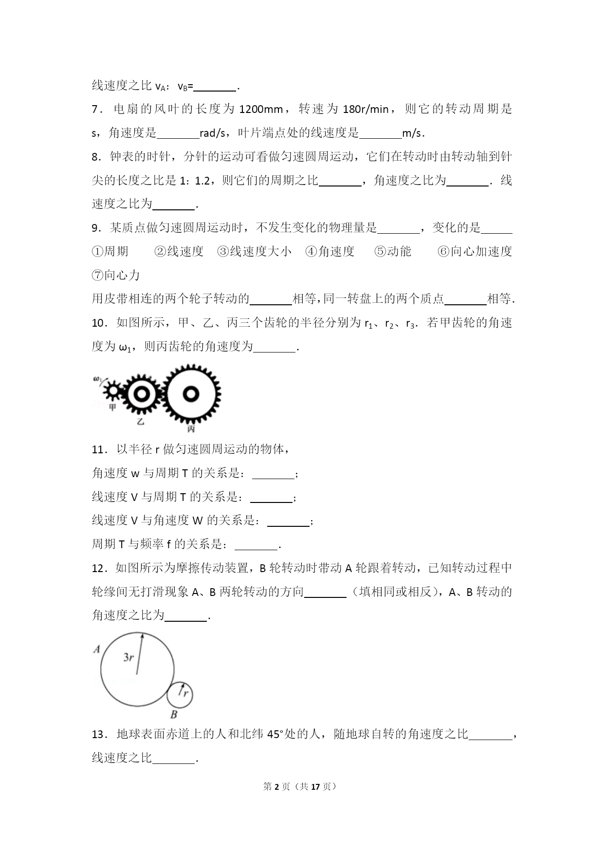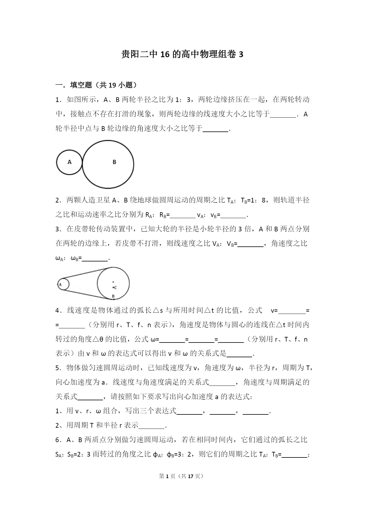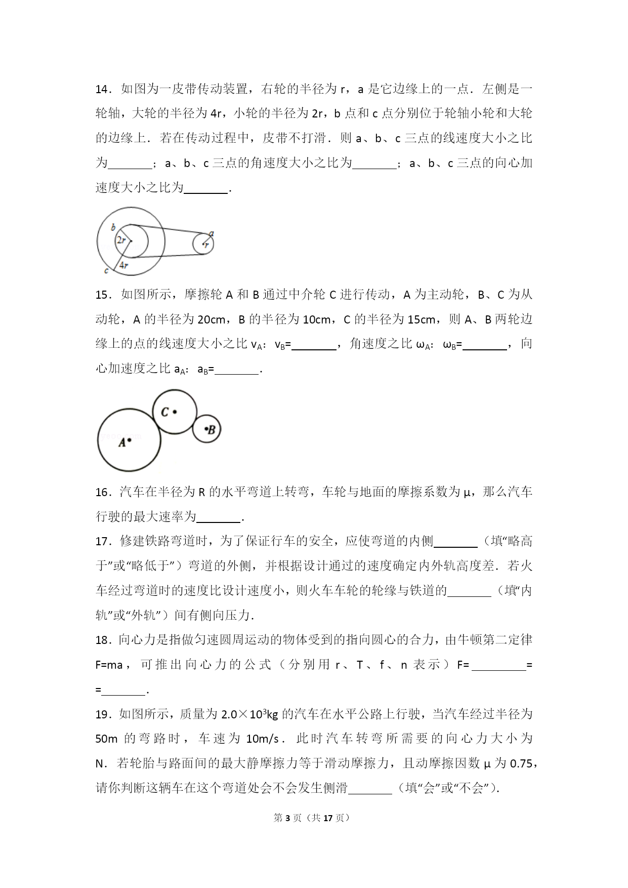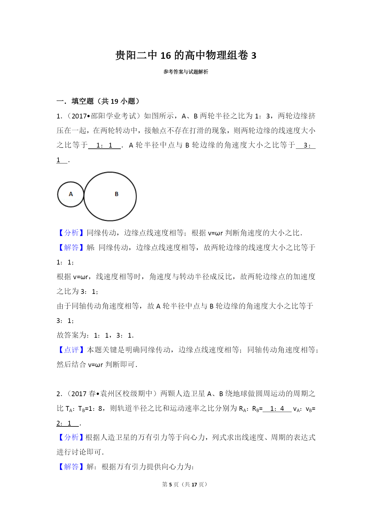 第页(共NUMPAGES17页) 贵阳二中16的高中物理组卷3 一.填空题(共19小题) 1.如图所示,A、B两轮半径之比为1:3,两轮边缘挤压在一起,在两轮转动中,接触点不存在打滑的现象,则两轮边缘的线速度大小之比等于.A轮半径中点与B轮边缘的角速度大小之比等于. 2.两颗人造卫星A、B绕地球做圆周运动的周期之比TA:TB=1:8,则轨道半径之比和运动速率之比分别为RA:RB=vA:vB=. 3.在皮带轮传动装置中,已知大轮的半径是小轮半径的3倍,A和B两点分别在两轮的边缘上,若皮带不打滑,则线速度之比VA:VB=,角速度之比ωA:ωB=. 4.线速度是物体通过的弧长△s与所用时间△t的比值,公式v===(分别用r、T、f、n表示),角速度是物体与圆心的连线在△t时间内转过的角度△θ的比值,公式ω===(分别用r、T、f、n表示)由v和ω的表达式可以得出v和ω的关系式是. 5.物体做匀速圆周运动时,已知线速度为v,角速度为ω,半径为r,周期为T,向心加速度为a.线速度与角速度满足的关系式,角速度与周期满足的关系式,请按照如下要求写出向心加速度a的表达式: 1、用v、r、ω组合,写出三个表达式,,. 2、用周期T和半径r表示. 6.A、B两质点分别做匀速圆周运动,若在相同时间内,它们通过的弧长之比SA:SB=2:3而转过的角度之比φA:φB=3:2,则它们的周期之比TA:TB=;线速度之比vA:vB=. 7.电扇的风叶的长度为1200mm,转速为180r/min,则它的转动周期是s,角速度是rad/s,叶片端点处的线速度是m/s. 8.钟表的时针,分针的运动可看做匀速圆周运动,它们在转动时由转动轴到针尖的长度之比是1:1.2,则它们的周期之比,角速度之比为.线速度之比为. 9.某质点做匀速圆周运动时,不发生变化的物理量是,变化的是 ①周期②线速度③线速度大小④角速度⑤动能⑥向心加速度⑦向心力 用皮带相连的两个轮子转动的相等,同一转盘上的两个质点相等. 10.如图所示,甲、乙、丙三个齿轮的半径分别为r1、r2、r3.若甲齿轮的角速度为ω1,则丙齿轮的角速度为. 11.以半径r做匀速圆周运动的物体, 角速度w与周期T的关系是:; 线速度V与周期T的关系是:; 线速度V与角速度W的关系是:; 周期T与频率f的关系是:. 12.如图所示为摩擦传动装置,B轮转动时带动A轮跟着转动,已知转动过程中轮缘间无打滑现象A、B两轮转动的方向(填相同或相反),A、B转动的角速度之比为. 13.地球表面赤道上的人和北纬45°处的人,随地球自转的角速度之比,线速度之比. 14.如图为一皮带传动装置,右轮的半径为r,a是它边缘上的一点.左侧是一轮轴,大轮的半径为4r,小轮的半径为2r,b点和c点分别位于轮轴小轮和大轮的边缘上.若在传动过程中,皮带不打滑.则a、b、c三点的线速度大小之比为;a、b、c三点的角速度大小之比为;a、b、c三点的向心加速度大小之比为. 15.如图所示,摩擦轮A和B通过中介轮C进行传动,A为主动轮,B、C为从动轮,A的半径为20cm,B的半径为10cm,C的半径为15cm,则A、B两轮边缘上的点的线速度大小之比vA:vB=,角速度之比ωA:ωB=,向心加速度之比aA:aB=. 16.汽车在半径为R的水平弯道上转弯,车轮与地面的摩擦系数为μ,那么汽车行驶的最大速率为. 17.修建铁路弯道时,为了保证行车的安全,应使弯道的内侧(填“略高于”或“略低于”)弯道的外侧,并根据设计通过的速度确定内外轨高度差.若火车经过弯道时的速度比设计速度小,则火车车轮的轮缘与铁道的(填“内轨”或“外轨”)间有侧向压力. 18.向心力是指做匀速圆周运动的物体受到的指向圆心的合力,由牛顿第二定律F=ma,可推出向心力的公式(分别用r、T、f、n表示)F===. 19.如图所示,质量为2.0×103kg的汽车在水平公路上行驶,当汽车经过半径为50m的弯路时,车速为10m/s.此时汽车转弯所需要的向心力大小为N.若轮胎与路面间的最大静摩擦力等于滑动摩擦力,且动摩擦因数μ为0.75,请你判断这辆车在这个弯道处会不会发生侧滑(填“会”或“不会”). 贵阳二中16的高中物理组卷3 参考答案与试题解析 一.填空题(共19小题) 1.(2017•邵阳学业考试)如图所示,A、B两轮半径之比为1:3,两轮边缘挤压在一起,在两轮转动中,接触点不存在打滑的现象,则两轮边缘的线速度大小之比等于1:1.A轮半径中点与B轮边缘的角速度大小之比等于3:1. 【分析】同缘传动,边缘点线速度相等;根据v=ωr判断角速度的大小之比. 【解答】解:同缘传动,边缘点线速度相等,故两轮边缘的线速度大小之比等于1:1; 根据v=ωr,线速度相等时,角速度与转动