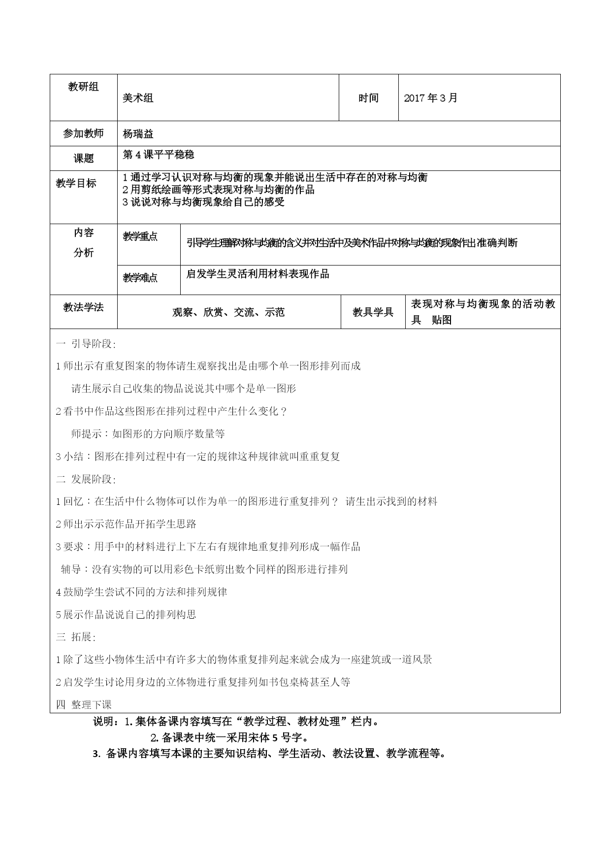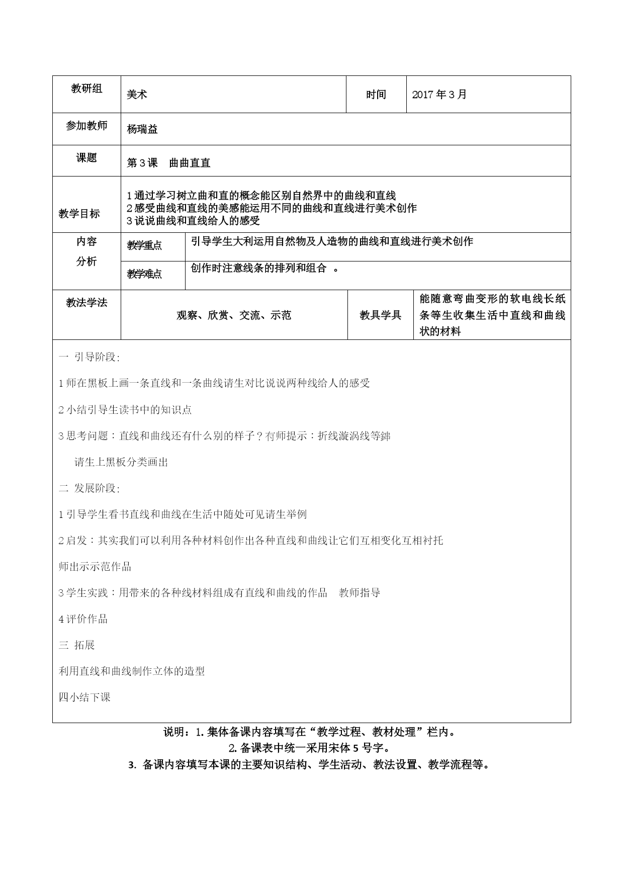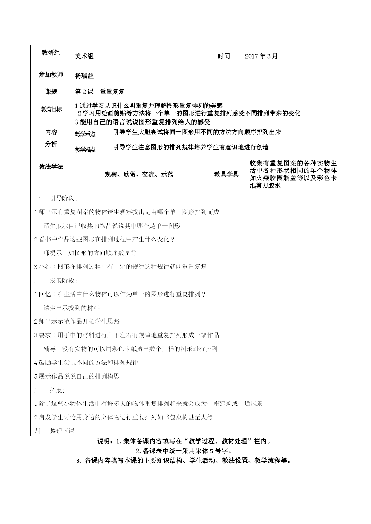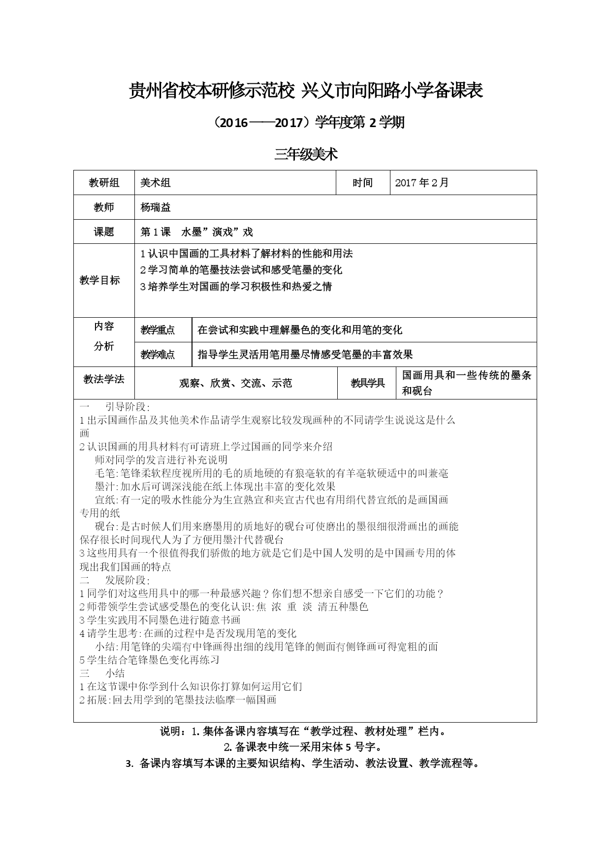 贵州省校本研修示范校兴义市向阳路小学备课表 (2016——2017)学年度第2学期 三年级美术 教研组美术组时间2017年2月教师杨瑞益课题第1课水墨”演戏”戏 教学目标1认识中国画的工具材料了解材料的性能和用法 2学习简单的笔墨技法尝试和感受笔墨的变化 3培养学生对国画的学习积极性和热爱之情 内容 分析教学重点在尝试和实践中理解墨色的变化和用笔的变化教学难点指导学生灵活用笔用墨尽情感受笔墨的丰富效果教法学法观察、欣赏、交流、示范教具学具国画用具和一些传统的墨条和砚台一引导阶段: 1出示国画作品及其他美术作品请学生观察比较发现画种的不同请学生说说这是什么 画 2认识国画的用具材料可请班上学过国画的同学来介绍 师对同学的发言进行补充说明 毛笔:笔锋柔软程度视所用的毛的质地硬的有狼毫软的有羊毫软硬适中的叫兼毫 墨汁:加水后可调深浅能在纸上体现出丰富的变化效果 宣纸:有一定的吸水性能分为生宣熟宣和夹宣古代也有用绢代替宣纸的是画国画 专用的纸 砚台:是古时候人们用来磨墨用的质地好的砚台可使磨出的墨很细很滑画出的画能 保存很长时间现代人为了方便用墨汁代替砚台 3这些用具有一个很值得我们骄傲的地方就是它们是中国人发明的是中国画专用的体 现出我们国画的特点 二发展阶段: 1同学们对这些用具中的哪一种最感兴趣?你们想不想亲自感受一下它们的功能? 2师带领学生尝试感受墨色的变化认识:焦浓重淡清五种墨色 3学生实践用不同墨色进行随意书画 4请学生思考:在画的过程中是否发现用笔的变化 小结:用笔锋的尖端中锋画得出细的线用笔锋的侧面侧锋画可得宽粗的面 5学生结合笔锋墨色变化再练习 三小结 1在这节课中你学到什么知识你打算如何运用它们 2拓展:回去用学到的笔墨技法临摩一幅国画 说明:1.集体备课内容填写在“教学过程、教材处理”栏内。 2.备课表中统一采用宋体5号字。 3.备课内容填写本课的主要知识结构、学生活动、教法设置、教学流程等。 教研组美术组时间2017年3月参加教师杨瑞益课题第2课重重复复教育目标1通过学习认识什么叫重复并理解图形重复排列的美感 2学习用绘画剪贴等方法将一个单一的图形进行重复排列感受不同排列带来的变化 3能用自己的语言说说图形重复排列给人的感受内容 分析教学重点引导学生大胆尝试将同一图形用不同的方法方向顺序排列出来教学难点引导学生注意图形的排列规律培养学生有意识地进行创造教法学法观察、欣赏、交流、示范教具学具收集有重复图案的各种实物生活中各种形状相同的单个物体如火柴胶圈瓶盖等以及彩色卡纸剪刀胶水一引导阶段: 1师出示有重复图案的物体请生观察找出是由哪个单一图形排列而成 请生展示自己收集的物品说说其中哪个是单一图形 2看书中作品这些图形在排列过程中产生什么变化? 师提示:如图形的方向顺序数量等 3小结:图形在排列过程中有一定的规律这种规律就叫重重复复 二发展阶段: 1回忆:在生活中什么物体可以作为单一的图形进行重复排列? 请生出示找到的材料 2师出示示范作品开拓学生思路 3要求:用手中的材料进行上下左右有规律地重复排列形成一幅作品 辅导:没有实物的可以用彩色卡纸剪出数个同样的图形进行排列 4鼓励学生尝试不同的方法和排列规律 5展示作品说说自己的排列构思 三拓展: 1除了这些小物体生活中有许多大的物体重复排列起来就会成为一座建筑或一道风景 2启发学生讨论用身边的立体物进行重复排列如书包桌椅甚至人等 四整理下课说明:1.集体备课内容填写在“教学过程、教材处理”栏内。 2.备课表中统一采用宋体5号字。 3.备课内容填写本课的主要知识结构、学生活动、教法设置、教学流程等。 教研组美术时间2017年3月参加教师杨瑞益课题第3课曲曲直直 教学目标 1通过学习树立曲和直的概念能区别自然界中的曲线和直线 2感受曲线和直线的美感能运用不同的曲线和直线进行美术创作 3说说曲线和直线给人的感受内容 分析教学重点引导学生大利运用自然物及人造物的曲线和直线进行美术创作教学难点创作时注意线条的排列和组合。教法学法观察、欣赏、交流、示范教具学具能随意弯曲变形的软电线长纸条等生收集生活中直线和曲线状的材料一引导阶段: 1师在黑板上画一条直线和一条曲线请生对比说说两种线给人的感受 2小结引导生读书中的知识点 3思考问题:直线和曲线还有什么别的样子?师提示:折线漩涡线等 请生上黑板分类画出 二发展阶段: 1引导学生看书直线和曲线在生活中随处可见请生举例 2启发:其实我们可以利用各种材料创作出各种直线和曲线让它们互相变化互相衬托 师出示示范作品 3学生实践:用带来的各种线材料组成有直线和曲线的作品教师指导 4评价作品 三拓展 利用直线和曲线制作立体的造型 四小结下课 说明:1.集体备课内容填写在“教学过程、教材处理”栏内。 2.备课表中统一采用宋体5号字。