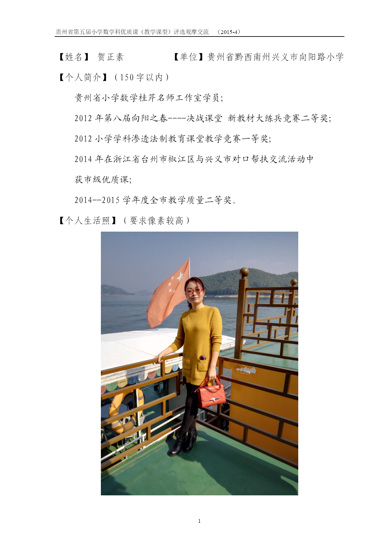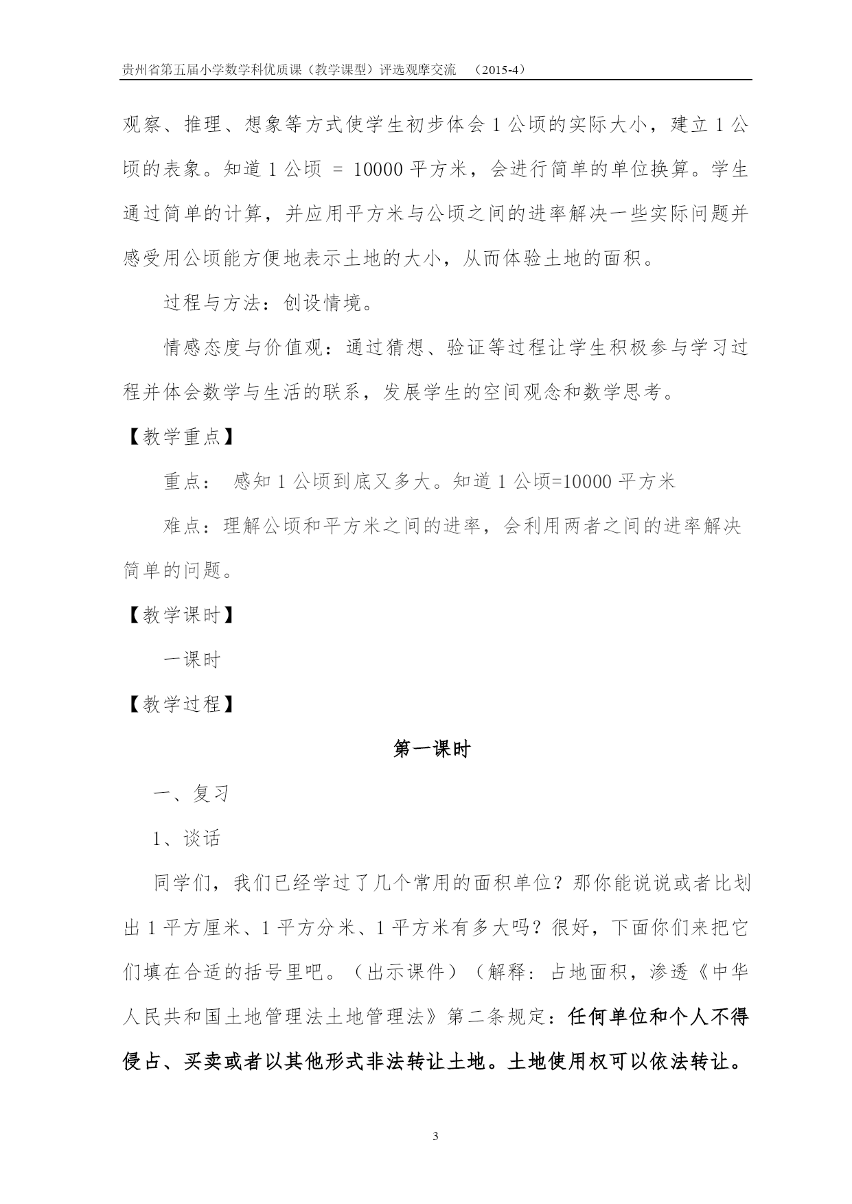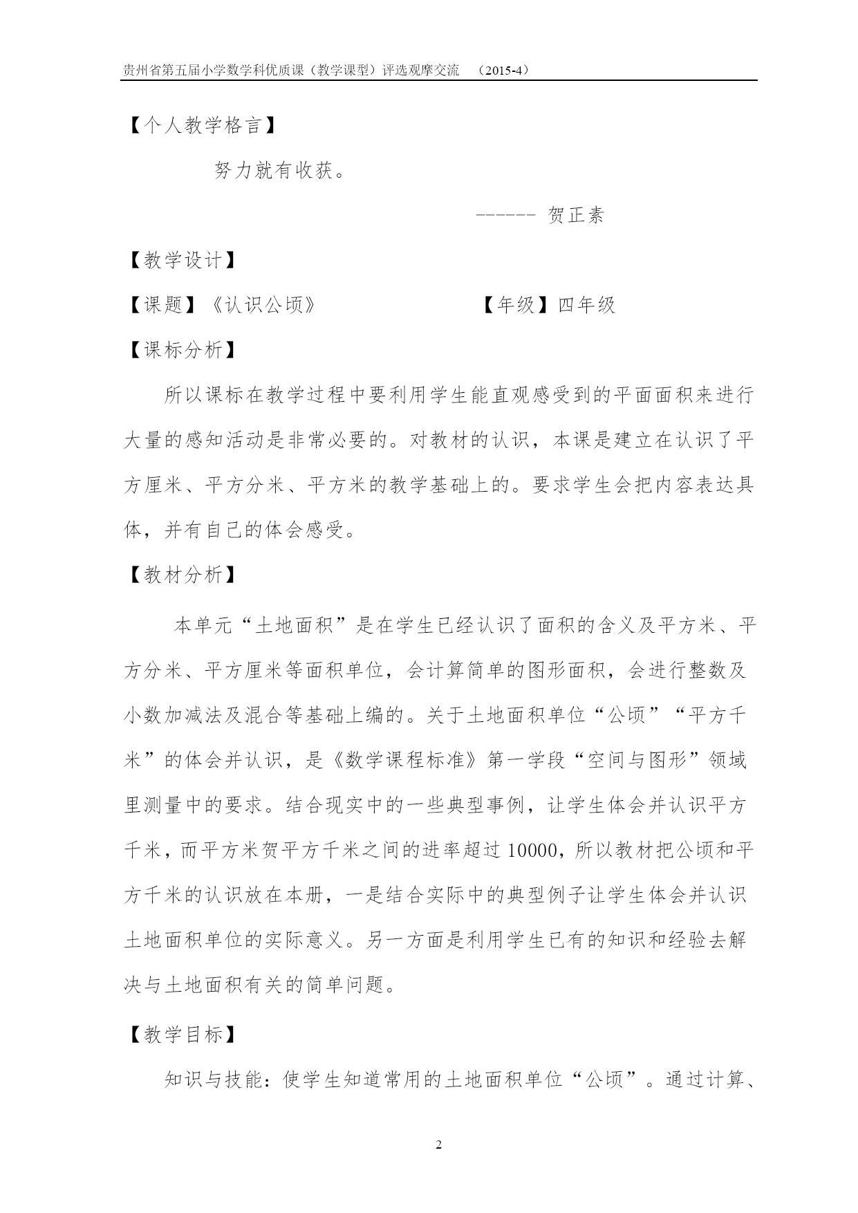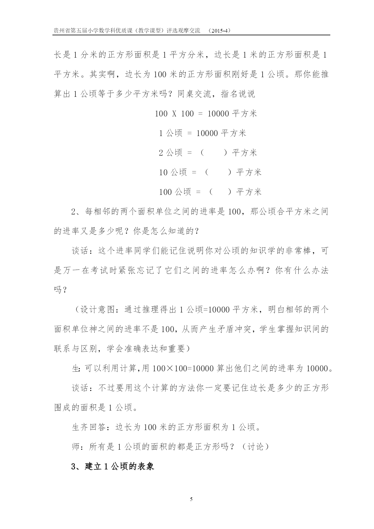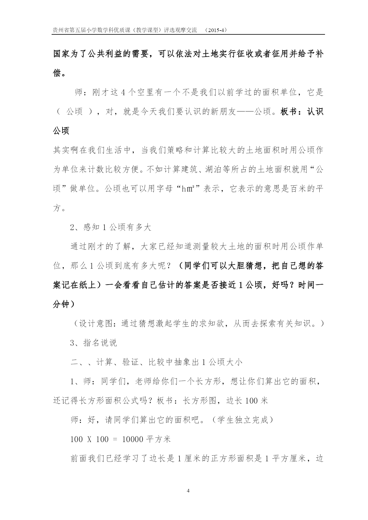 贵州省第五届小学数学科优质课(教学课型)评选观摩交流(2015-4) 【姓名】贺正素【单位】贵州省黔西南州兴义市向阳路小学 【个人简介】(150字以内) 贵州省小学数学桂芹名师工作室学员; 2012年第八届向阳之春----决战课堂新教材大练兵竞赛二等奖; 2012小学学科渗透法制教育课堂教学竞赛一等奖; 2014年在浙江省台州市椒江区与兴义市对口帮扶交流活动中 获市级优质课; 2014--2015学年度全市教学质量二等奖。 【个人生活照】(要求像素较高) 【个人教学格言】 努力就有收获。 ------贺正素 【教学设计】 【课题】《认识公顷》【年级】四年级 【课标分析】 所以课标在教学过程中要利用学生能直观感受到的平面面积来进行大量的感知活动是非常必要的。对教材的认识,本课是建立在认识了平方厘米、平方分米、平方米的教学基础上的。要求学生会把内容表达具体,并有自己的体会感受。 【教材分析】 本单元“土地面积”是在学生已经认识了面积的含义及平方米、平方分米、平方厘米等面积单位,会计算简单的图形面积,会进行整数及小数加减法及混合等基础上编的。关于土地面积单位“公顷”“平方千米”的体会并认识,是《数学课程标准》第一学段“空间与图形”领域里测量中的要求。结合现实中的一些典型事例,让学生体会并认识平方千米,而平方米贺平方千米之间的进率超过10000,所以教材把公顷和平方千米的认识放在本册,一是结合实际中的典型例子让学生体会并认识土地面积单位的实际意义。另一方面是利用学生已有的知识和经验去解决与土地面积有关的简单问题。 【教学目标】 知识与技能:使学生知道常用的土地面积单位“公顷”。通过计算、观察、推理、想象等方式使学生初步体会1公顷的实际大小,建立1公顷的表象。知道1公顷=10000平方米,会进行简单的单位换算。学生通过简单的计算,并应用平方米与公顷之间的进率解决一些实际问题并感受用公顷能方便地表示土地的大小,从而体验土地的面积。 过程与方法:创设情境。 情感态度与价值观:通过猜想、验证等过程让学生积极参与学习过程并体会数学与生活的联系,发展学生的空间观念和数学思考。 【教学重点】 重点:感知1公顷到底又多大。知道1公顷=10000平方米 难点:理解公顷和平方米之间的进率,会利用两者之间的进率解决简单的问题。 【教学课时】 一课时 【教学过程】 第一课时 一、复习 1、谈话 同学们,我们已经学过了几个常用的面积单位?那你能说说或者比划出1平方厘米、1平方分米、1平方米有多大吗?很好,下面你们来把它们填在合适的括号里吧。(出示课件)(解释:占地面积,渗透《中华人民共和国土地管理法土地管理法》第二条规定:任何单位和个人不得侵占、买卖或者以其他形式非法转让土地。土地使用权可以依法转让。国家为了公共利益的需要,可以依法对土地实行征收或者征用并给予补偿。 师:刚才这4个空里有一个不是我们以前学过的面积单位,它是(公顷),对,就是今天我们要认识的新朋友——公顷。板书:认识公顷 其实啊在我们生活中,当我们策略和计算比较大的土地面积时用公顷作为单位来计数比较方便。不如计算建筑、湖泊等所占的土地面积就用“公顷”做单位。公顷也可以用字母“h㎡”表示,它表示的意思是百米的平方。 2、感知1公顷有多大 通过刚才的了解,大家已经知道测量较大土地的面积时用公顷作单位,那么1公顷到底有多大呢?(同学们可以大胆猜想,把自己想的答案记在纸上)一会看看自己估计的答案是否接近1公顷,好吗?时间一分钟) (设计意图:通过猜想激起学生的求知欲,从而去探索有关知识。) 3、指名说说 二、、计算、验证、比较中抽象出1公顷大小 1、师:同学们,老师给你们一个长方形,想让你们算出它的面积,还记得长方形面积公式吗?板书:长方形图,边长100米 师:好,请同学们算出它的面积吧。(学生独立完成) 100X100=10000平方米 前面我们已经学习了边长是1厘米的正方形面积是1平方厘米,边长是1分米的正方形面积是1平方分米,边长是1米的正方形面积是1平方米。其实啊,边长为100米的正方形面积刚好是1公顷。那你能推算出1公顷等于多少平方米吗?同桌交流,指名说说 100X100=10000平方米 1公顷=10000平方米 2公顷=()平方米 10公顷=()平方米 100公顷=()平方米 2、每相邻的两个面积单位之间的进率是100,那公顷合平方米之间的进率又是多少呢?你是怎么知道的? 谈话:这个进率同学们能记住说明你对公顷的知识学的非常棒,可是万一在考试时紧张忘记了它们之间的进率怎么办啊?你有什么办法吗? (设计意图:通过推理得出1公顷=10000平方米,明白相邻的两个面积单位神之间的进率不是100,从而产生矛盾冲突,学生掌握知识间的联系与区别,学会准确表达和重要) 生:可以利用计算,用10