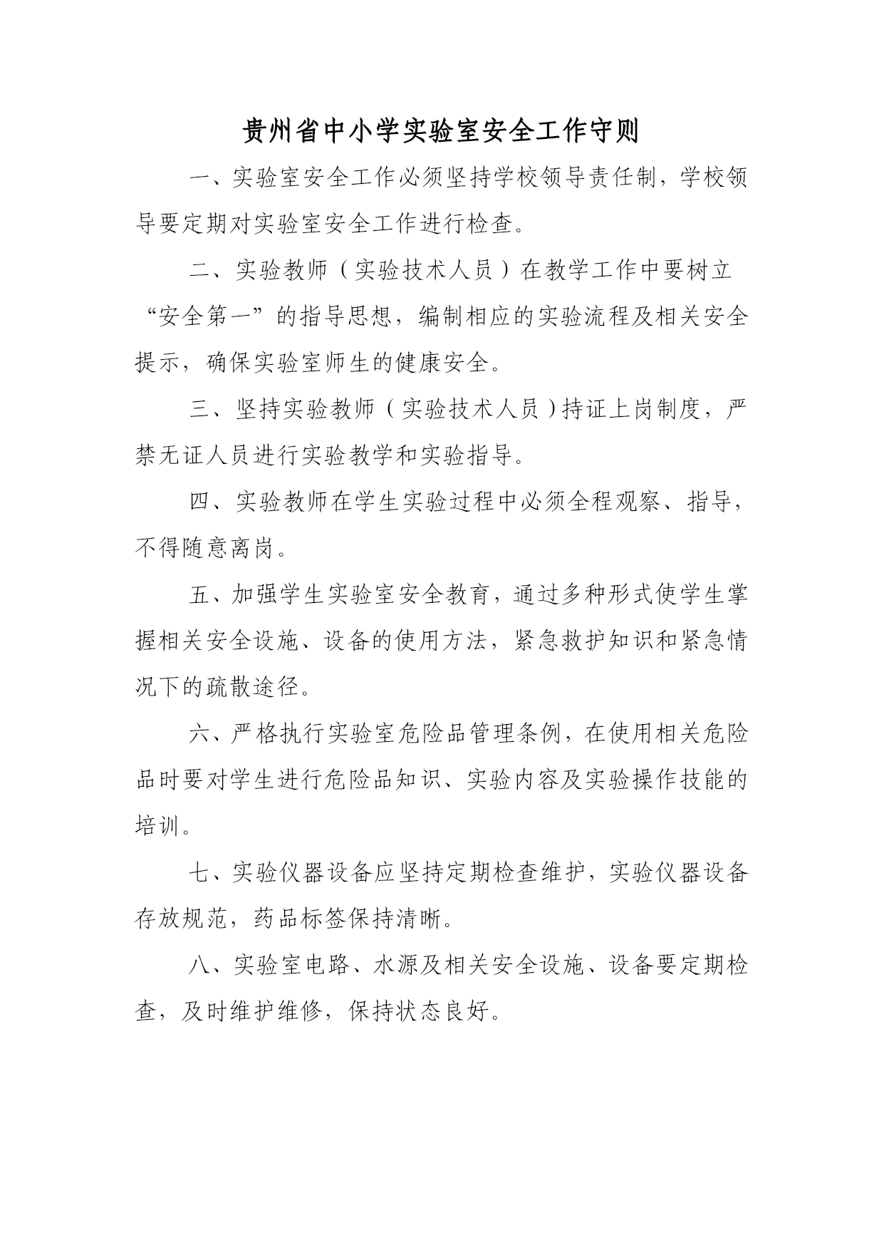 贵州省中小学实验室安全工作守则 一、实验室安全工作必须坚持学校领导责任制,学校领导要定期对实验室安全工作进行检查。 二、实验教师(实验技术人员)在教学工作中要树立“安全第一”的指导思想,编制相应的实验流程及相关安全提示,确保实验室师生的健康安全。 三、坚持实验教师(实验技术人员)持证上岗制度,严禁无证人员进行实验教学和实验指导。 四、实验教师在学生实验过程中必须全程观察、指导,不得随意离岗。 五、加强学生实验室安全教育,通过多种形式使学生掌握相关安全设施、设备的使用方法,紧急救护知识和紧急情况下的疏散途径。 六、严格执行实验室危险品管理条例,在使用相关危险品时要对学生进行危险品知识、实验内容及实验操作技能的培训。 七、实验仪器设备应坚持定期检查维护,实验仪器设备存放规范,药品标签保持清晰。 八、实验室电路、水源及相关安全设施、设备要定期检查,及时维护维修,保持状态良好。