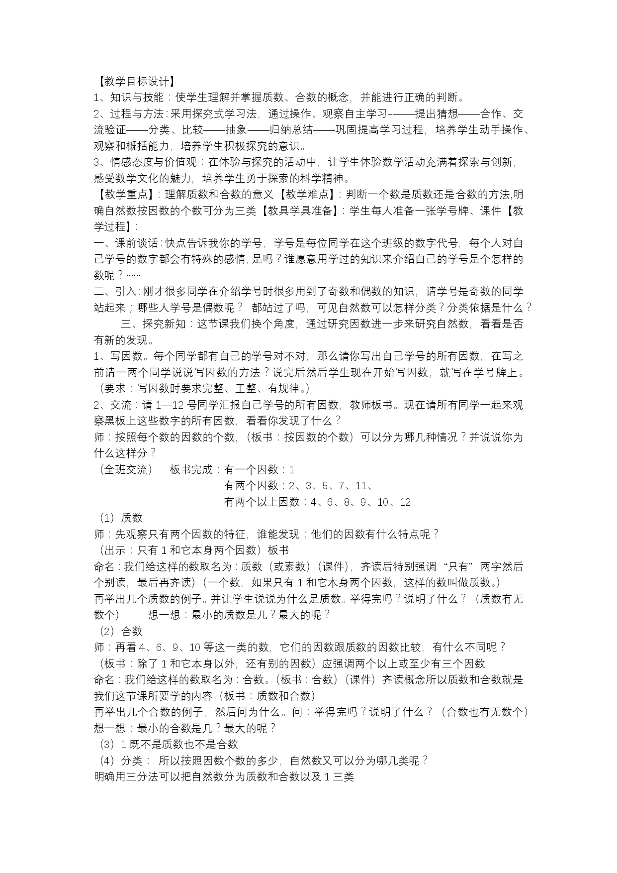 【教学目标设计】 1、知识与技能:使学生理解并掌握质数、合数的概念,并能进行正确的判断。 2、过程与方法:采用探究式学习法,通过操作、观察自主学习-——提出猜想——合作、交流验证——分类、比较——抽象——归纳总结——巩固提高学习过程,培养学生动手操作、观察和概括能力,培养学生积极探究的意识。 3、情感态度与价值观:在体验与探究的活动中,让学生体验数学活动充满着探索与创新,感受数学文化的魅力,培养学生勇于探索的科学精神。 【教学重点】:理解质数和合数的意义【教学难点】:判断一个数是质数还是合数的方法,明确自然数按因数的个数可分为三类【教具学具准备】:学生每人准备一张学号牌、课件【教学过程】: 一、课前谈话:快点告诉我你的学号,学号是每位同学在这个班级的数字代号,每个人对自己学号的数字都会有特殊的感情,是吗?谁愿意用学过的知识来介绍自己的学号是个怎样的数呢?…… 二、引入:刚才很多同学在介绍学号时很多用到了奇数和偶数的知识,请学号是奇数的同学站起来;哪些人学号是偶数呢?都站过了吗,可见自然数可以怎样分类?分类依据是什么? 三、探究新知:这节课我们换个角度,通过研究因数进一步来研究自然数,看看是否有新的发现。 1、写因数。每个同学都有自己的学号对不对,那么请你写出自己学号的所有因数,在写之前请一两个同学说说写因数的方法?说完后然后学生现在开始写因数,就写在学号牌上。(要求:写因数时要求完整、工整、有规律。) 2、交流:请1—12号同学汇报自己学号的所有因数,教师板书。现在请所有同学一起来观察黑板上这些数字的所有因数,看看你发现了什么? 师:按照每个数的因数的个数,(板书:按因数的个数)可以分为哪几种情况?并说说你为什么这样分? (全班交流)板书完成:有一个因数:1 有两个因数:2、3、5、7、11、 有两个以上因数:4、6、8、9、10、12 (1)质数 师:先观察只有两个因数的特征,谁能发现:他们的因数有什么特点呢? (出示:只有1和它本身两个因数)板书 命名:我们给这样的数取名为:质数(或素数)(课件),齐读后特别强调“只有”两字然后个别读,最后再齐读)(一个数,如果只有1和它本身两个因数,这样的数叫做质数。) 再举出几个质数的例子。并让学生说说为什么是质数。举得完吗?说明了什么?(质数有无数个)想一想:最小的质数是几?最大的呢? (2)合数 师:再看4、6、9、10等这一类的数,它们的因数跟质数的因数比较,有什么不同呢? (板书:除了1和它本身以外,还有别的因数)应强调两个以上或至少有三个因数 命名:我们给这样的数取名为:合数。(板书:合数)(课件)齐读概念所以质数和合数就是我们这节课所要学的内容(板书:质数和合数) 再举出几个合数的例子,然后问为什么。问:举得完吗?说明了什么?(合数也有无数个)想一想:最小的合数是几?最大的呢? (3)1既不是质数也不是合数 (4)分类:所以按照因数个数的多少,自然数又可以分为哪几类呢? 明确用三分法可以把自然数分为质数和合数以及1三类 13号到27号的同学看看你们手中的因数也就这三类 判断你自己的学号是质数还是合数,悄悄地告诉你的同桌,并告知理由。 (二)动手实践,制作100以内的质数表。 1、51,是质数还是合数?要想马上知道一个数是什么数还真不容易。(过渡)如果有质数表可查就方便了。我们一起制作一个质数表,拿出100以内的数表,想想怎样找出100以内的质数,制成质数表。 2、刚才,我们有些同学接受任务后,有的马上就去找,有人在思考。要是我,我可不及于去找,而是想一想用什么方法去找。说说你们是怎样找的?(把质数留下,其他的数去掉,古代数学家就是用这种筛选的方法制作质数表的。我们都来筛吧!) 3、怎样筛选的更快?……同学们自己发现了规律制成了100以内的质数表。你们真了不起! 4、你还有什么发现吗?