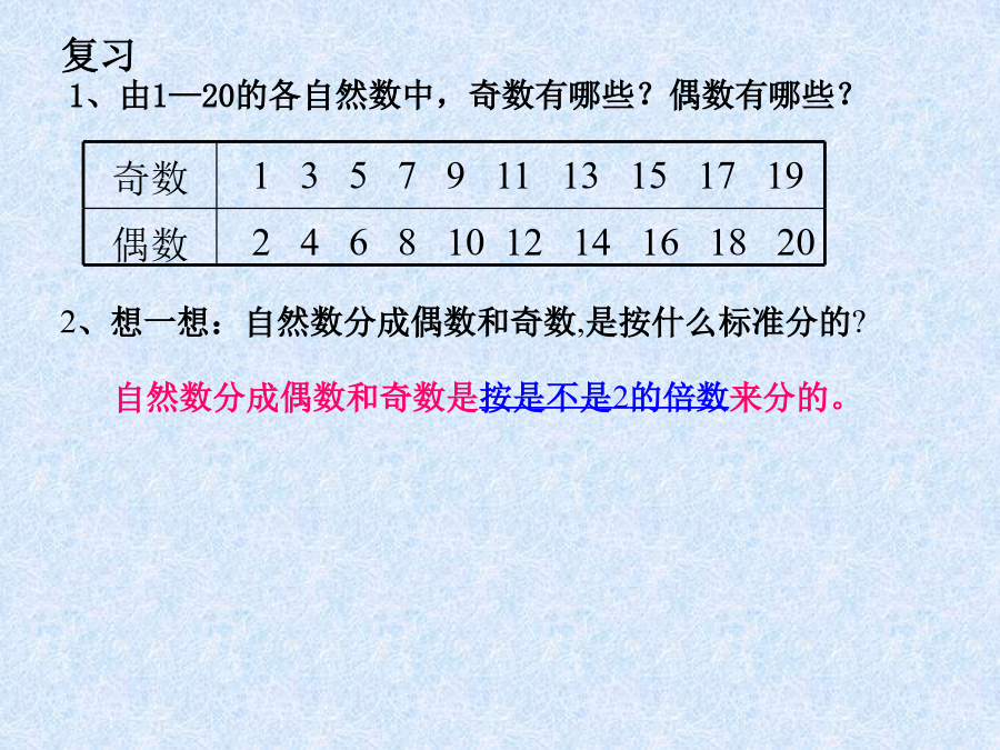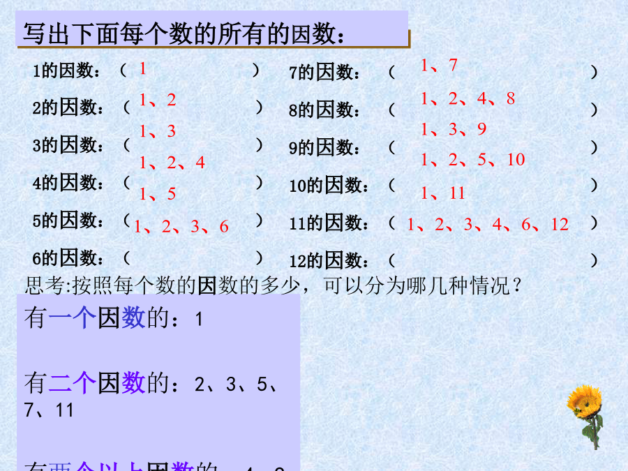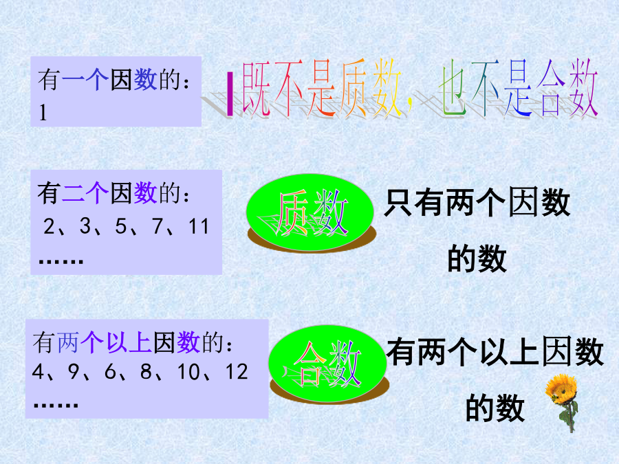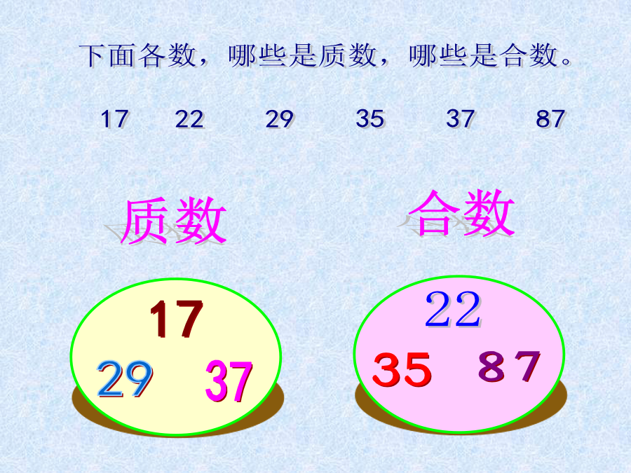 质数和合数1、由1—20的各自然数中,奇数有哪些?偶数有哪些?写出下面每个数的所有的因数:有一个因数的: 1下面各数,哪些是质数,哪些是合数。 1722293537873、说一说20以内的自然数中有哪些是质数?其余的呢?为什么? 23571113171923 3137414347535961677173798389971.口答:2、判断题:质数3、猜一猜老师的电话号码是多少?说一说: