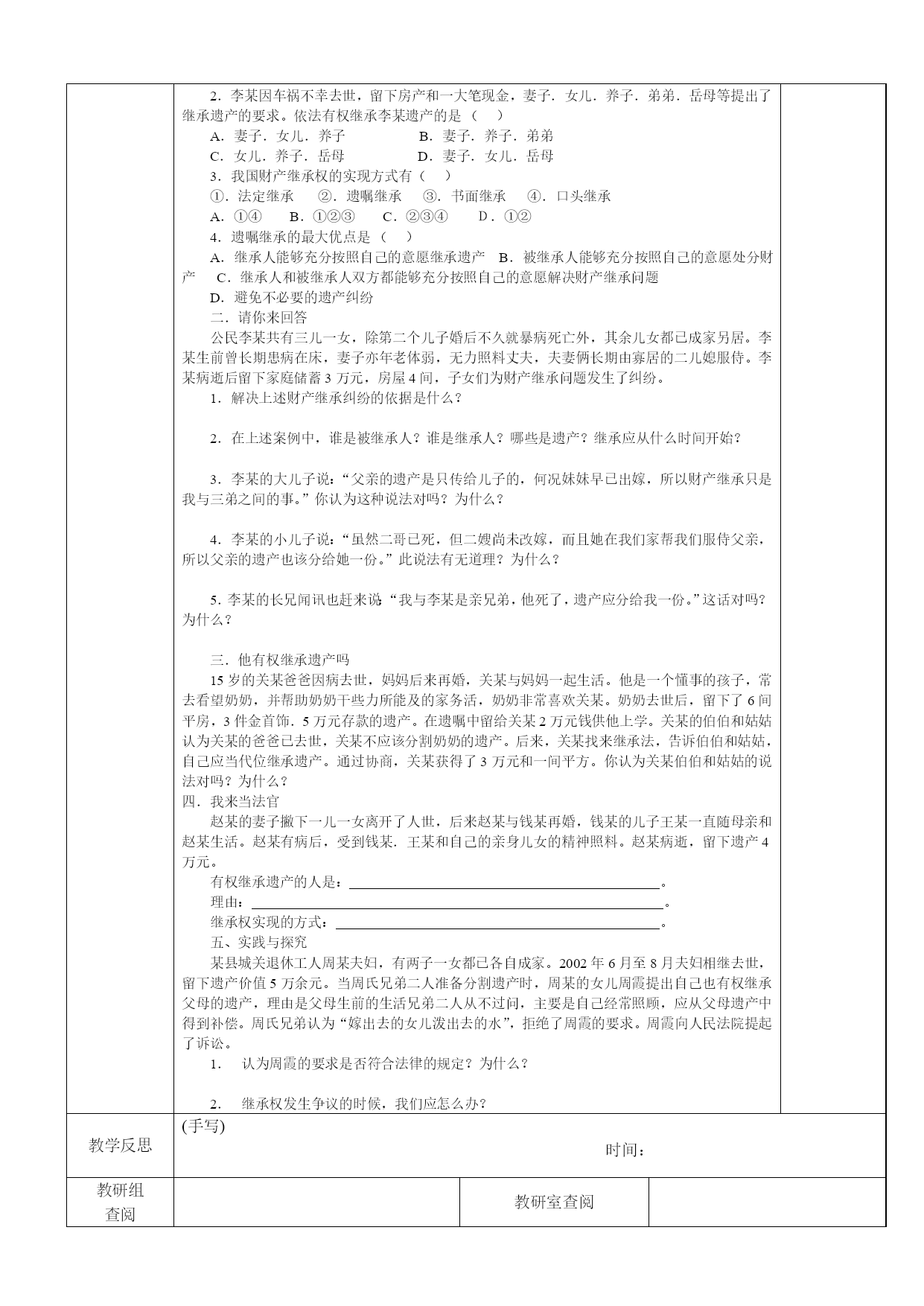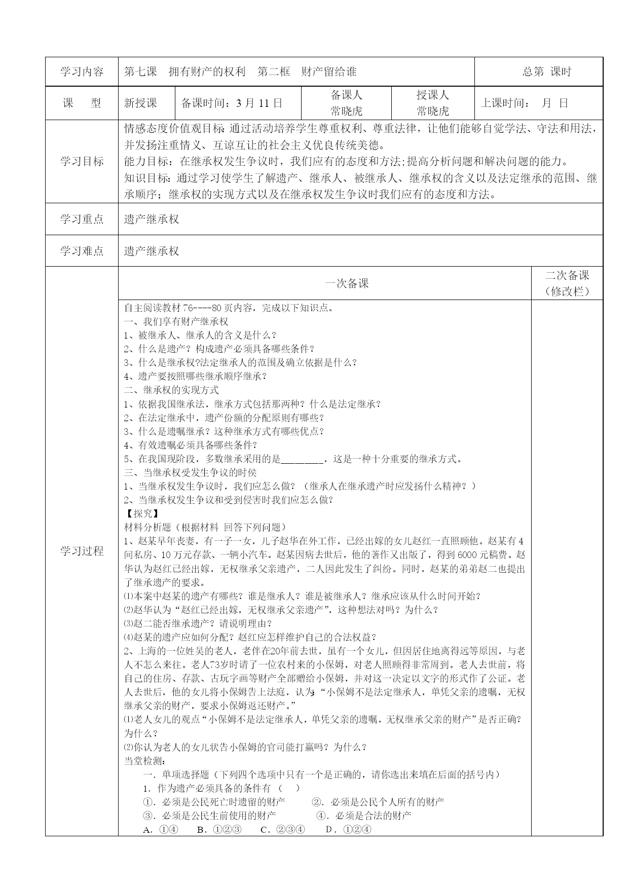 学习内容第七课拥有财产的权利第二框财产留给谁总第课时课型新授课备课时间:3月11日备课人 常晓虎授课人 常晓虎上课时间:月日学习目标情感态度价值观目标:通过活动培养学生尊重权利、尊重法律,让他们能够自觉学法、守法和用法,并发扬注重情义、互谅互让的社会主义优良传统美德。 能力目标:在继承权发生争议时,我们应有的态度和方法;提高分析问题和解决问题的能力。 知识目标:通过学习使学生了解遗产、继承人、被继承人、继承权的含义以及法定继承的范围、继承顺序;继承权的实现方式以及在继承权发生争议时我们应有的态度和方法。学习重点遗产继承权学习难点遗产继承权学习过程一次备课二次备课 (修改栏)自主阅读教材76----80页内容,完成以下知识点。 一、我们享有财产继承权 1、被继承人、继承人的含义是什么? 2、什么是遗产?构成遗产必须具备哪些条件? 3、什么是继承权?法定继承人的范围及确立依据是什么? 4、遗产要按照哪些继承顺序继承? 二、继承权的实现方式 1、依据我国继承法,继承方式包括那两种?什么是法定继承? 2、在法定继承中,遗产份额的分配原则有哪些? 3、什么是遗嘱继承?这种继承方式有哪些优点? 4、有效遗嘱必须具备哪些条件? 5、在我国现阶段,多数继承采用的是_________,这是一种十分重要的继承方式。 三、当继承权受发生争议的时侯 1、当继承权发生争议时,我们应怎么做?(继承人在继承遗产时应发扬什么精神?) 2、当继承权发生争议和受到侵害时我们应怎么做? 【探究】 材料分析题(根据材料回答下列问题) 1、赵某早年丧妻,有一子一女,儿子赵华在外工作,已经出嫁的女儿赵红一直照顾他。赵某有4间私房、10万元存款、一辆小汽车。赵某因病去世后,他的著作又出版了,得到6000元稿费。赵华认为赵红已经出嫁,无权继承父亲遗产,二人因此发生了纠纷。同时,赵某的弟弟赵二也提出了继承遗产的要求。 ⑴本案中赵某的遗产有哪些?谁是继承人?谁是被继承人?继承应该从什么时间开始? ⑵赵华认为“赵红已经出嫁,无权继承父亲遗产”,这种想法对吗?为什么? ⑶赵二能否继承遗产?请说明理由? ⑷赵某的遗产应如何分配?赵红应怎样维护自己的合法权益? 2、上海的一位姓吴的老人,老伴在20年前去世,虽有一个女儿,但因居住地离得远等原因,与老人不怎么来往。老人73岁时请了一位农村来的小保姆,对老人照顾得非常周到。老人去世前,将自己的住房、存款、古玩字画等财产全部赠给小保姆,并对这一决定以文字的形式作了公证。老人去世后,他的女儿将小保姆告上法庭,认为:“小保姆不是法定继承人,单凭父亲的遗嘱,无权继承父亲的财产,要求小保姆返还财产。” ⑴老人女儿的观点“小保姆不是法定继承人,单凭父亲的遗嘱,无权继承父亲的财产”是否正确?为什么? ⑵你认为老人的女儿状告小保姆的官司能打赢吗?为什么? 当堂检测: 一.单项选择题(下列四个选项中只有一个是正确的,请你选出来填在后面的括号内) 1.作为遗产必须具备的条件有() ①.必须是公民死亡时遗留的财产②.必须是公民个人所有的财产 ③.必须是公民生前使用的财产④.必须是合法的财产 A.①④B.①②③C.②③④D.①②④ 2.李某因车祸不幸去世,留下房产和一大笔现金,妻子.女儿.养子.弟弟.岳母等提出了继承遗产的要求。依法有权继承李某遗产的是() A.妻子.女儿.养子B.妻子.养子.弟弟 C.女儿.养子.岳母D.妻子.女儿.岳母 3.我国财产继承权的实现方式有() ①.法定继承②.遗嘱继承③.书面继承④.口头继承 A.①④B.①②③C.②③④D.①② 4.遗嘱继承的最大优点是() A.继承人能够充分按照自己的意愿继承遗产B.被继承人能够充分按照自己的意愿处分财产C.继承人和被继承人双方都能够充分按照自己的意愿解决财产继承问题 D.避免不必要的遗产纠纷 二.请你来回答 公民李某共有三儿一女,除第二个儿子婚后不久就暴病死亡外,其余儿女都已成家另居。李某生前曾长期患病在床,妻子亦年老体弱,无力照料丈夫,夫妻俩长期由寡居的二儿媳服侍。李某病逝后留下家庭储蓄3万元,房屋4间,子女们为财产继承问题发生了纠纷。 1.解决上述财产继承纠纷的依据是什么? 2.在上述案例中,谁是被继承人?谁是继承人?哪些是遗产?继承应从什么时间开始? 3.李某的大儿子说:“父亲的遗产是只传给儿子的,何况妹妹早已出嫁,所以财产继承只是我与三弟之间的事。”你认为这种说法对吗?为什么? 4.李某的小儿子说:“虽然二哥已死,但二嫂尚未改嫁,而且她在我们家帮我们服侍父亲,所以父亲的遗产也该分给她一份。”此说法有无道理?为什么? 5.李某的长兄闻讯也赶来说:“我与李某是亲兄弟,他死了,遗产应分给我一份。”这话对吗?为什么? 三.他有权继承遗产吗 15岁的关某爸爸因病去世,妈妈后来再婚,关某
