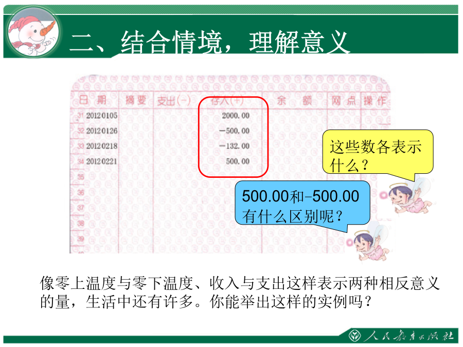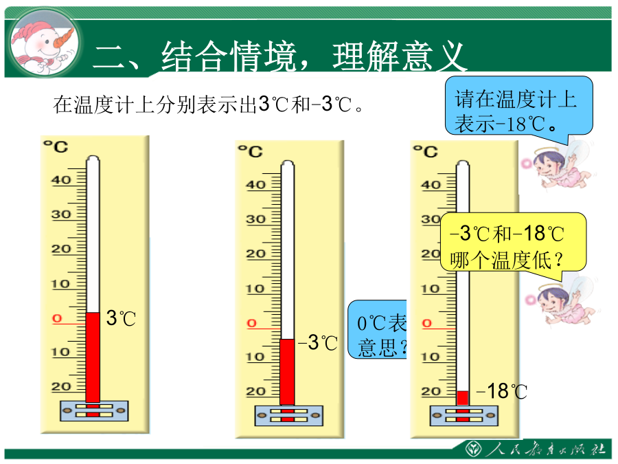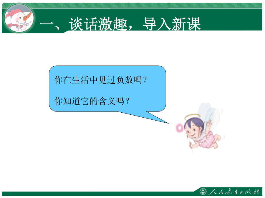 负数的认识一、谈话激趣,导入新课二、结合情境,理解意义二、结合情境,理解意义二、结合情境,理解意义二、结合情境,理解意义二、结合情境,理解意义三、回归生活,拓展应用三、回归生活,拓展应用三、回归生活,拓展应用某食品厂生产的120g袋装方便面外包装印有“(120±5)g”的字样。小明购买一袋这样的方便面,称一下发现117g,请问厂家有没有欺骗行为?为什么?四、了解历史,课堂总结四、了解历史,课堂总结