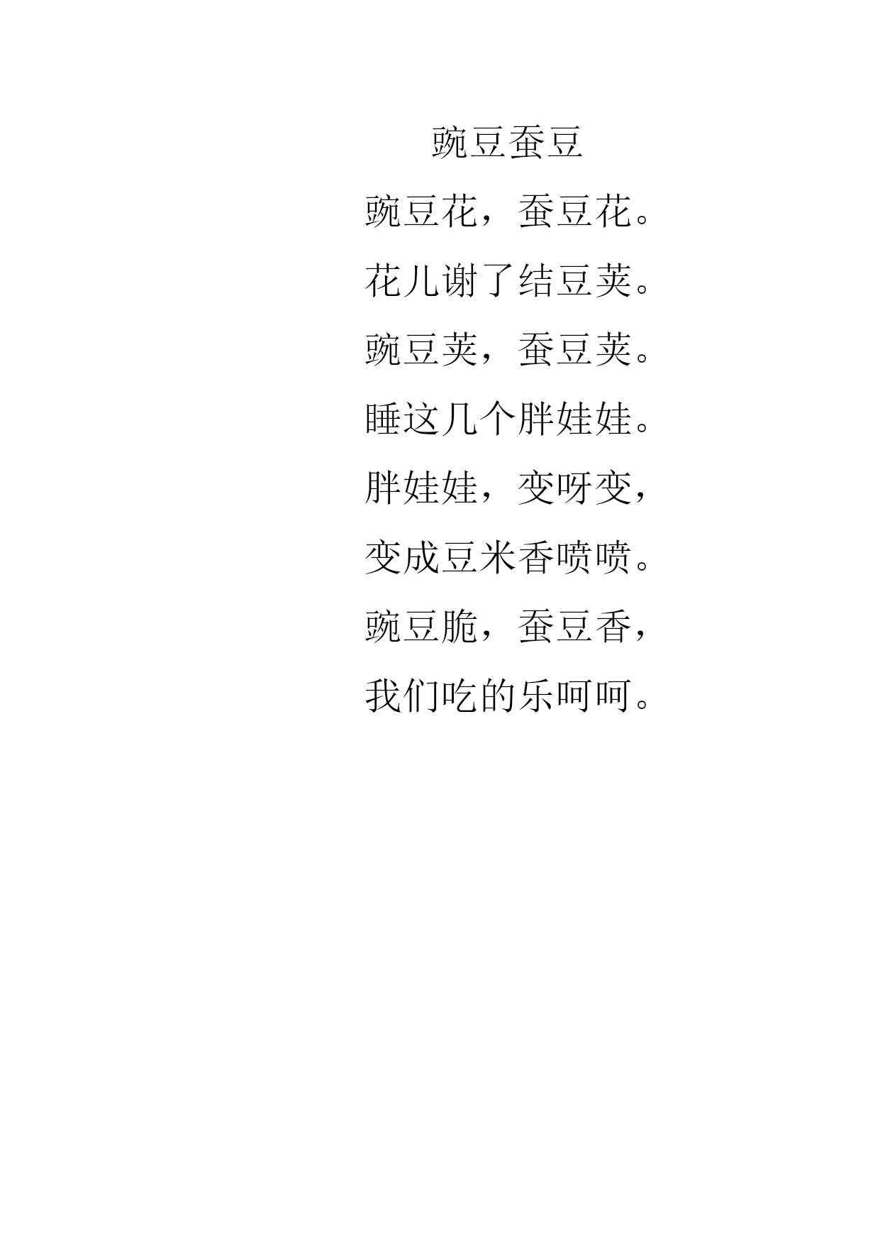 豌豆蚕豆 豌豆花,蚕豆花。 花儿谢了结豆荚。 豌豆荚,蚕豆荚。 睡这几个胖娃娃。 胖娃娃,变呀变, 变成豆米香喷喷。 豌豆脆,蚕豆香, 我们吃的乐呵呵。