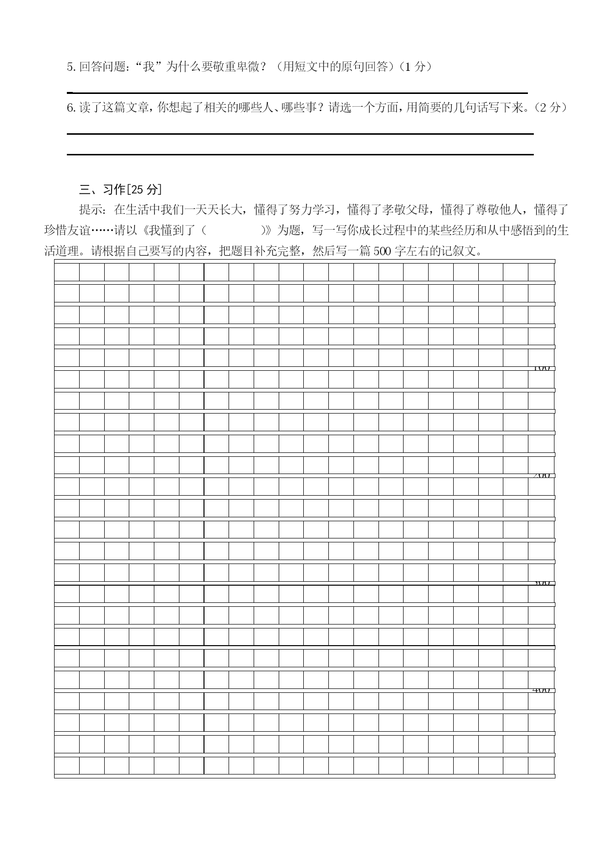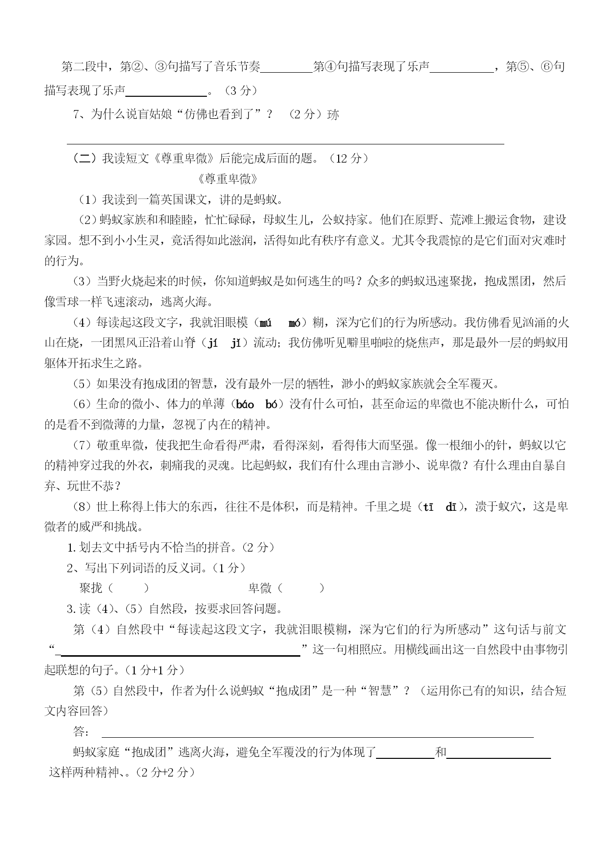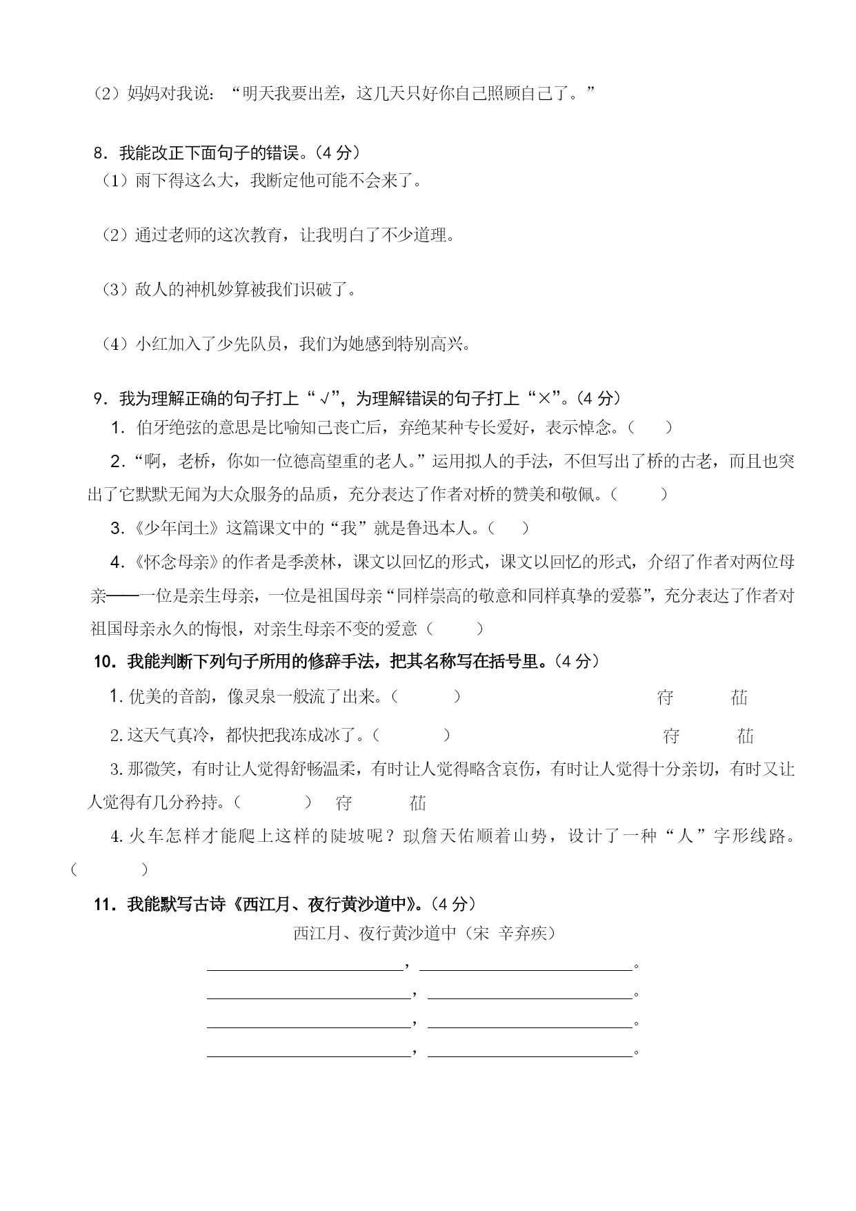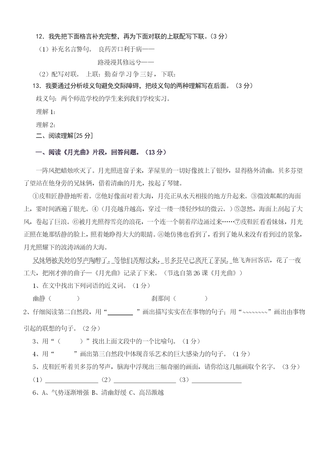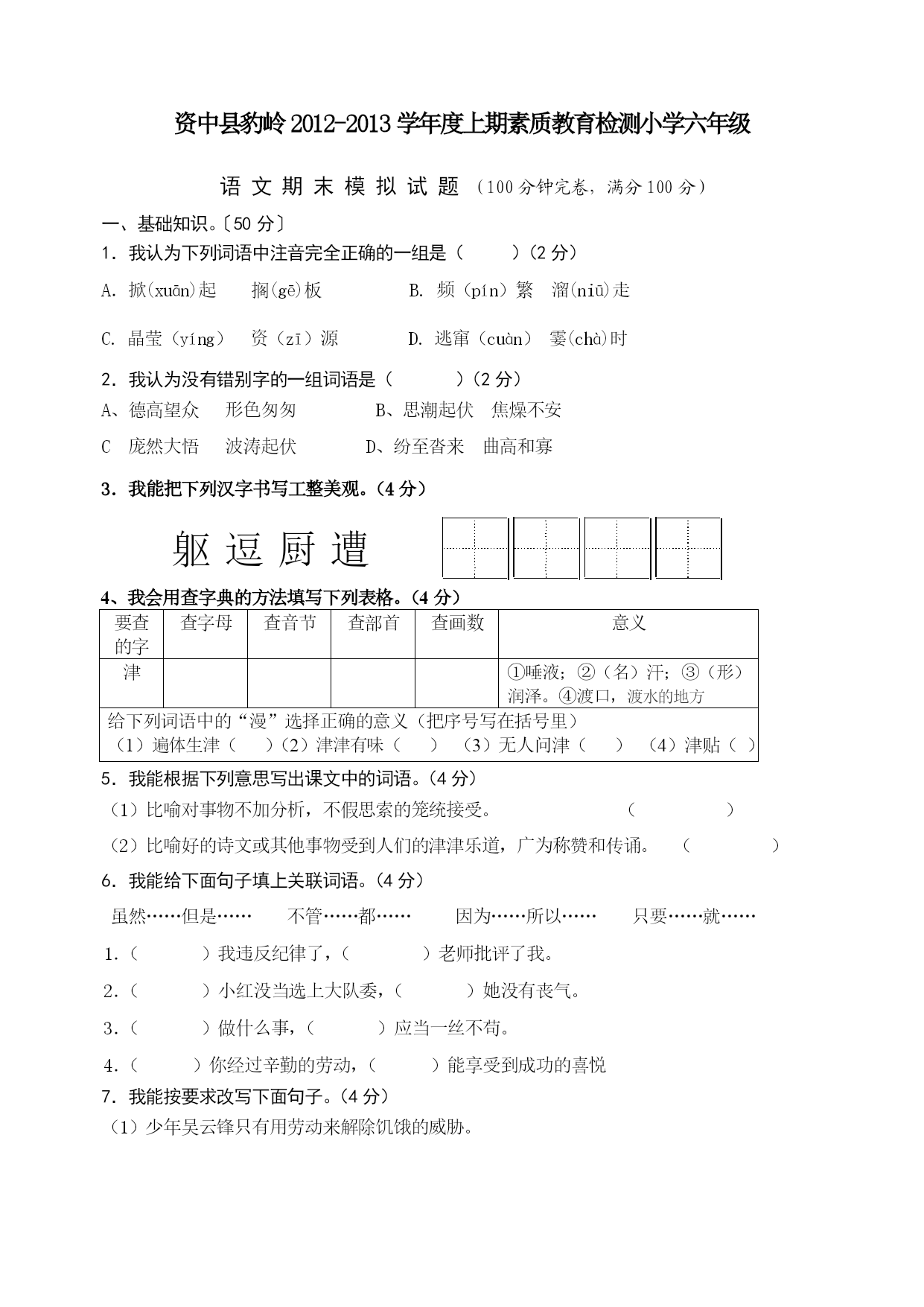 资中县豹岭2012-2013学年度上期素质教育检测小学六年级 语文期末模拟试题(100分钟完卷,满分100分) 一、基础知识。〔50分〕 1.我认为下列词语中注音完全正确的一组是()(2分) A.掀(xuān)起搁(gē)板B.频(pín)繁溜(niū)走 C.晶莹(yíng)资(zī)源D.逃窜(cuàn)霎(chà)时 2.我认为没有错别字的一组词语是()(2分) A、德高望众形色匆匆B、思潮起伏焦燥不安 C庞然大悟波涛起伏D、纷至沓来曲高和寡 3.我能把下列汉字书写工整美观。(4分) 躯逗厨遭 4、我会用查字典的方法填写下列表格。(4分) 要查的字查字母查音节查部首查画数意义津①唾液;②(名)汗;③(形)润泽。=4\*GB3④渡口,渡水的地方给下列词语中的“漫”选择正确的意义(把序号写在括号里) (1)遍体生津()(2)津津有味()(3)无人问津()(4)津贴()5.我能根据下列意思写出课文中的词语。(4分) (1)比喻对事物不加分析,不假思索的笼统接受。() (2)比喻好的诗文或其他事物受到人们的津津乐道,广为称赞和传诵。() 6.我能给下面句子填上关联词语。(4分) 虽然……但是……不管……都……因为……所以……只要……就…… 1.()我违反纪律了,()老师批评了我。 2.()小红没当选上大队委,()她没有丧气。 3.()做什么事,()应当一丝不苟。 4.()你经过辛勤的劳动,()能享受到成功的喜悦 7.我能按要求改写下面句子。(4分) (1)少年吴云锋只有用劳动来解除饥饿的威胁。 (2)妈妈对我说:“明天我要出差,这几天只好你自己照顾自己了。” 8.我能改正下面句子的错误。(4分) (1)雨下得这么大,我断定他可能不会来了。 (2)通过老师的这次教育,让我明白了不少道理。 (3)敌人的神机妙算被我们识破了。 (4)小红加入了少先队员,我们为她感到特别高兴。 9.我为理解正确的句子打上“√”,为理解错误的句子打上“×”。(4分) 1.伯牙绝弦的意思是比喻知己丧亡后,弃绝某种专长爱好,表示悼念。() 2.“啊,老桥,你如一位德高望重的老人。”运用拟人的手法,不但写出了桥的古老,而且也突出了它默默无闻为大众服务的品质,充分表达了作者对桥的赞美和敬佩。() 3.《少年闰土》这篇课文中的“我”就是鲁迅本人。() 4.《怀念母亲》的作者是季羡林,课文以回忆的形式,课文以回忆的形式,介绍了作者对两位母亲──一位是亲生母亲,一位是祖国母亲“同样崇高的敬意和同样真挚的爱慕”,充分表达了作者对祖国母亲永久的悔恨,对亲生母亲不变的爱意() 10.我能判断下列句子所用的修辞手法,把其名称写在括号里。(4分) 1.优美的音韵,像灵泉一般流了出来。() 2.这天气真冷,都快把我冻成冰了。() 3.那微笑,有时让人觉得舒畅温柔,有时让人觉得略含哀伤,有时让人觉得十分亲切,有时又让人觉得有几分矜持。() 4.火车怎样才能爬上这样的陡坡呢?詹天佑顺着山势,设计了一种“人”字形线路。() 11.我能默写古诗《西江月、夜行黄沙道中》。(4分) 西江月、夜行黄沙道中(宋辛弃疾) ,。 ,。 ,。 ,。 12.我先把下面格言补充完整,再为下面对联的上联配写下联。(3分) (1)补充名言警句。良药苦口利于病—— 路漫漫其修远兮—— (2)配写对联。上联:勤奋学习争三好,下联: 13.我要通过分析歧义句避免交际障碍,把歧义句的两种理解写在后面。(3分) 歧义句:两个师范学校的学生来到我们学校实习。 理解1: 理解2: 二、阅读理解[25分] —、阅读《月光曲》片段,回答问题。(13分) 一阵风把蜡烛吹灭了。月光照进窗子来,茅屋里的一切好像披上了银纱,显得格外清幽。贝多芬望了望站在他身旁的兄妹俩,借着清幽的月光,按起了琴键。 ①皮鞋匠静静地听着。②他好像面对着大海,月亮正从水天相接的地方升起来。③微波粼粼的海面上,霎时间洒遍了银光。④(月亮越升越高,穿过一缕一缕轻纱似的微云。)⑤忽然,海面上刮起了大风,卷起了巨浪。⑥被月光照得雪亮的浪花,一个连一个朝着岸边涌过来……⑦皮鞋匠看看妹妹,月光正照在她那恬静的脸上,照着她睁得大大的眼睛。⑧她仿佛也看到了,看到了她从来没有看到过的景象,月光照耀下的波涛汹涌的大海。 兄妹俩被美妙的琴声陶醉了。等他们苏醒过来,贝多芬早已离开了茅屋。他飞奔回客店,花了一夜工夫,把刚才弹的曲子—《月光曲》记录了下来。(节选自第26课《月光曲》) 1、在文中找出下列词语的近义词。(1分) 幽静()刹那间() 2、仔细阅读第二自然段,用“”画出描写实实在在事物的句子;用“~~~~~~~~”画出由事物引起的联想的句子。(2分) 3、用“()”找出上面文段中的一个比喻句。(1分) 4、用“”画出第三