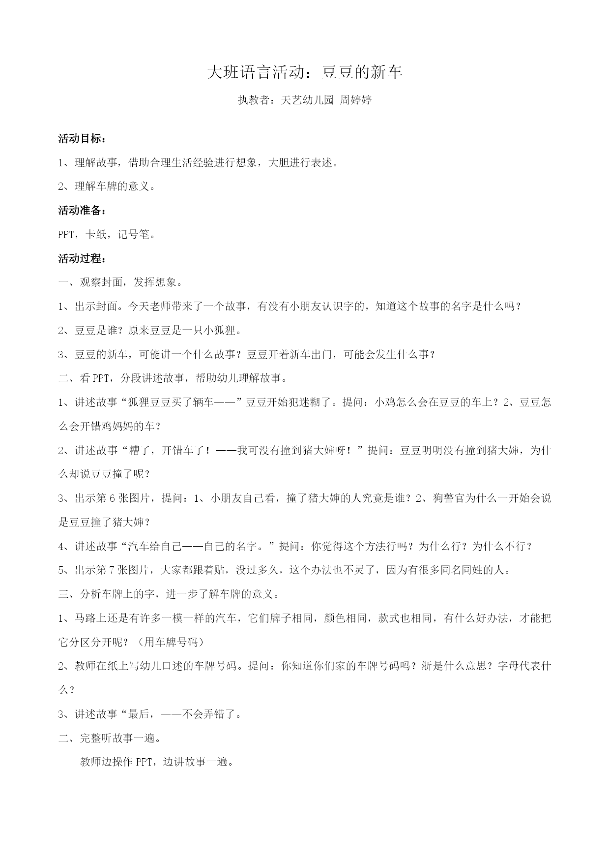 大班语言活动:豆豆的新车执教者:天艺幼儿园周婷婷 活动目标:1、理解故事,借助合理生活经验进行想象,大胆进行表述。2、理解车牌的意义。活动准备:PPT,卡纸,记号笔。活动过程:一、观察封面,发挥想象。1、出示封面。今天老师带来了一个故事,有没有小朋友认识字的,知道这个故事的名字是什么吗?2、豆豆是谁?原来豆豆是一只小狐狸。3、豆豆的新车,可能讲一个什么故事?豆豆开着新车出门,可能会发生什么事?二、看PPT,分段讲述故事,帮助幼儿理解故事。1、讲述故事“狐狸豆豆买了辆车——”豆豆开始犯迷糊了。提问:小鸡怎么会在豆豆的车上?2、豆豆怎么会开错鸡妈妈的车?2、讲述故事“糟了,开错车了!——我可没有撞到猪大婶呀!”提问:豆豆明明没有撞到猪大婶,为什么却说豆豆撞了呢?3、出示第6张图片,提问:1、小朋友自己看,撞了猪大婶的人究竟是谁?2、狗警官为什么一开始会说是豆豆撞了猪大婶?4、讲述故事“汽车给自己——自己的名字。”提问:你觉得这个方法行吗?为什么行?为什么不行?5、出示第7张图片,大家都跟着贴,没过多久,这个办法也不灵了,因为有很多同名同姓的人。三、分析车牌上的字,进一步了解车牌的意义。1、马路上还是有许多一模一样的汽车,它们牌子相同,颜色相同,款式也相同,有什么好办法,才能把它分区分开呢?(用车牌号码)2、教师在纸上写幼儿口述的车牌号码。提问:你知道你们家的车牌号码吗?浙是什么意思?字母代表什么?3、讲述故事“最后,——不会弄错了。二、完整听故事一遍。教师边操作PPT,边讲故事一遍。