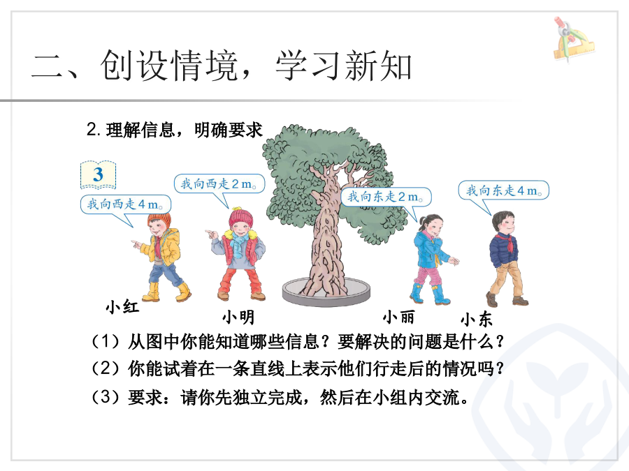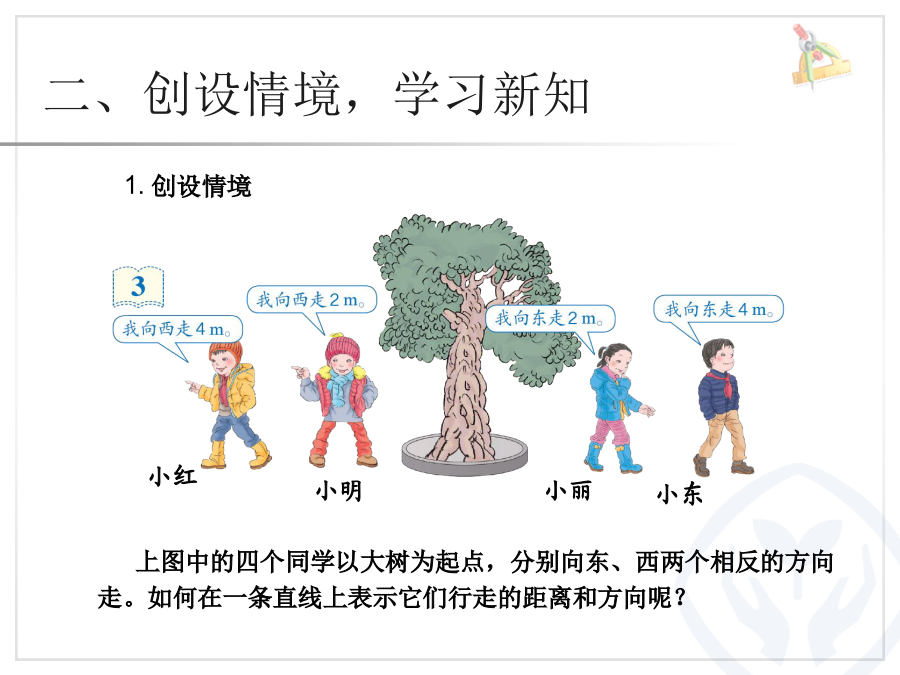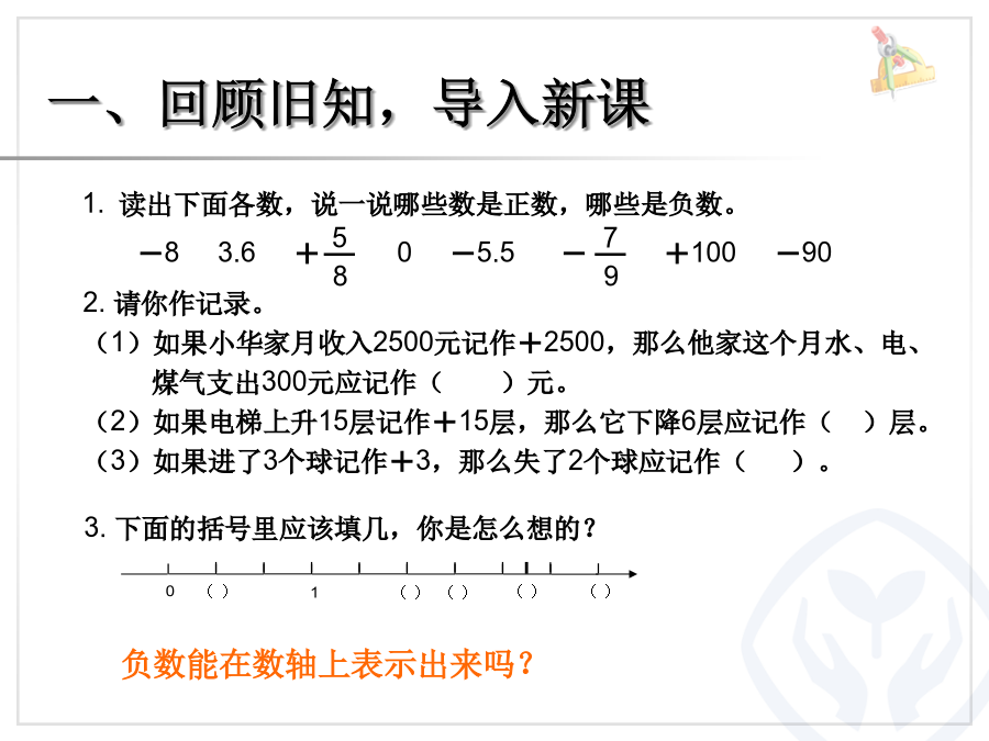 用数轴表示负数例3一、回顾旧知,导入新课1.创设情境小红交流:说一说你是怎样做的。(1)仔细观察数轴,你有什么发现? (2)从中你有什么体会?(2)观察你完成的数轴,你有什么发现?