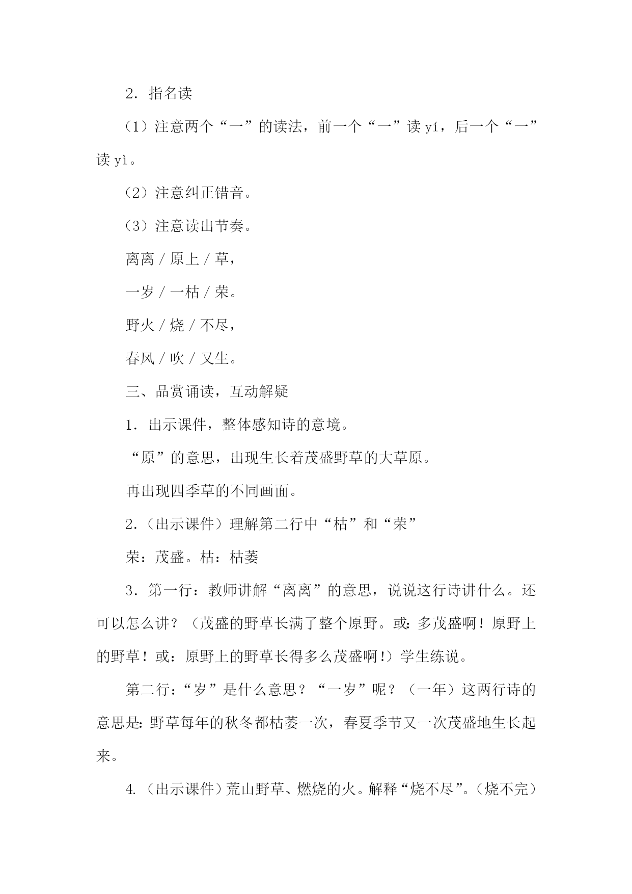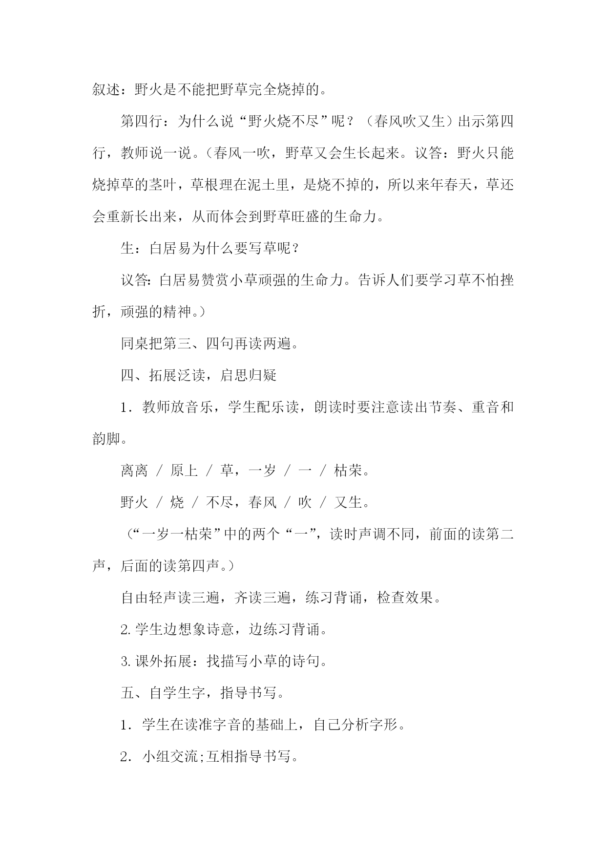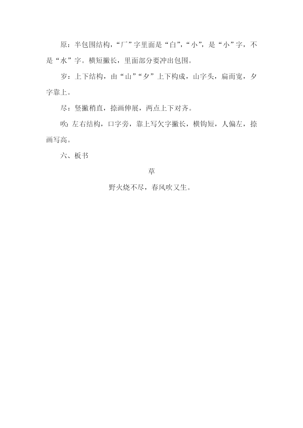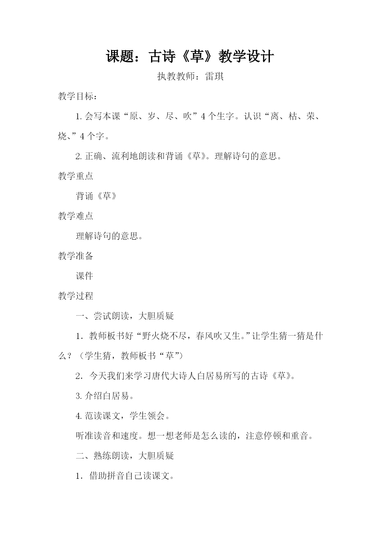 课题:古诗《草》教学设计 执教教师:雷琪 教学目标: 1.会写本课“原、岁、尽、吹”4个生字。认识“离、枯、荣、烧、”4个字。 2.正确、流利地朗读和背诵《草》。理解诗句的意思。 教学重点 背诵《草》 教学难点 理解诗句的意思。 教学准备 课件 教学过程 一、尝试朗读,大胆质疑 1.教师板书好“野火烧不尽,春风吹又生。”让学生猜一猜是什么?(学生猜,教师板书“草”) 2.今天我们来学习唐代大诗人白居易所写的古诗《草》。 3.介绍白居易。 4.范读课文,学生领会。 听准读音和速度。想一想老师是怎么读的,注意停顿和重音。 二、熟练朗读,大胆质疑 1.借助拼音自己读课文。 2.指名读 (1)注意两个“一”的读法,前一个“一”读yí,后一个“一”读yì。 (2)注意纠正错音。 (3)注意读出节奏。 离离/原上/草, 一岁/一枯/荣。 野火/烧/不尽, 春风/吹/又生。 三、品赏诵读,互动解疑 1.出示课件,整体感知诗的意境。 “原”的意思,出现生长着茂盛野草的大草原。 再出现四季草的不同画面。 2.(出示课件)理解第二行中“枯”和“荣” 荣:茂盛。枯:枯萎 3.第一行:教师讲解“离离”的意思,说说这行诗讲什么。还可以怎么讲?(茂盛的野草长满了整个原野。或:多茂盛啊!原野上的野草!或:原野上的野草长得多么茂盛啊!)学生练说。 第二行:“岁”是什么意思?“一岁”呢?(一年)这两行诗的意思是:野草每年的秋冬都枯萎一次,春夏季节又一次茂盛地生长起来。 4.(出示课件)荒山野草、燃烧的火。解释“烧不尽”。(烧不完)叙述:野火是不能把野草完全烧掉的。 第四行:为什么说“野火烧不尽”呢?(春风吹又生)出示第四行,教师说一说。(春风一吹,野草又会生长起来。议答:野火只能烧掉草的茎叶,草根理在泥土里,是烧不掉的,所以来年春天,草还会重新长出来,从而体会到野草旺盛的生命力。 生:白居易为什么要写草呢? 议答:白居易赞赏小草顽强的生命力。告诉人们要学习草不怕挫折,顽强的精神。) 同桌把第三、四句再读两遍。 四、拓展泛读,启思归疑 1.教师放音乐,学生配乐读,朗读时要注意读出节奏、重音和韵脚。 离离/原上/草,一岁/一/枯荣。 野火/烧/不尽,春风/吹/又生。 (“一岁一枯荣”中的两个“一”,读时声调不同,前面的读第二声,后面的读第四声。) 自由轻声读三遍,齐读三遍,练习背诵,检查效果。 2.学生边想象诗意,边练习背诵。 3.课外拓展:找描写小草的诗句。 五、自学生字,指导书写。 1.学生在读准字音的基础上,自己分析字形。 2.小组交流;互相指导书写。 原:半包围结构,“厂”字里面是“白”,“小”,是“小”字,不是“水”字。横短撇长,里面部分要冲出包围。 岁:上下结构,由“山”“夕”上下构成,山字头,扁而宽,夕字靠上。 尽:竖撇稍直,捺画伸展,两点上下对齐。 吹:左右结构,口字旁,靠上写欠字撇长,横钩短,人偏左,捺画写高。 六、板书 草 野火烧不尽,春风吹又生。
