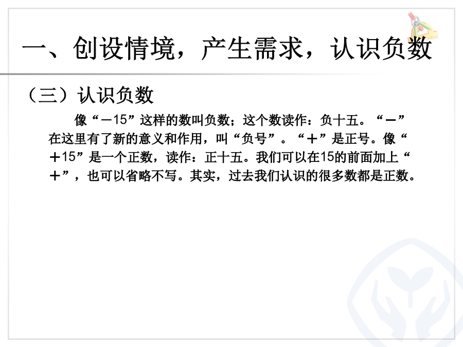 负数一、创设情境,产生需求,认识负数提问:(3)怎样记录就能把情况表示清楚了呢?请你想想办法。像“-15”这样的数叫负数;这个数读作:负十五。“-”在这里有了新的意义和作用,叫“负号”。“+”是正号。像“+15”是一个正数,读作:正十五。我们可以在15的前面加上“+”,也可以省略不写。其实,过去我们认识的很多数都是正数。(四)介绍历史(五)联系生活,巩固读写2.提问:请你根据上图中的信息填写下面的表格,然后说一说