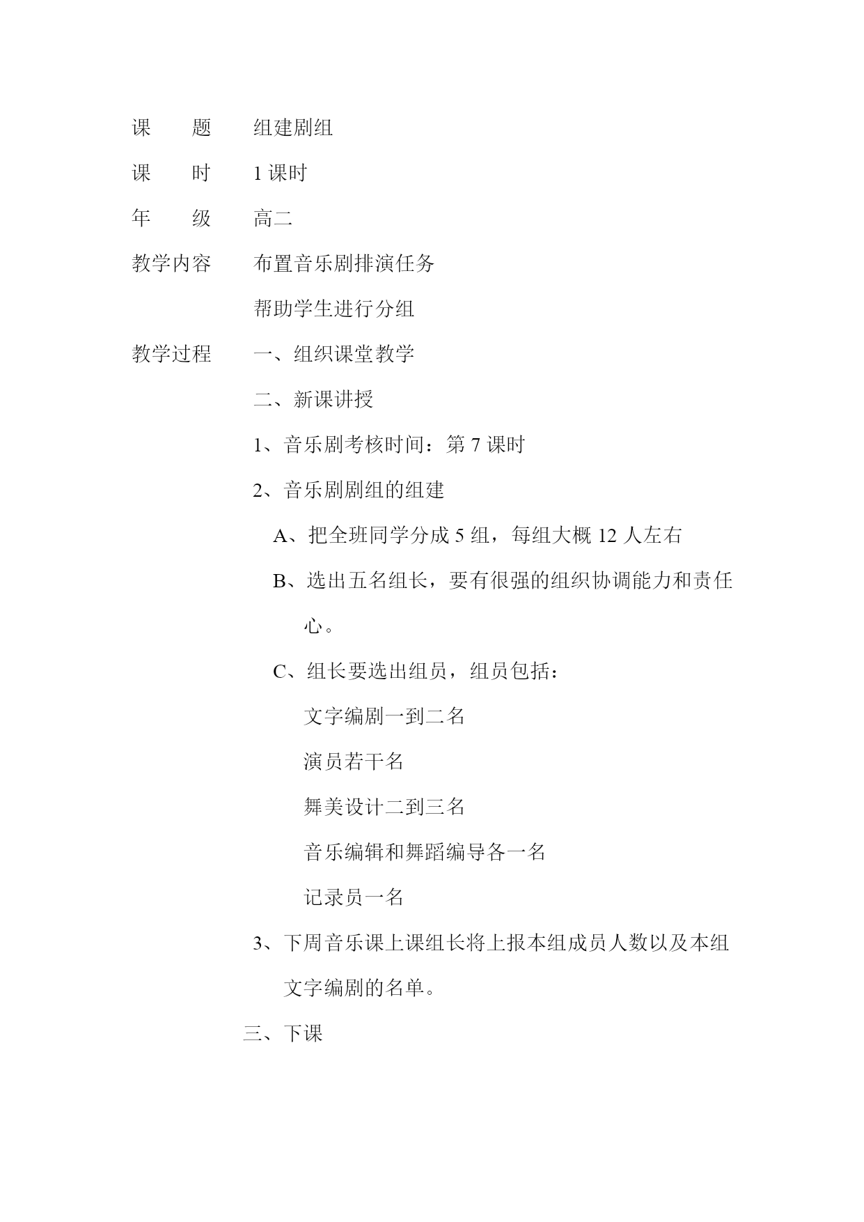 课题组建剧组 课时1课时 年级高二 教学内容布置音乐剧排演任务 帮助学生进行分组 教学过程一、组织课堂教学 二、新课讲授 1、音乐剧考核时间:第7课时 2、音乐剧剧组的组建 A、把全班同学分成5组,每组大概12人左右 B、选出五名组长,要有很强的组织协调能力和责任 心。 C、组长要选出组员,组员包括: 文字编剧一到二名 演员若干名 舞美设计二到三名 音乐编辑和舞蹈编导各一名 记录员一名 3、下周音乐课上课组长将上报本组成员人数以及本组 文字编剧的名单。 三、下课