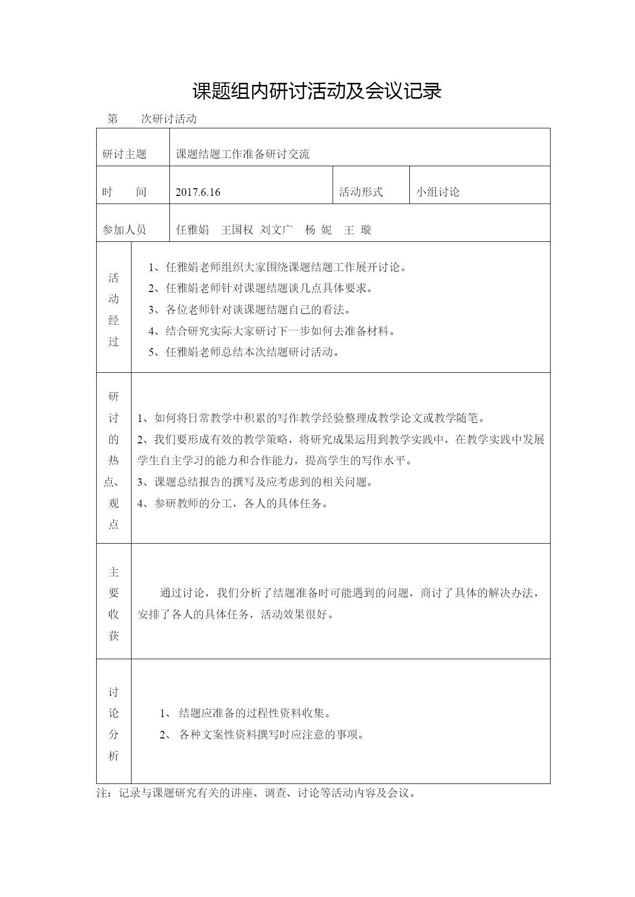 课题组内研讨活动及会议记录 第次研讨活动 研讨主题课题结题工作准备研讨交流时间2017.6.16活动形式小组讨论参加人员任雅娟王国权刘文广杨妮王璇活 动 经 过1、任雅娟老师组织大家围绕课题结题工作展开讨论。 2、任雅娟老师针对课题结题谈几点具体要求。 3、各位老师针对谈课题结题自己的看法。 4、结合研究实际大家研讨下一步如何去准备材料。 5、任雅娟老师总结本次结题研讨活动。研 讨 的 热点、观 点如何将日常教学中积累的写作教学经验整理成教学论文或教学随笔。 我们要形成有效的教学策略,将研究成果运用到教学实践中,在教学实践中发展学生自主学习的能力和合作能力,提高学生的写作水平。 课题总结报告的撰写及应考虑到的相关问题。 参研教师的分工,各人的具体任务。主 要 收 获通过讨论,我们分析了结题准备时可能遇到的问题,商讨了具体的解决办法,安排了各人的具体任务,活动效果很好。讨 论 分 析结题应准备的过程性资料收集。 各种文案性资料撰写时应注意的事项。注:记录与课题研究有关的讲座、调查、讨论等活动内容及会议。