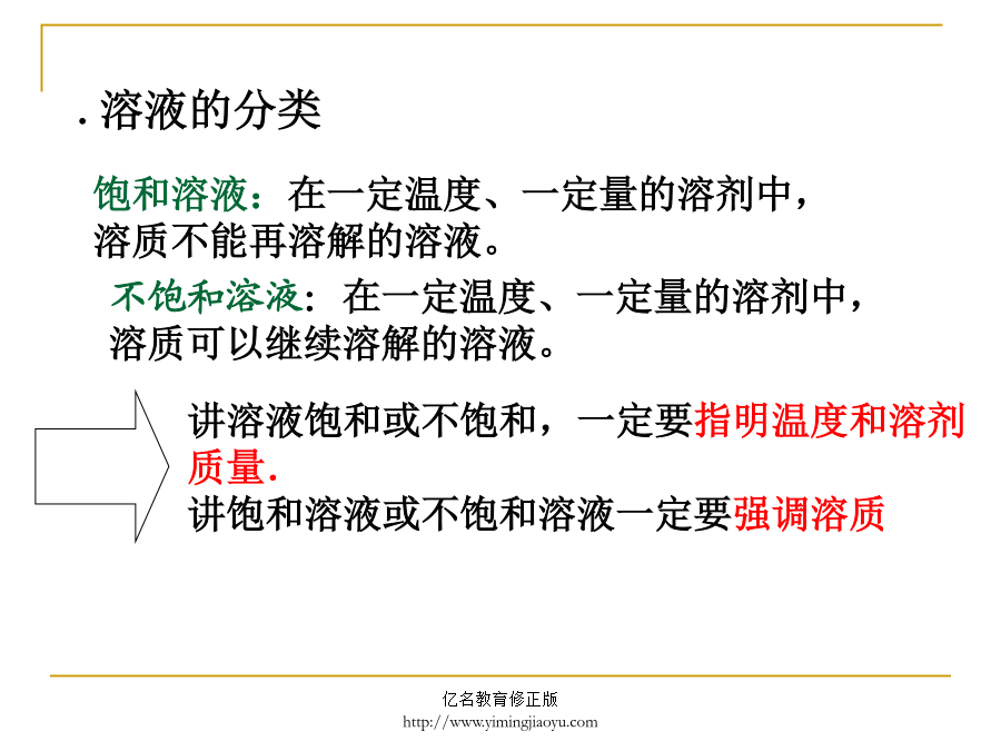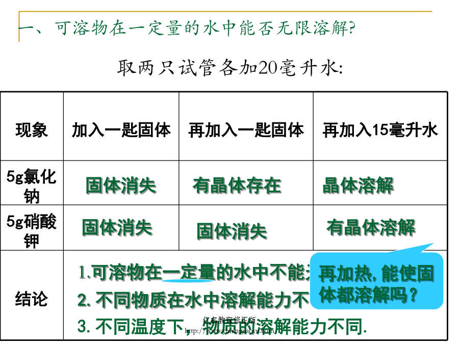 溶解度最多能溶解多少氯化钠一、可溶物在一定量的水中能否无限溶解?加热后,硝酸钾又能溶解了饱和溶液:在一定温度、一定量的溶剂中, 溶质不能再溶解的溶液。 1.饱和溶液和不饱和溶液的相互转化关系练习1:在其它条件不变的情况下,要使接近饱和溶液的硝酸钾溶液达到饱和溶液,下列措施达不到目的的是 A降低溶液温度B加入溶质硝酸钾 C升高溶液的温度D蒸发溶液中的溶剂 4、将20℃时的氯化铵饱和溶液升温至50℃(不考虑水分的蒸发),一定发生改变的是() A.氯化铵的溶解度B.溶液的质量 C.溶质的质量分数D.溶质的质量1.1000C硝酸钾饱和溶液冷却至300C,滤去晶体后,所得溶液是________溶液(饱和、不饱和)。 2.把600C时的氯化铵饱和溶液冷却到100C,有氯化铵晶体析出,剩余溶液是: A.浓溶液B.稀溶液C.饱和溶液D.不饱和溶液 3.200C时,要使硝酸钾不饱和溶液,变为饱和溶液,可采取下列措施中的: A.温度升高至600CB.加入硝酸钾 C.加入水D.加入200C硝酸钾饱和溶液 3.判断溶液是否饱和的方法:A、B、C、D四个烧杯里分别盛有质量相等的同种溶剂,向四个烧杯加入某溶质,且固体溶质质量依次减少(温度相同),充分溶解,(如下图所示)回答下列各问(填序号) (1)_____________中盛的一定是饱和溶液; (2)_____________中盛的可能是饱和溶液; (3)_____________中盛的一定是不饱和溶液; 4.浓溶液和稀溶液讨论:饱和溶液、不饱和溶液与浓溶液、稀溶液的关系冷却热的饱和溶液时,硝酸钾晶体从溶液中析出硝酸钾晶体使溶质从溶液中结晶的方法采用结晶的方法可以分离提纯两种固体溶质.如分离NaCl和KNO3的固体混合物(提纯含有少量氯化钠的硝酸钾溶液:降温结晶。提纯含有少量硝酸钾的氯化钠溶液:蒸发结晶。) 从海水中提取食盐(1)固体的溶解度NaCl在20℃的溶解度为36g, 表示的意义就是:在20℃时,100g水中溶解36g 氯化钠时溶液达到饱和状态,或者说,在20℃时, 100g水最多能溶解36g氯化钠。 下列关于溶解度的叙述中,正确的是() ①将36gNaCl溶于100g水中制成饱和溶液,NaCl的溶解度为36g. ②20℃时,100克NaCl饱和溶液中含有26.5克NaCl,因此,NaCl在20℃时的溶解度为26.5克. ③在20℃时,100克水最多能溶解31.6克KNO3,而200克水最多能溶解63.2克KNO3,因此,KNO3的溶解度随溶剂质量增大而增大. ④在20℃时,100克水中溶解了NaCl20克,因此NaCl在20℃时的溶解度为20g. ⑤在20℃时,NaCl的溶解度为36克. ⑥在20℃时,100克水中溶解36克NaCl达到饱和状态,因此,NaCl在20℃的溶解度为解度为36克 A.①②④B.②⑥C.③④⑤⑥D.⑤⑥溶解性只是一般地说明某种物质在某种溶剂里溶解能力的大小,是物质的一种物理性质。通常用易溶、可溶、微溶、难溶或不溶等粗略的概念表示。我们一般根据物质在20℃时的溶解度来判断物质的溶解性,如下表所示:1、20℃时碳酸钙的溶解度是0.0013g,所以碳酸钙是溶物质。溶解度随温度变化有两种表示方法: ①列表法;②溶解度曲线。确定溶液的状态(饱和与不饱和) A:溶解度曲线上的点表示物质在该点所示温度下的溶解度,溶液所处的状态是饱和溶液。 B:溶解度曲线下面的面积上的点,表示溶液所处的状态是不饱和状态,依其数据配制的溶液为对应温度时的不饱和溶液。 C:溶解度曲线上面的面积上的点,依其数据配制的溶液为对应温度时的饱和溶液,且该溶质有剩余。 3、气体物质的溶解度 气体物体溶解度是指该气体在压强为101kPa,一定温度时溶解在1体积水里达到饱和状态时的气体体积.汽水中含有大量二氧化碳把水喷向空中可以增加养鱼池水中氧气的溶解量右图是A.B两种物质的溶解度曲线,试回答下列问题 (1)t1ºC时,A的溶解度B的溶解度.(填<>或=) (2)A、B两物质饱和溶液溶质的质量分数相等的温度是ºC。 (3)当A、B两物质的溶液接近饱和时,采用增加溶质、蒸发溶剂、降低温度的方法可以达到饱和的是物质的溶液。巩固练习1、加热盛饱和氢氧化钙溶液的试管,会看到。3、右图分别表示A、B、C三种物质的溶解度曲线,则t20C时,其溶解度由大小的顺序是: A.A、B、C B.B、A、C C.B、C、A D.C、A、B生活中的下列现象不能说明气体的溶解度随温度升高而减小的是() A.烧开水时,沸腾前有气泡冒 B.喝下汽水时感到有气体冲到鼻腔 C.揭开碑酒瓶盖,有大量气泡冒出 D.夏季黄昏,池塘里的鱼常游出水 甲、乙两种固体的溶解度曲线如下图。现将两试管分别装入甲、乙两种物质的饱和溶液(试管底部均有未溶解的固体)